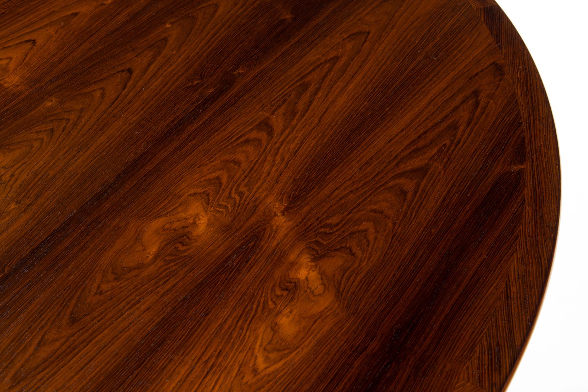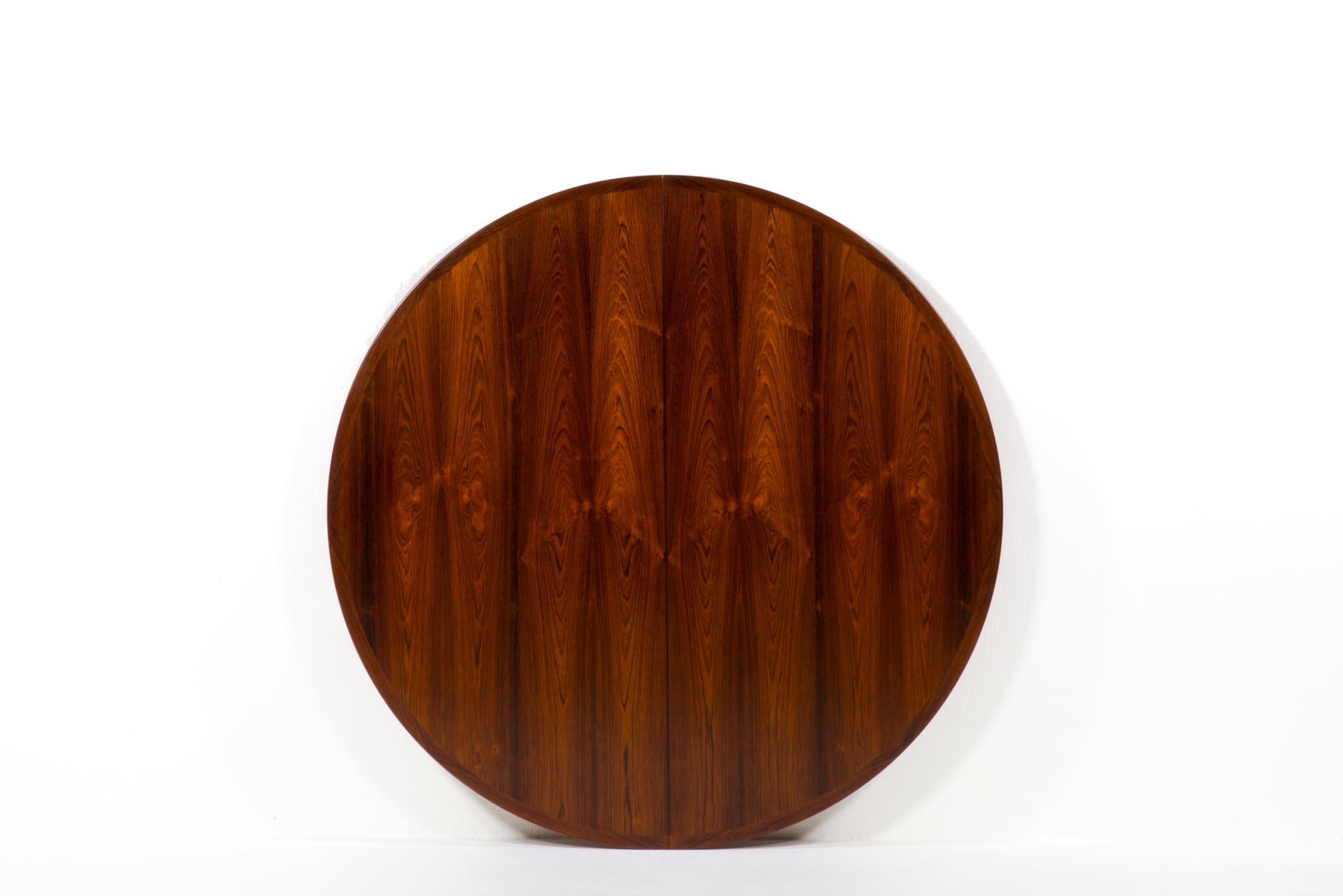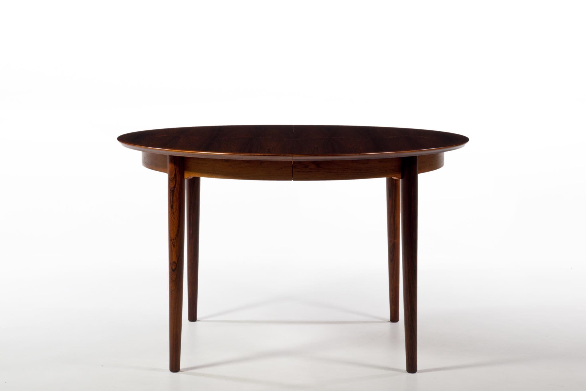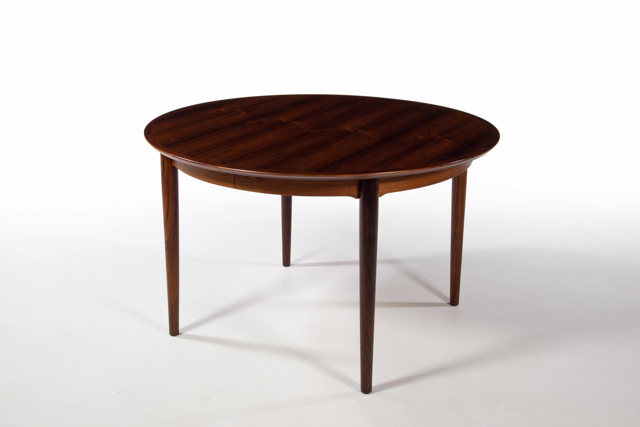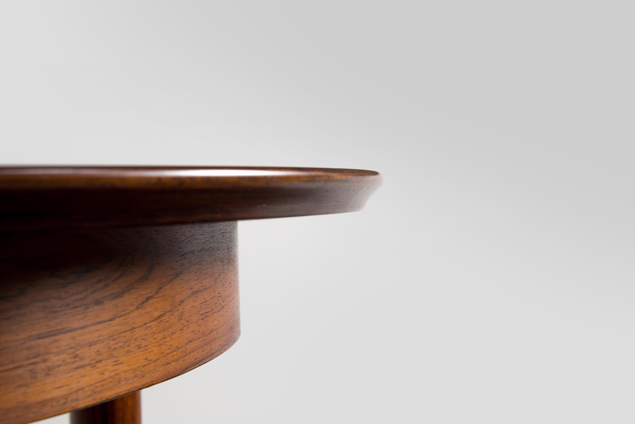 デンマークの家具職人兼デザイナー、Helge Sibast/ヘルエ・シバストによるラウンドダイニングテーブルです。シバスト社を創設した後の1960年代頃に作られたものでしょう。当時人気のあったモデルで、チークなどを含め多くの製品が世に出されたようです。こちらのテーブルはブラジル原産と思しき良質なローズウッド材が用いられています。天板に現れた連続した木目が際立っており、このテーブルの魅力と言えるでしょう。エクステンションリーフが二枚付属します。コンディションは良好です。