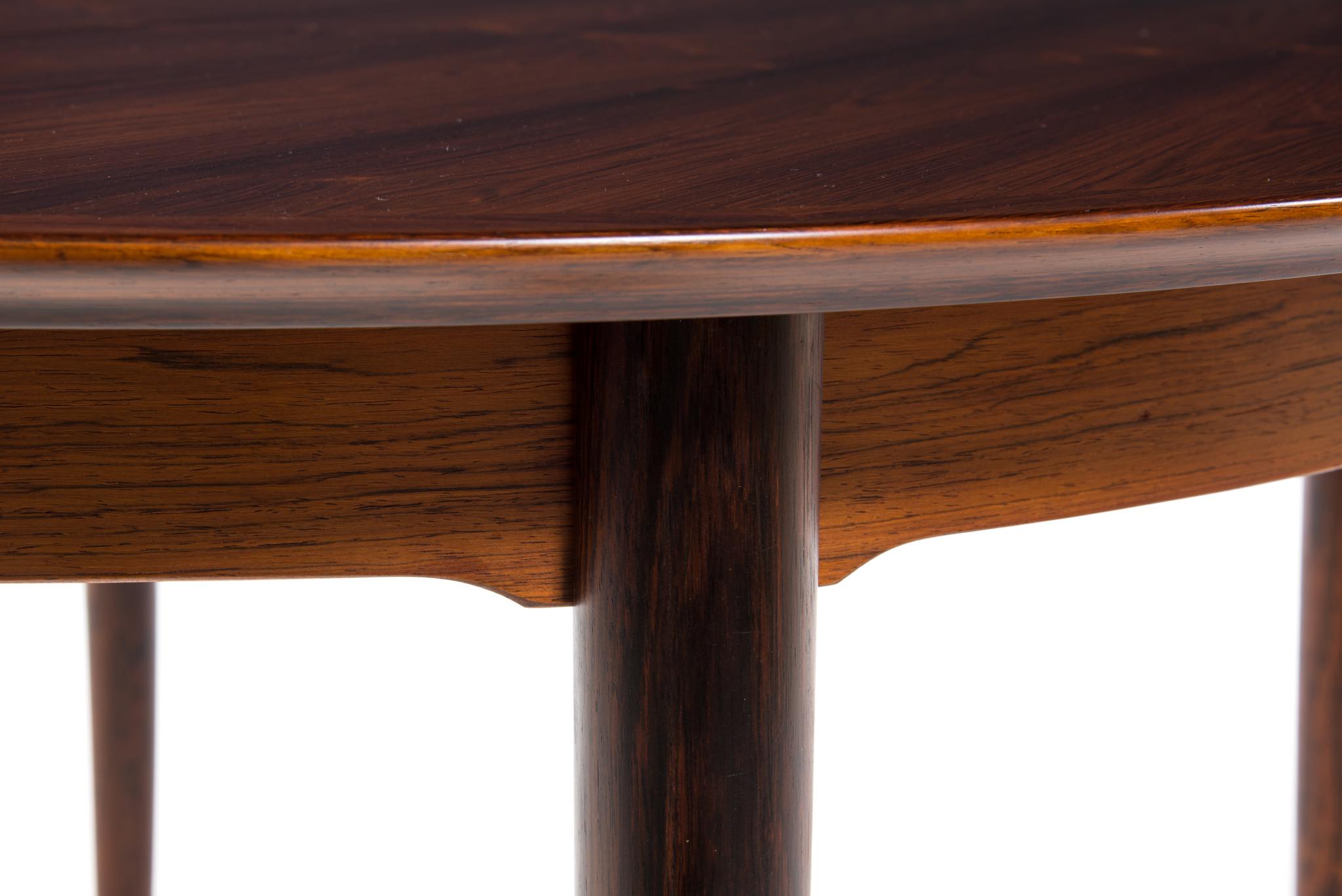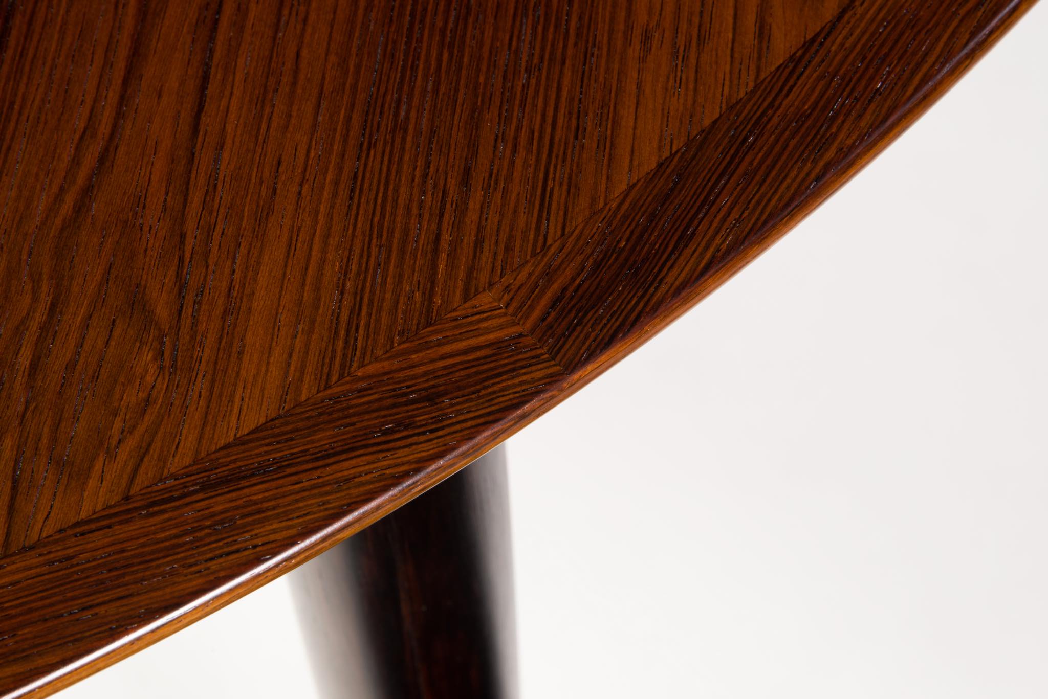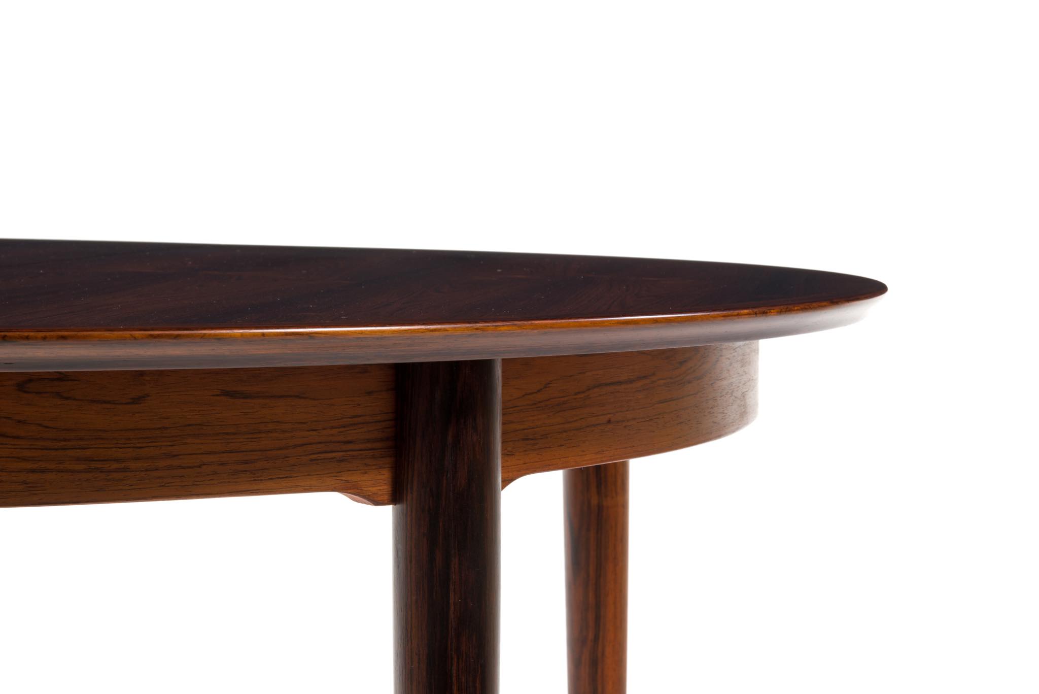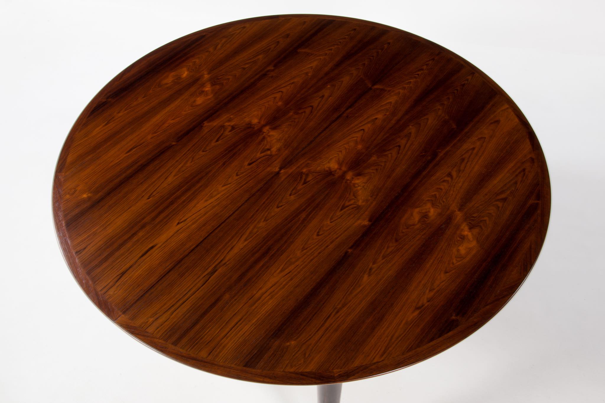 デンマークの家具職人兼デザイナー、Helge Sibast/ヘルエ・シバストによるラウンドダイニングテーブルです。シバスト社を創設した後の1960年代頃に作られたものでしょう。当時人気のあったモデルで、チークなどを含め多くの製品が世に出されたようです。こちらのテーブルはブラジル原産と思しき良質なローズウッド材が用いられています。天板に現れた連続した木目が際立っており、このテーブルの魅力と言えるでしょう。エクステンションリーフが二枚付属します。コンディションは良好です。