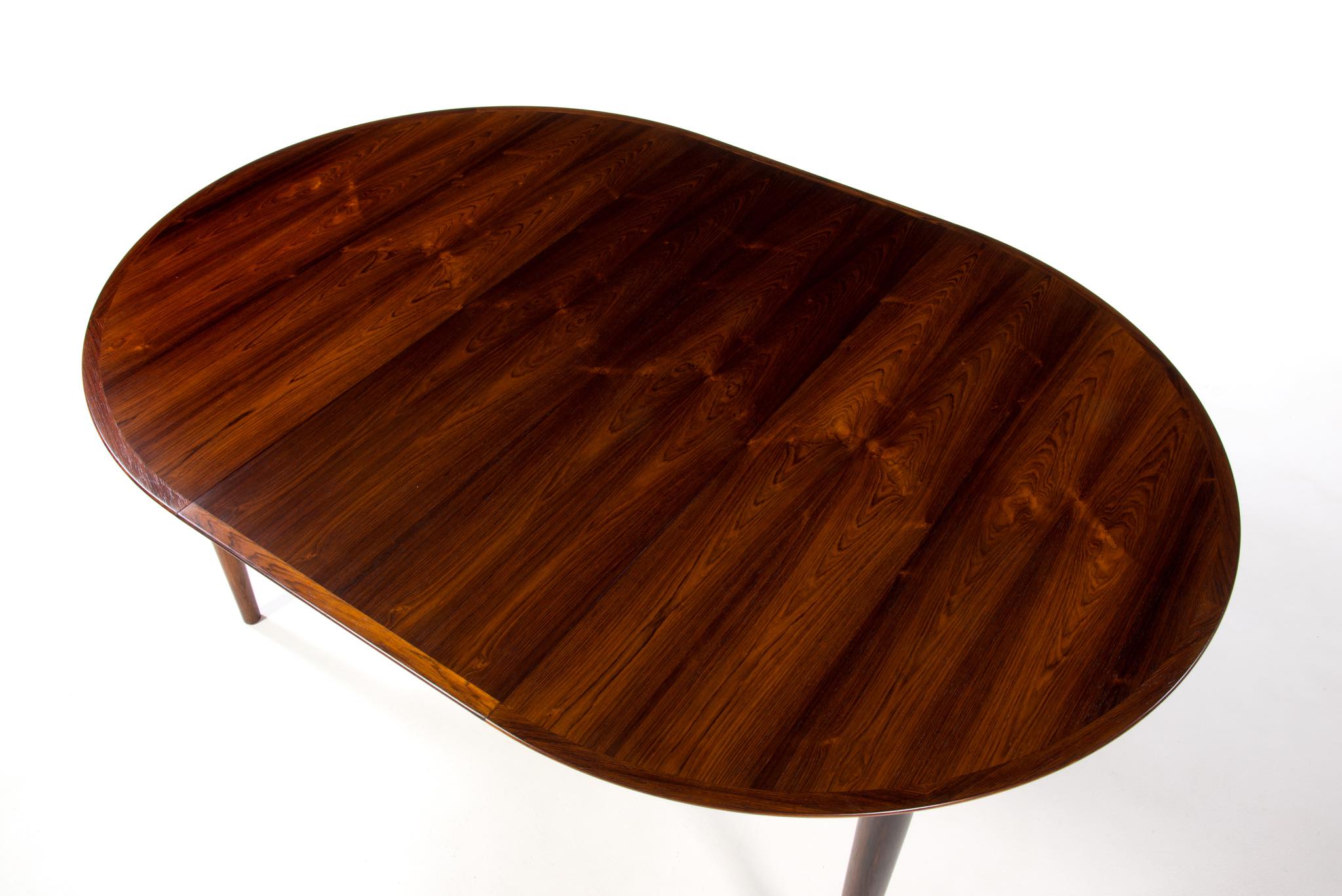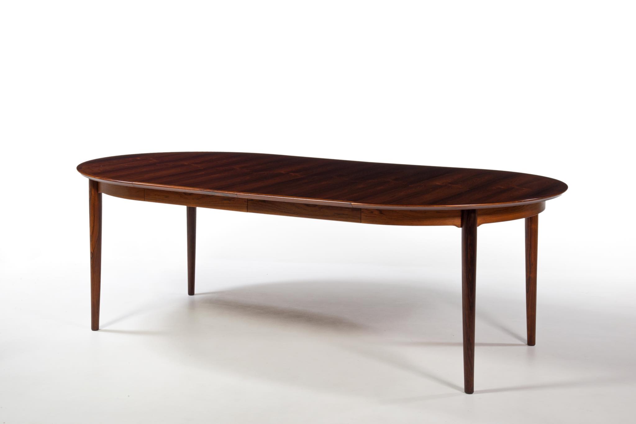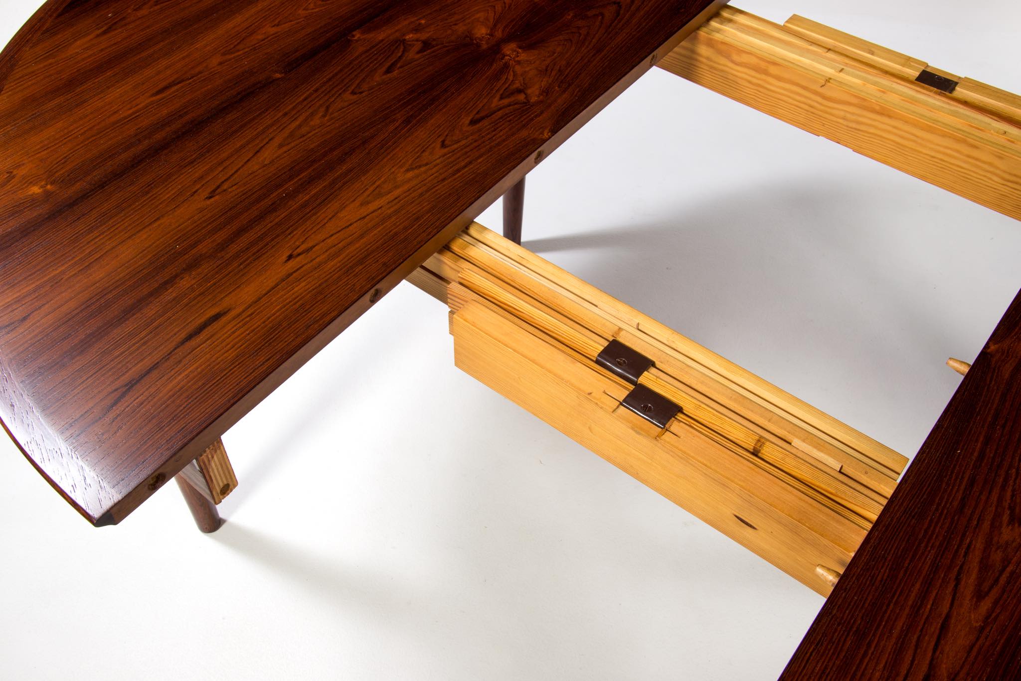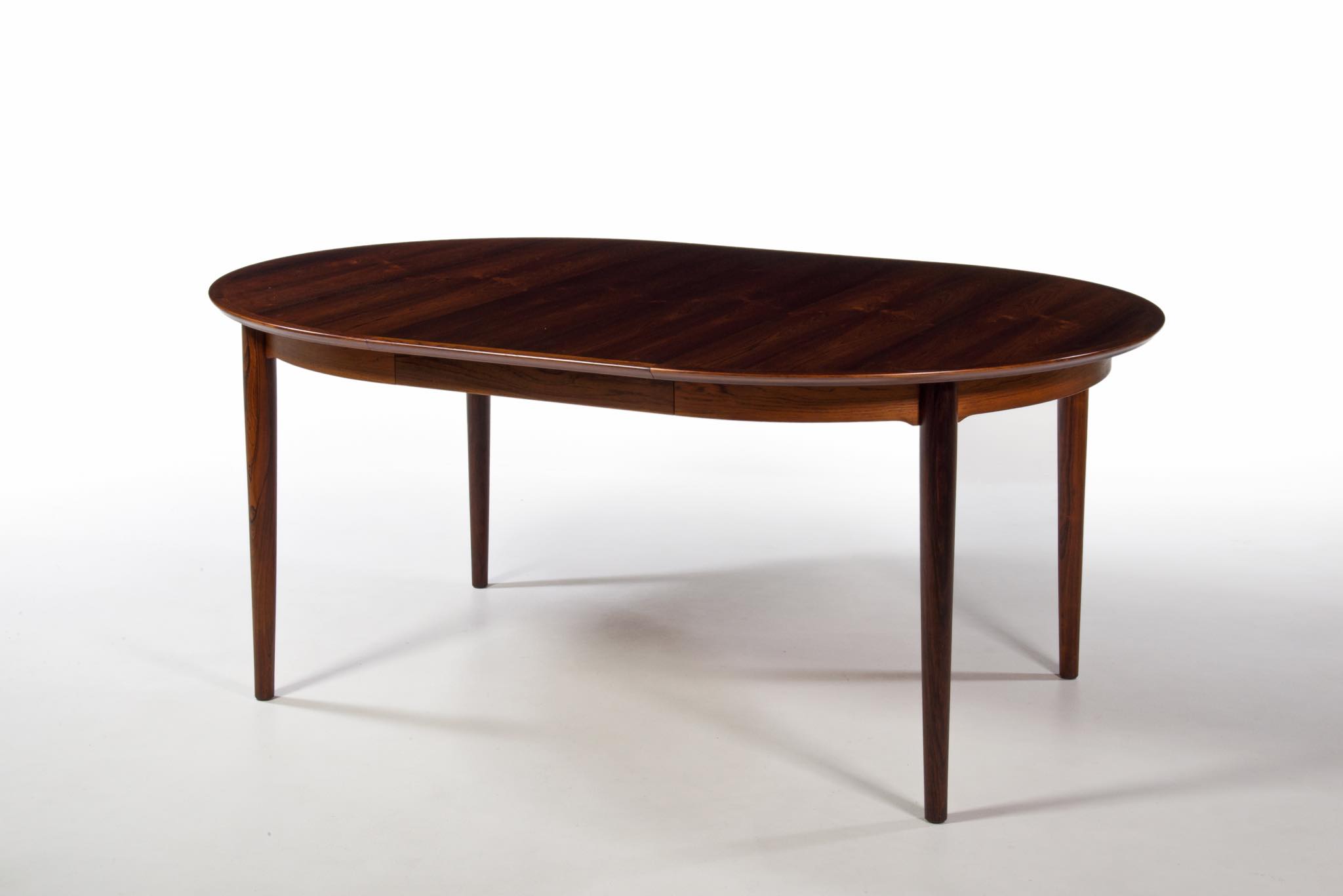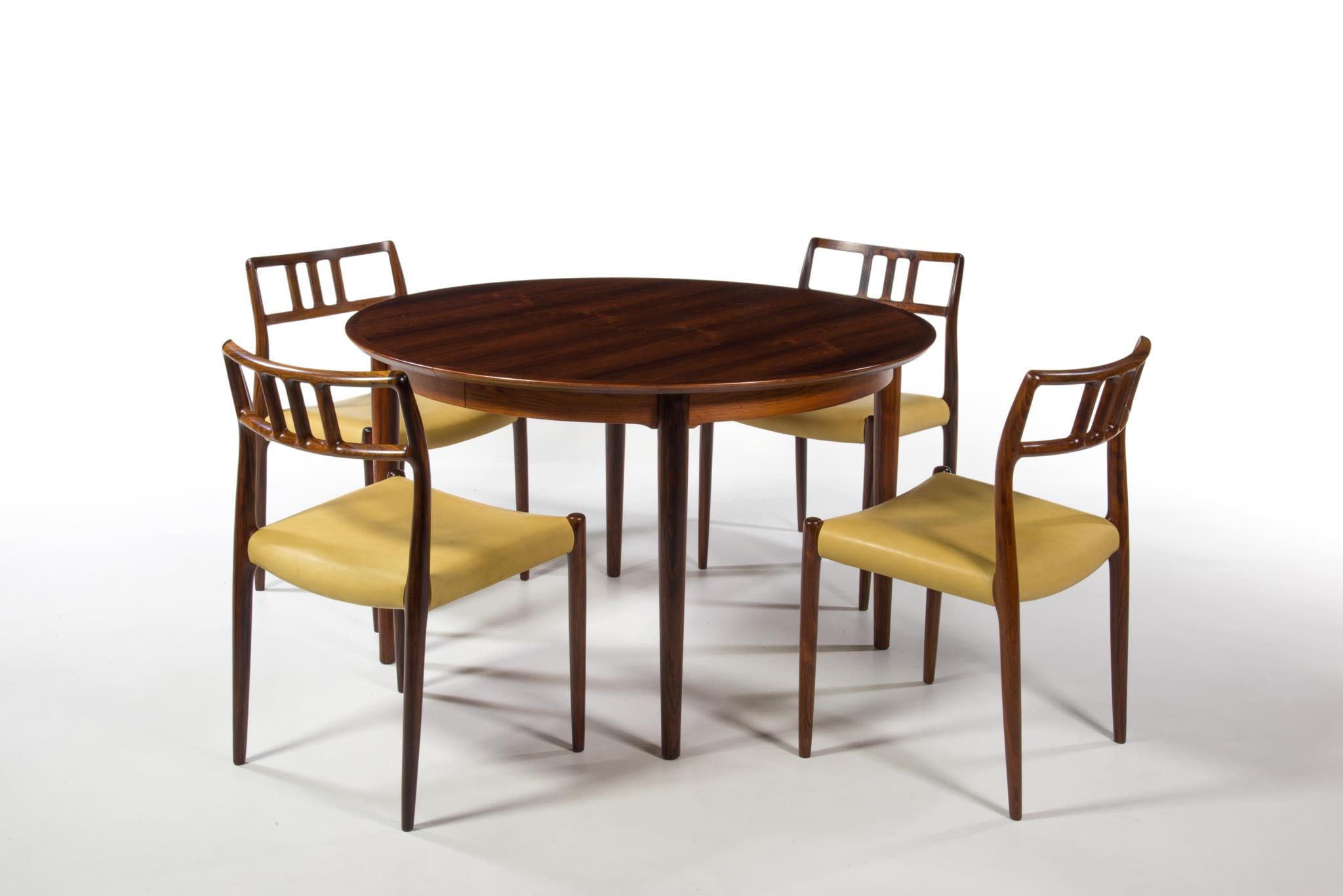 デンマークの家具職人兼デザイナー、Helge Sibast/ヘルエ・シバストによるラウンドダイニングテーブルです。シバスト社を創設した後の1960年代頃に作られたものでしょう。当時人気のあったモデルで、チークなどを含め多くの製品が世に出されたようです。こちらのテーブルはブラジル原産と思しき良質なローズウッド材が用いられています。天板に現れた連続した木目が際立っており、このテーブルの魅力と言えるでしょう。エクステンションリーフが二枚付属します。コンディションは良好です。
