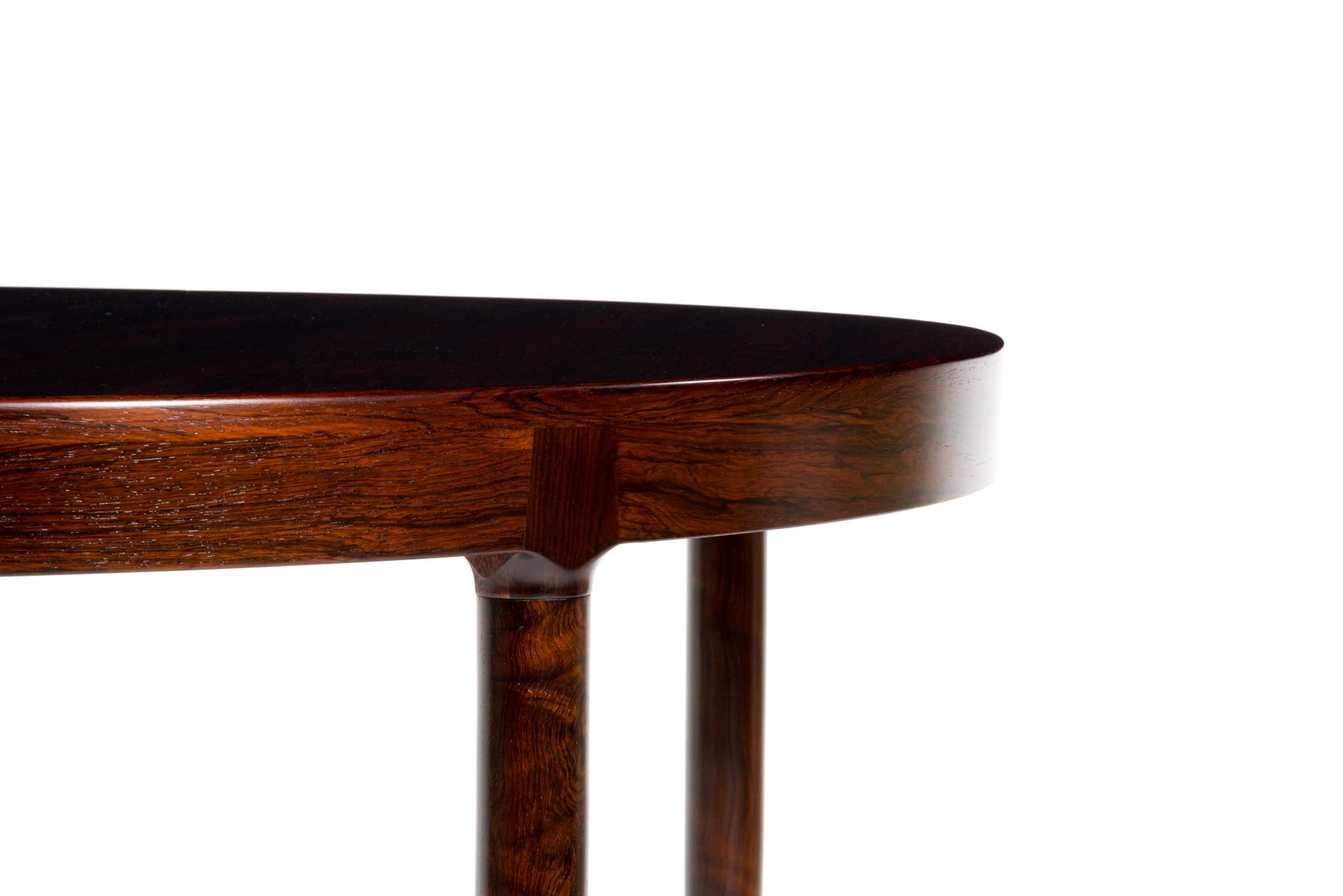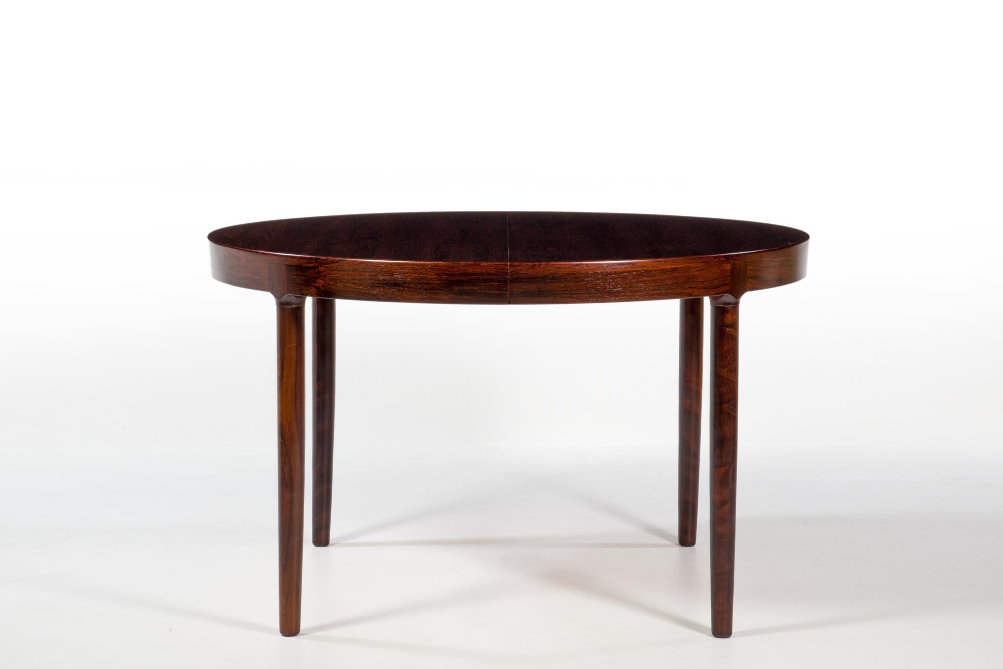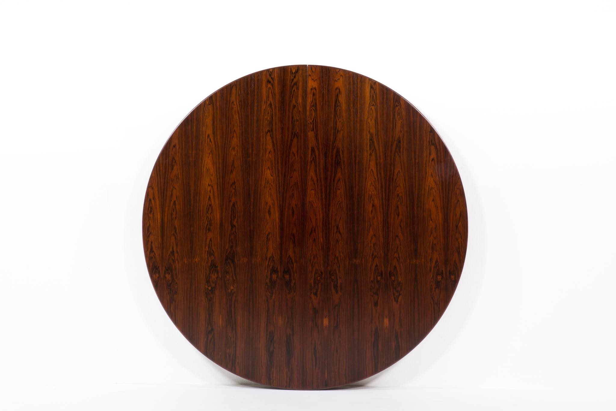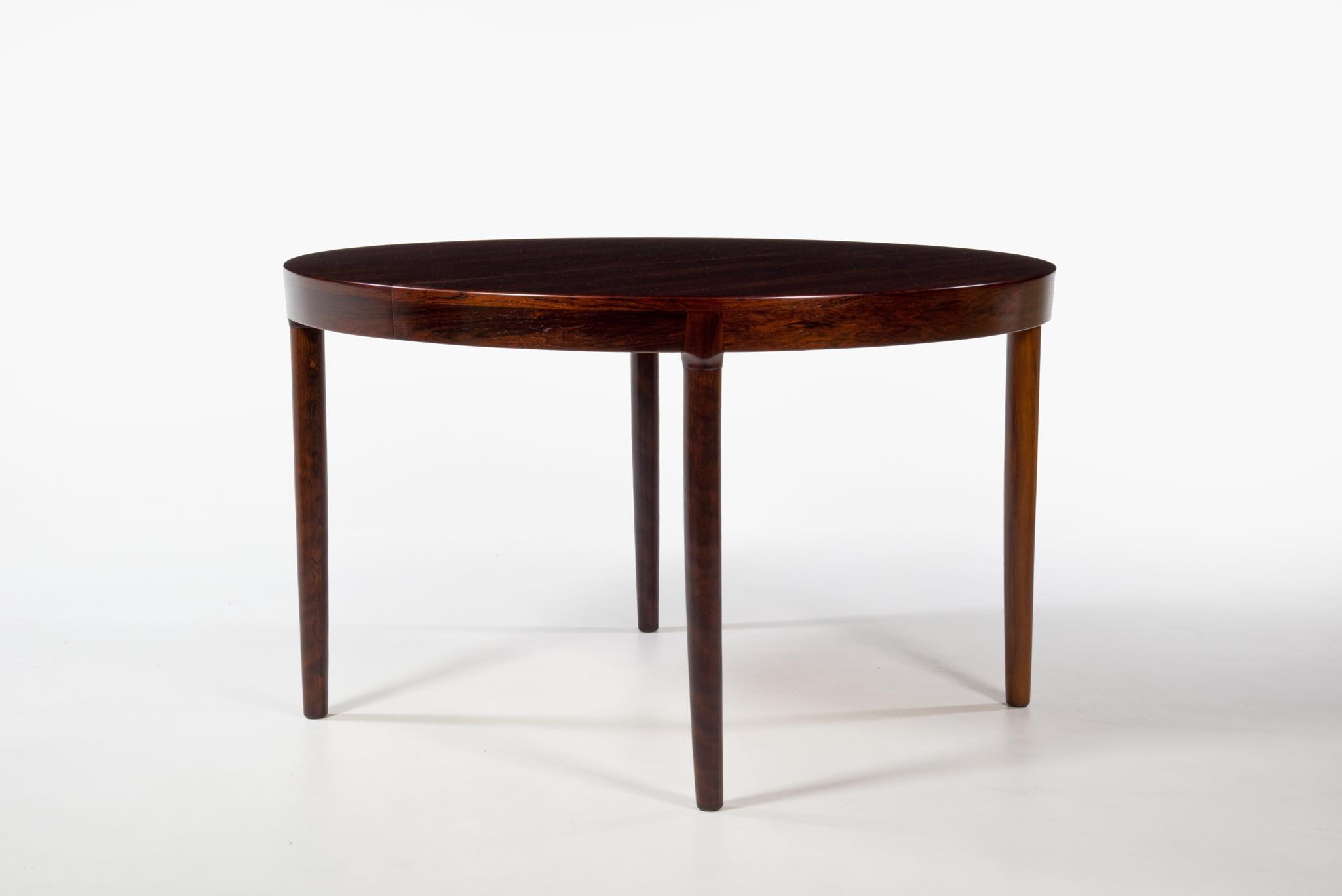 デンマークのデザイナー、Harry Østergaard/ハリー・オスタゴーによるダイニングテーブルです。このモデルは楕円形のタイプが多く作られましたが、この正円形のタイプは比較的希少のようです。天板にはブラジル原産と思しき、見応えのあるローズウッドの木目が現れています。天板の幕板に差し込むような取り付け方法に特徴がある脚は、ローズウッドの無垢材を挽いた贅沢な作りのものですが、木目の荒々しさ故に反りが生じています。しかし脚付きに問題はなく、ガタつきや構造的な不安、将来的な心配などはありません。エクステンションリーフは二枚付属し、二枚のうち、幕板があるものは一枚のみとなります。幕板のないエクステンションリーフは、当時パーティ用に使用されたものです。天板の上からクロスを掛けてしまうため幕板の必要はなく、収納スペースを考慮して、幕板の無いものを選択したようです。とても綺麗なテーブルです。