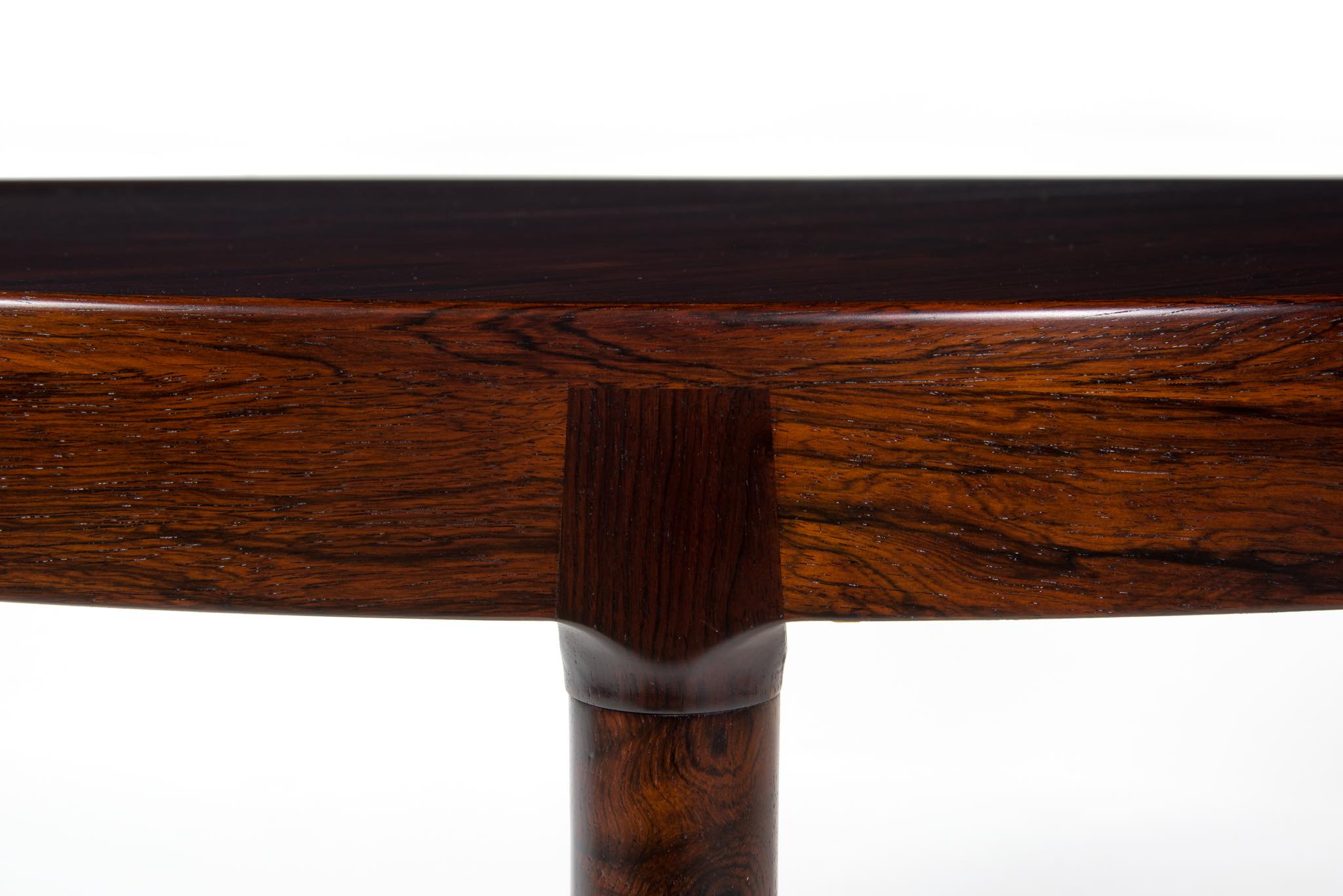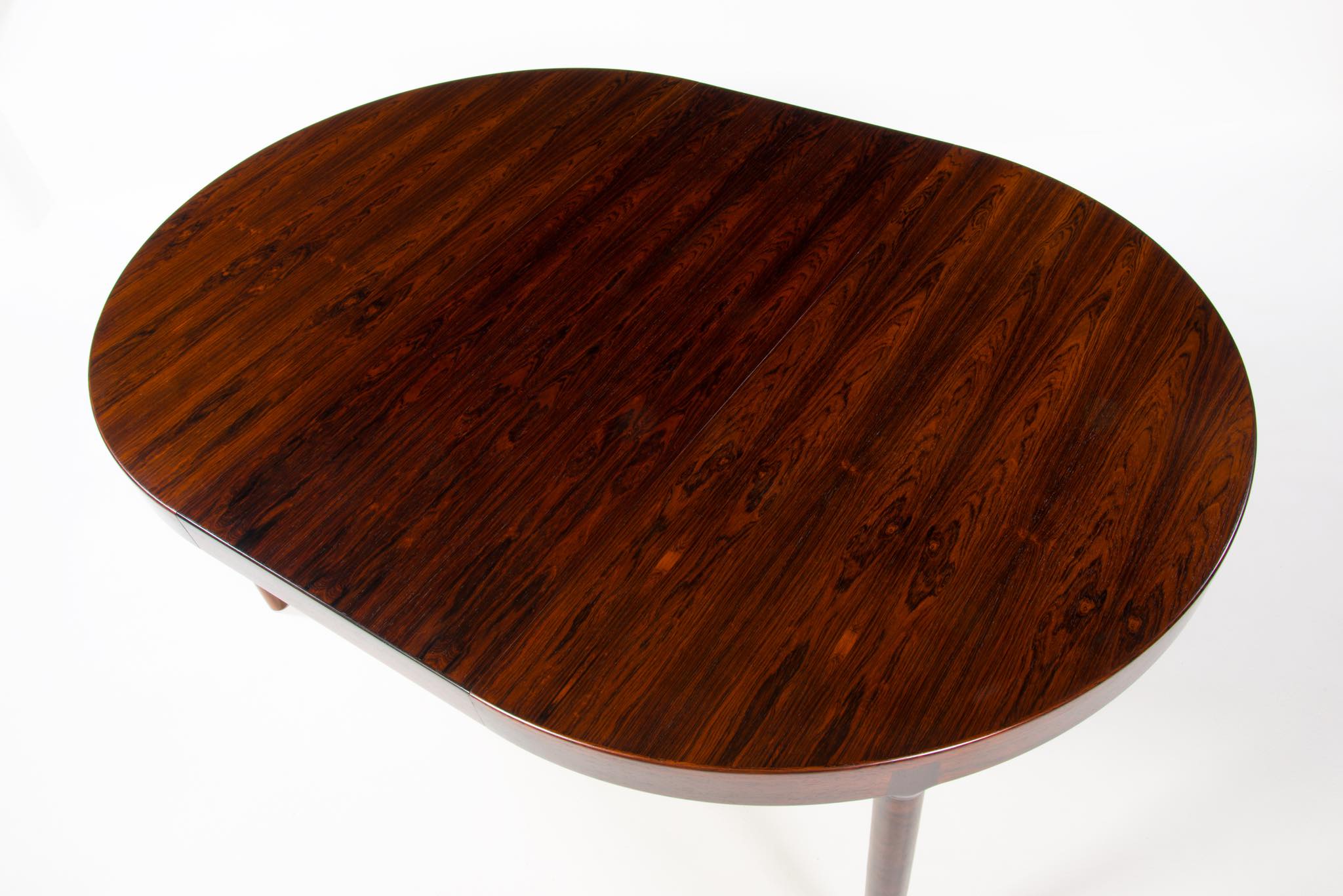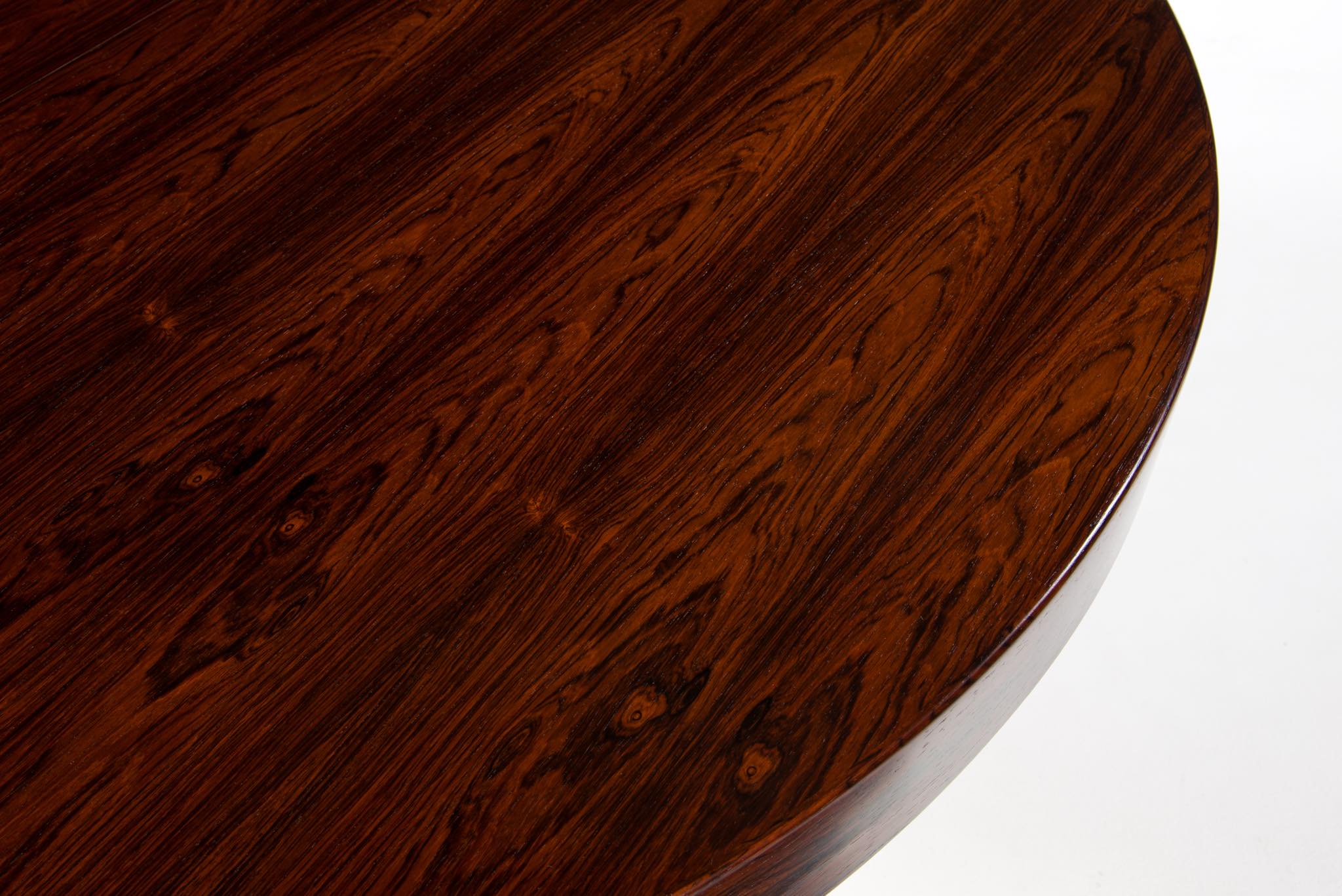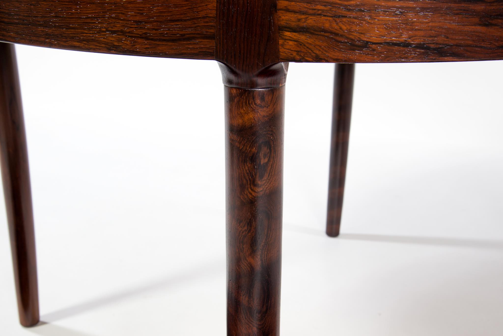 デンマークのデザイナー、Harry Østergaard/ハリー・オスタゴーによるダイニングテーブルです。このモデルは楕円形のタイプが多く作られましたが、この正円形のタイプは比較的希少のようです。天板にはブラジル原産と思しき、見応えのあるローズウッドの木目が現れています。天板の幕板に差し込むような取り付け方法に特徴がある脚は、ローズウッドの無垢材を挽いた贅沢な作りのものですが、木目の荒々しさ故に反りが生じています。しかし脚付きに問題はなく、ガタつきや構造的な不安、将来的な心配などはありません。エクステンションリーフは二枚付属し、二枚のうち、幕板があるものは一枚のみとなります。幕板のないエクステンションリーフは、当時パーティ用に使用されたものです。天板の上からクロスを掛けてしまうため幕板の必要はなく、収納スペースを考慮して、幕板の無いものを選択したようです。とても綺麗なテーブルです。