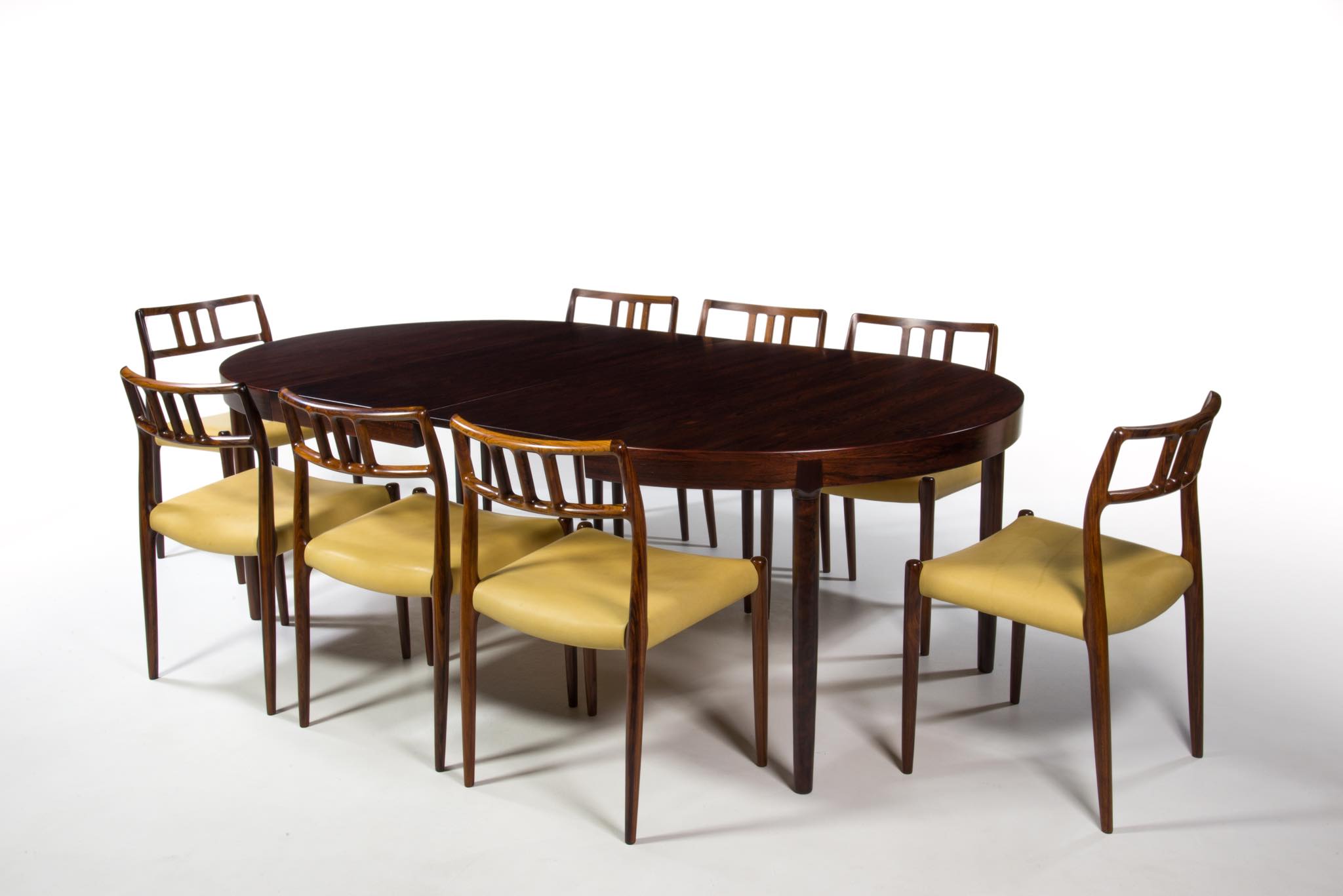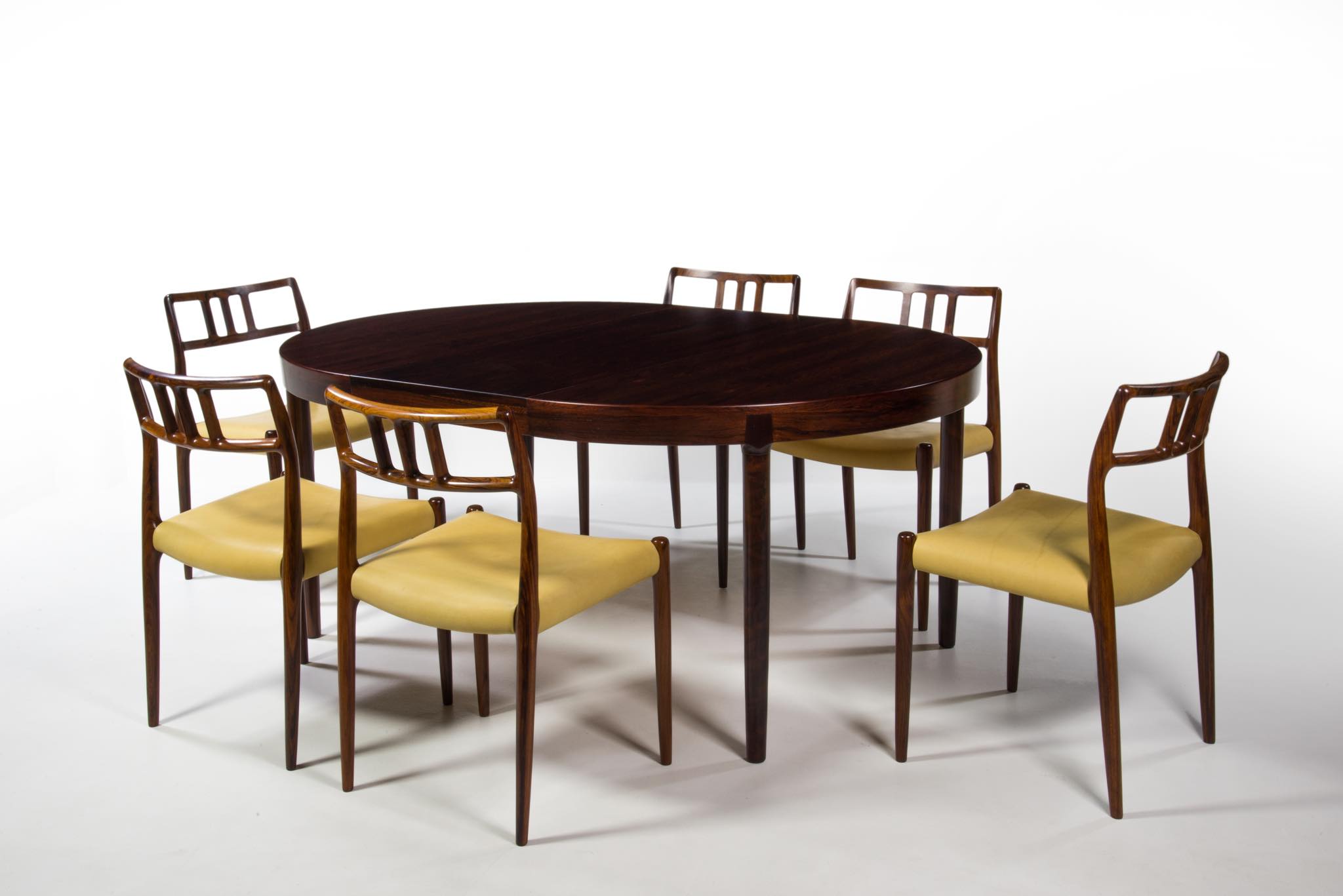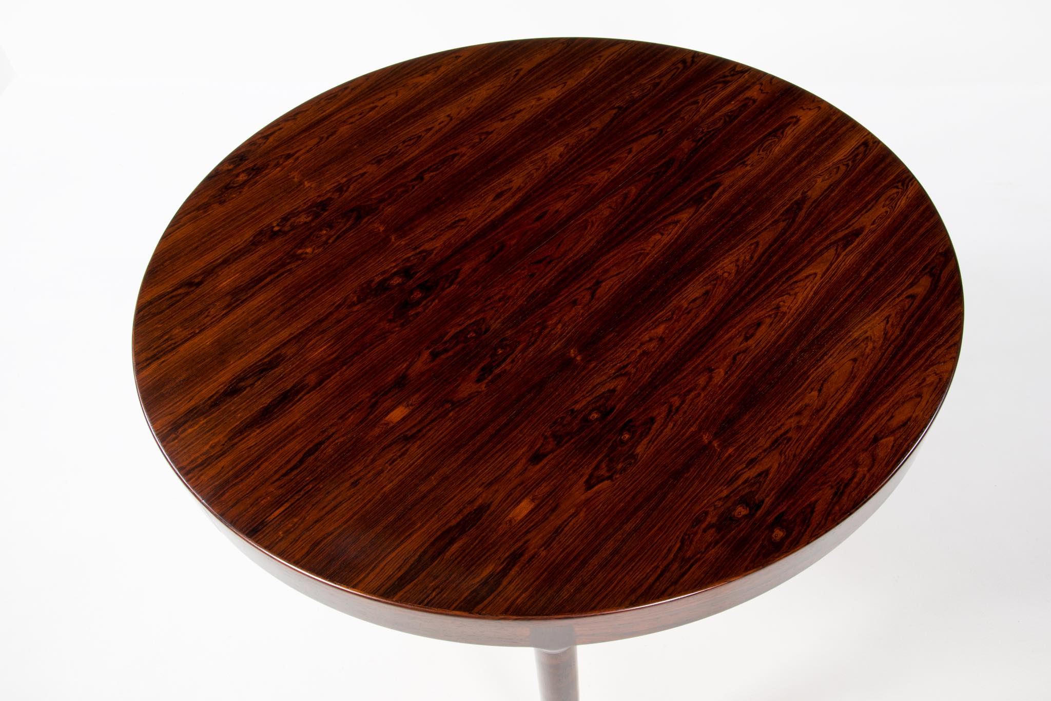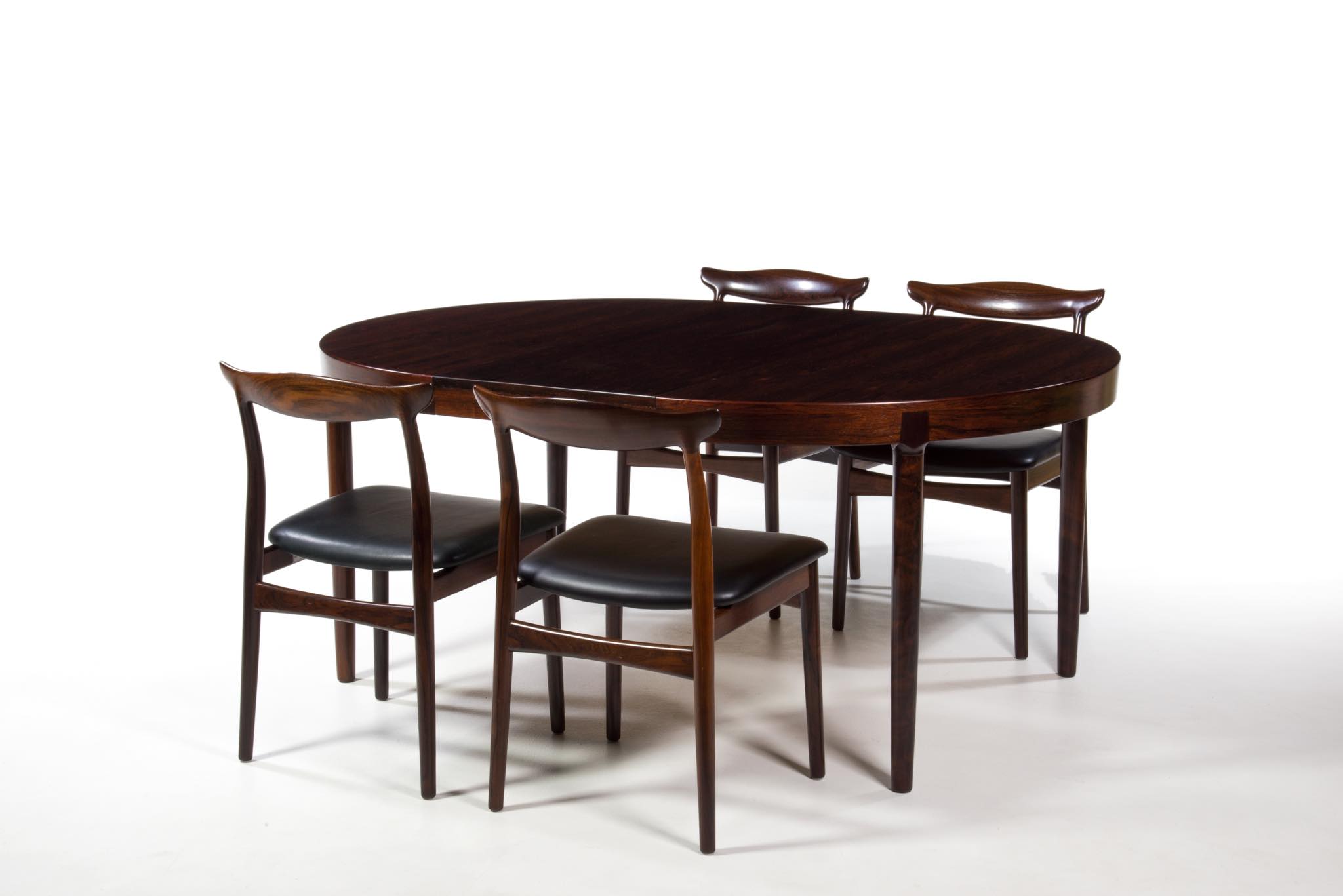 デンマークのデザイナー、Harry Østergaard/ハリー・オスタゴーによるダイニングテーブルです。このモデルは楕円形のタイプが多く作られましたが、この正円形のタイプは比較的希少のようです。天板にはブラジル原産と思しき、見応えのあるローズウッドの木目が現れています。天板の幕板に差し込むような取り付け方法に特徴がある脚は、ローズウッドの無垢材を挽いた贅沢な作りのものですが、木目の荒々しさ故に反りが生じています。しかし脚付きに問題はなく、ガタつきや構造的な不安、将来的な心配などはありません。エクステンションリーフは二枚付属し、二枚のうち、幕板があるものは一枚のみとなります。幕板のないエクステンションリーフは、当時パーティ用に使用されたものです。天板の上からクロスを掛けてしまうため幕板の必要はなく、収納スペースを考慮して、幕板の無いものを選択したようです。とても綺麗なテーブルです。