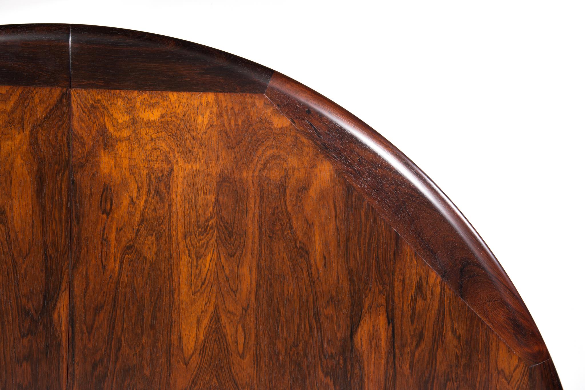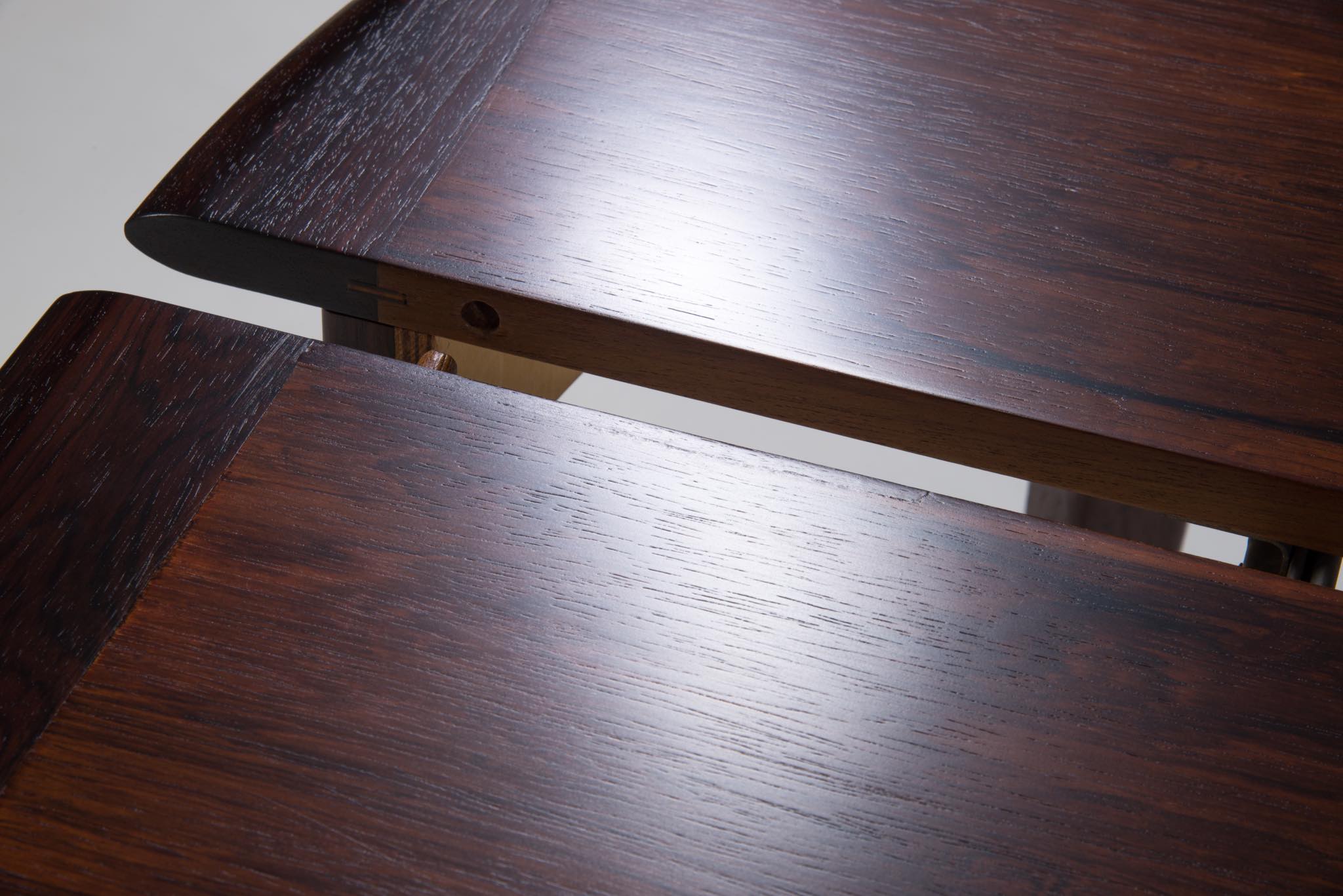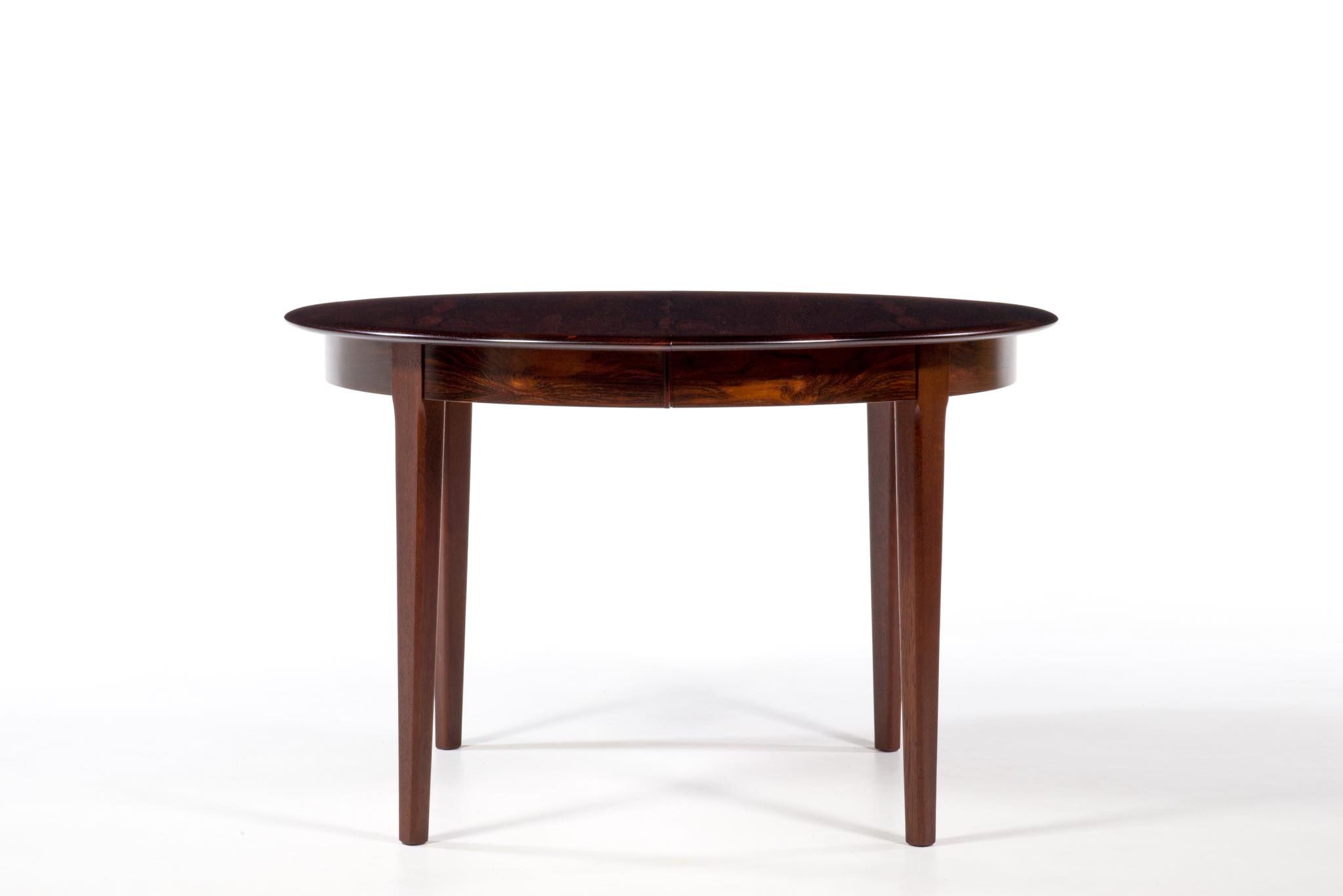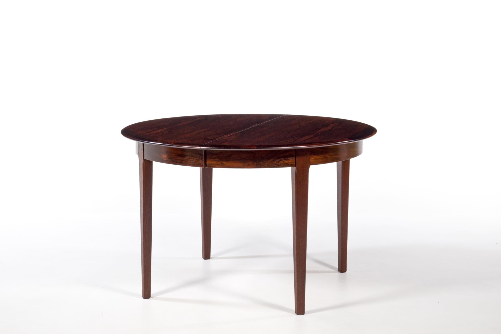 デンマークのキャビネットメーカーで1960年代頃に作られたラウンド型のダイニングテーブルです。天板はローズウッド材、脚はマホガニー材が用いられています。直径が114cmと小振りなタイプですが、エクステンションリーフが3枚付属し、全てを装着すると最大で260cmを超えます。天板拡張サイズは下記詳細に記載しておりますのでご確認ください。3枚のエクステンションリーフに仕様の相違があります。(リーフ1:幕板有り。主天板との杢目が合い、エッジ無垢部分の杢目も揃う。)(リーフ2:幕板有り。主天板との杢目は合うが、エッジ無垢部分の杢目は揃わない。)(リーフ3:幕板なし。主天板との木目は合わない。)また、主天板のエッジ部分に古い突板の呼継がありますが、全体にとても綺麗な状態です。