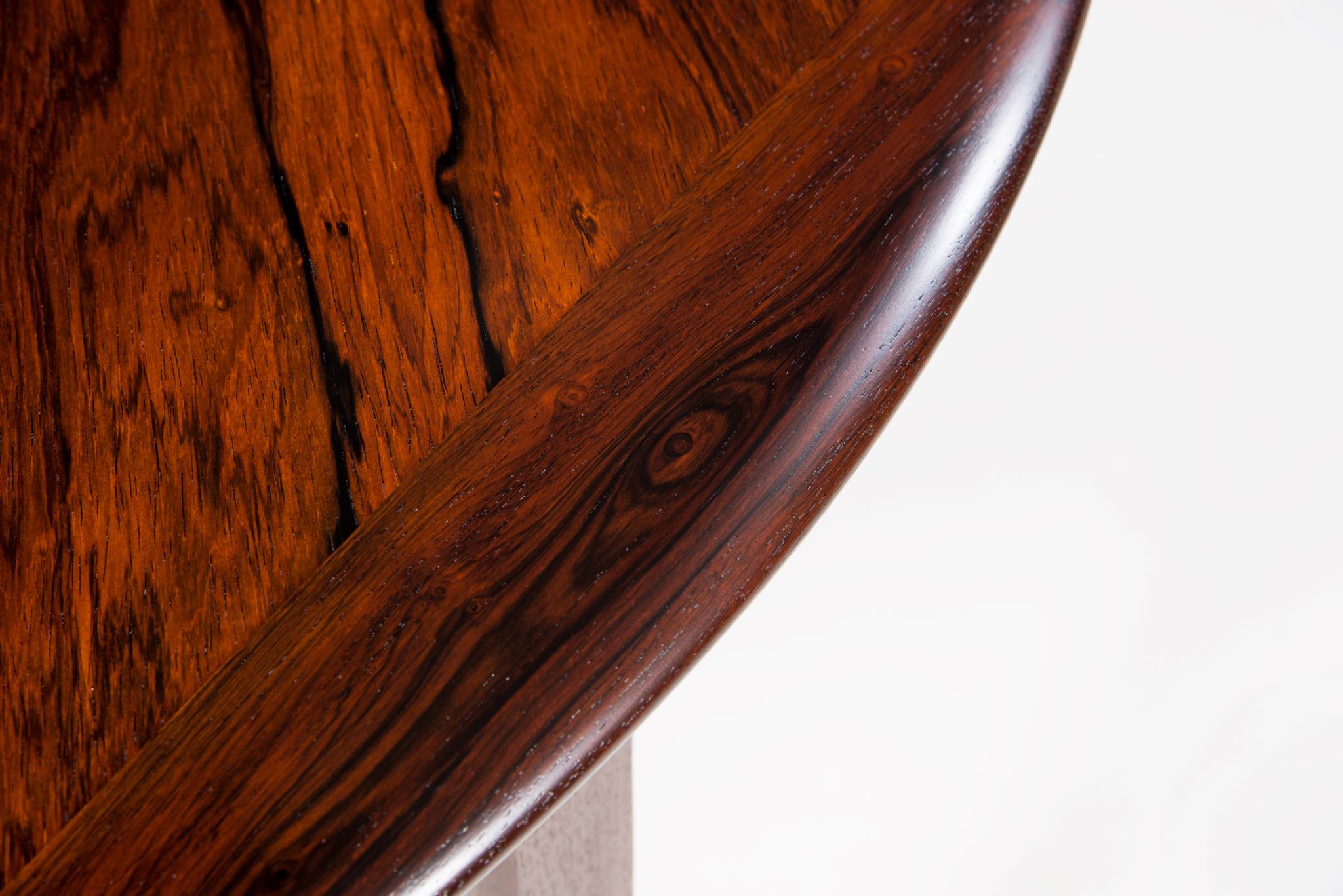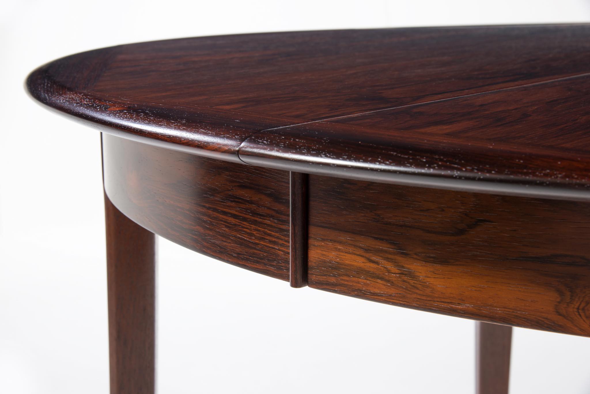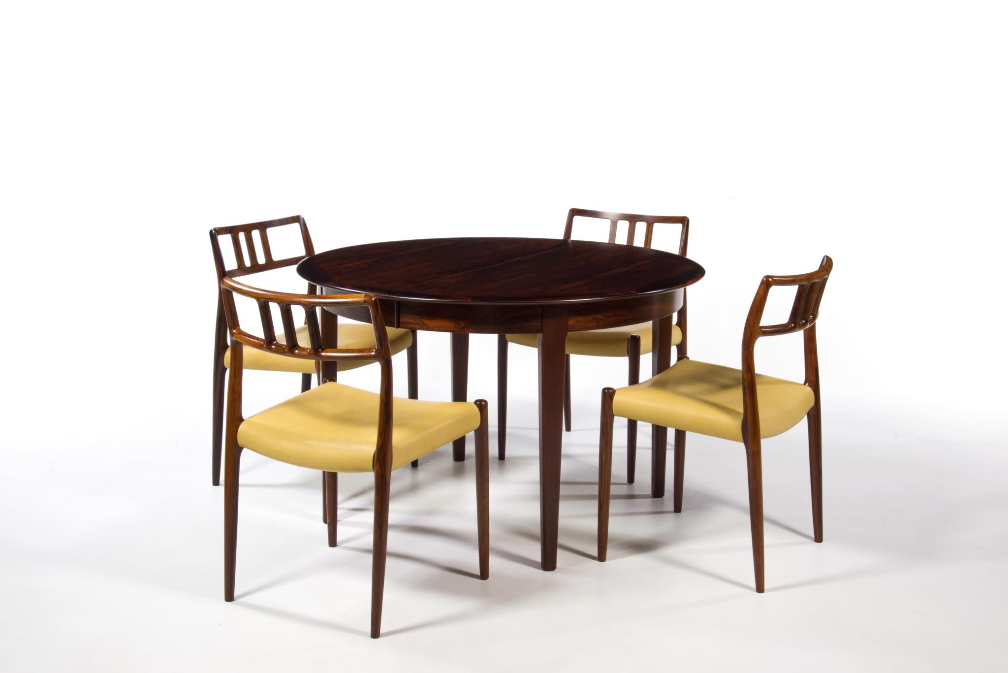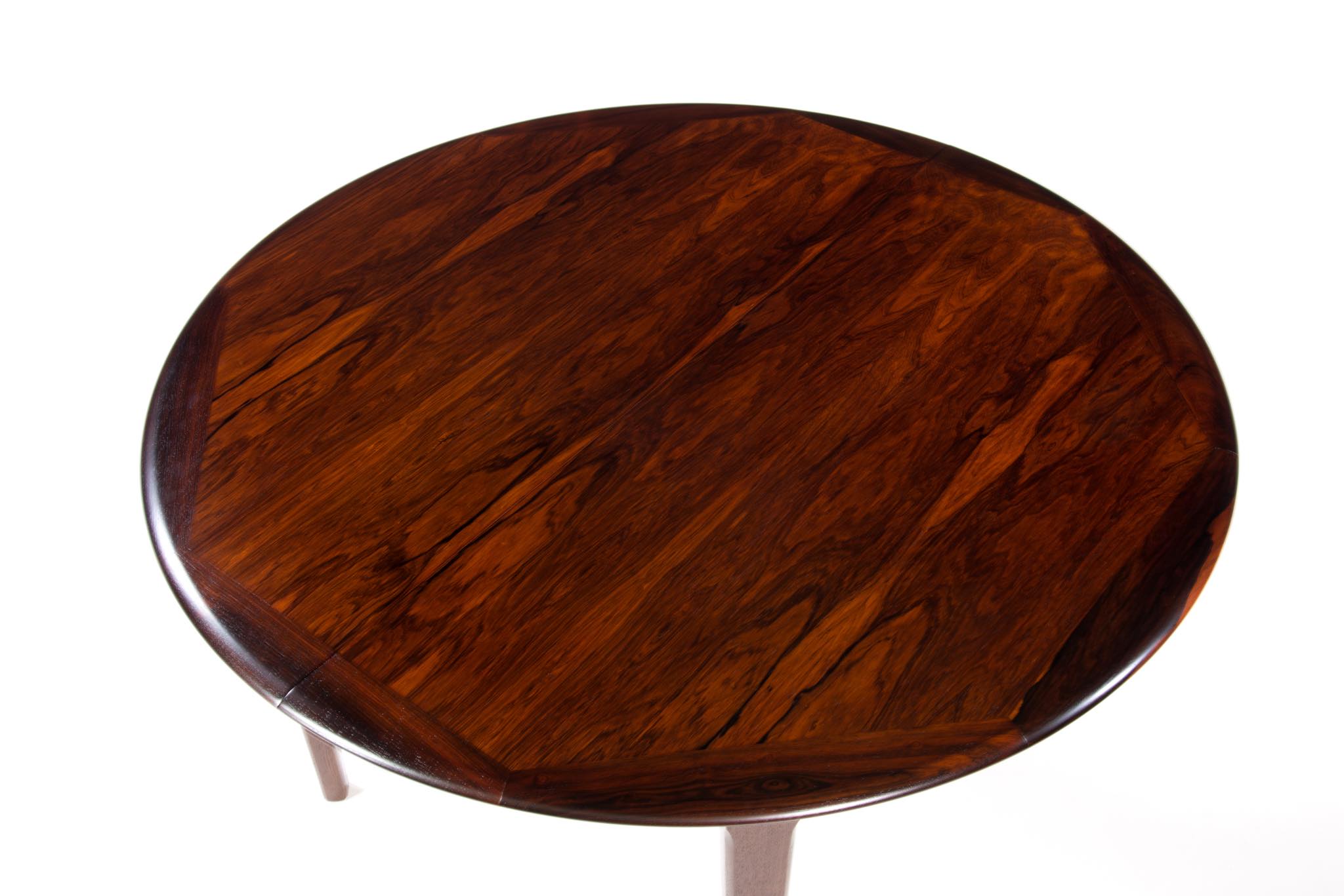 デンマークのキャビネットメーカーで1960年代頃に作られたラウンド型のダイニングテーブルです。天板はローズウッド材、脚はマホガニー材が用いられています。直径が114cmと小振りなタイプですが、エクステンションリーフが3枚付属し、全てを装着すると最大で260cmを超えます。天板拡張サイズは下記詳細に記載しておりますのでご確認ください。3枚のエクステンションリーフに仕様の相違があります。(リーフ1:幕板有り。主天板との杢目が合い、エッジ無垢部分の杢目も揃う。)(リーフ2:幕板有り。主天板との杢目は合うが、エッジ無垢部分の杢目は揃わない。)(リーフ3:幕板なし。主天板との木目は合わない。)また、主天板のエッジ部分に古い突板の呼継がありますが、全体にとても綺麗な状態です。