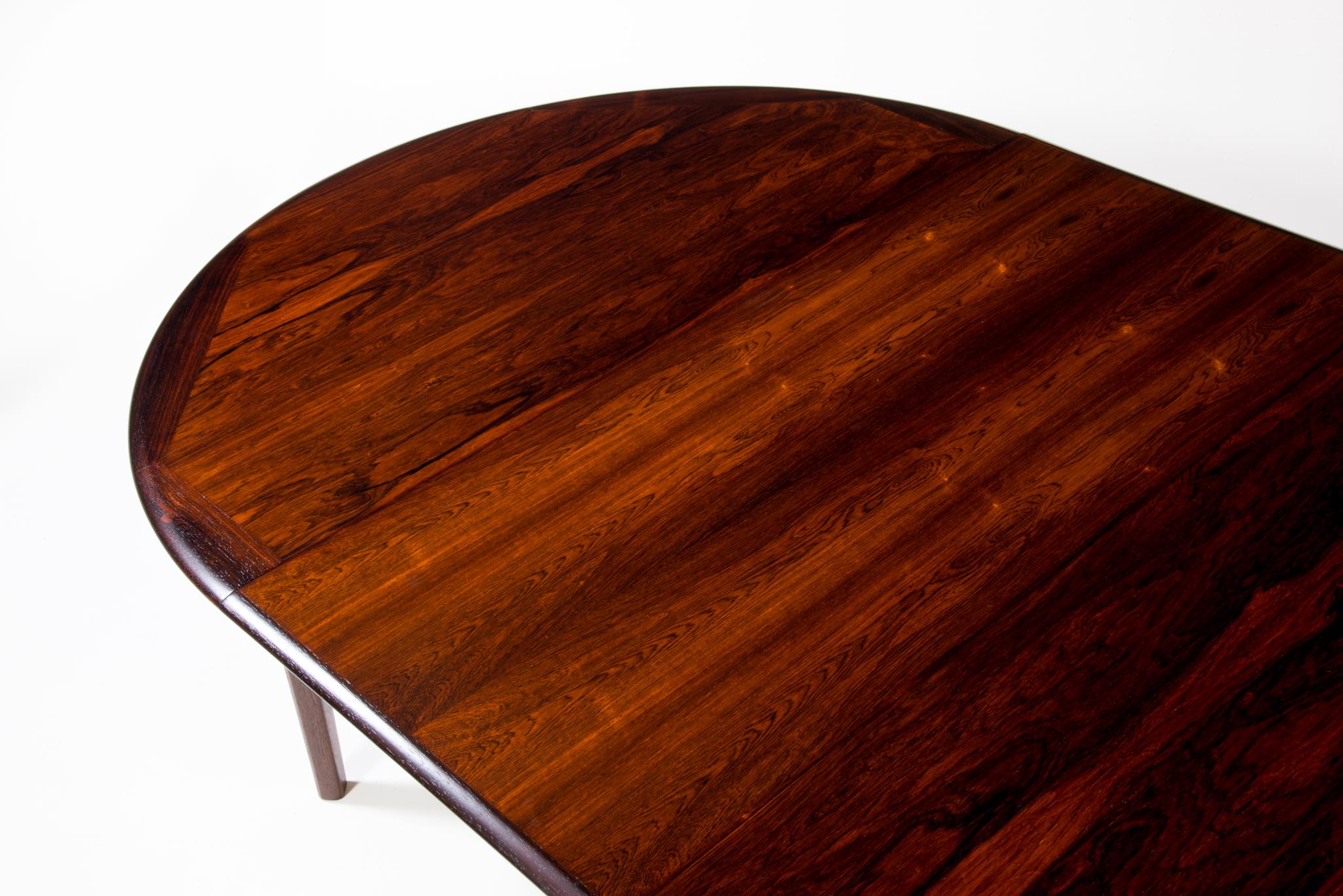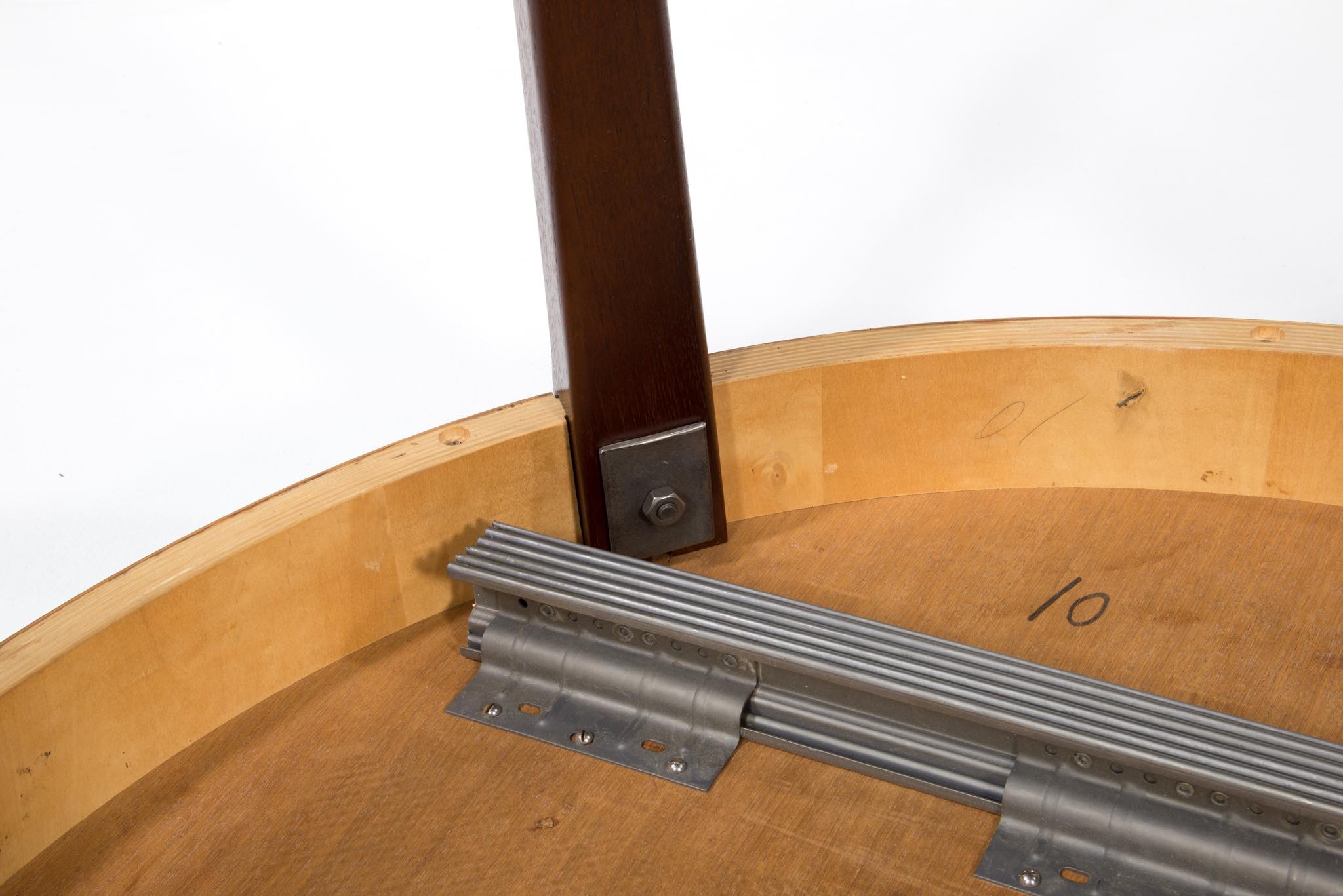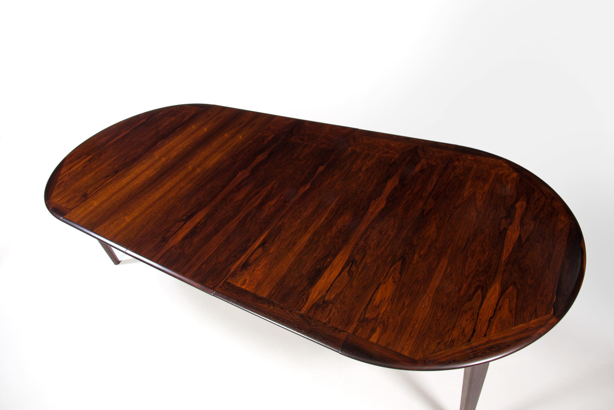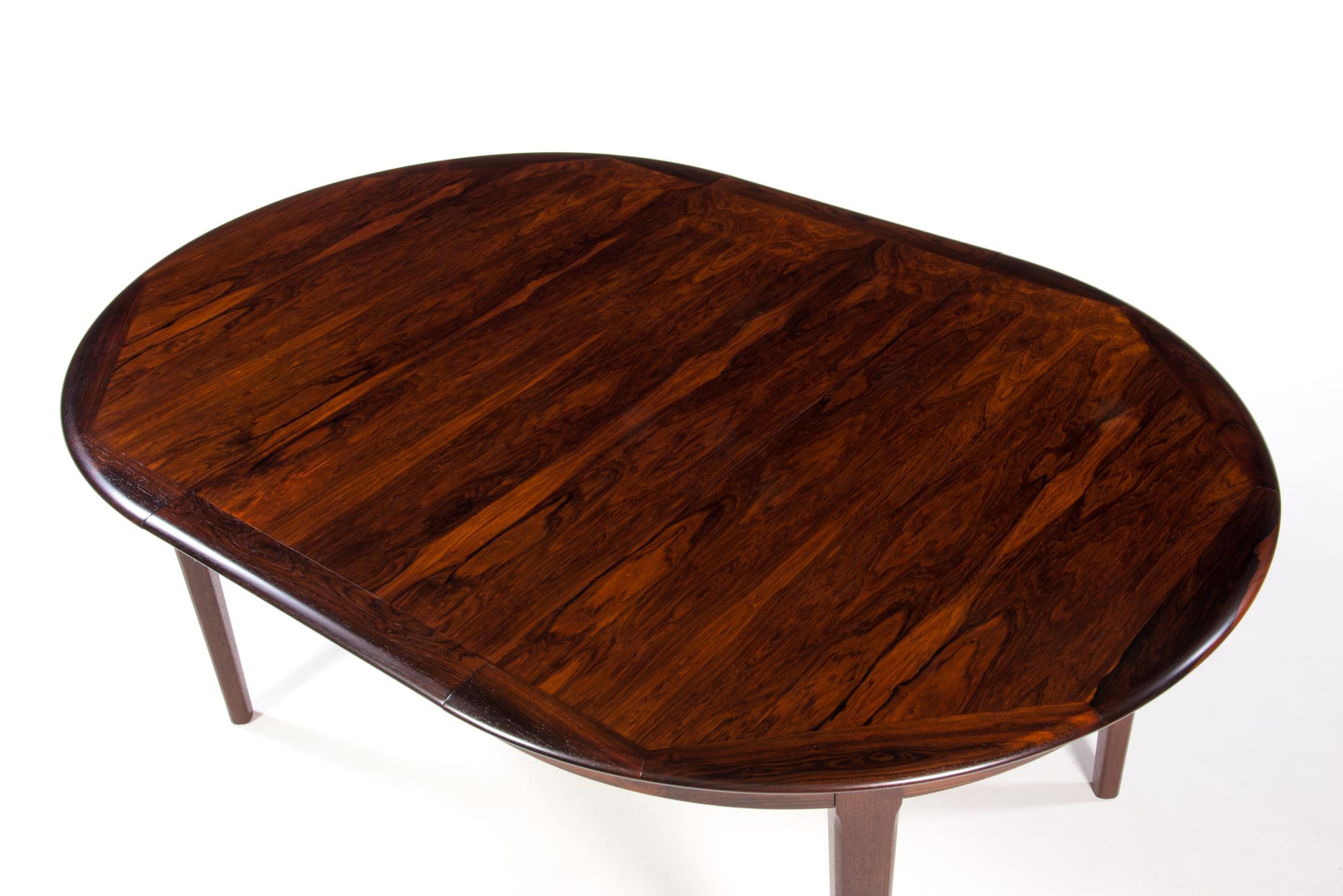 デンマークのキャビネットメーカーで1960年代頃に作られたラウンド型のダイニングテーブルです。天板はローズウッド材、脚はマホガニー材が用いられています。直径が114cmと小振りなタイプですが、エクステンションリーフが3枚付属し、全てを装着すると最大で260cmを超えます。天板拡張サイズは下記詳細に記載しておりますのでご確認ください。3枚のエクステンションリーフに仕様の相違があります。(リーフ1:幕板有り。主天板との杢目が合い、エッジ無垢部分の杢目も揃う。)(リーフ2:幕板有り。主天板との杢目は合うが、エッジ無垢部分の杢目は揃わない。)(リーフ3:幕板なし。主天板との木目は合わない。)また、主天板のエッジ部分に古い突板の呼継がありますが、全体にとても綺麗な状態です。