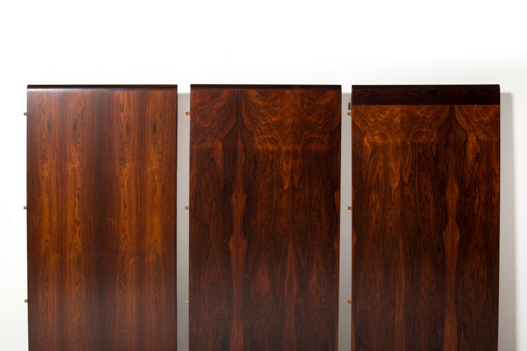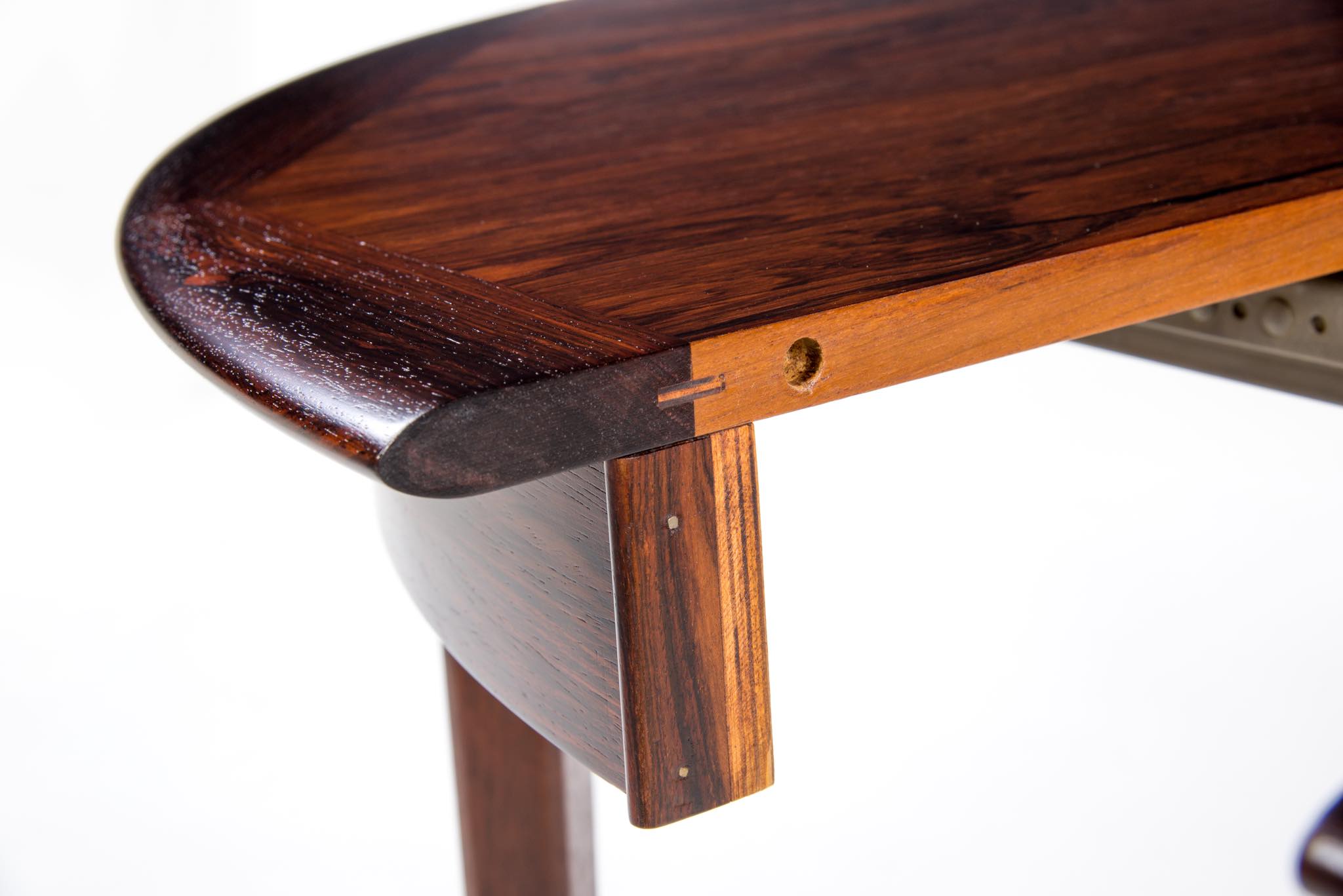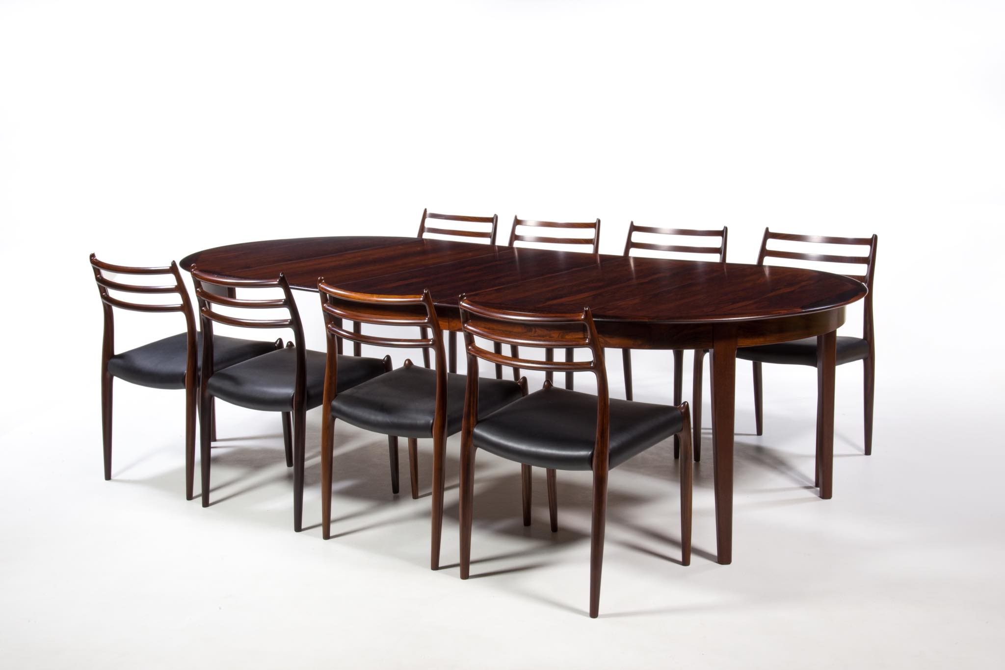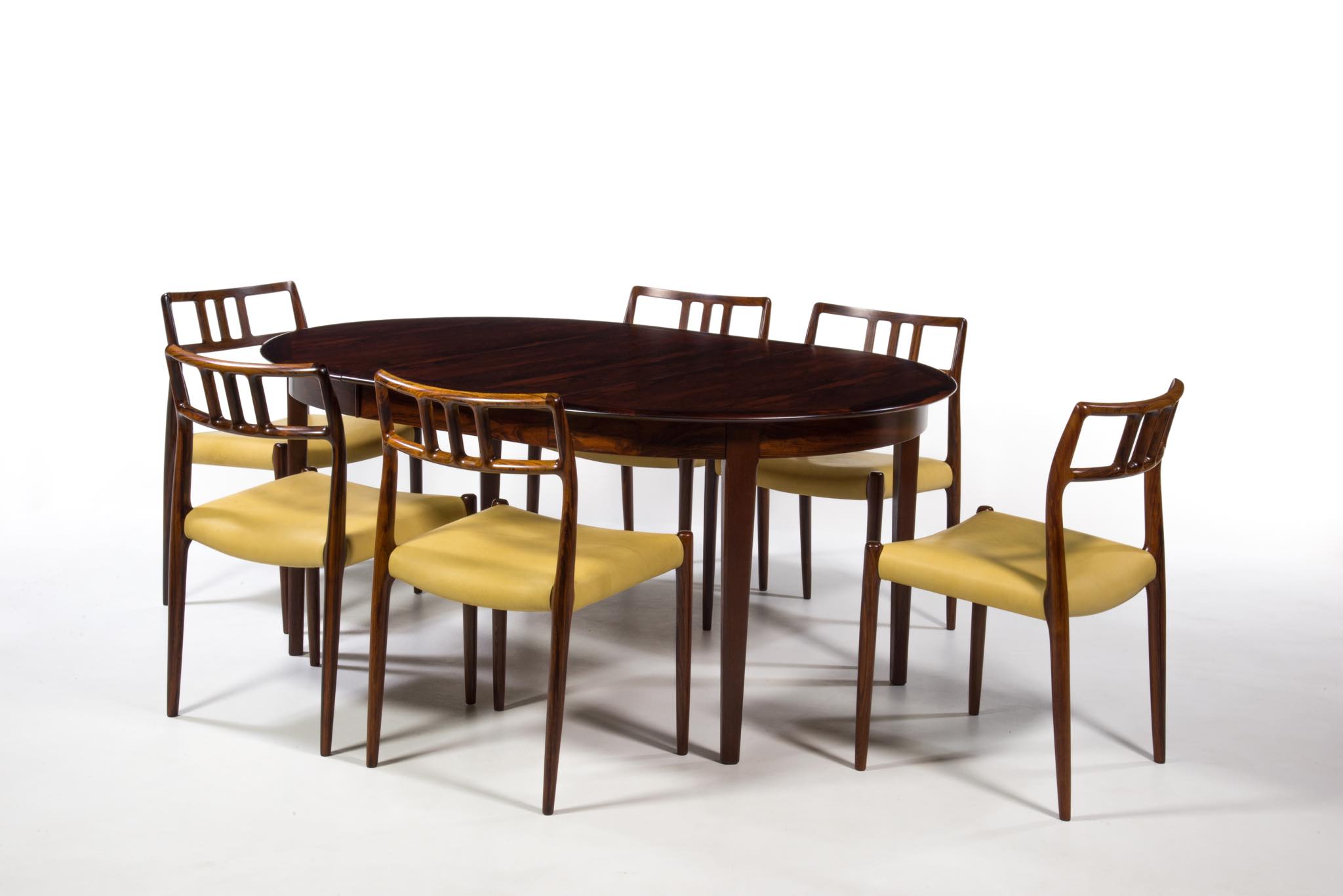 デンマークのキャビネットメーカーで1960年代頃に作られたラウンド型のダイニングテーブルです。天板はローズウッド材、脚はマホガニー材が用いられています。直径が114cmと小振りなタイプですが、エクステンションリーフが3枚付属し、全てを装着すると最大で260cmを超えます。天板拡張サイズは下記詳細に記載しておりますのでご確認ください。3枚のエクステンションリーフに仕様の相違があります。(リーフ1:幕板有り。主天板との杢目が合い、エッジ無垢部分の杢目も揃う。)(リーフ2:幕板有り。主天板との杢目は合うが、エッジ無垢部分の杢目は揃わない。)(リーフ3:幕板なし。主天板との木目は合わない。)また、主天板のエッジ部分に古い突板の呼継がありますが、全体にとても綺麗な状態です。