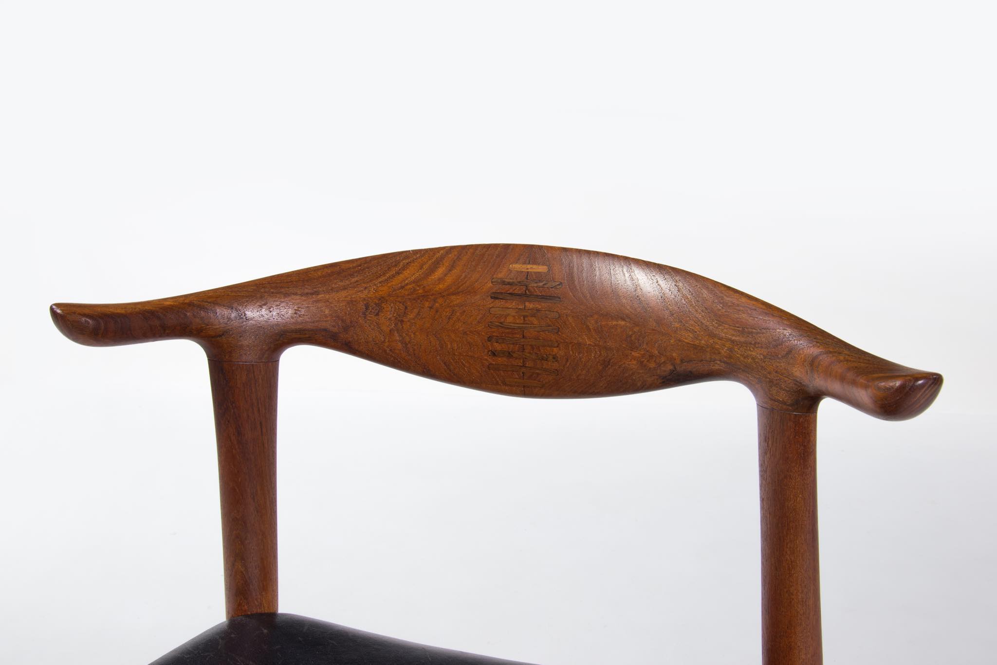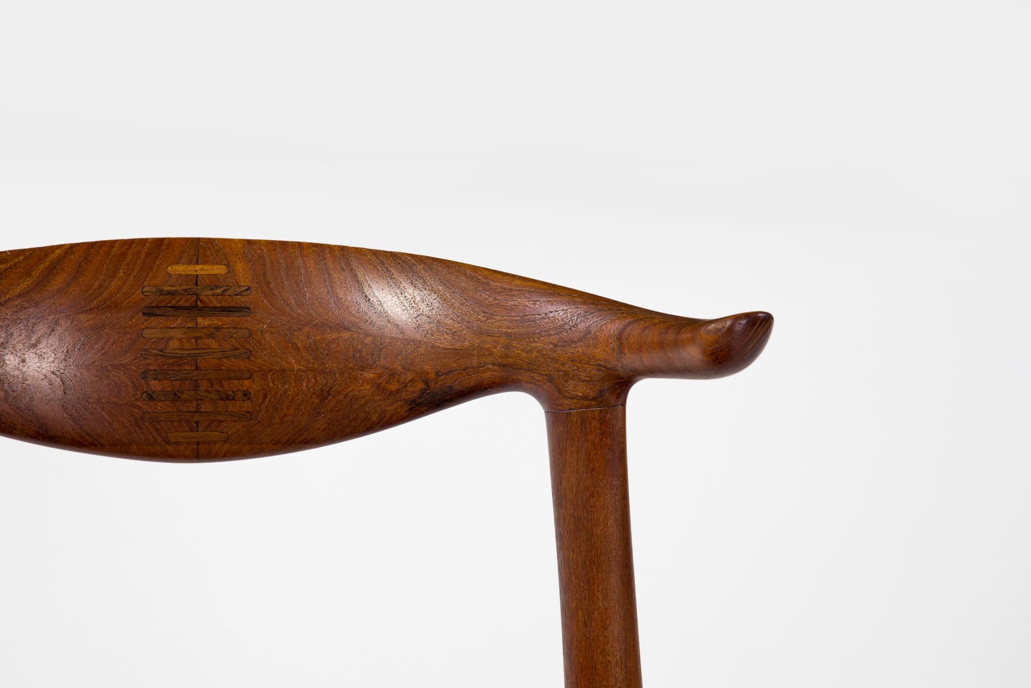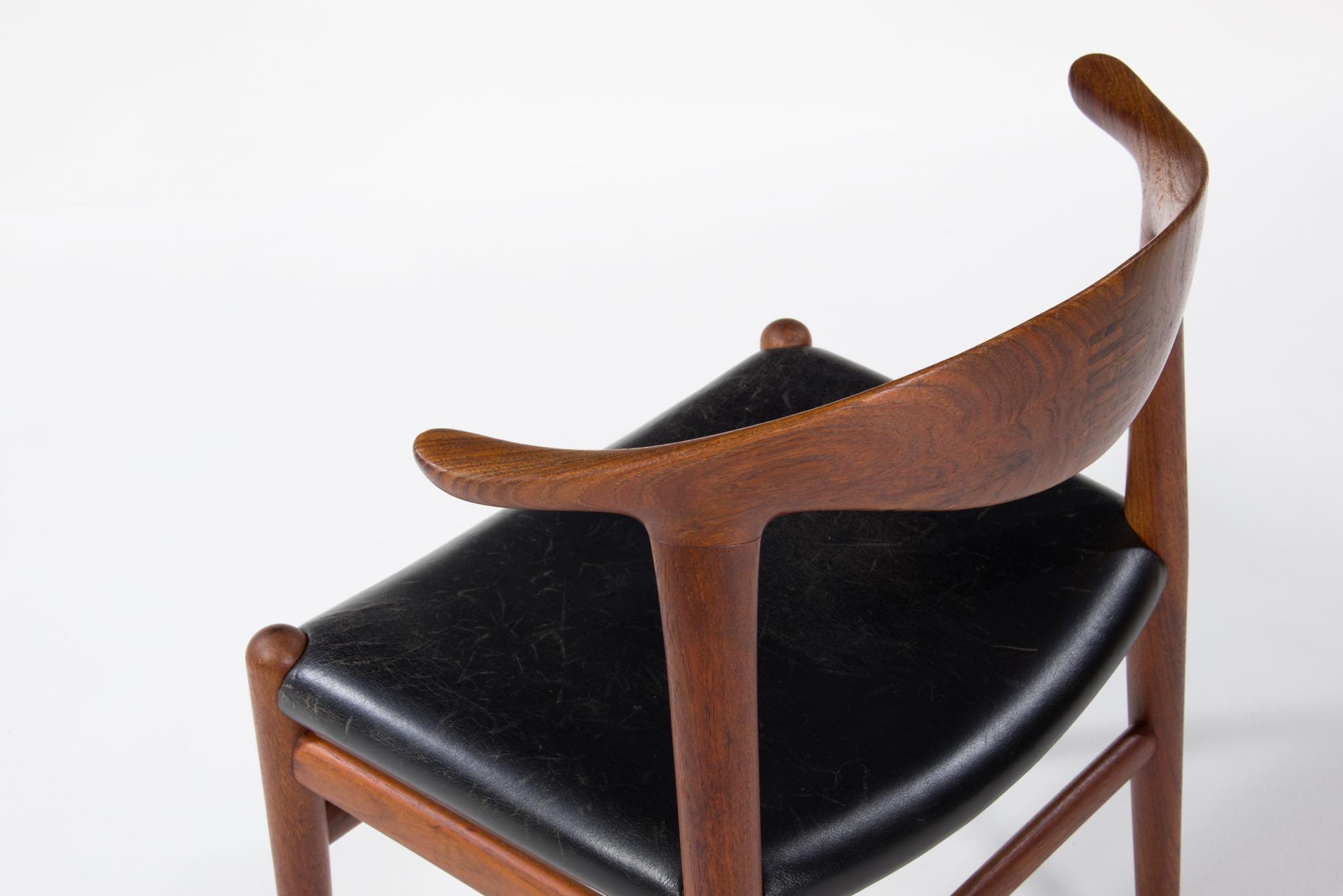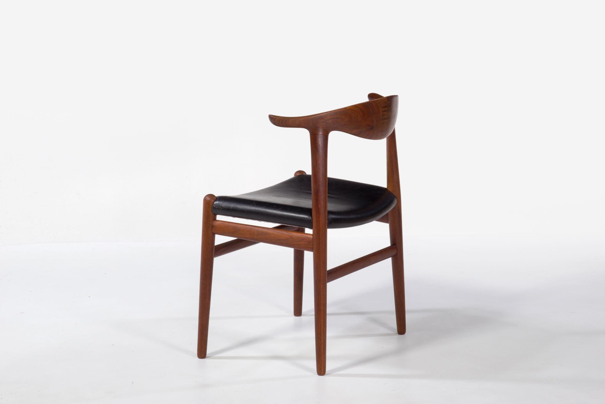 デンマークを代表する家具デザイナーのHans J. Wegner/ハンス・ウェグナーによる名作椅子”カウホーン”チェアです。 本体にはチーク材が用いられており、複雑に現れた木目が特徴的です。笠木にはローズウッドが象嵌されています。シートの黒色皮革はオリジナルのようですが、緩衝材のウレタンが劣化していたため交換を行い、もとの皮革を張り戻しました。コンディションは良好です。