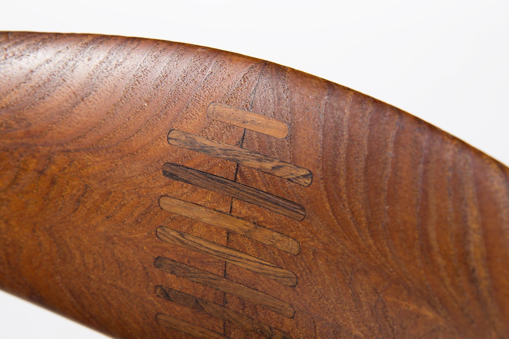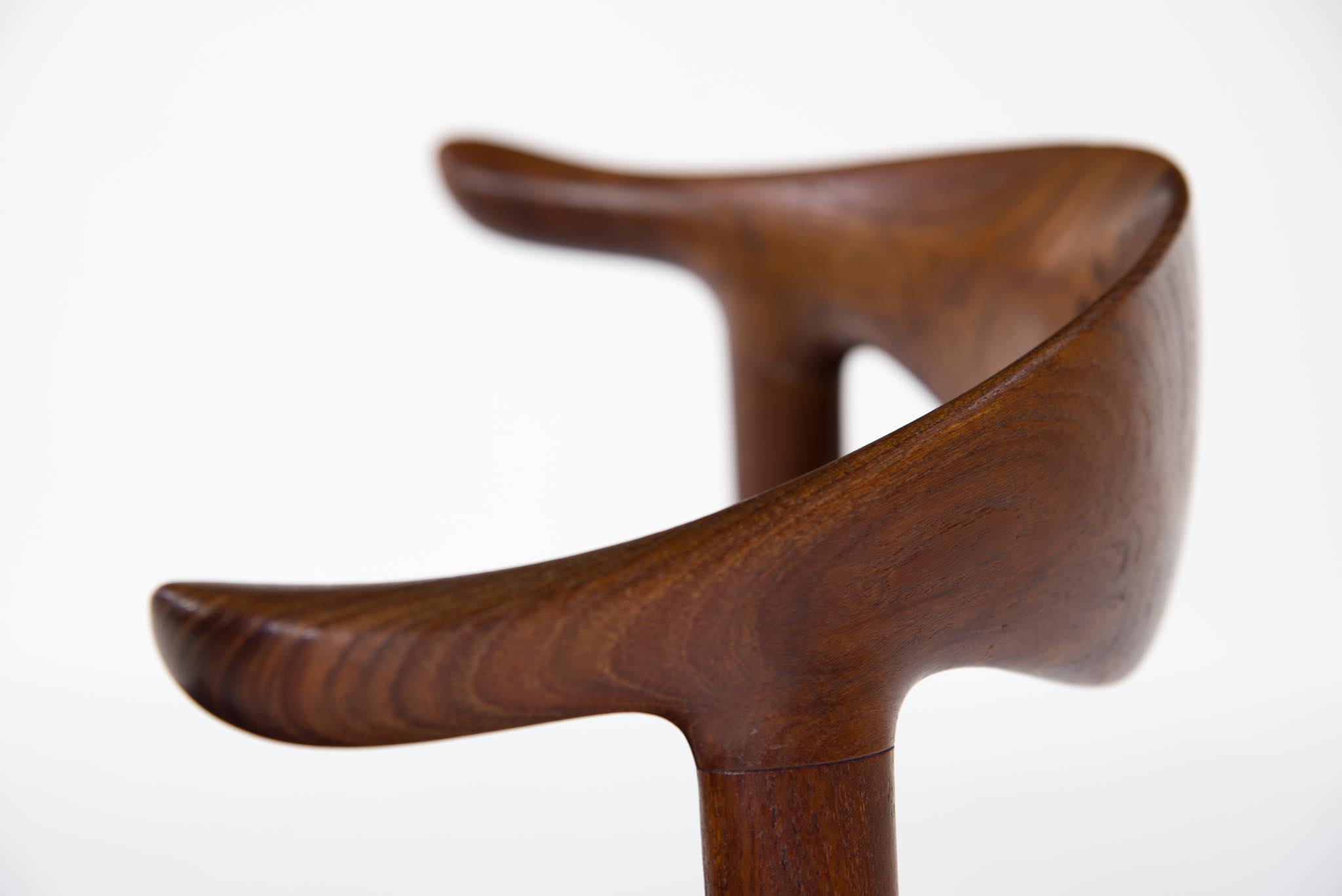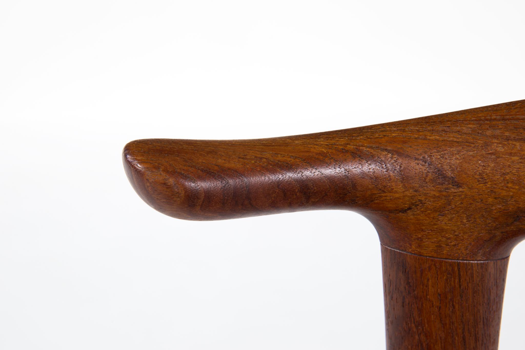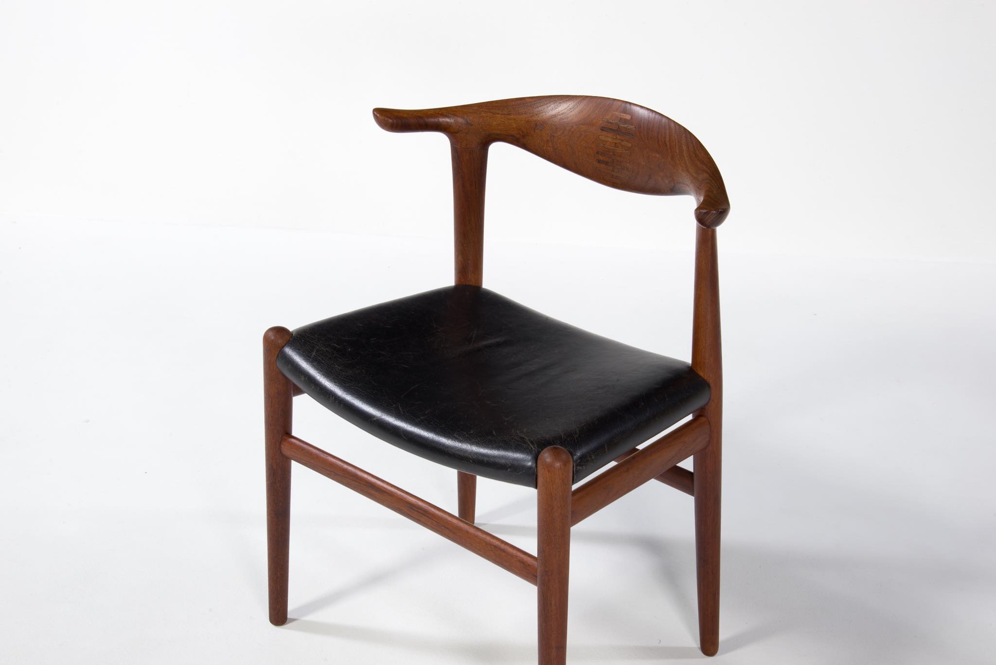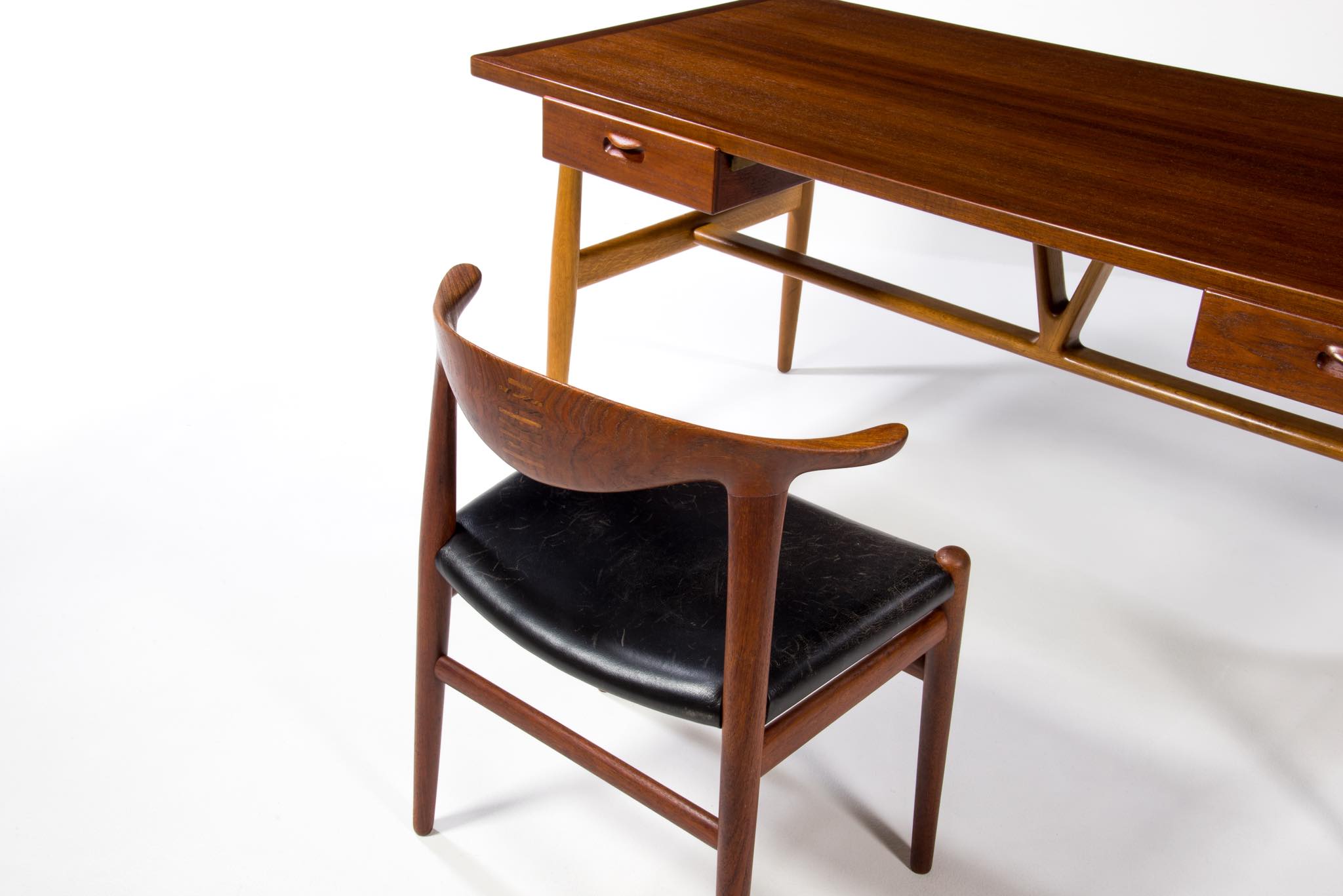 デンマークを代表する家具デザイナーのHans J. Wegner/ハンス・ウェグナーによる名作椅子”カウホーン”チェアです。 本体にはチーク材が用いられており、複雑に現れた木目が特徴的です。笠木にはローズウッドが象嵌されています。シートの黒色皮革はオリジナルのようですが、緩衝材のウレタンが劣化していたため交換を行い、もとの皮革を張り戻しました。コンディションは良好です。