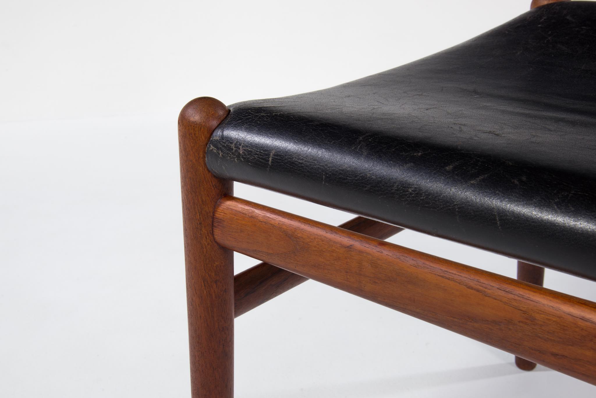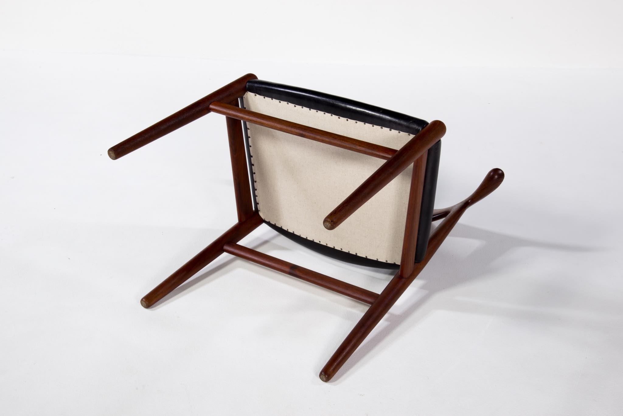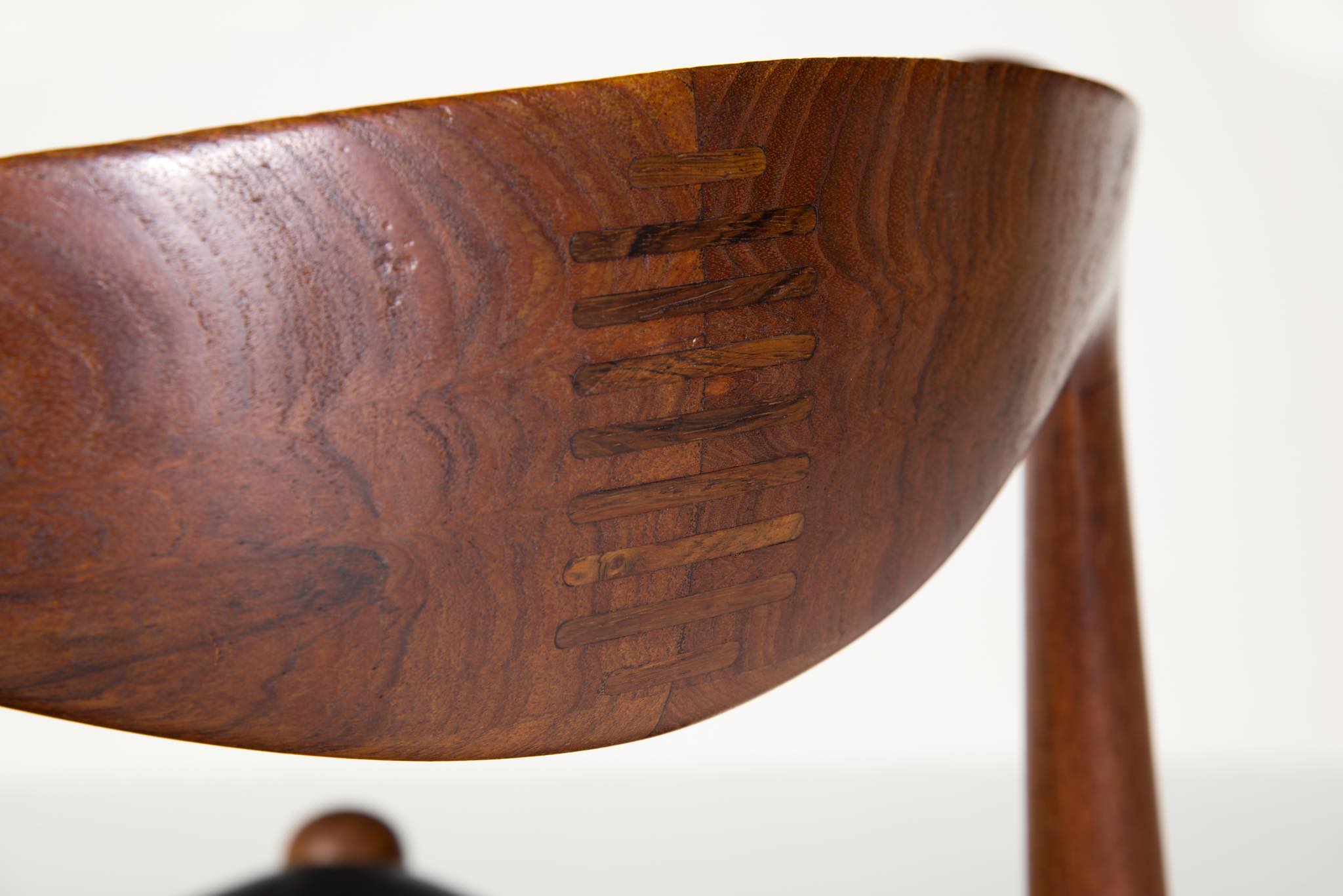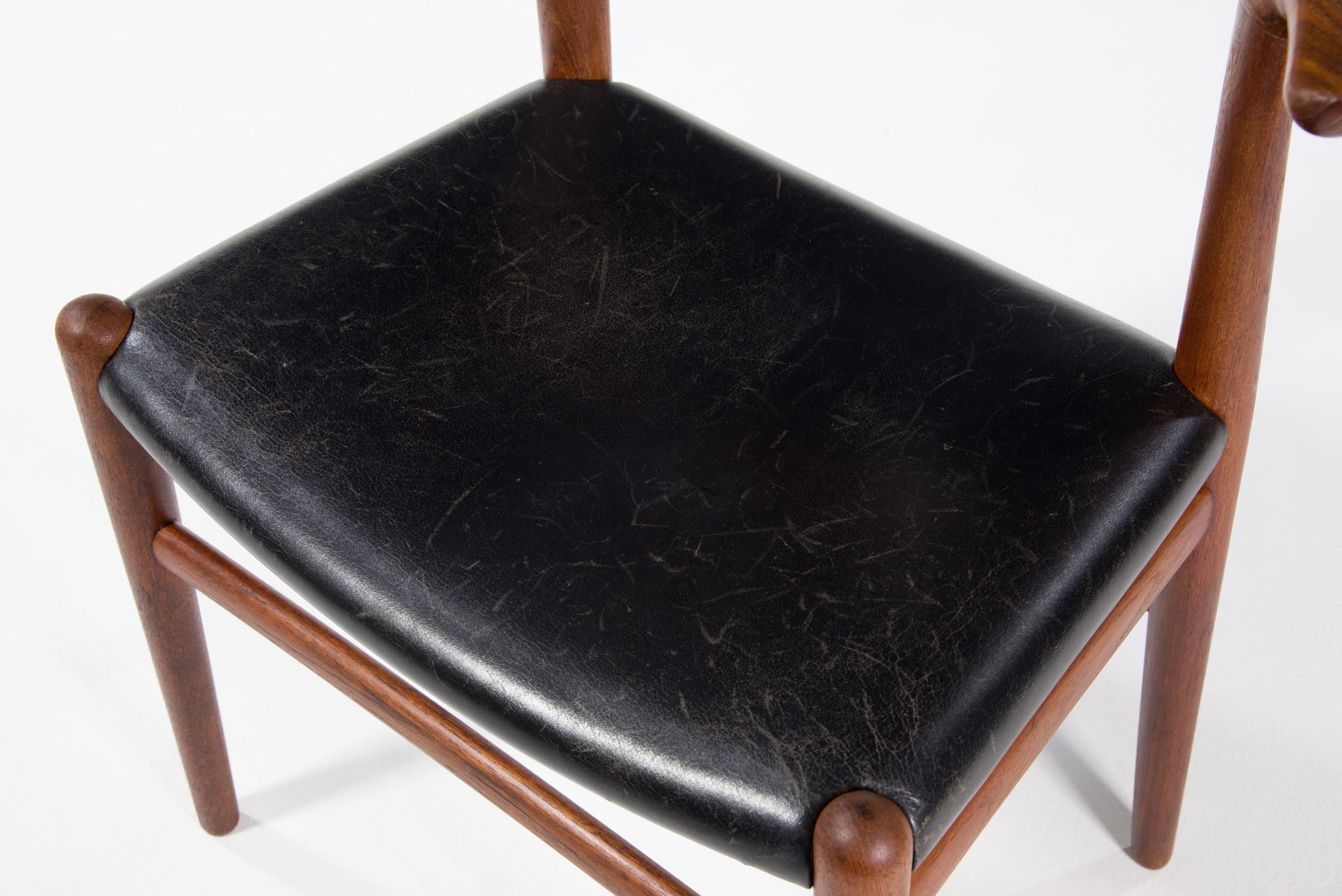 デンマークを代表する家具デザイナーのHans J. Wegner/ハンス・ウェグナーによる名作椅子”カウホーン”チェアです。 本体にはチーク材が用いられており、複雑に現れた木目が特徴的です。笠木にはローズウッドが象嵌されています。シートの黒色皮革はオリジナルのようですが、緩衝材のウレタンが劣化していたため交換を行い、もとの皮革を張り戻しました。コンディションは良好です。