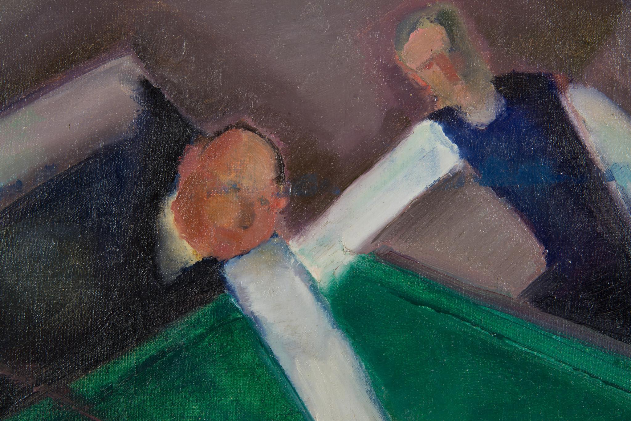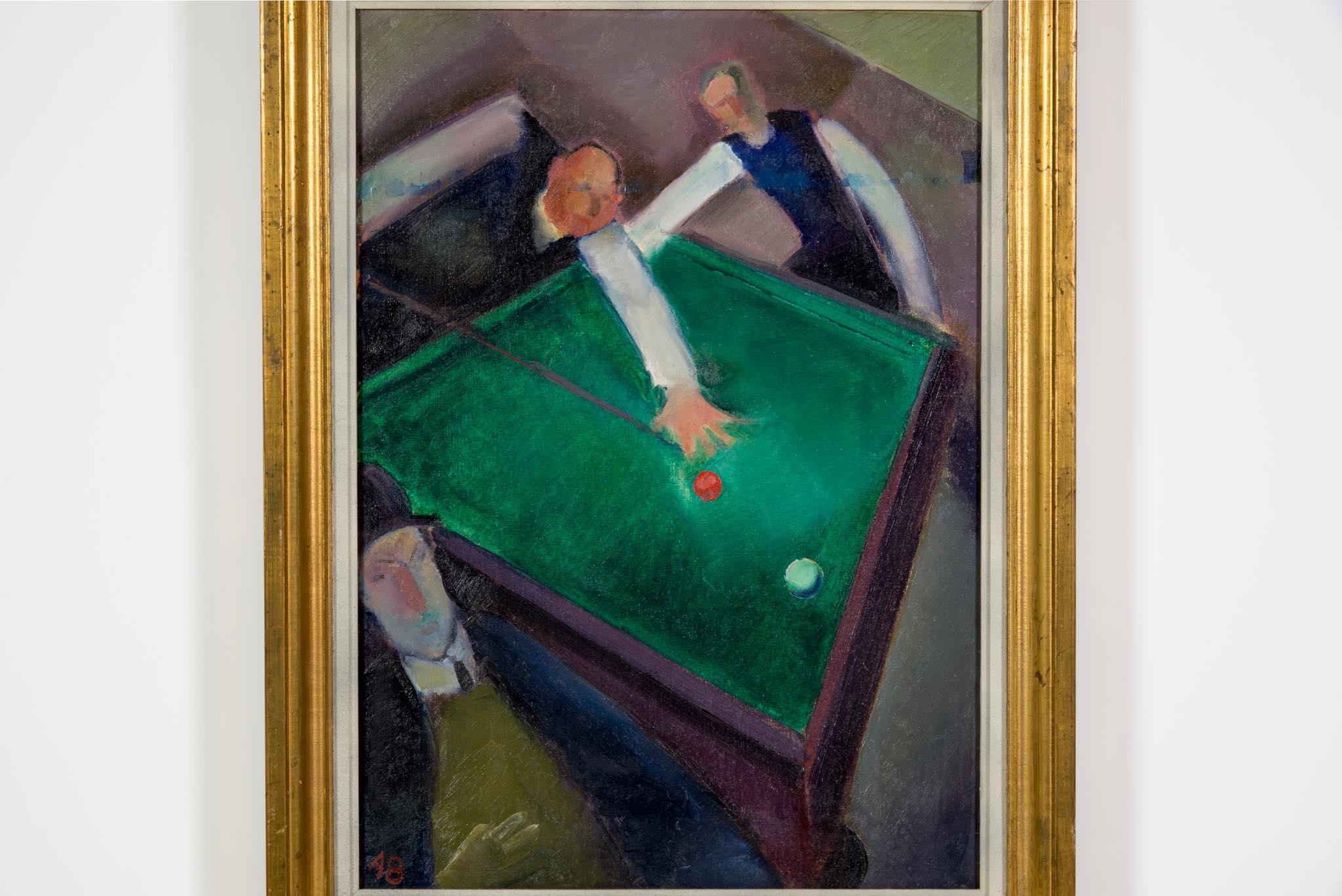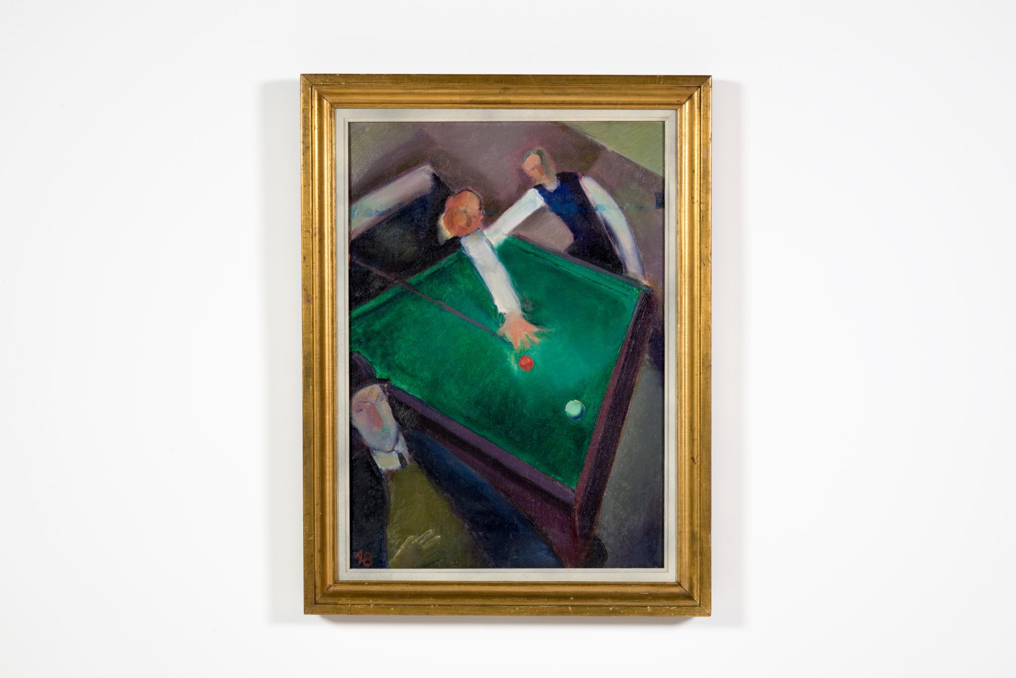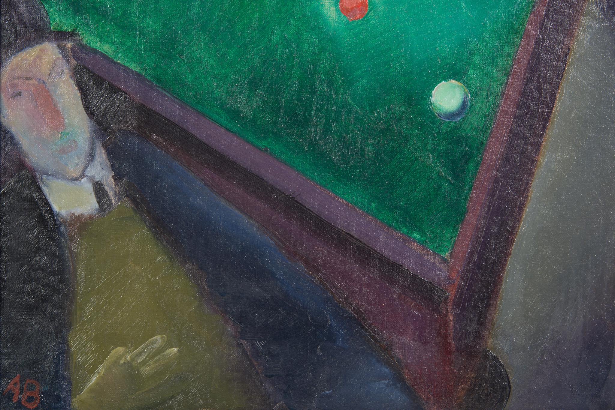 デンマークの画家、Axel Bentzen/アクセル・ベンツェンによる油彩作品で、1918年に描かれたものです。ビリヤードをプレイする人々とその空間がキュビズムの表現で描かれており、小振りな作品ですが、奥行感や距離感を度外視した独特の表現には見応えがあります。画面上部、横に走る青い絵の具のエラーは本人によるものではないかと思われます。オリジナルのフレームはそのままに、キャンバスの張りや装着用の金具などを整えました。コンディションは良好です。