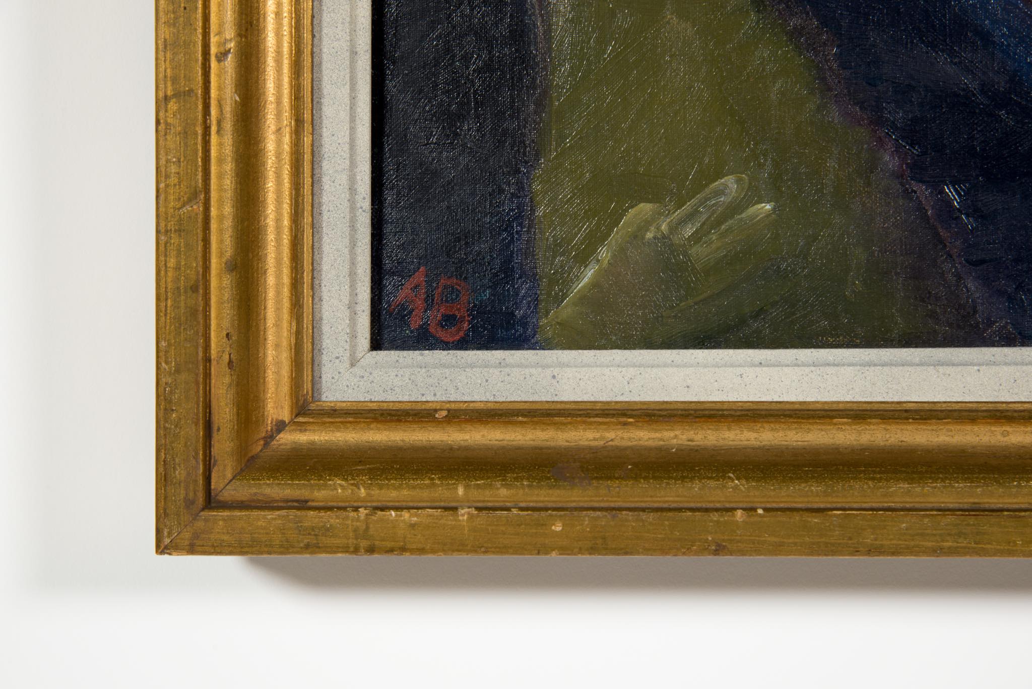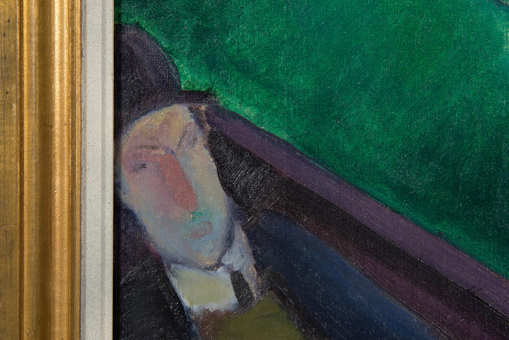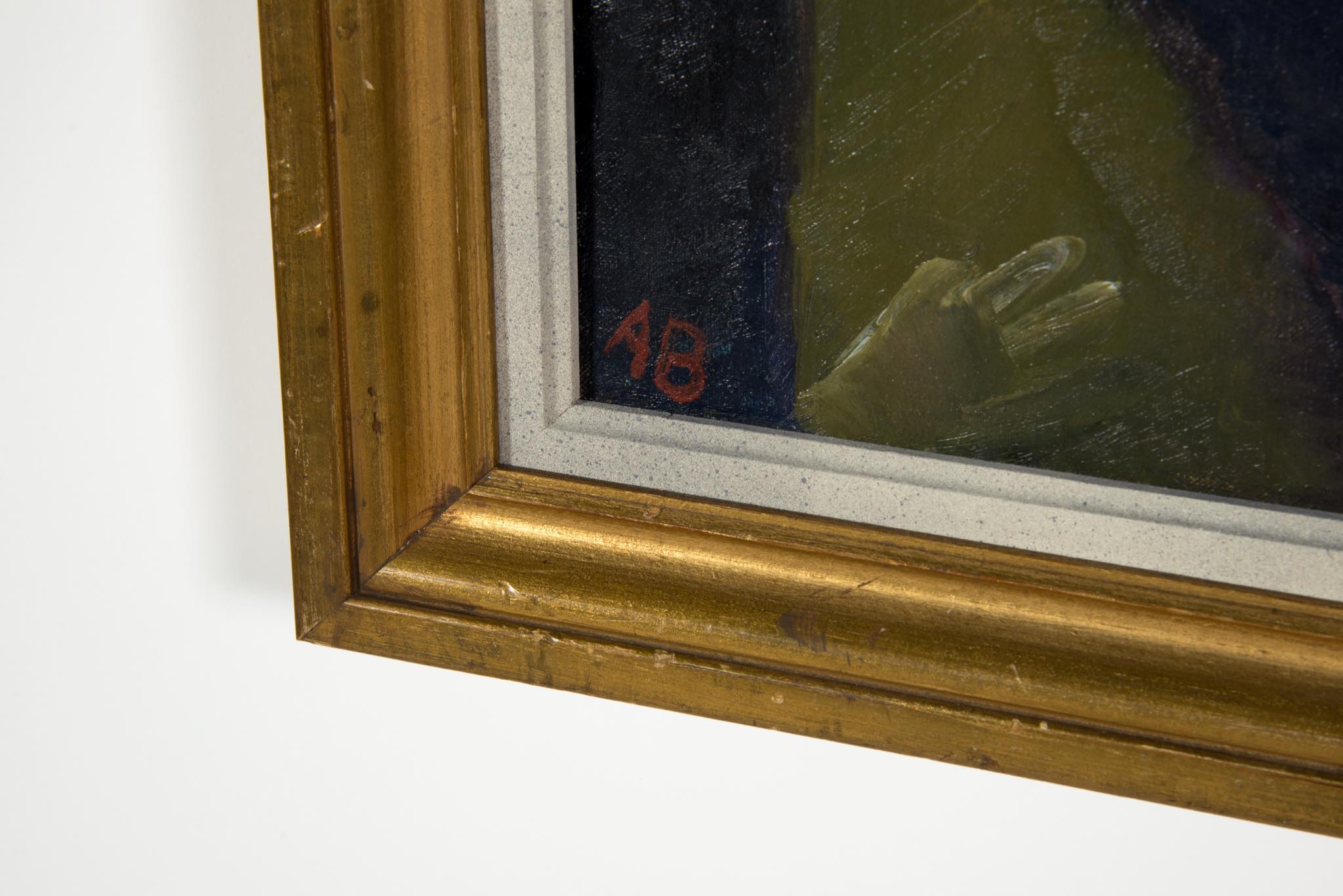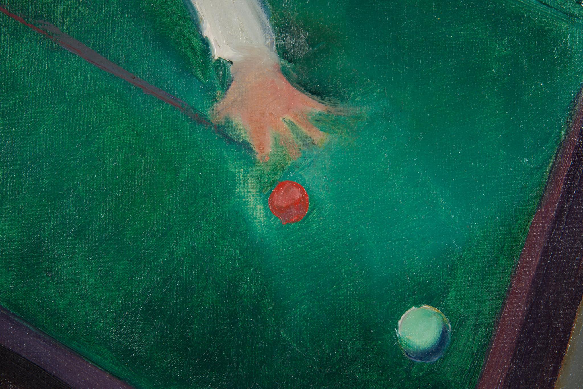 デンマークの画家、Axel Bentzen/アクセル・ベンツェンによる油彩作品で、1918年に描かれたものです。ビリヤードをプレイする人々とその空間がキュビズムの表現で描かれており、小振りな作品ですが、奥行感や距離感を度外視した独特の表現には見応えがあります。画面上部、横に走る青い絵の具のエラーは本人によるものではないかと思われます。オリジナルのフレームはそのままに、キャンバスの張りや装着用の金具などを整えました。コンディションは良好です。