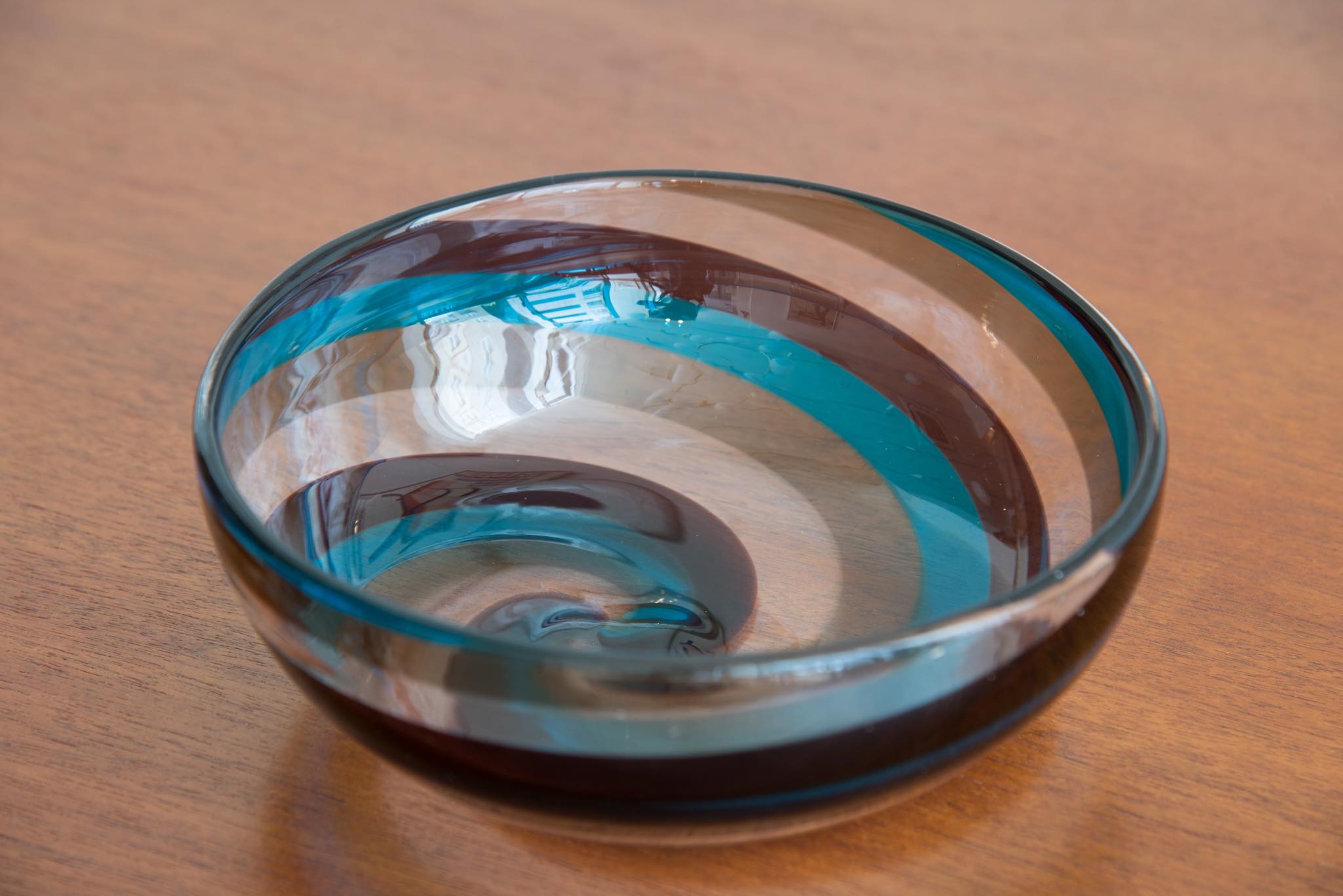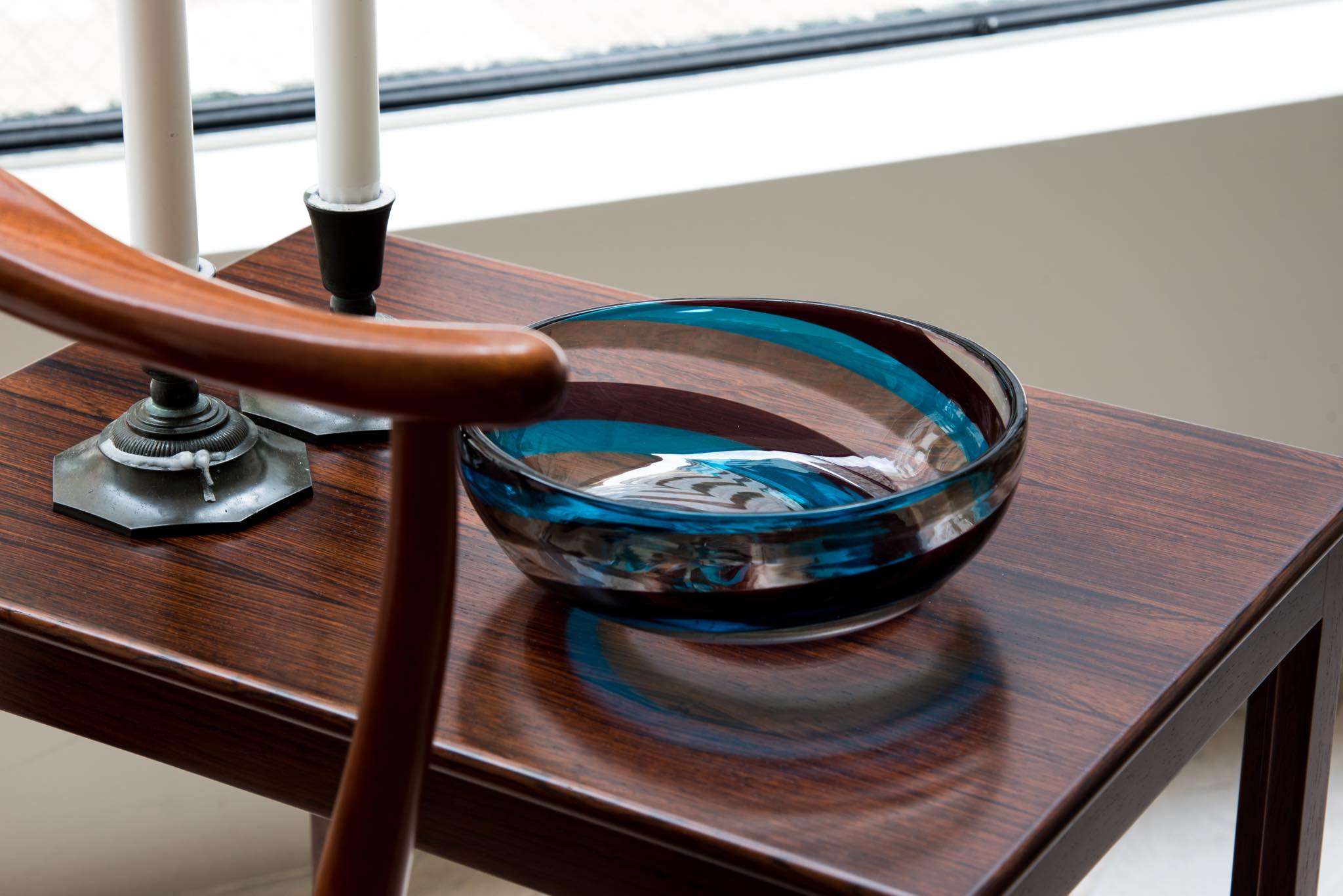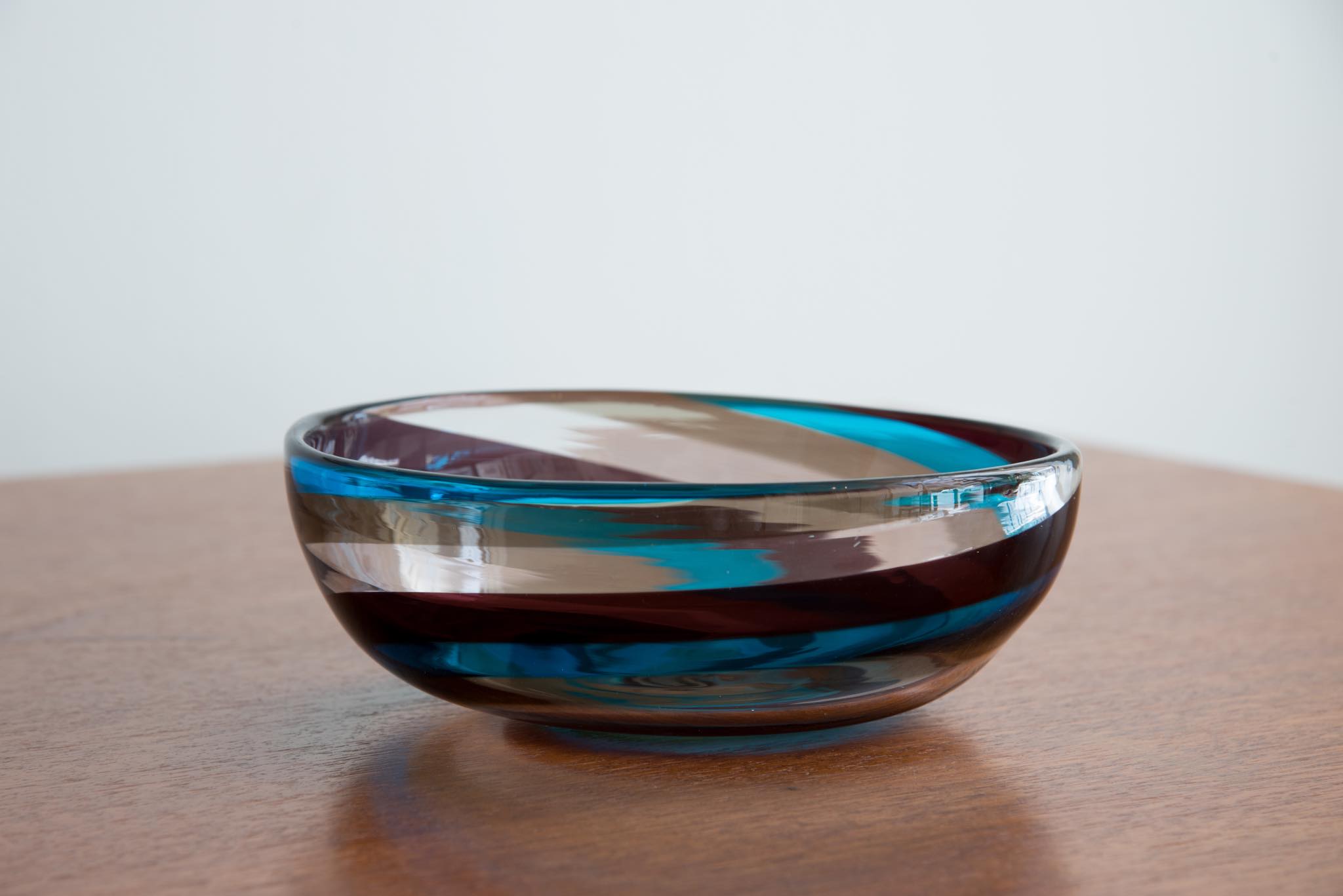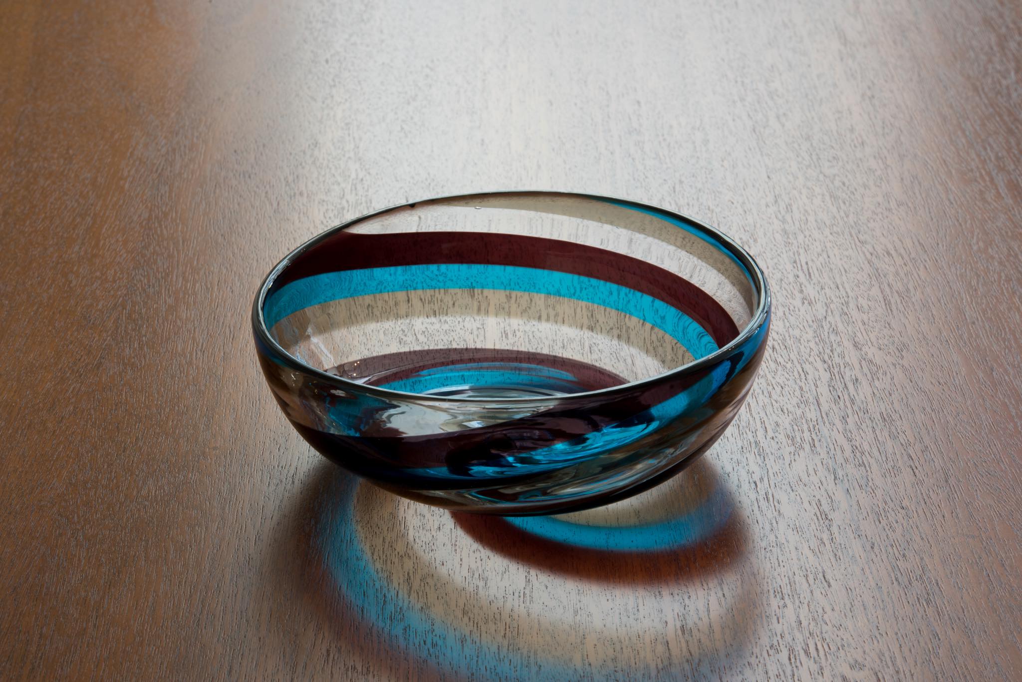 イタリアのガラスアーティスト、Fulvio Bianconi/フルヴィオ・ビアンコーニによるボウル(Large)です。1951年に発表された、"Fasce Ritorte/(紋章に用いる)ツイスト状のリボン" のタイトルを持つ作品シリーズで、こちらの作品もその当時に作られたものでしょう。ボウルの他、デキャンタやベースなども手がけられていました。こちらのボウルは、紫、青、灰の三色のリボンで構成されており、厚めに成形された器には手吹きによる段紋が現れ、見応えがあります。コンディションは良好です。デンマークではビアンコー二などベニーニのガラス作品が好まれており、デンマーク家具やお部屋との相性が良いようです。