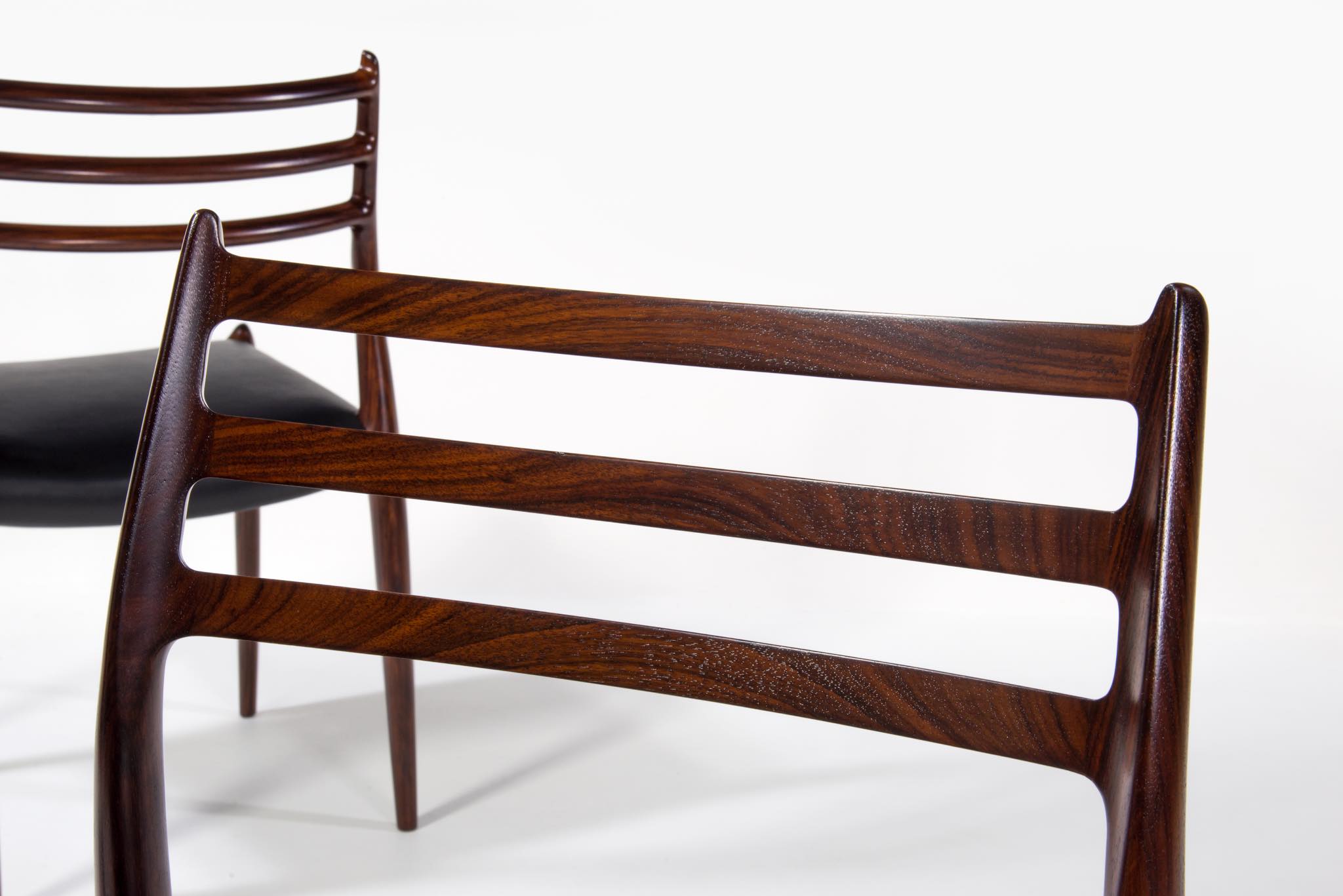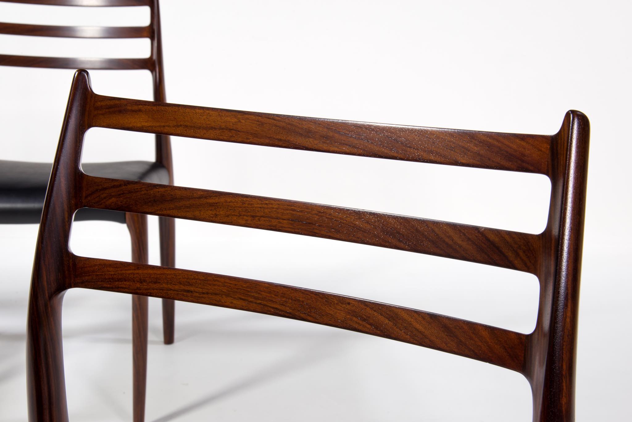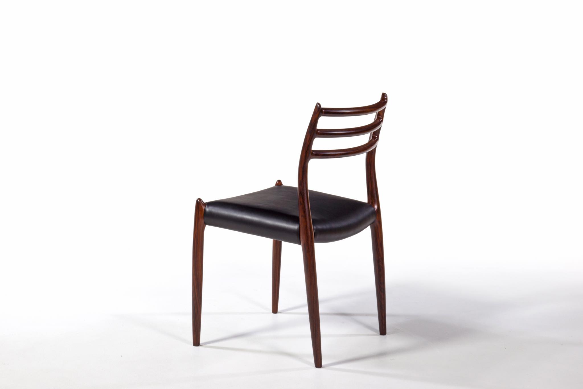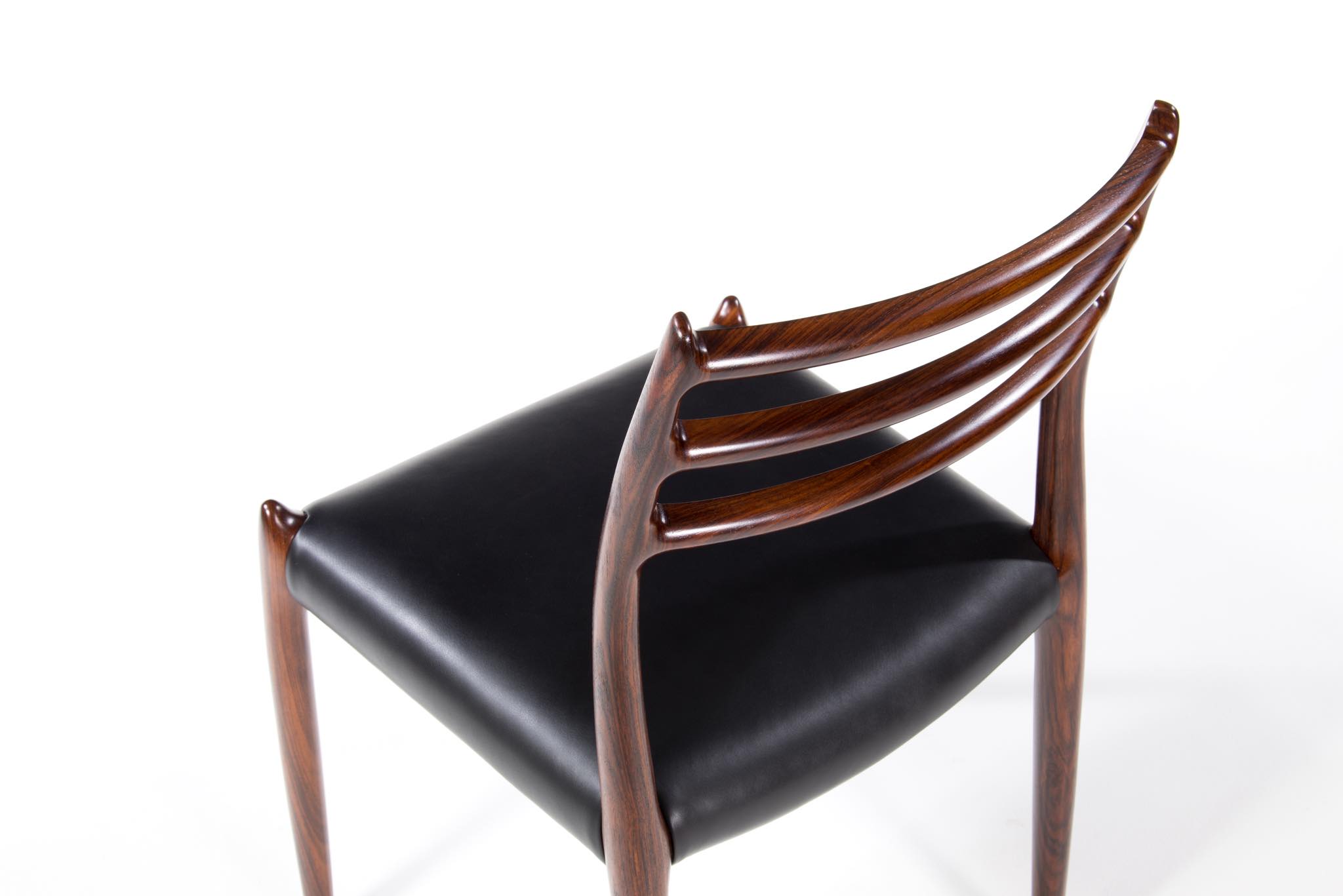 デンマークの家具工房、J.L. Møller/J.L.モラーによるダイニングチェア “Model 78” 4脚セットです。デザインは J.L. Møller社の創業者、N.O. Møller/ニルス・オット・モラーによるもので、1962年に発表されたモデルです。笠木にはローズウッドの柾目が綺麗に表れています。シートは黒色皮革にて張り替えており綺麗な状態です。こちらは4脚セットでの販売となります。