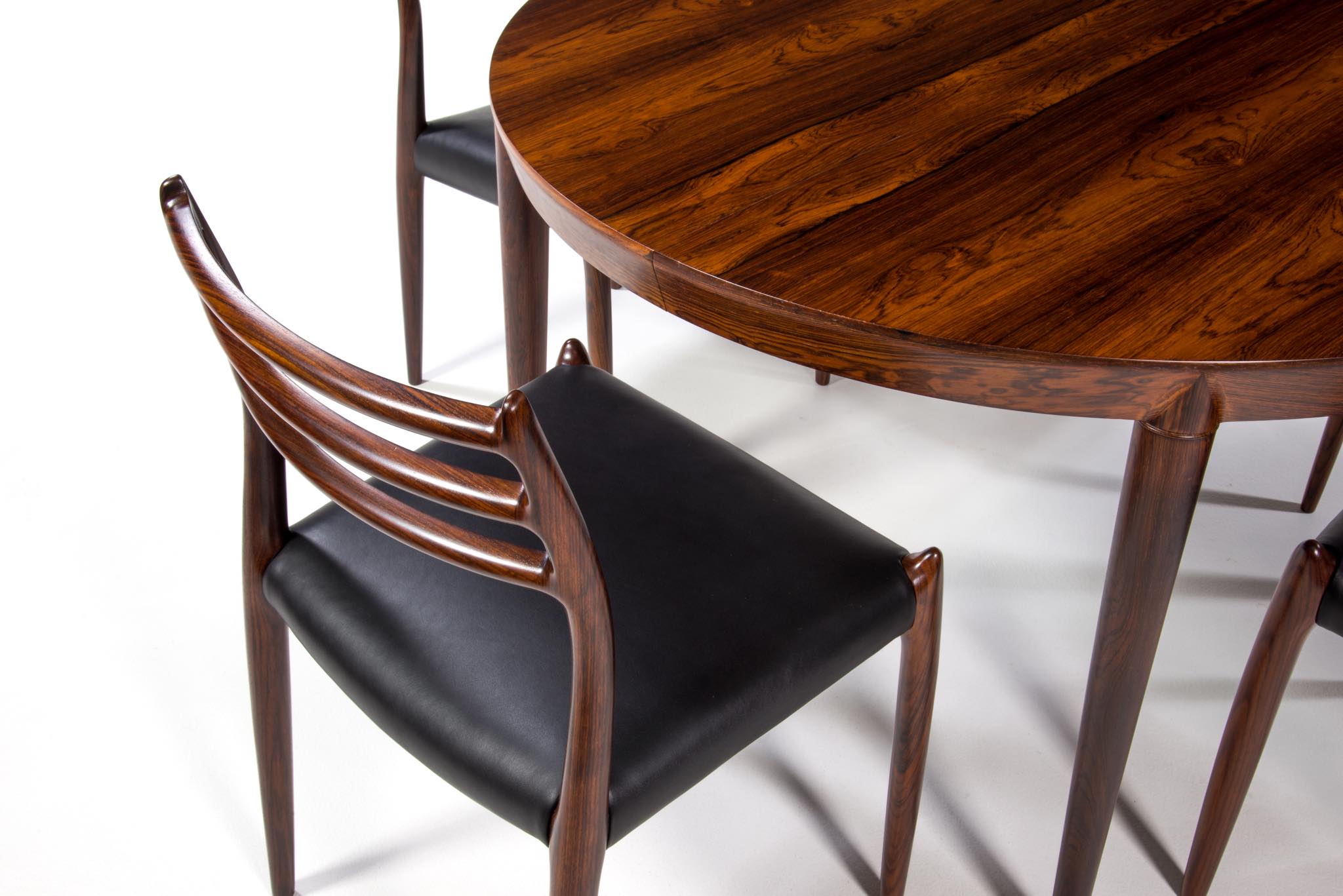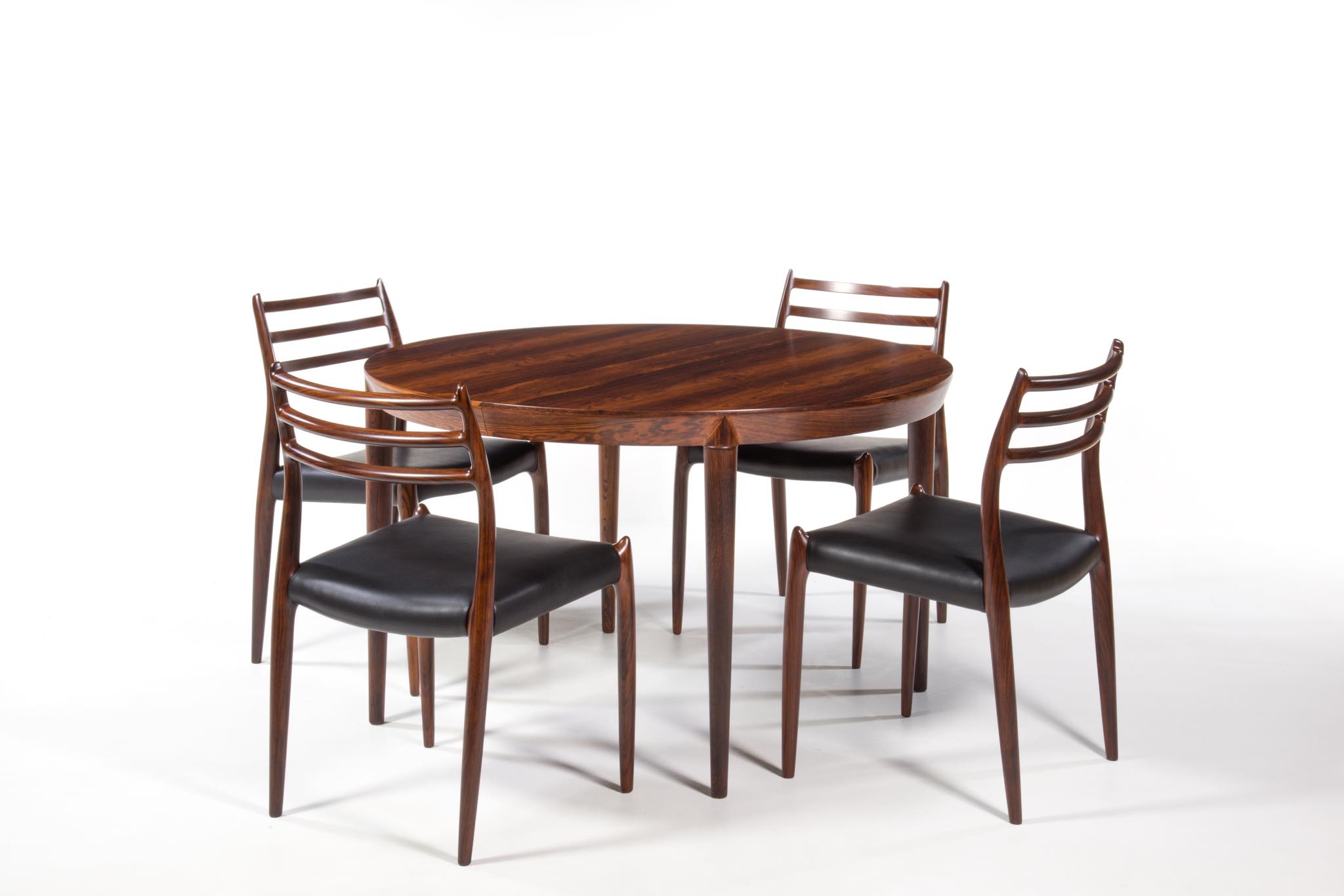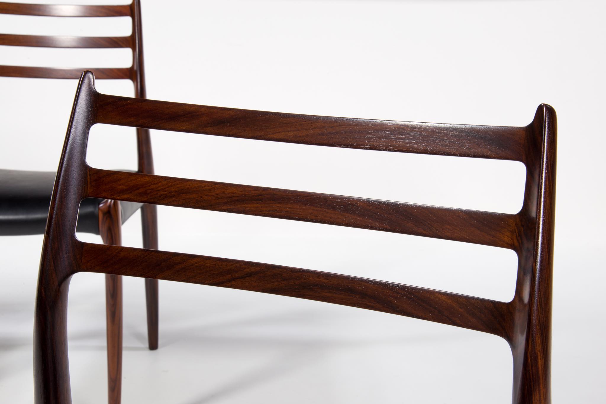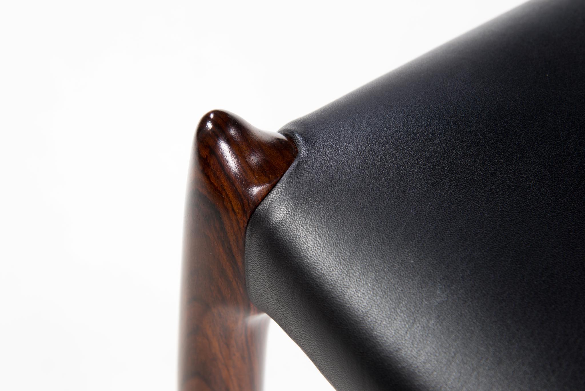 デンマークの家具工房、J.L. Møller/J.L.モラーによるダイニングチェア “Model 78” 4脚セットです。デザインは J.L. Møller社の創業者、N.O. Møller/ニルス・オット・モラーによるもので、1962年に発表されたモデルです。笠木にはローズウッドの柾目が綺麗に表れています。シートは黒色皮革にて張り替えており綺麗な状態です。こちらは4脚セットでの販売となります。