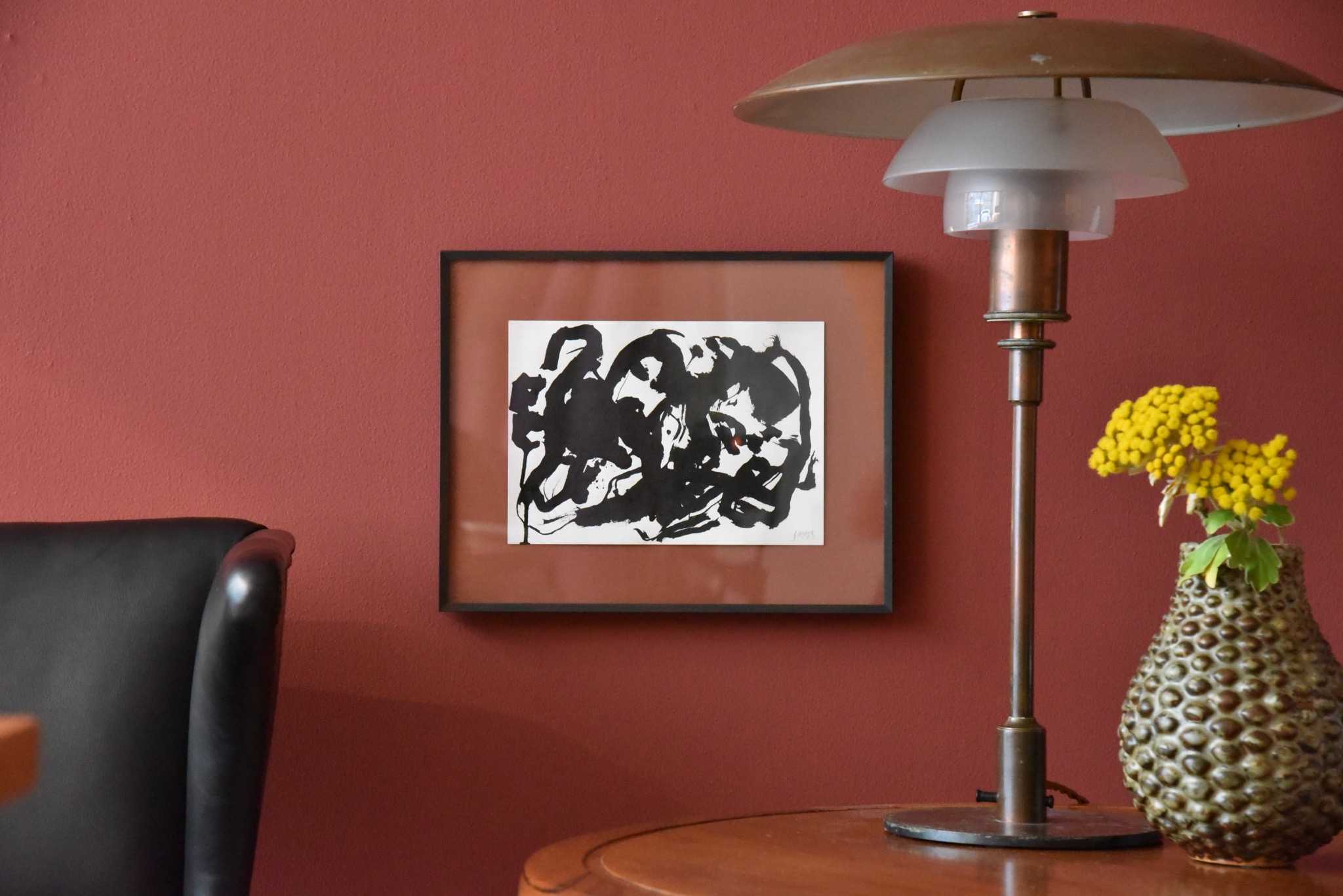 デンマークのアーティスト、Mogens Andersen/モーエンス・アナセンによる肉筆作品です。絵の具はおそらくガッシュと思われ、力強い描写で描かれています。鋼鉄に錆びを施したフレームと布被せマットを新たに整えました。