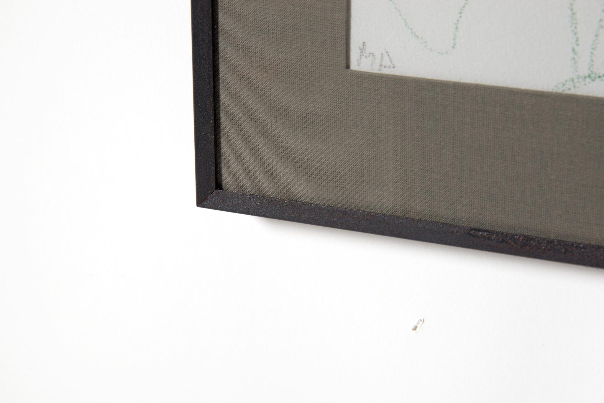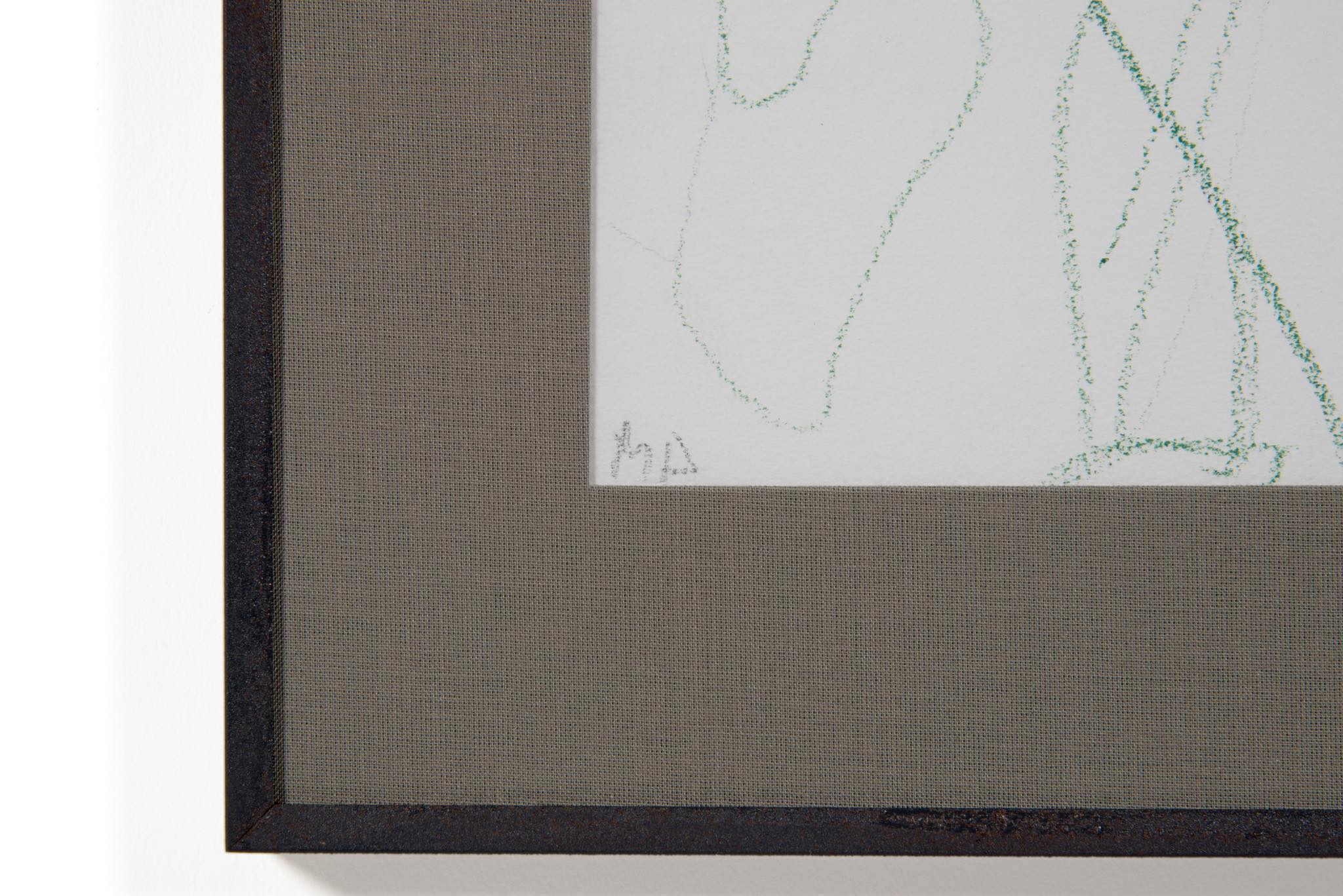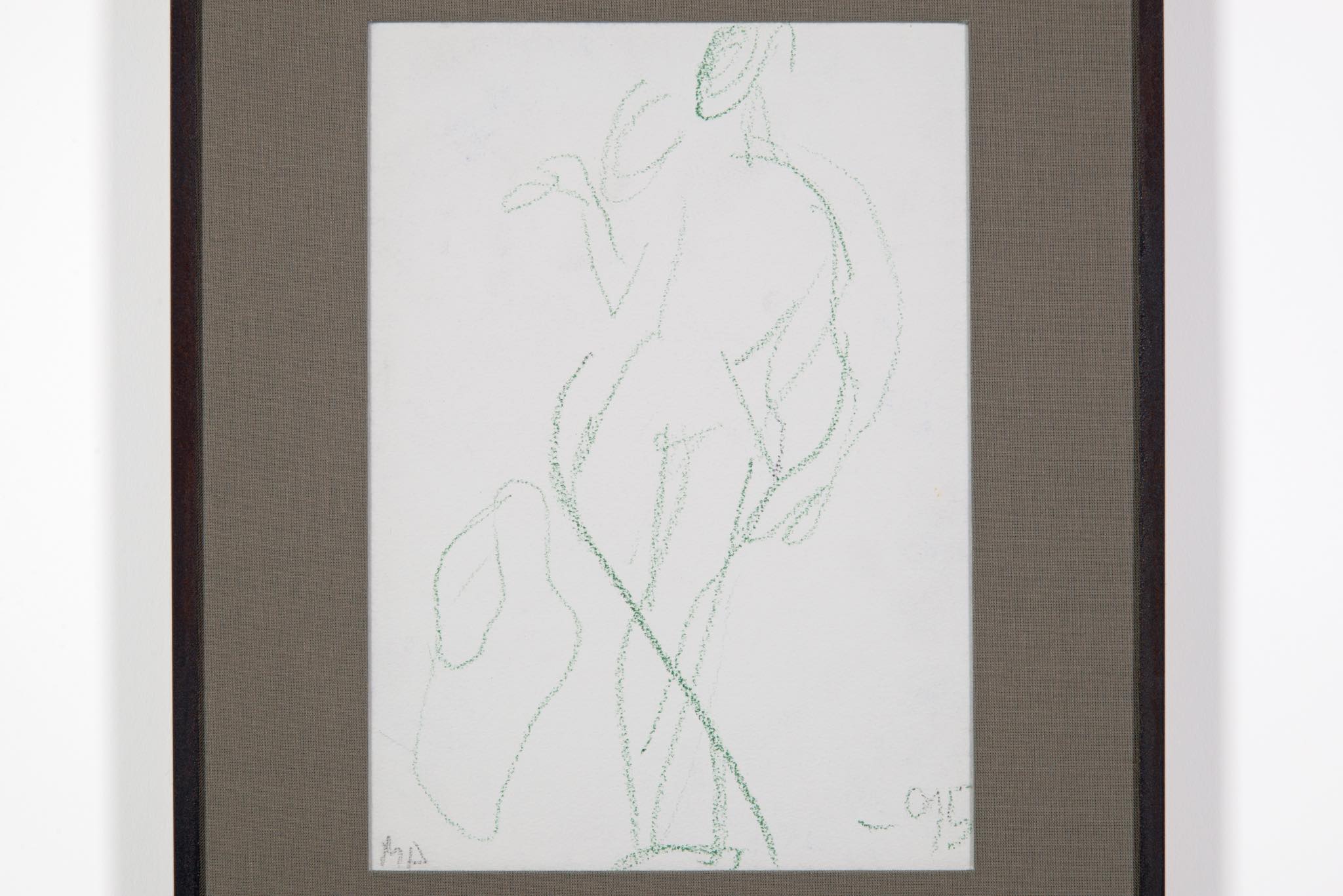 デンマークのアーティスト、Mogens Andersen/モーエンス・アナセンによる素描作品です。モチーフは珍しく人物と思われ、紙に鮮やかな緑色のパステルで描かれています。鋼鉄に錆びを施したフレームと布被せマットを新たに整えました。