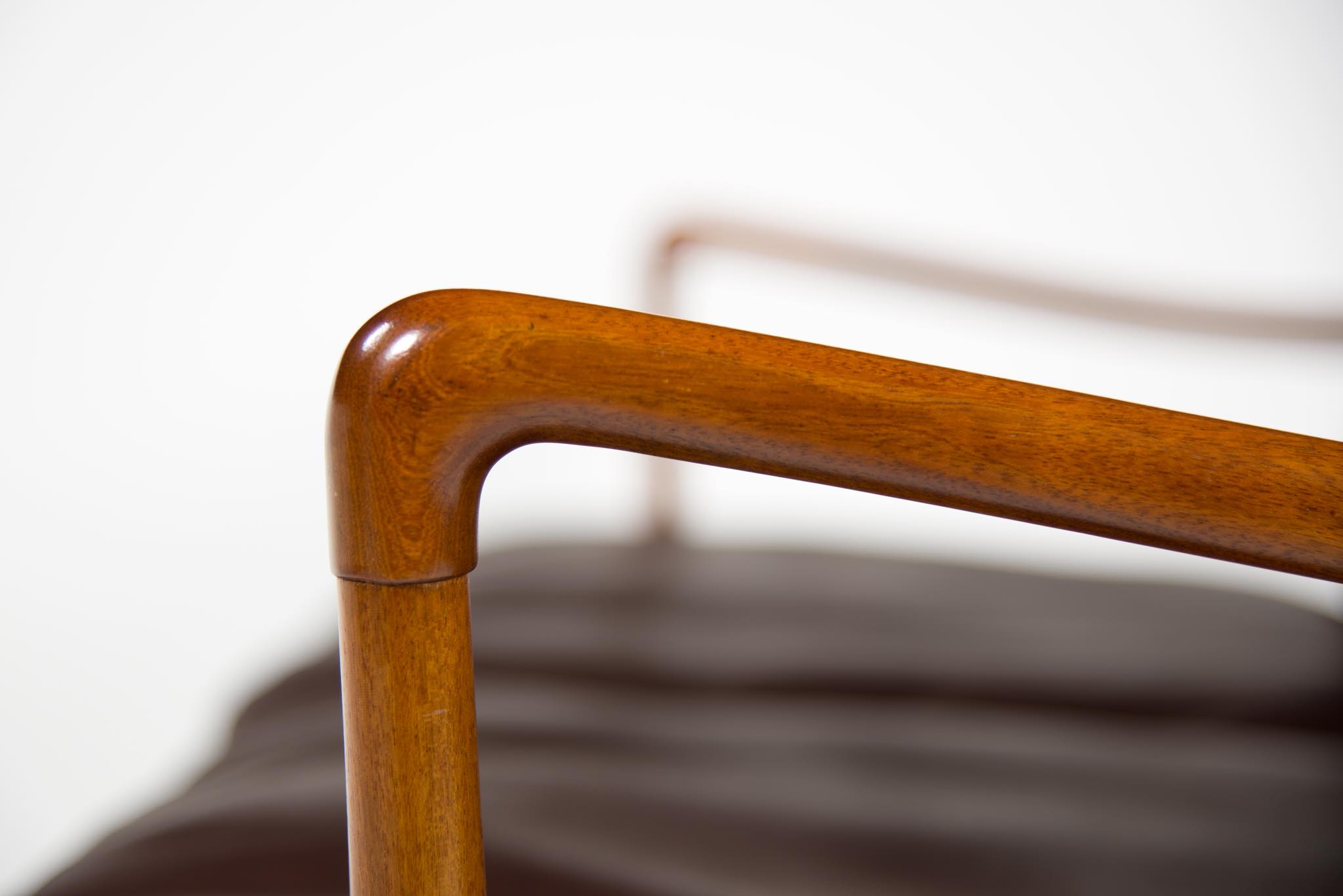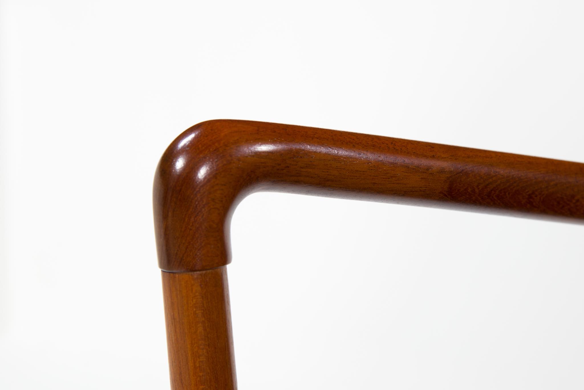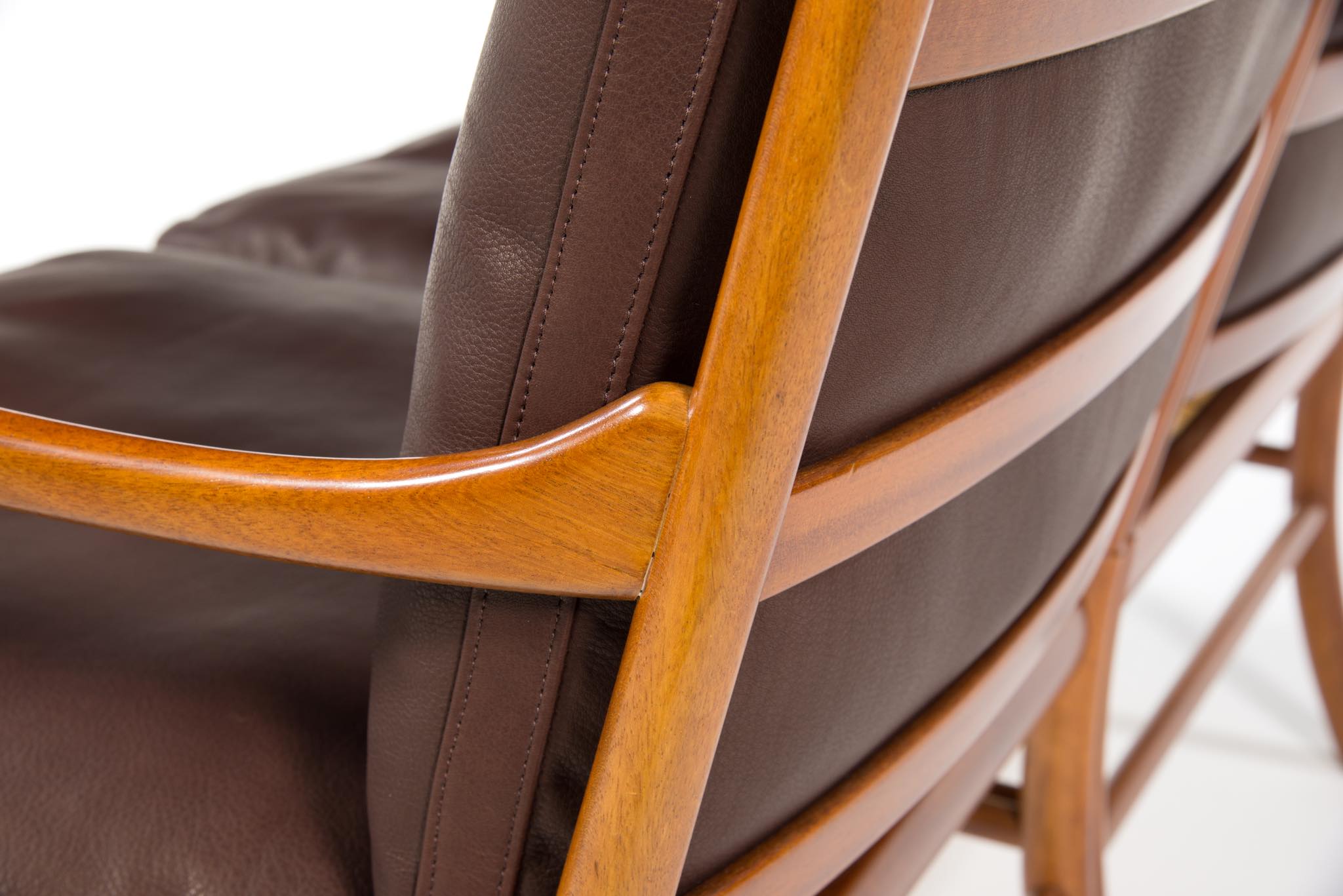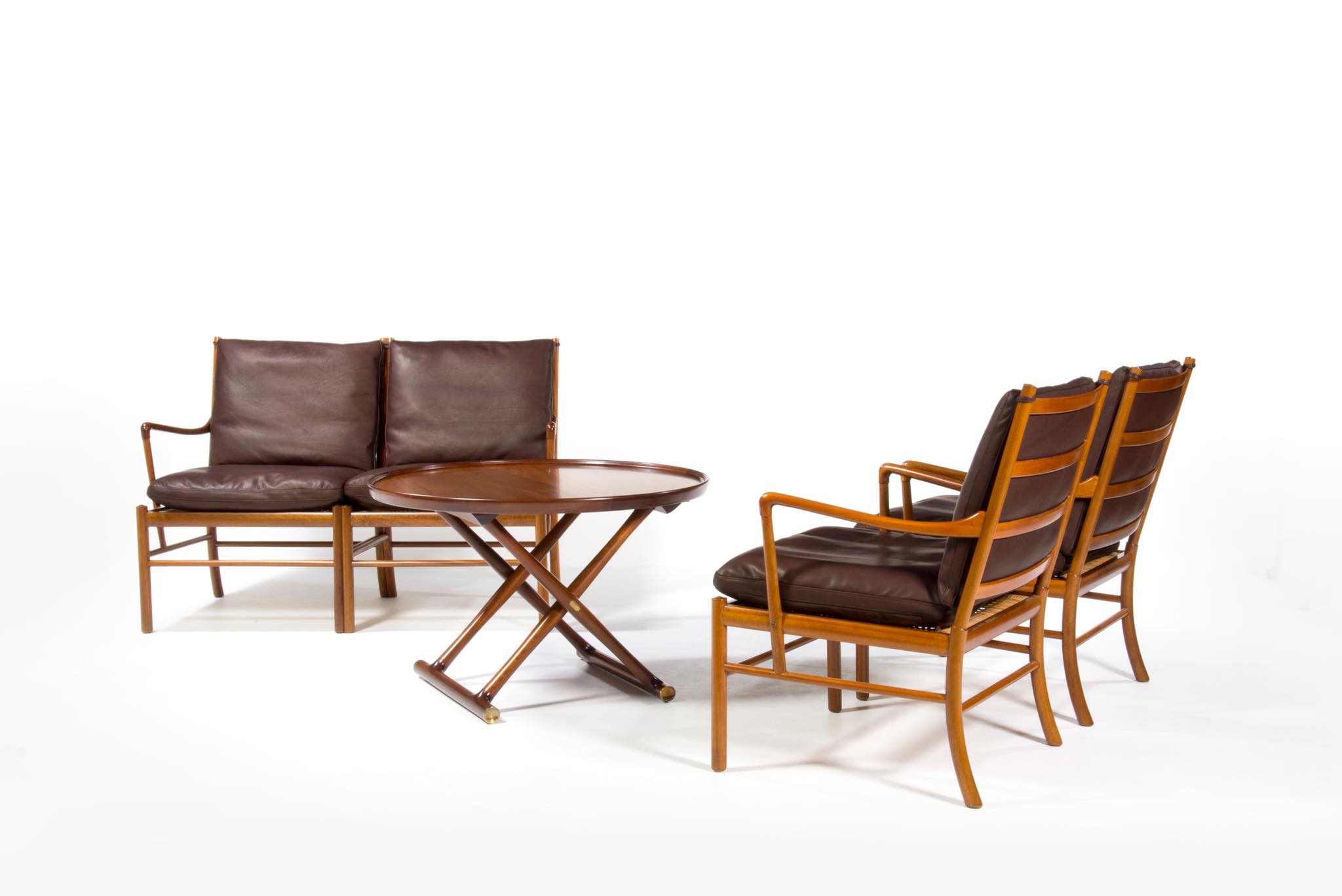 20世紀のデンマークを代表する家具デザイナーで、王立アカデミー家具科の主任教授も務めた、Ole Wanscher/オーレ・ヴァンシャーによる名作椅子、コロニアルチェア、セッティです。明るいマホガニー材を用いたタイプで、経年により木部はさらに明るくなっているようです。表面の塗膜には劣化が見られたため、着色せずに再加工を施しています。シートは濃茶色の皮革にて張り替えました。内部のフェザークッション(緩衝材)はオリジナルを再利用しています。シート下の籐張りの状態は良好ですが、一部切れてしまった箇所は部分的に張り替え修復しています。コンディションは良好です。