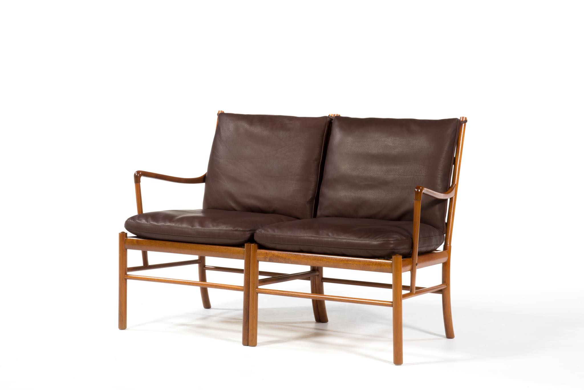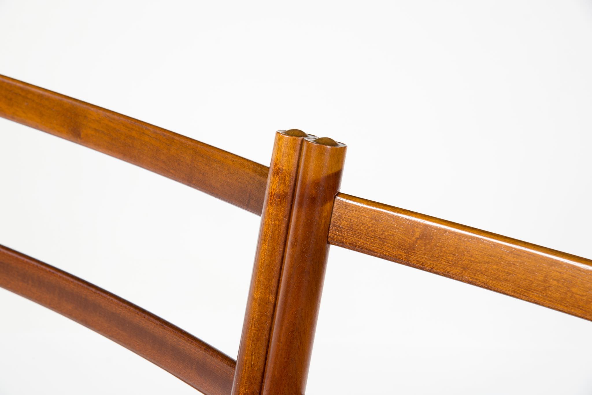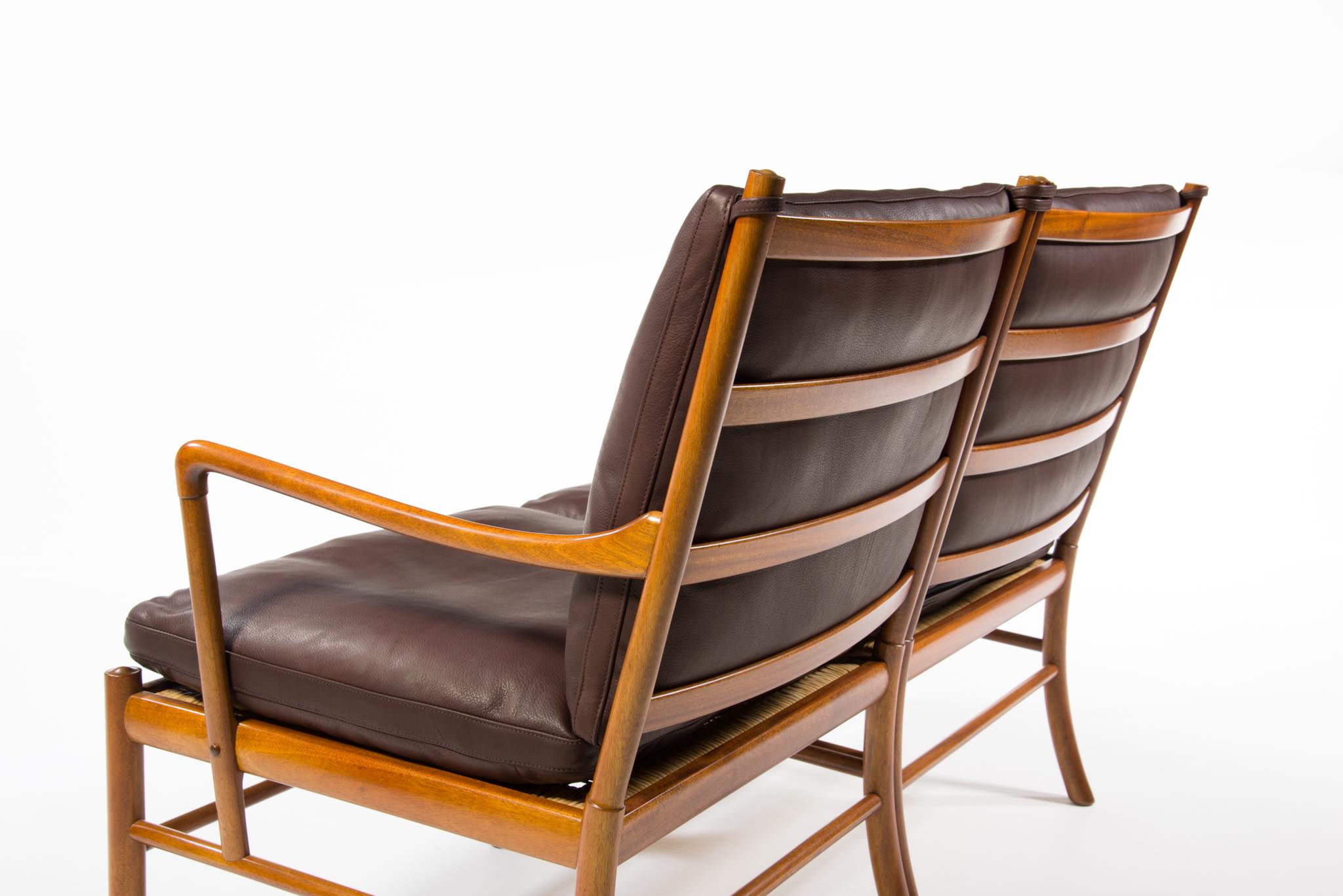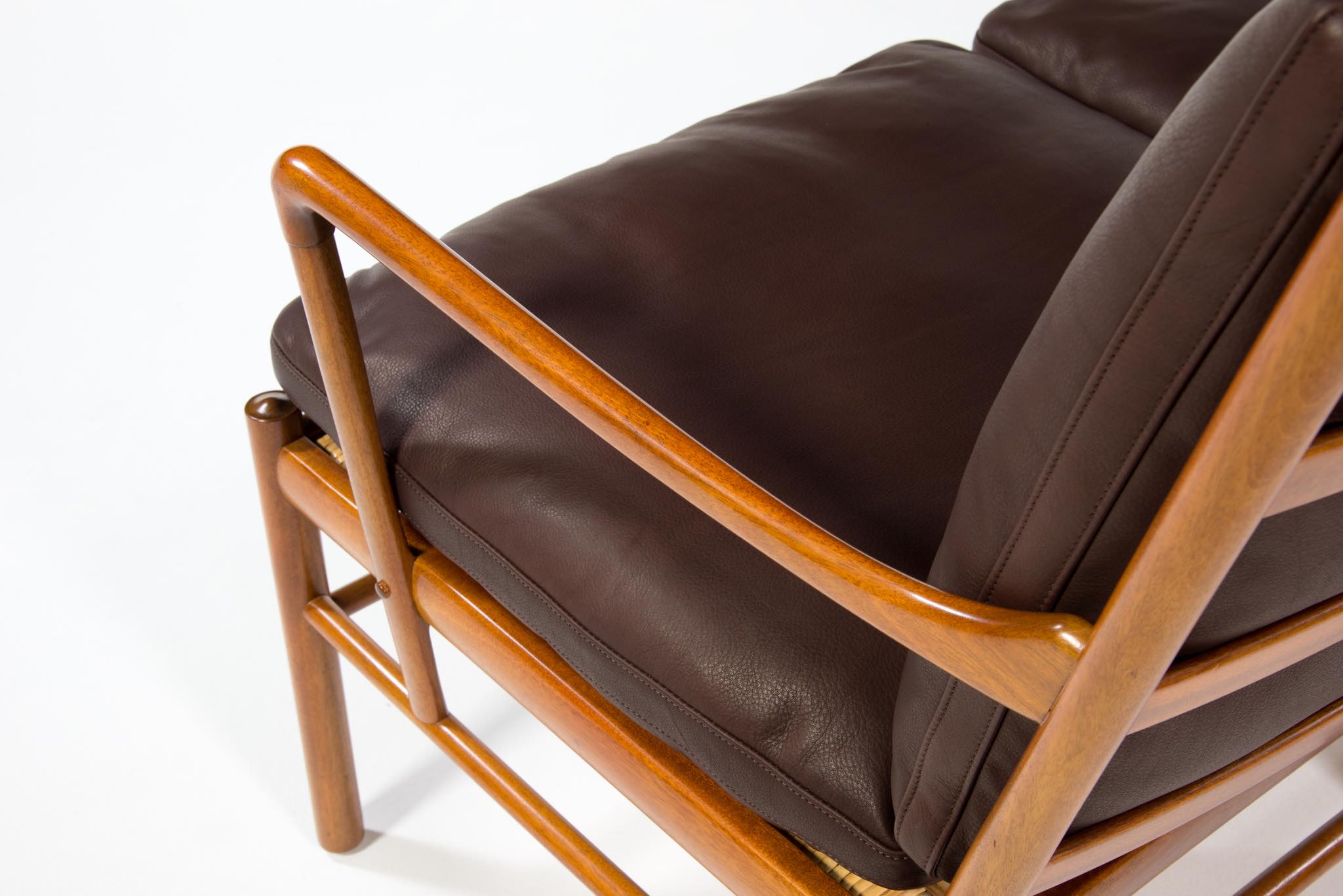 20世紀のデンマークを代表する家具デザイナーで、王立アカデミー家具科の主任教授も務めた、Ole Wanscher/オーレ・ヴァンシャーによる名作椅子、コロニアルチェア、セッティです。明るいマホガニー材を用いたタイプで、経年により木部はさらに明るくなっているようです。表面の塗膜には劣化が見られたため、着色せずに再加工を施しています。シートは濃茶色の皮革にて張り替えました。内部のフェザークッション(緩衝材)はオリジナルを再利用しています。シート下の籐張りの状態は良好ですが、一部切れてしまった箇所は部分的に張り替え修復しています。コンディションは良好です。
