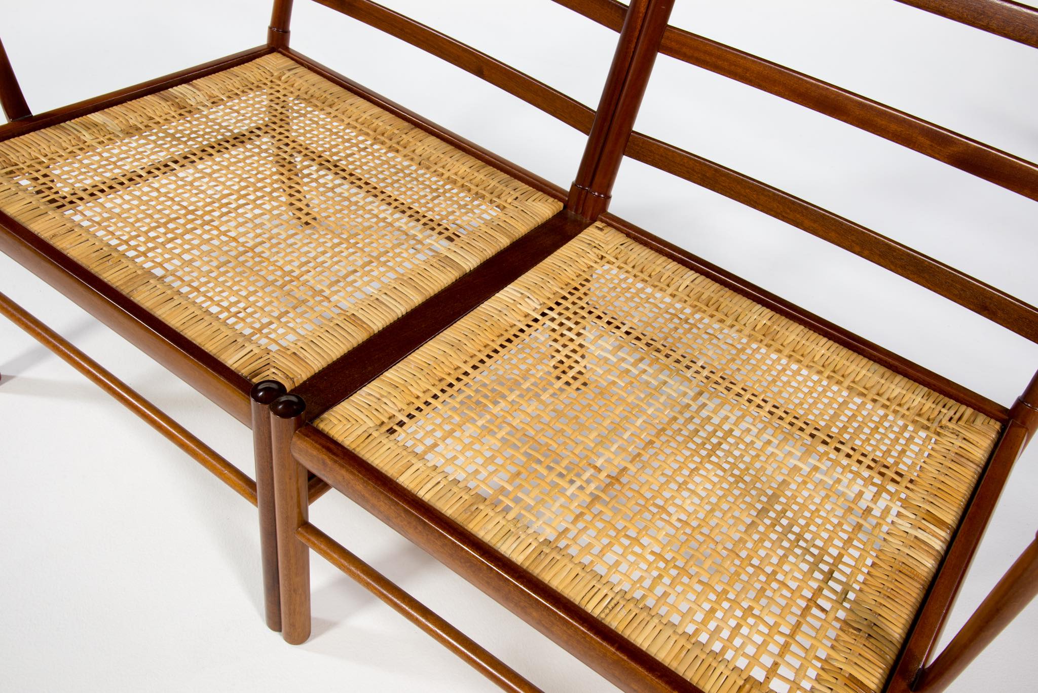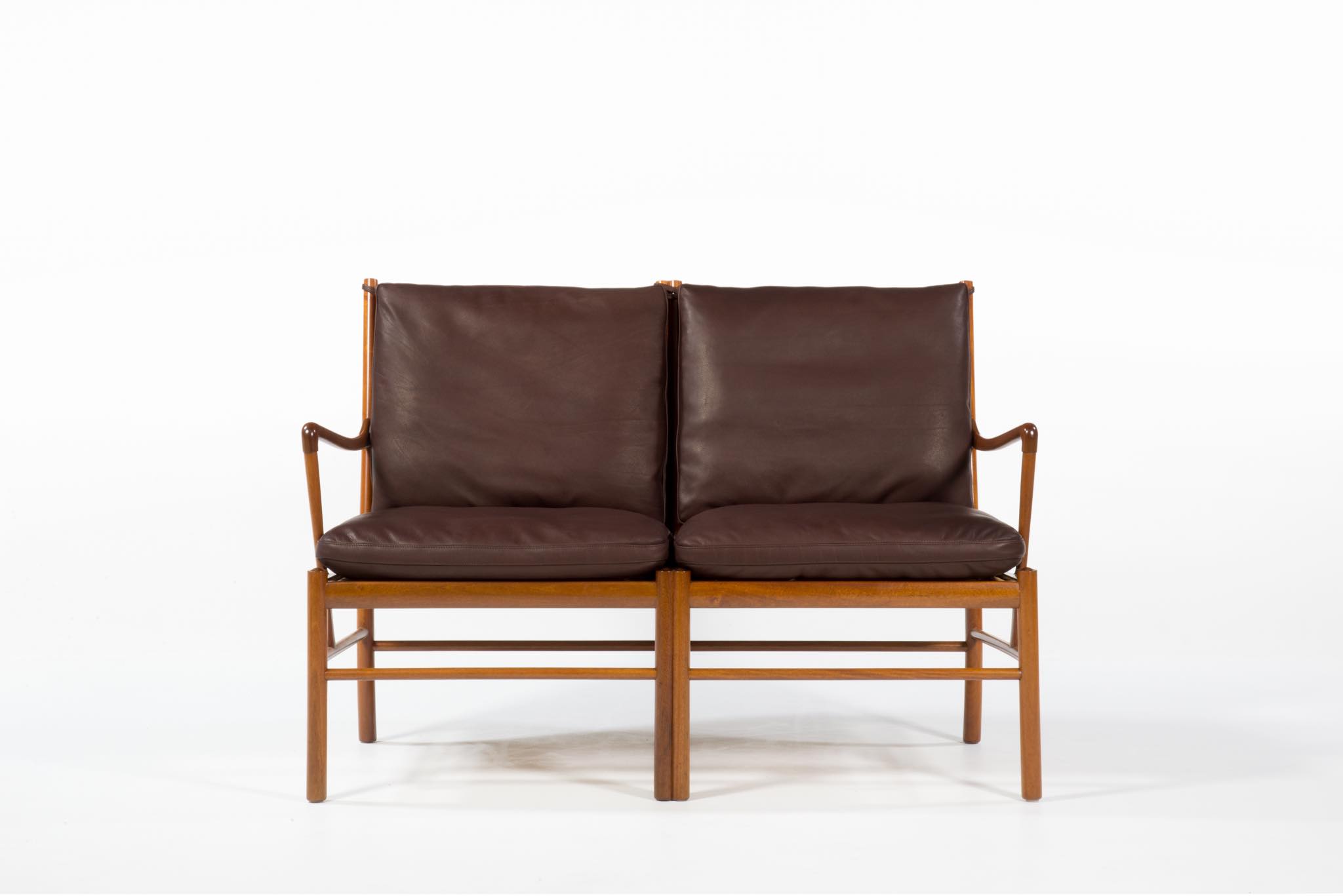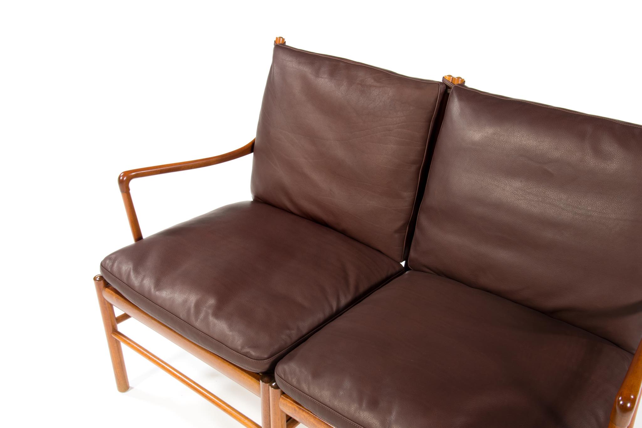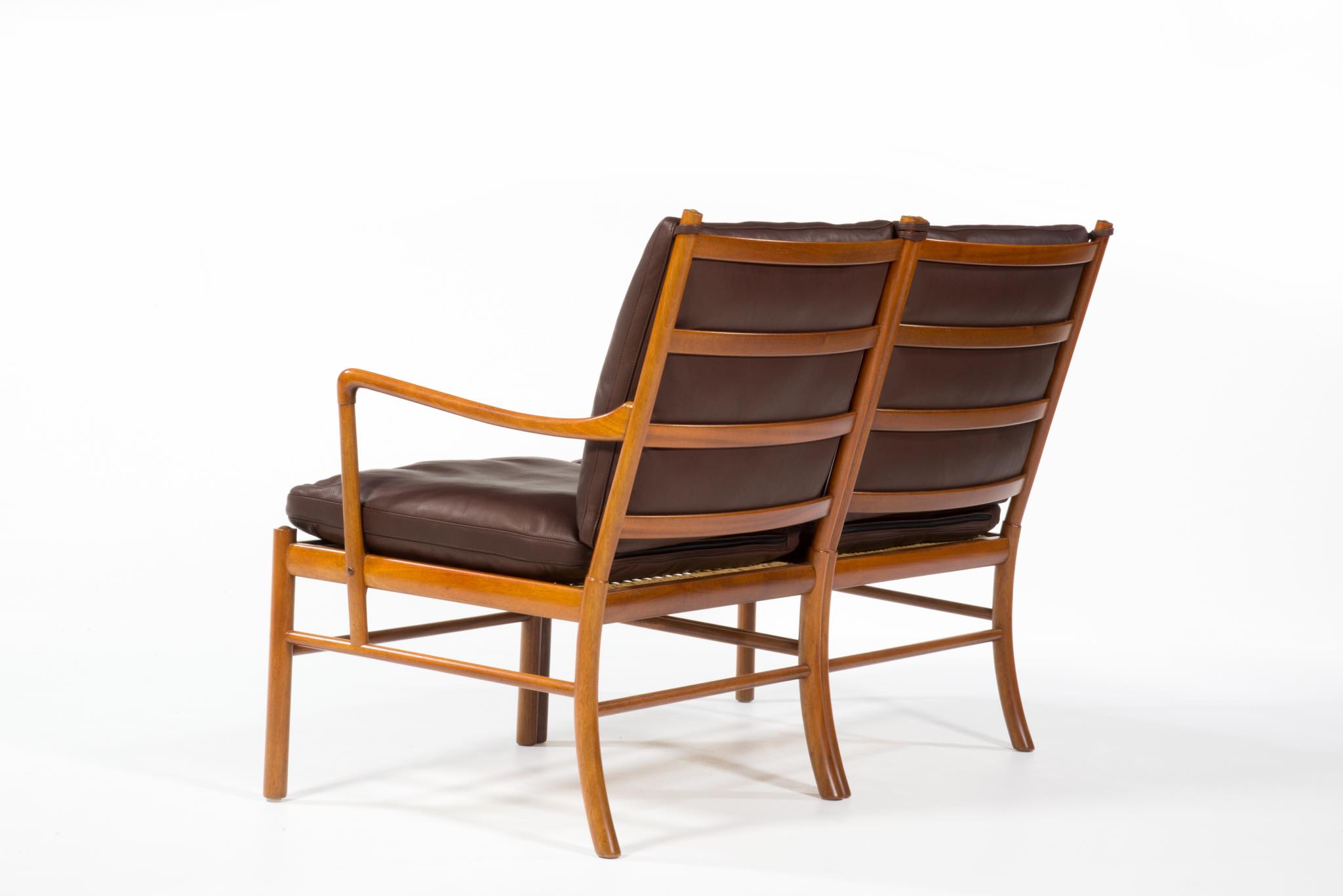 20世紀のデンマークを代表する家具デザイナーで、王立アカデミー家具科の主任教授も務めた、Ole Wanscher/オーレ・ヴァンシャーによる名作椅子、コロニアルチェア、セッティです。明るいマホガニー材を用いたタイプで、経年により木部はさらに明るくなっているようです。表面の塗膜には劣化が見られたため、着色せずに再加工を施しています。シートは濃茶色の皮革にて張り替えました。内部のフェザークッション(緩衝材)はオリジナルを再利用しています。シート下の籐張りの状態は良好ですが、一部切れてしまった箇所は部分的に張り替え修復しています。コンディションは良好です。