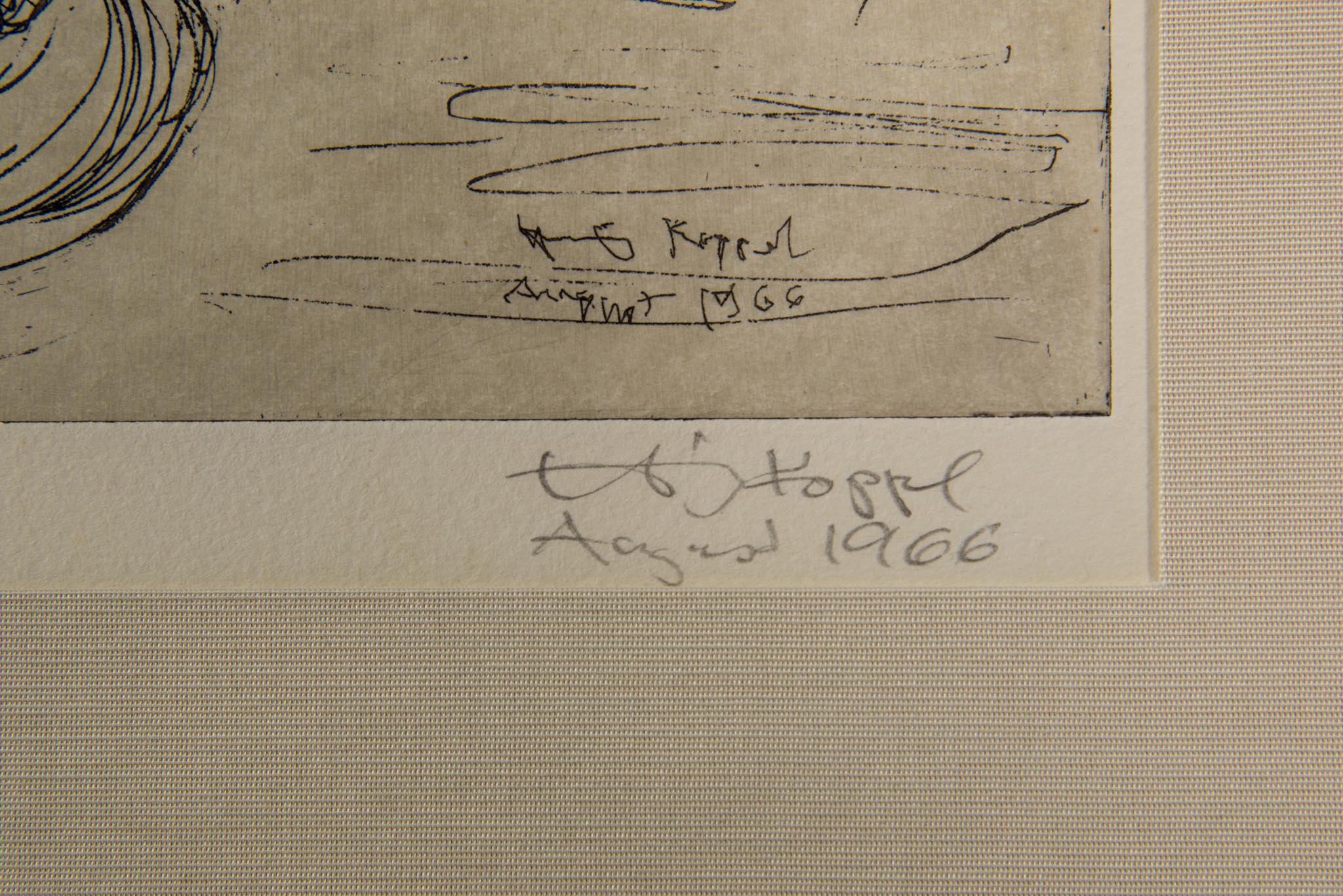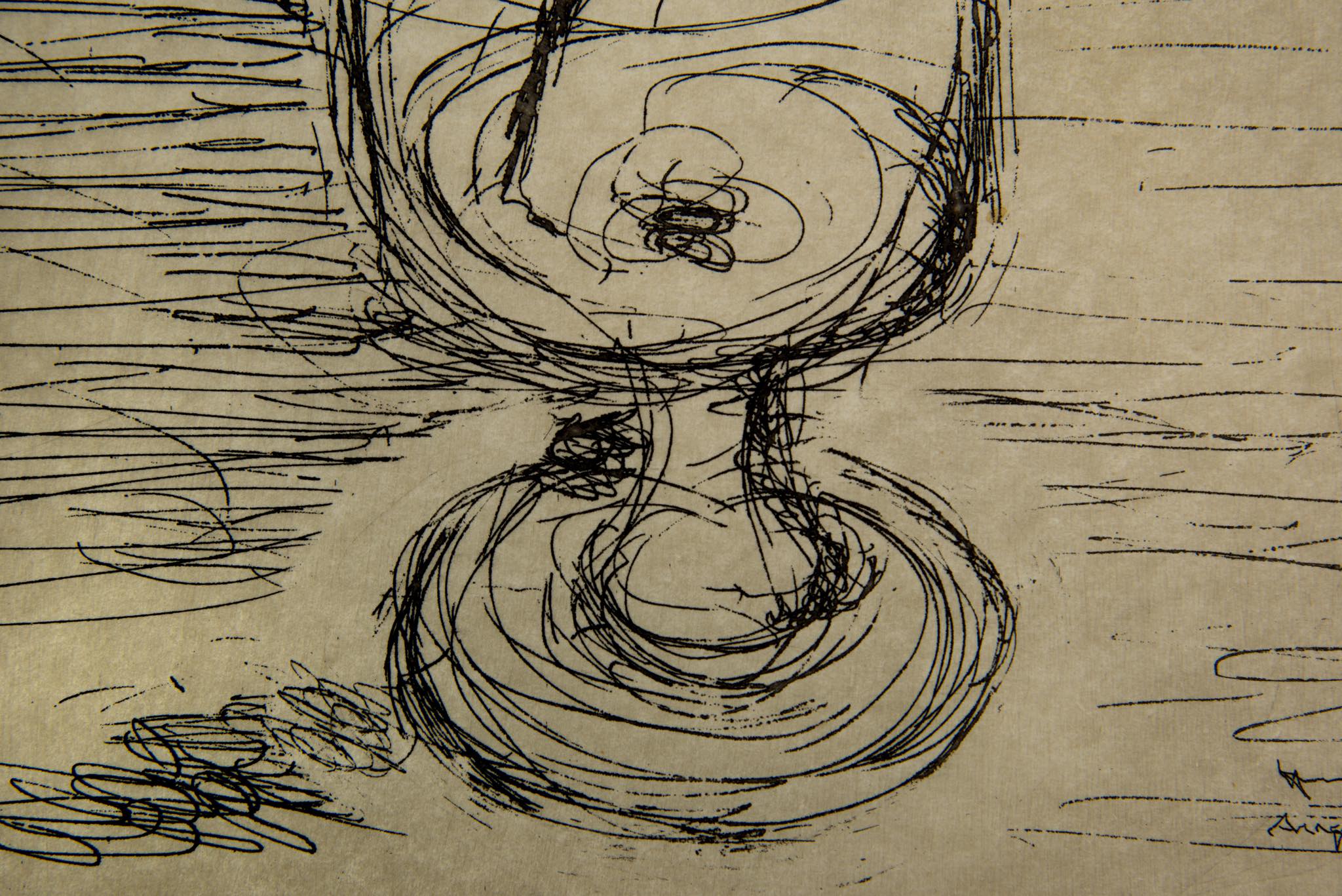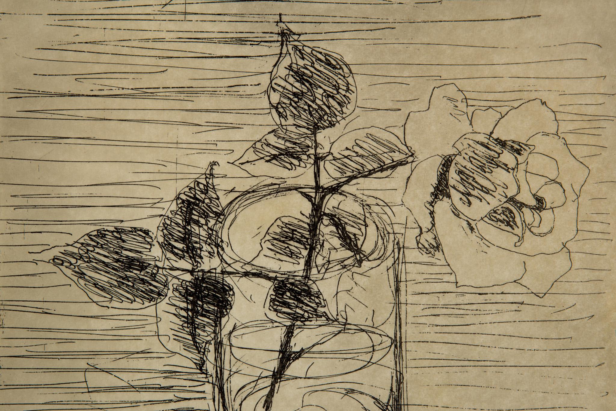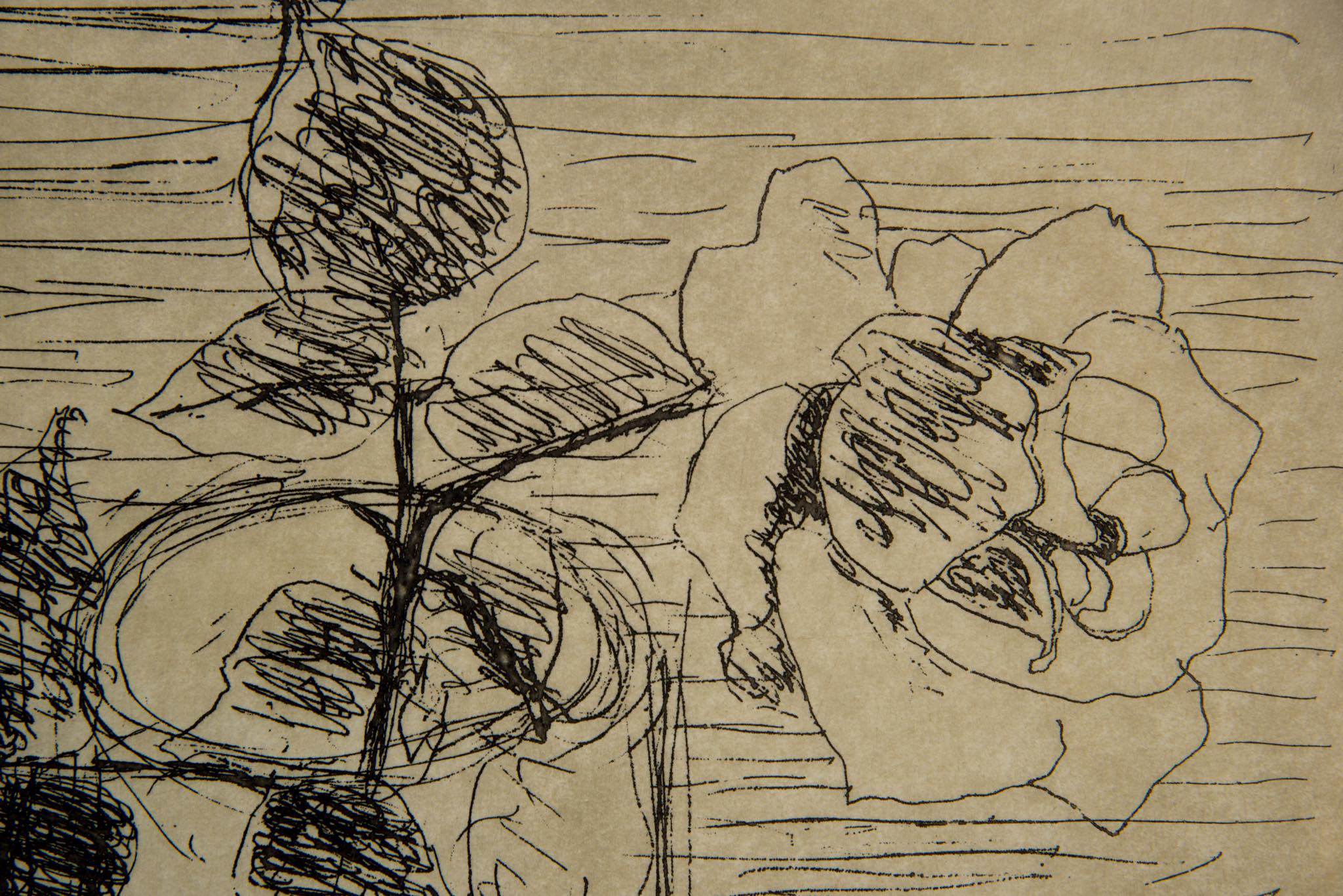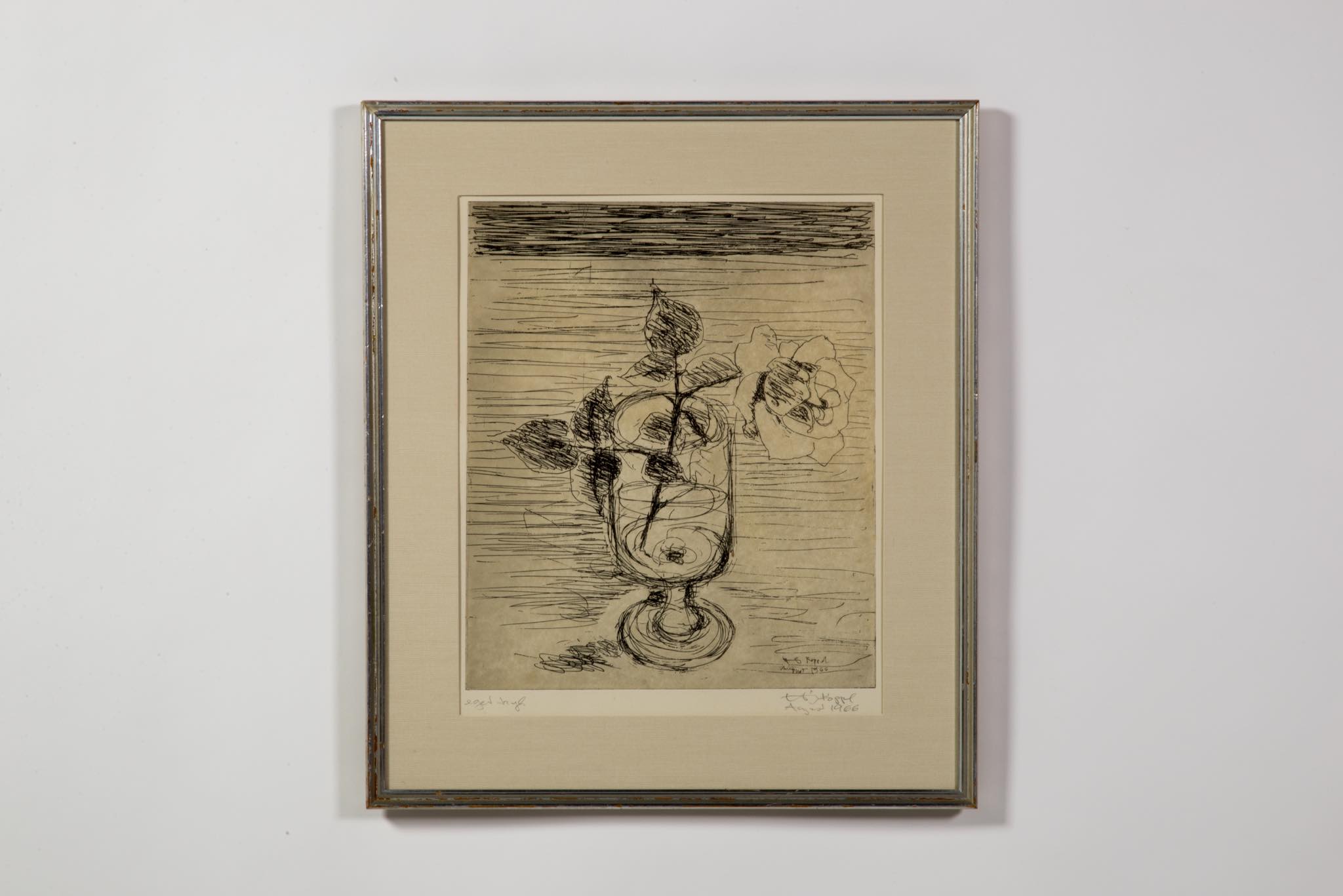 デンマークを代表するプロダクトデザイナー、ヘニング・コッペルによるエッチング作品です。卓上に置かれた”Beatrice glas”と呼ばれるステムグラスに投げ込まれた一輪の薔薇を描いたもので、1966年8月に制作されたものです。オリジナルと思われる銀箔のフレームは、所々に箔の剥落が見られますが、全体の雰囲気は損ねておりません。マットは布被せのものを用いて差し替えました。