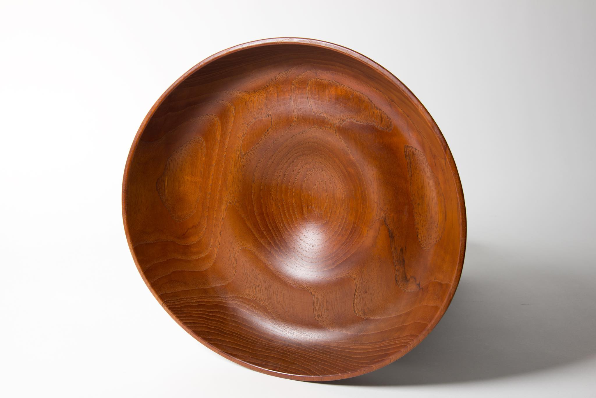 Finn Juhl/フィン・ユールによるデザイン、Kay Bojesen/カイ・ボイスン工房の熟練轆轤師、Magne Monsen/マグネ・モンセンによるチークボウルです。当時は6タイプのレパートリーが展開されたようです。チーク材の塊から削りだしたもので、轆轤挽きでありながら楕円形へと形成されており、乾燥に時間を掛けながらゆっくりと削り出す必要があったと思われ、手間と時間を要した高品質な作りであることが伺えます。コンディションは良好です。