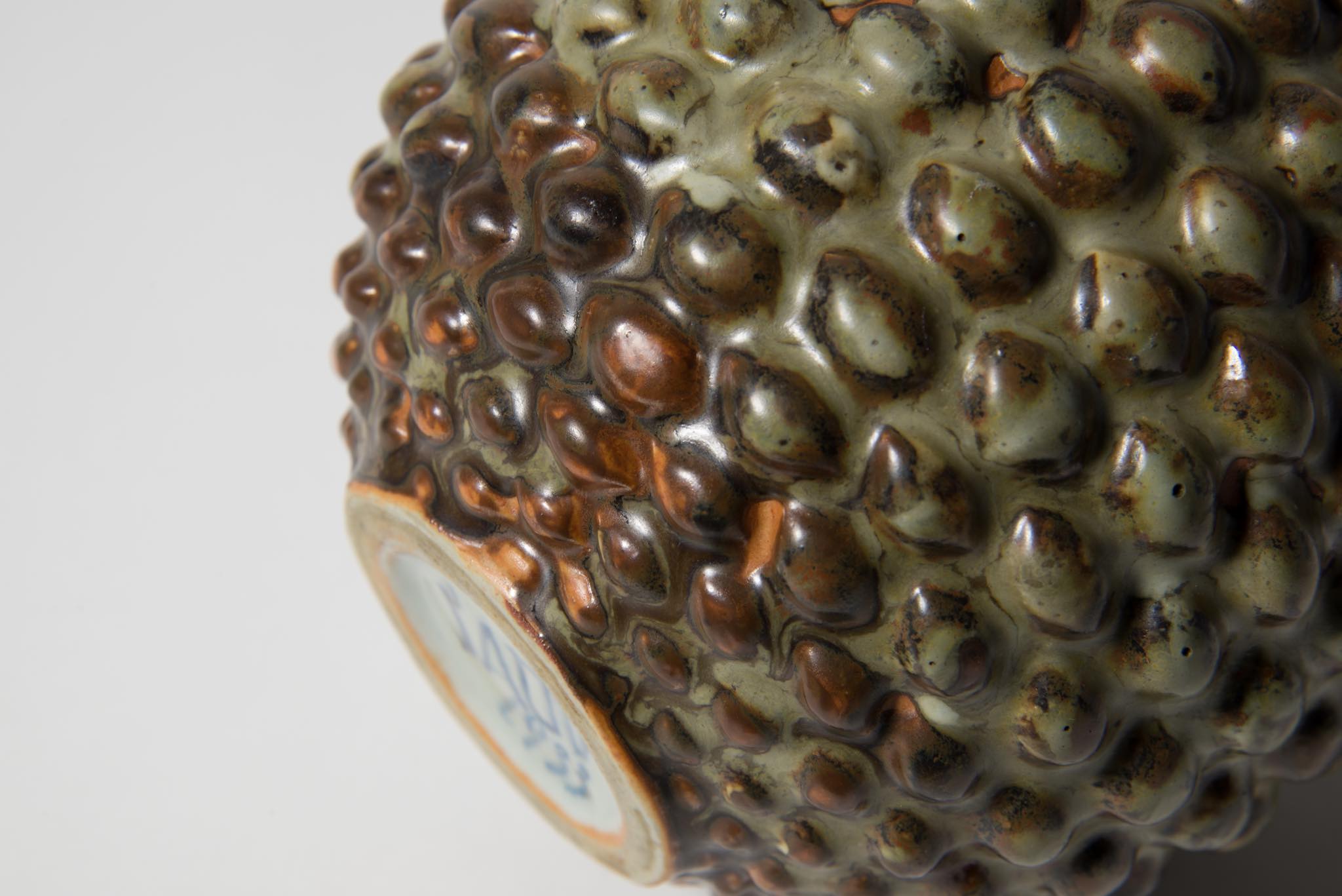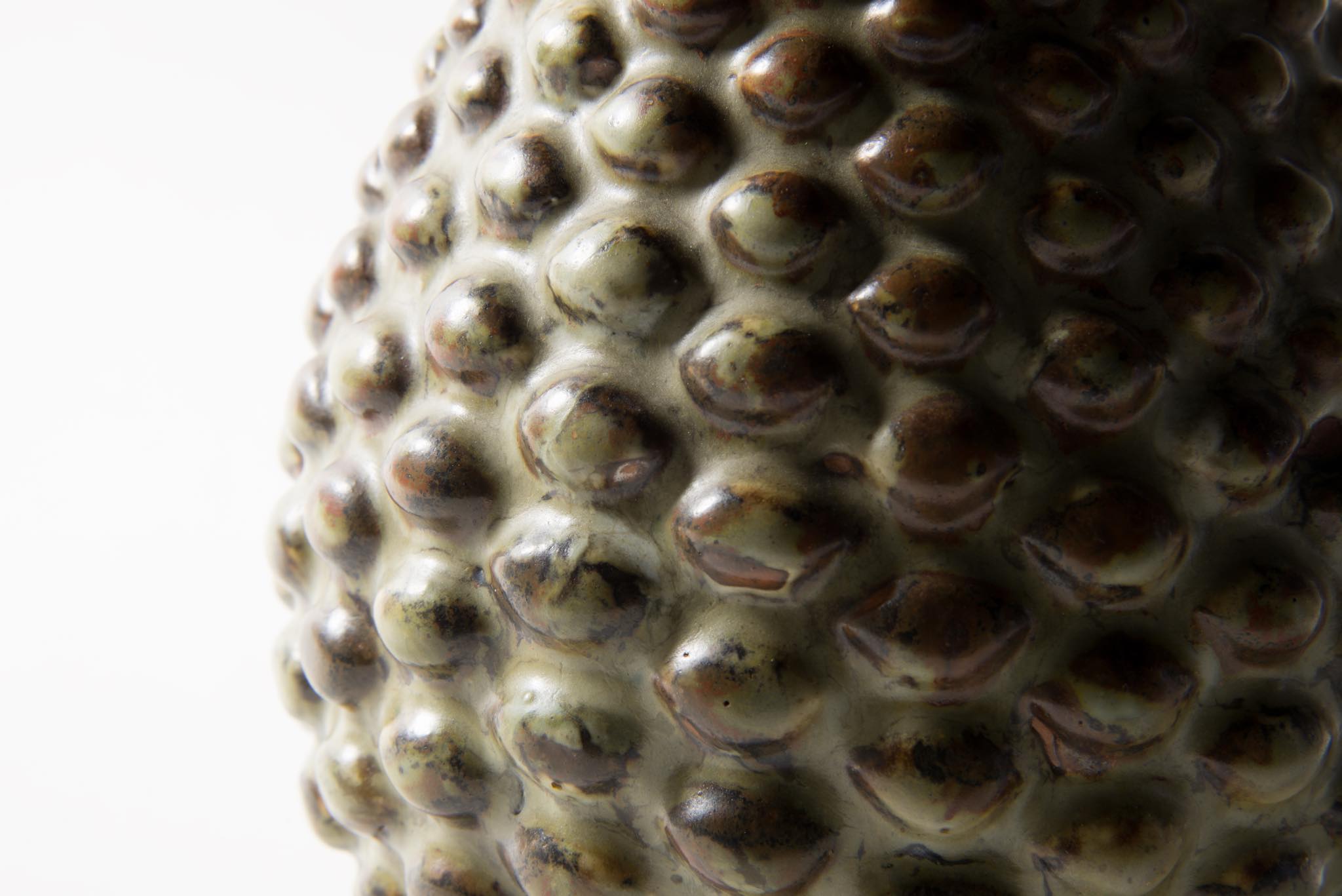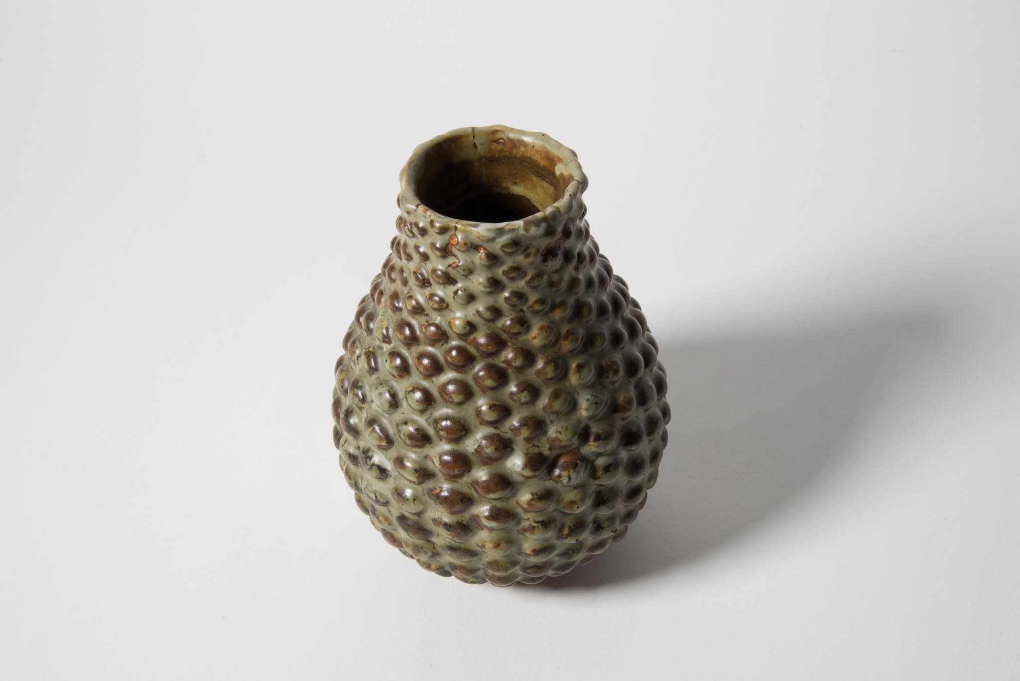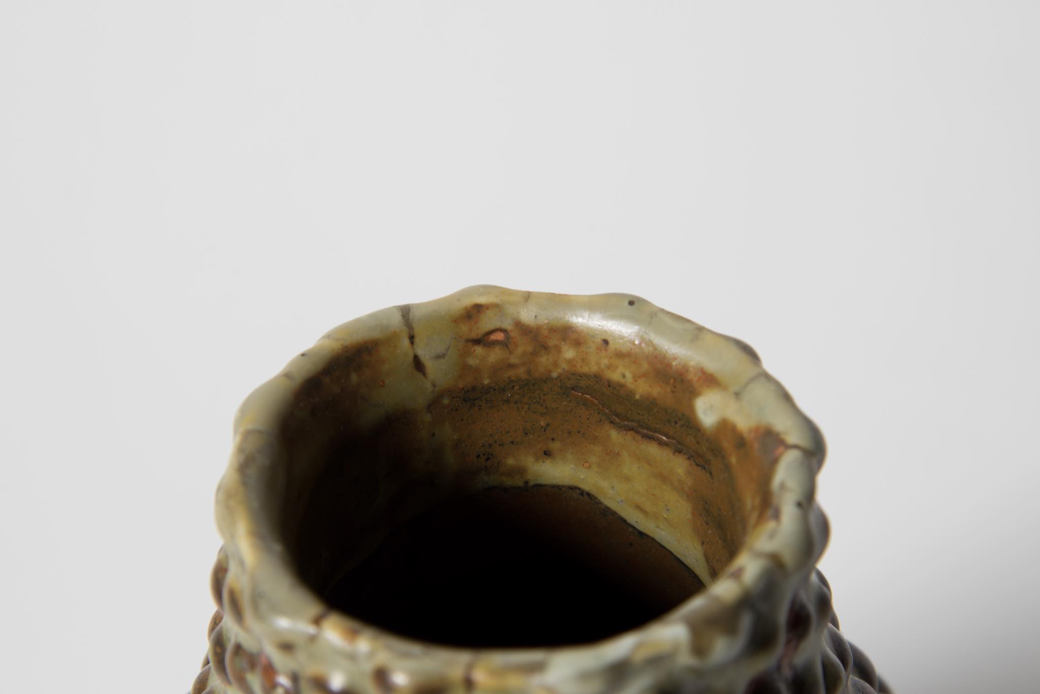 デンマークを代表する芸術家、Axel Salto/アクセル・サルトによるベースです。陶芸家のカール・ハリアーとアーネ・バーンらによって運営されていたコペンハーゲン市内の窯にて1933年に焼成されたものでしょう。ロイヤルコペンハーゲン窯と異なり、まだ量産化がなされていない頃の手作り感の趣があり、サルト本人による手捻りの可能性もあるでしょう。コンディションは良好です。
