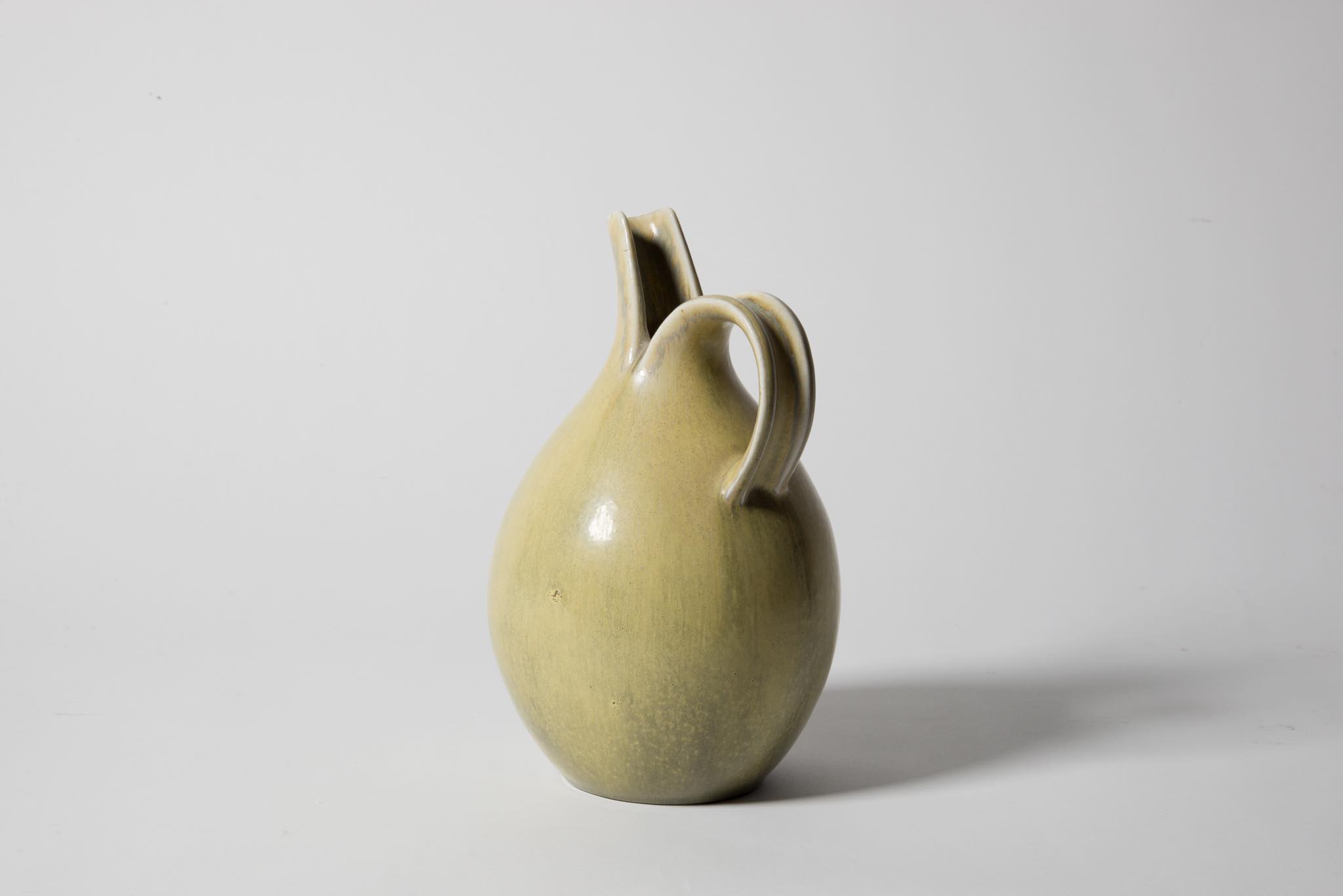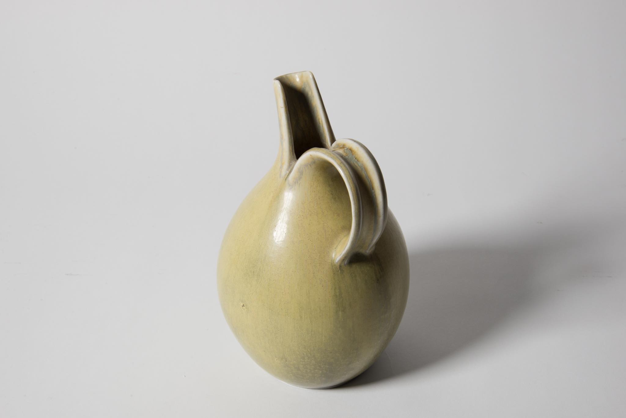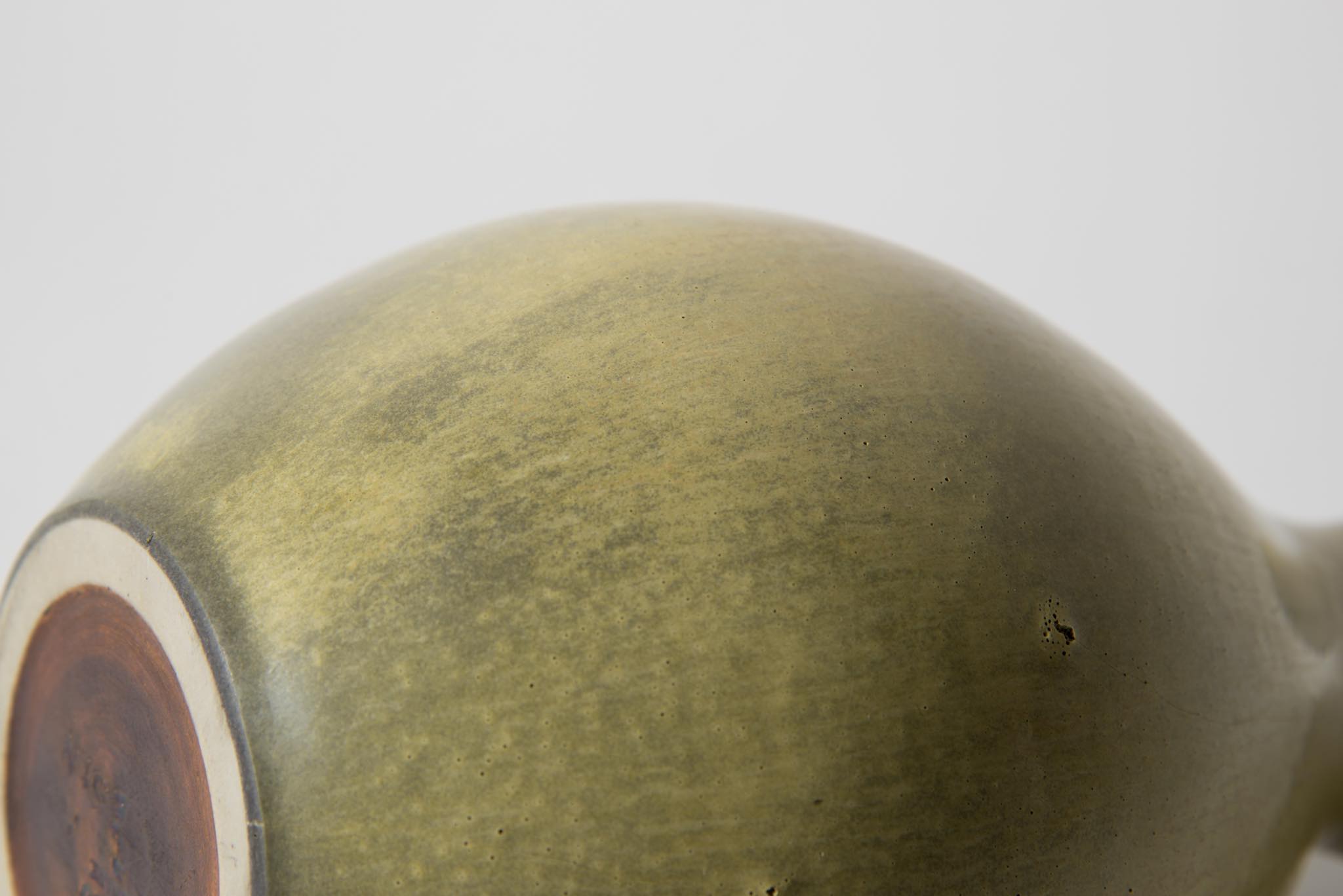 デンマークの SAXBO/サクスボー窯で活躍した陶芸家の Eva Stæhr-Nielsen/エヴァ・ステア・ニールセンによるベースです。写真には写りませんが、残念ながら本体に大きくクラックが見られます。ちょっとした衝撃で割れてしまうようなクラックに見えますが、中に水を入れて花を生け、店頭に飾り、ひと月以上が経ちましたが今のところ水漏れはありません。どの程度か状況がわからないので、大傷ものとしての扱いとさせていただきます。