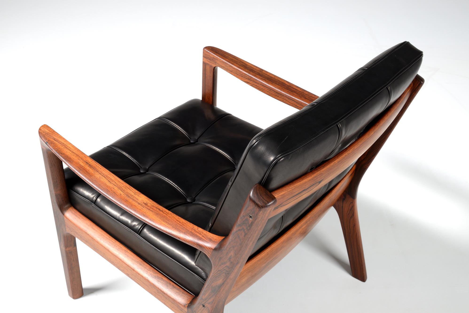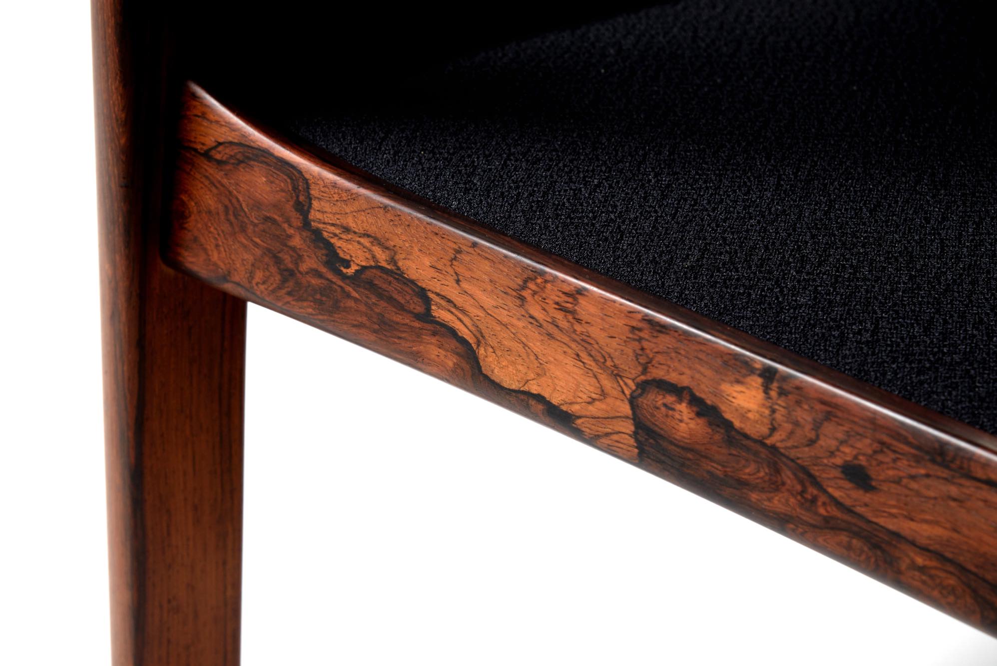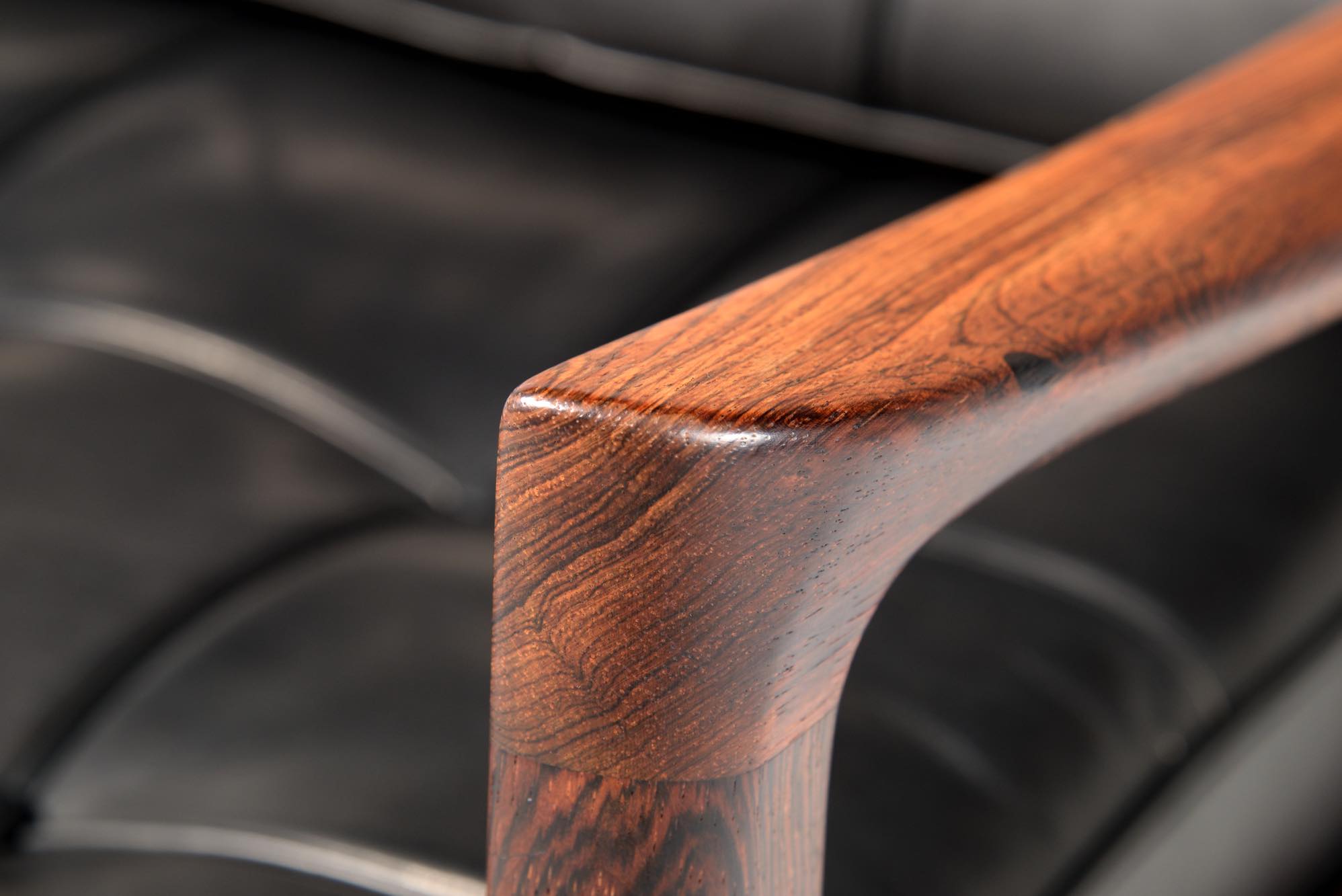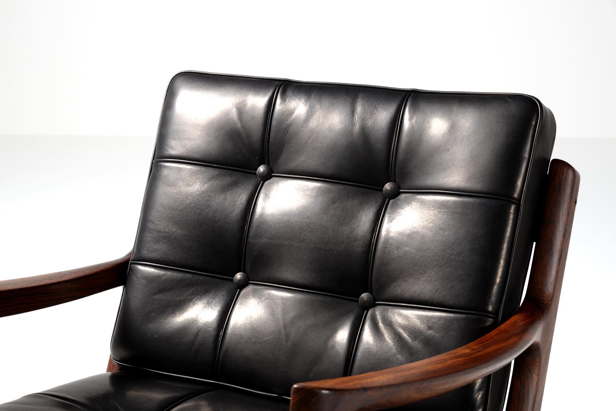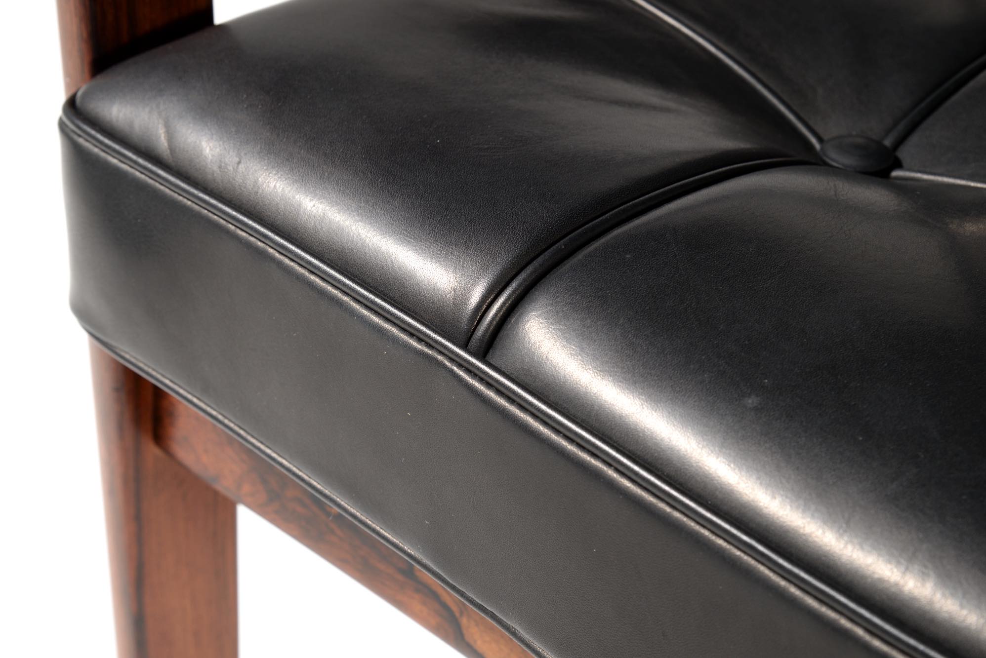 20世紀のデンマークを代表する家具デザイナーで、王立アカデミー家具科の教授を務めた Ole wansher/オーレ・ヴァンシャーによるSenator(上院議員)と題されたイージーチェアです。マホガニー、あるいはチーク材を用いて数多く生産されたモデルで、当時人気を誇っていたようです。こちらの椅子は比較的希少なブラジル原産と思しきローズウッドの無垢材が用いられており、特有の木目に見応えがあります。座面は黒色皮革にて新たに張り替えました。コンディションは良好です。