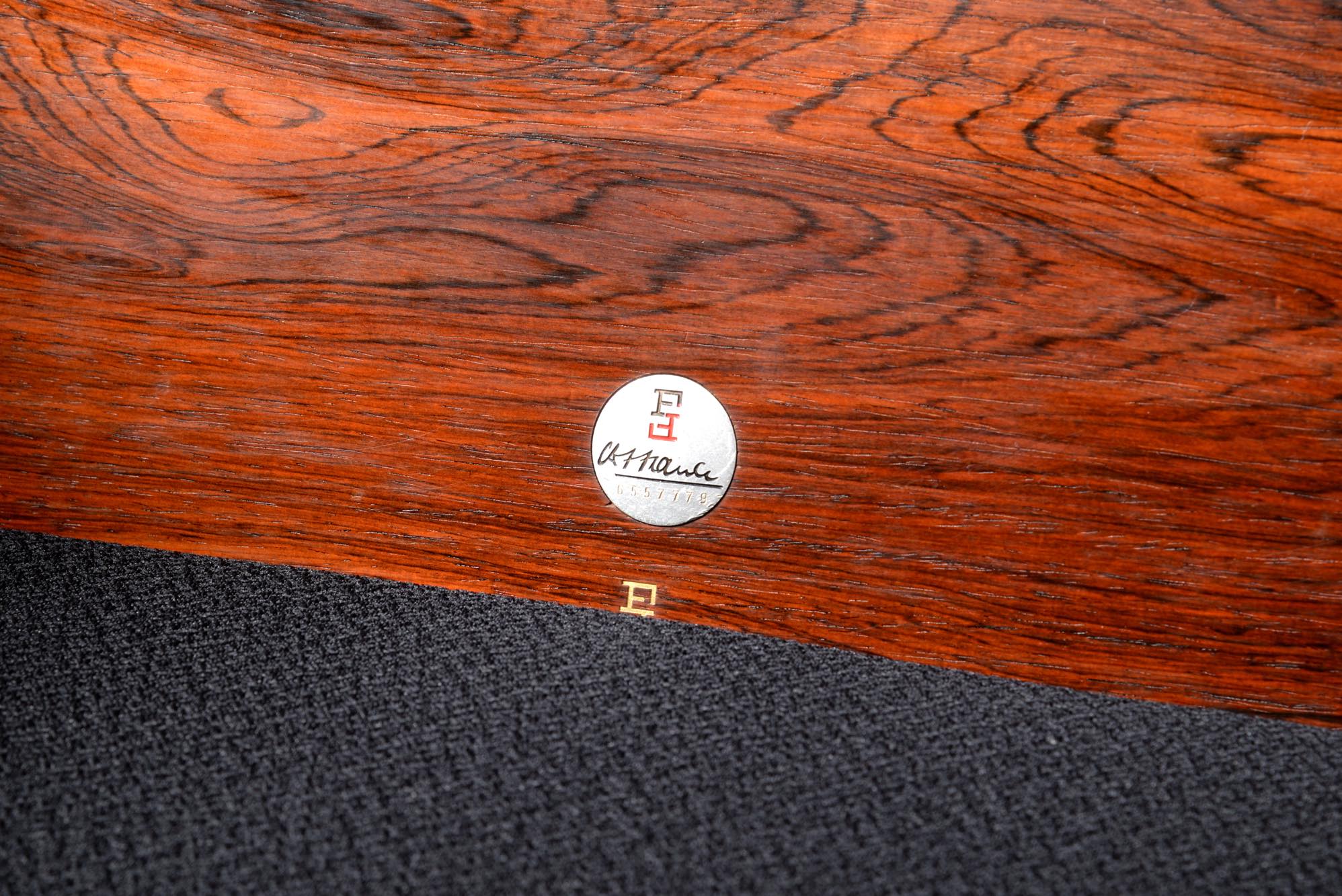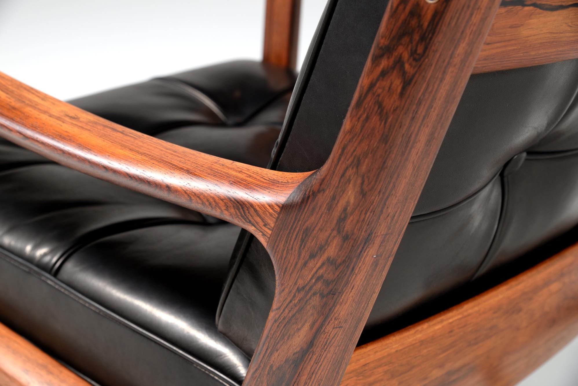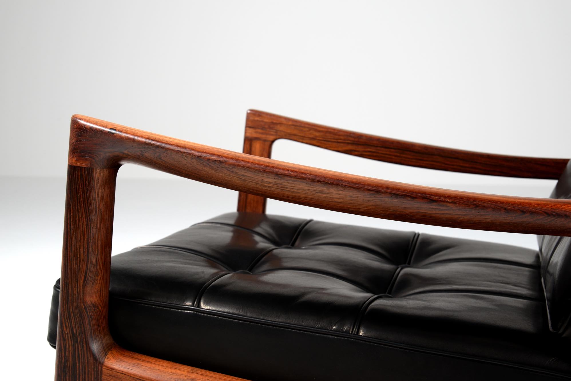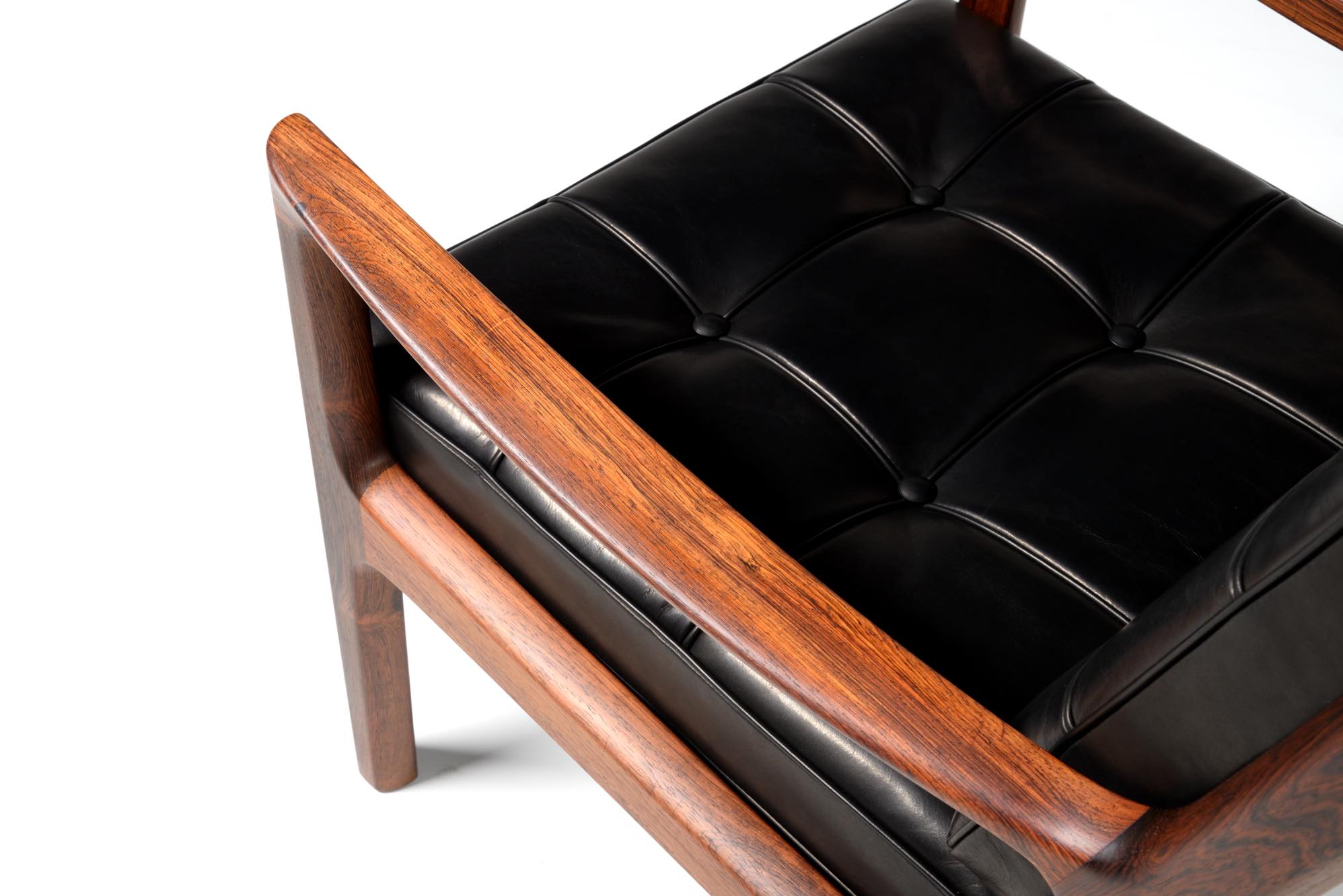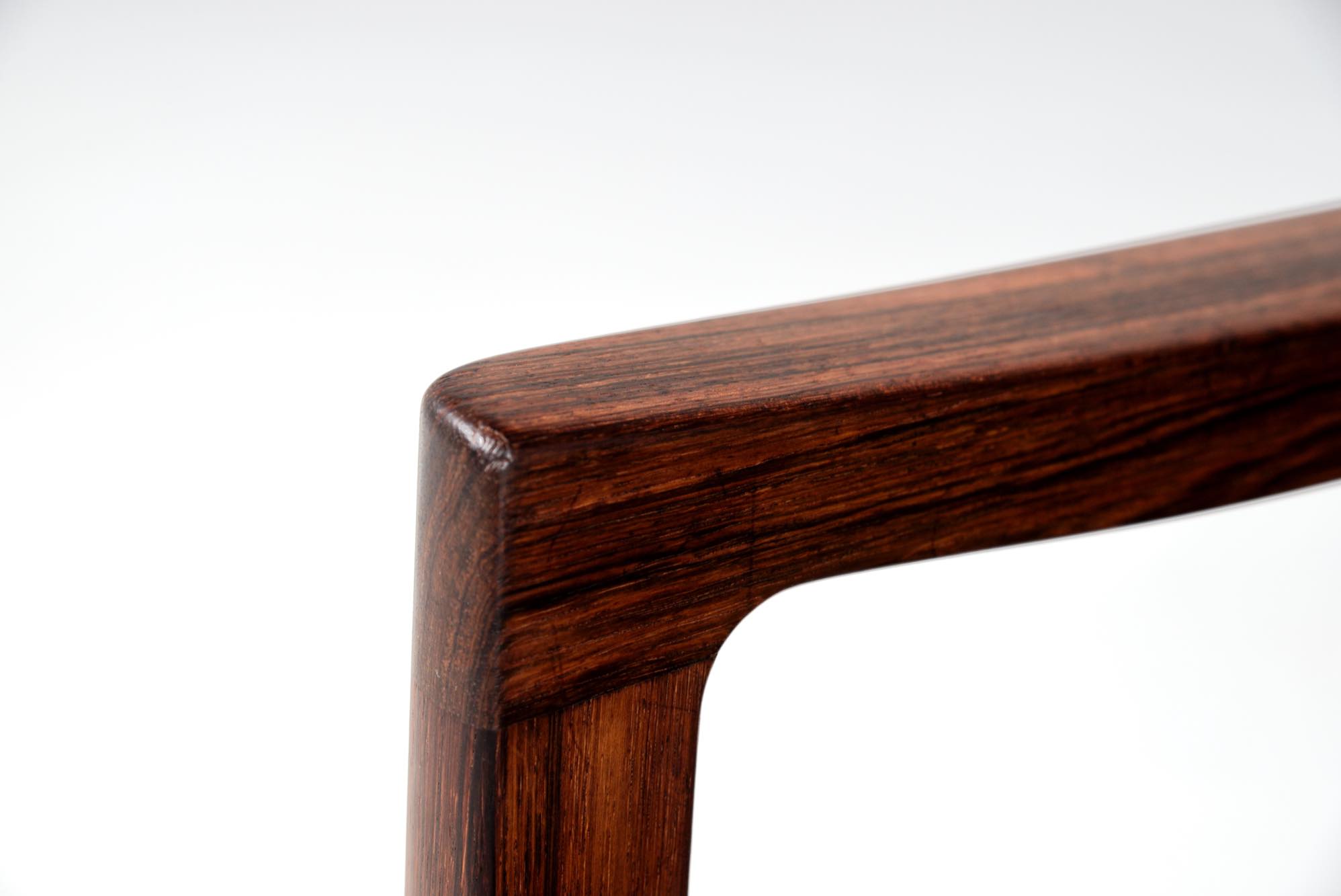 20世紀のデンマークを代表する家具デザイナーで、王立アカデミー家具科の教授を務めた Ole wansher/オーレ・ヴァンシャーによるSenator(上院議員)と題されたイージーチェアです。マホガニー、あるいはチーク材を用いて数多く生産されたモデルで、当時人気を誇っていたようです。こちらの椅子は比較的希少なブラジル原産と思しきローズウッドの無垢材が用いられており、特有の木目に見応えがあります。座面は黒色皮革にて新たに張り替えました。コンディションは良好です。