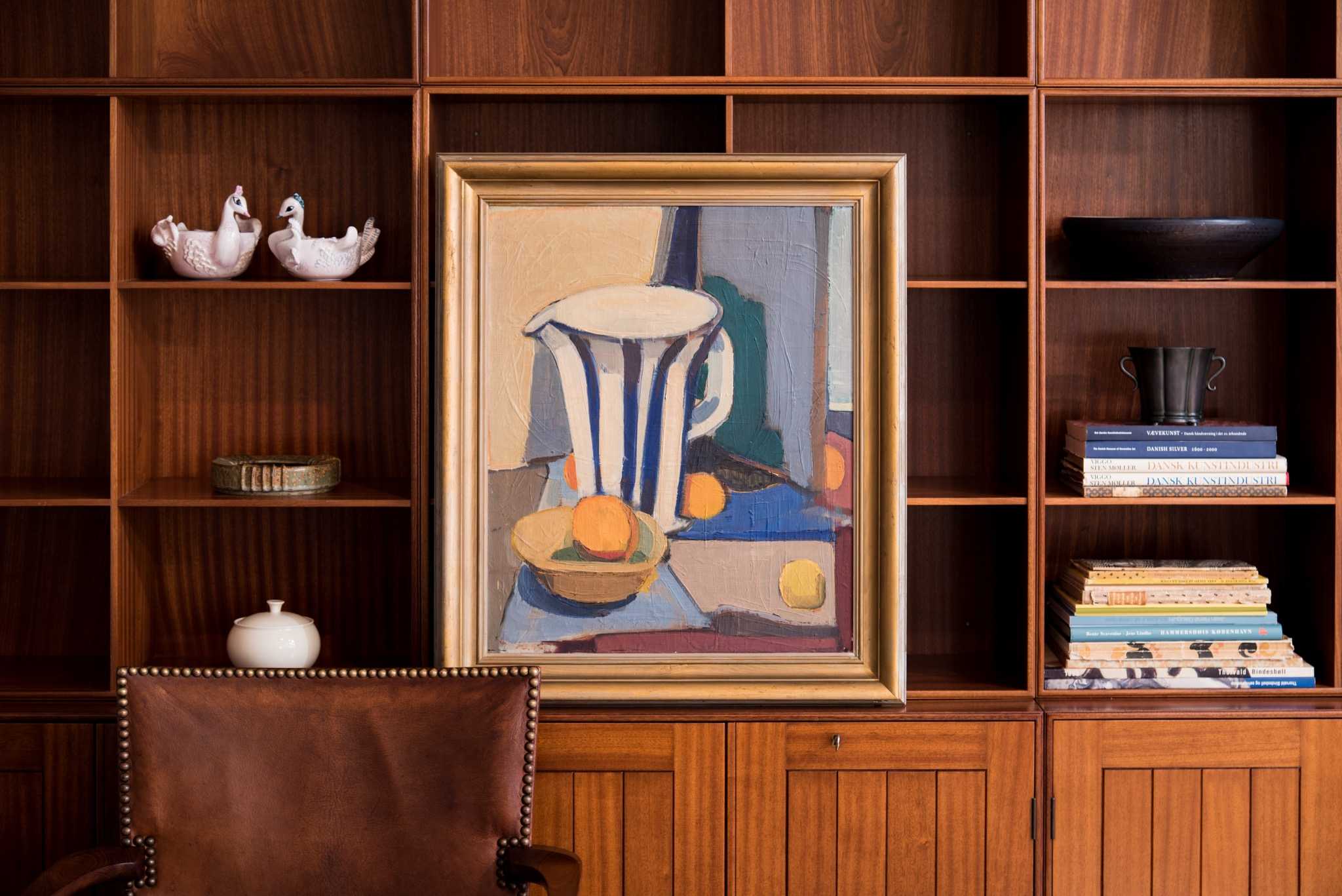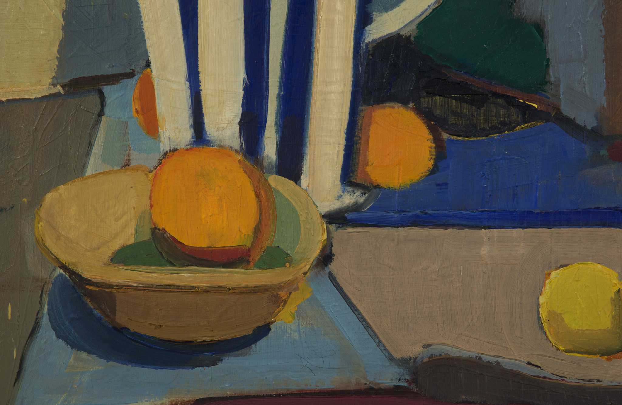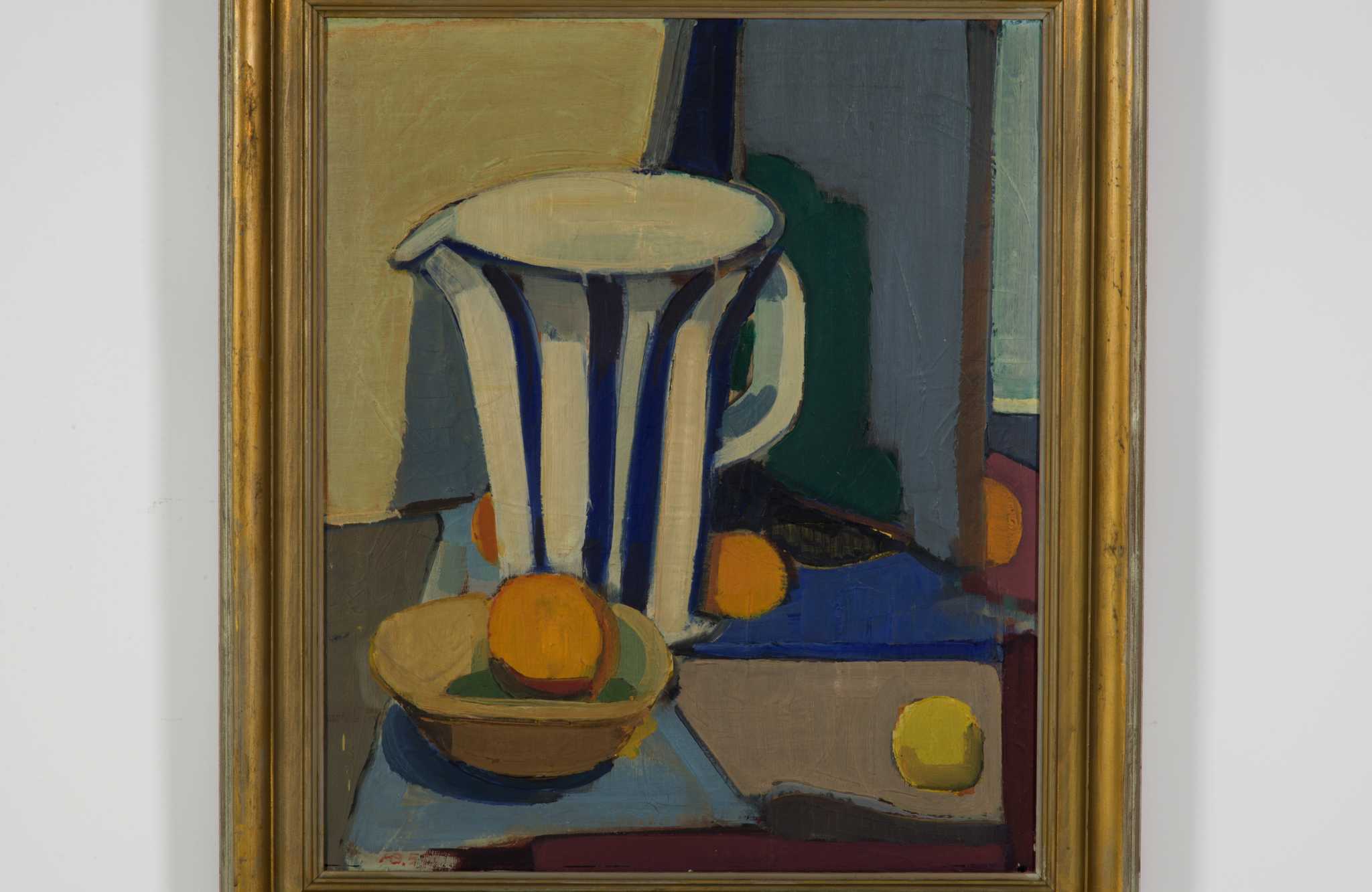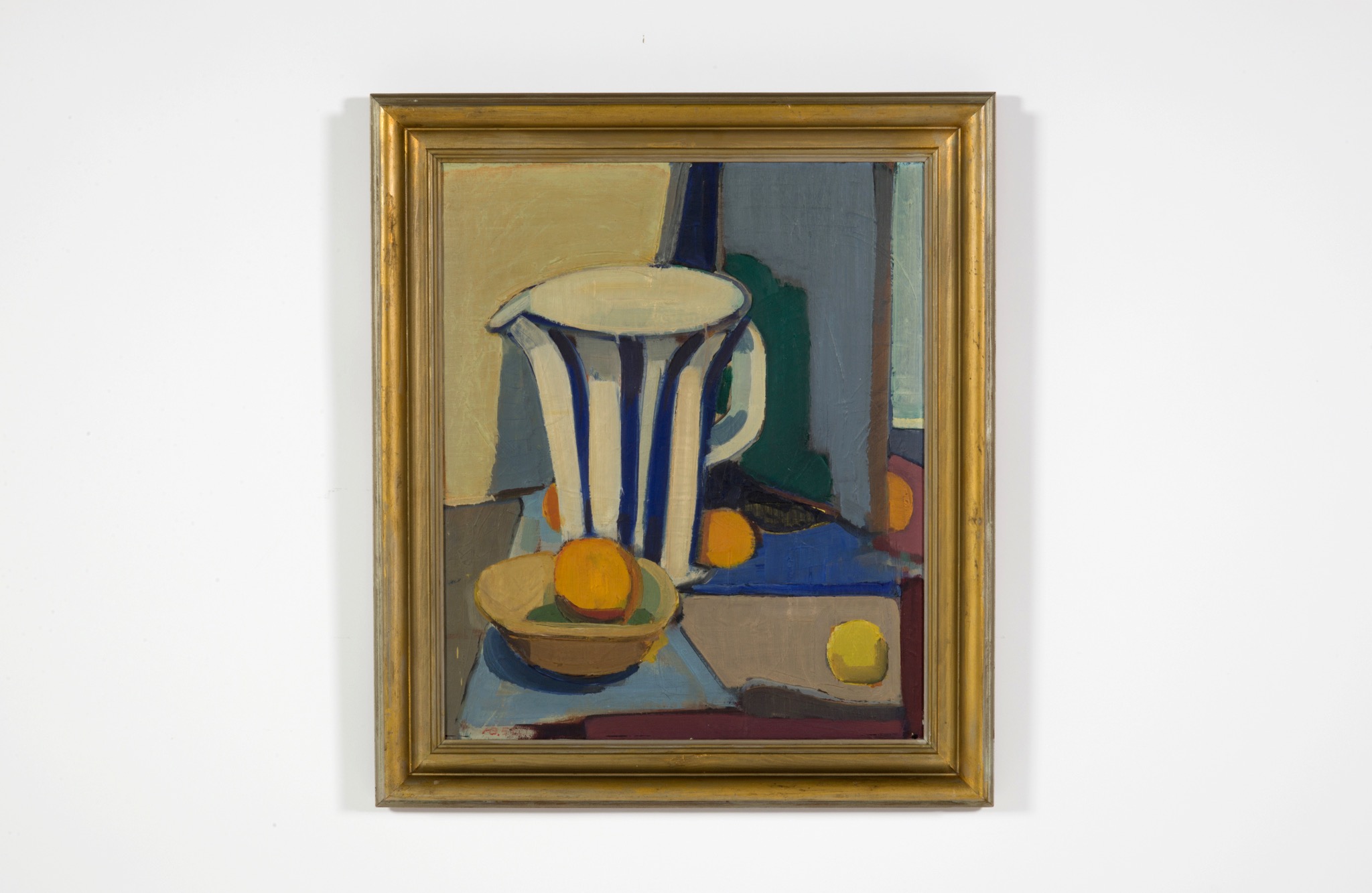 1931年生まれのデンマーク人画家で劇場装飾家(舞台画家)の Henrik Bloch/ヘンリック・ブロックによる油彩静物画作品です。卓上に転がるフルーツやピッチャーなどをナイフを用いて独自のタッチで描いています。金箔のフレームはオリジナルとなり、多少の経年劣化は見られますが鑑賞の妨げになる程ではありません。
