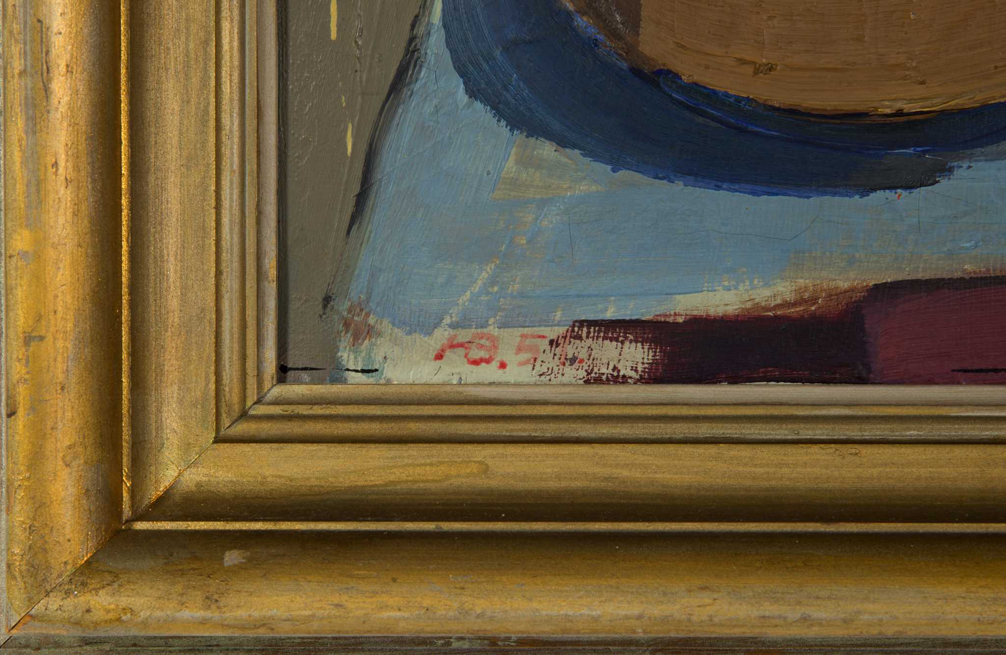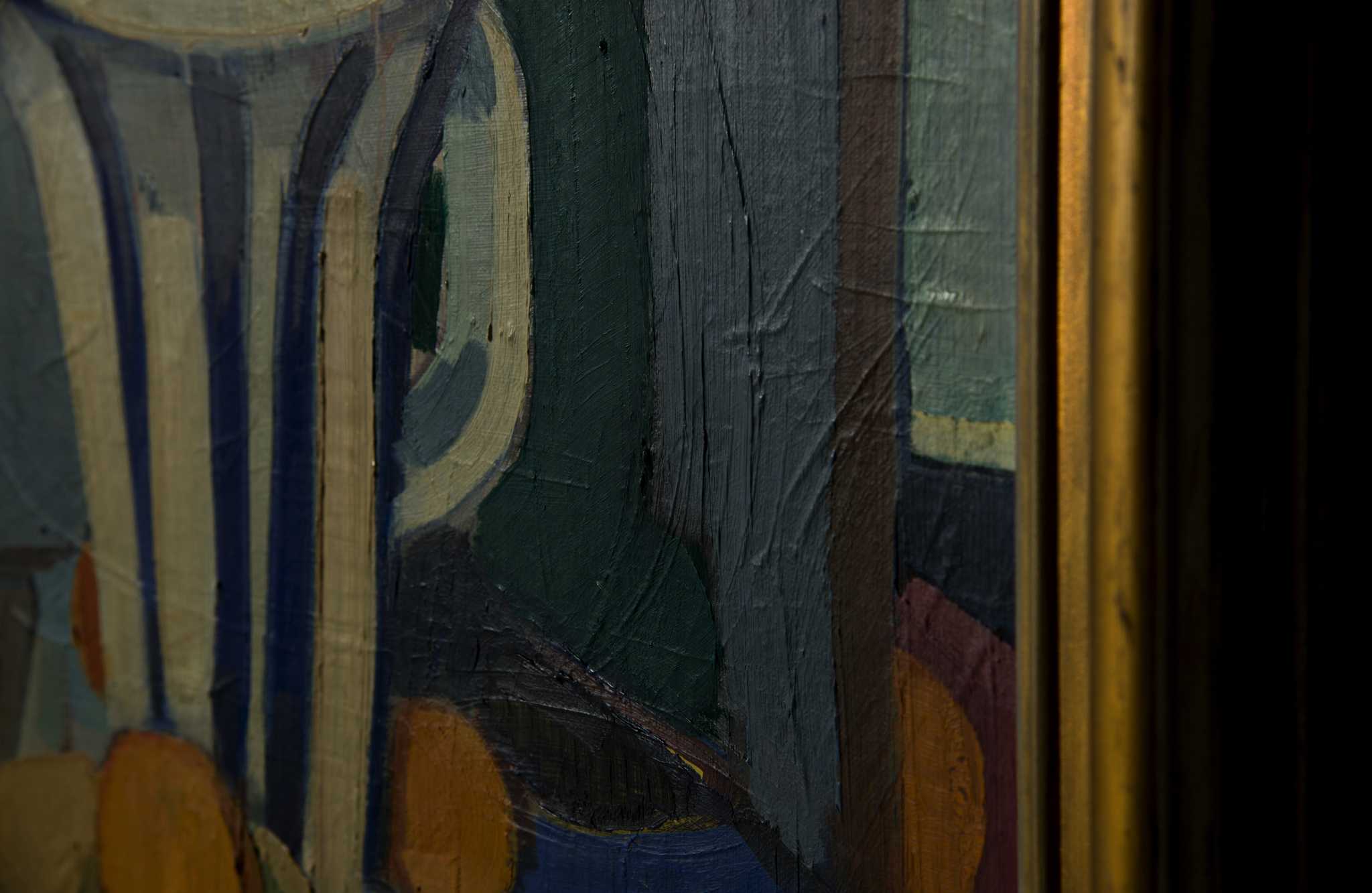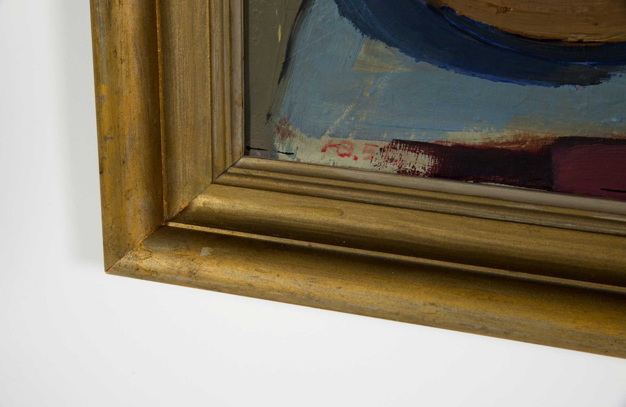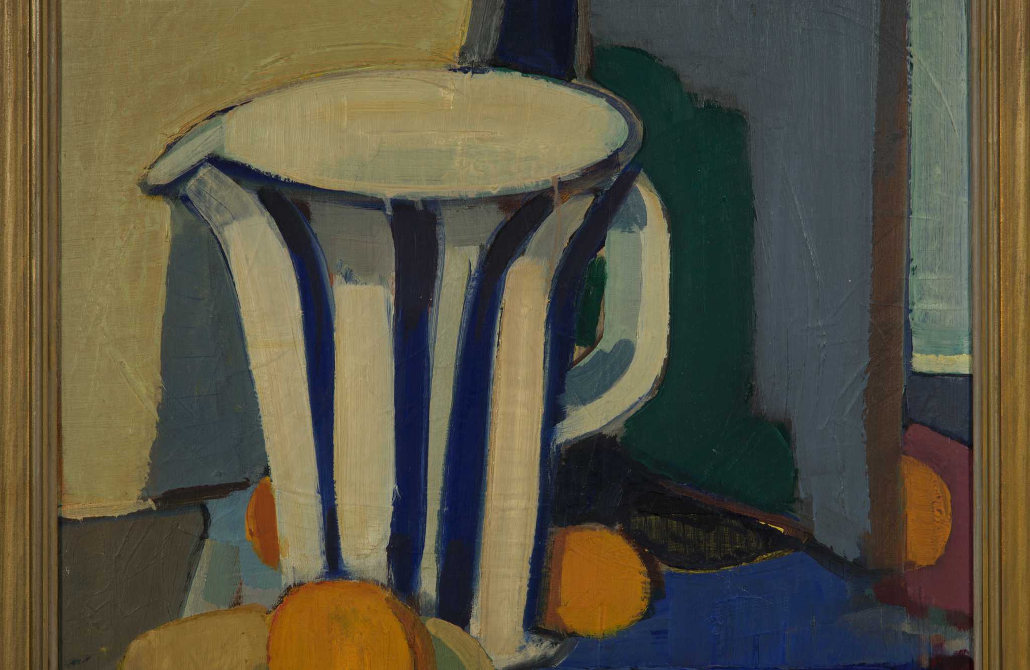 1931年生まれのデンマーク人画家で劇場装飾家(舞台画家)の Henrik Bloch/ヘンリック・ブロックによる油彩静物画作品です。卓上に転がるフルーツやピッチャーなどをナイフを用いて独自のタッチで描いています。金箔のフレームはオリジナルとなり、多少の経年劣化は見られますが鑑賞の妨げになる程ではありません。