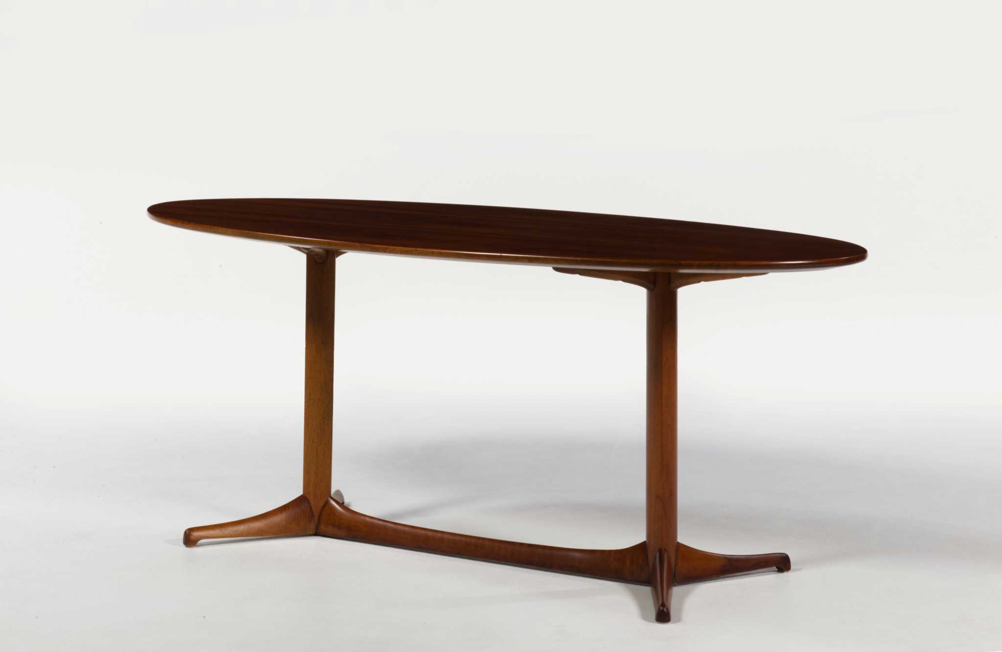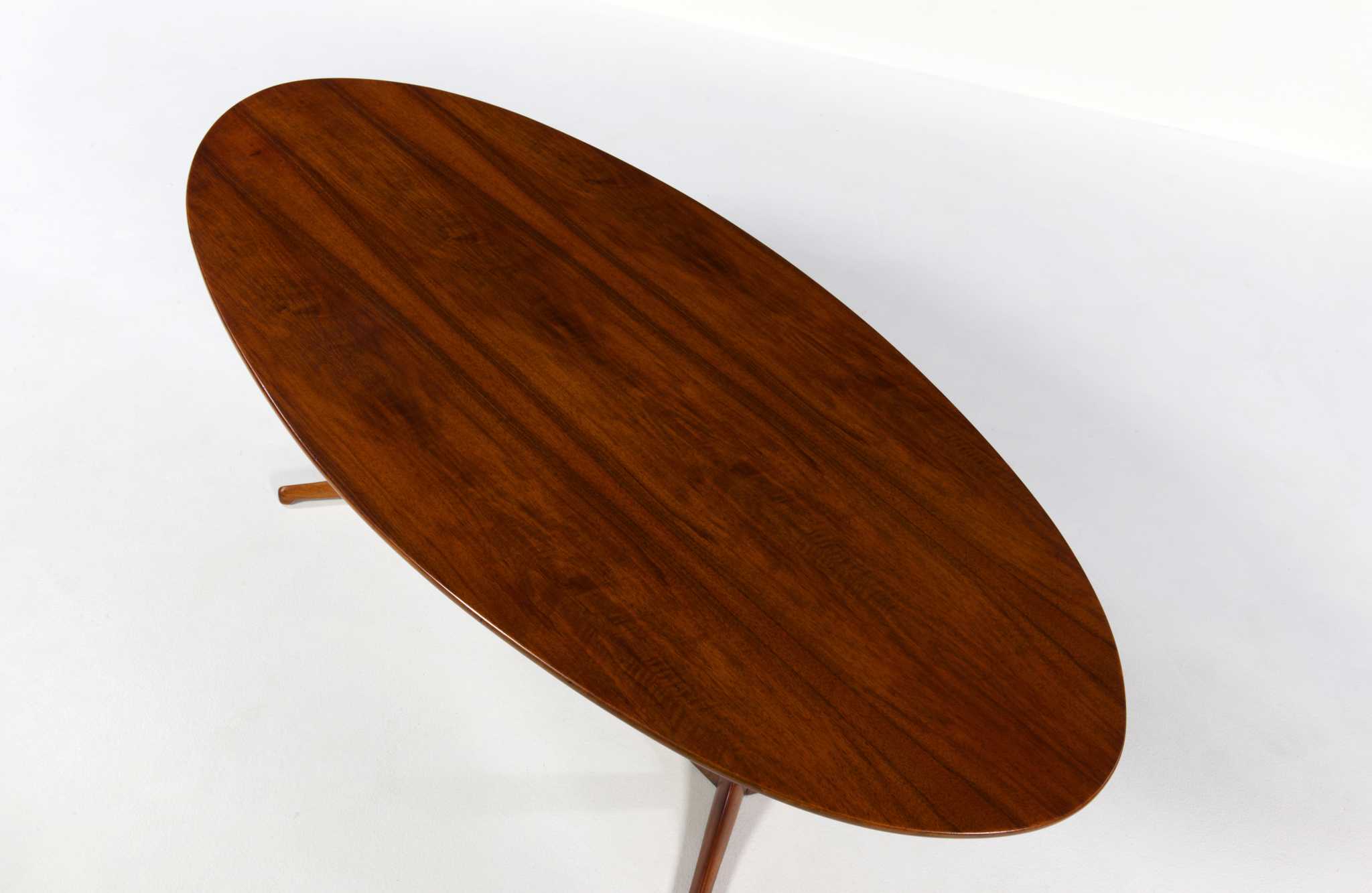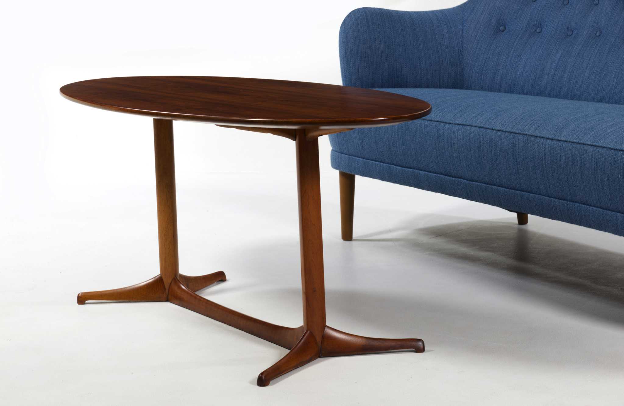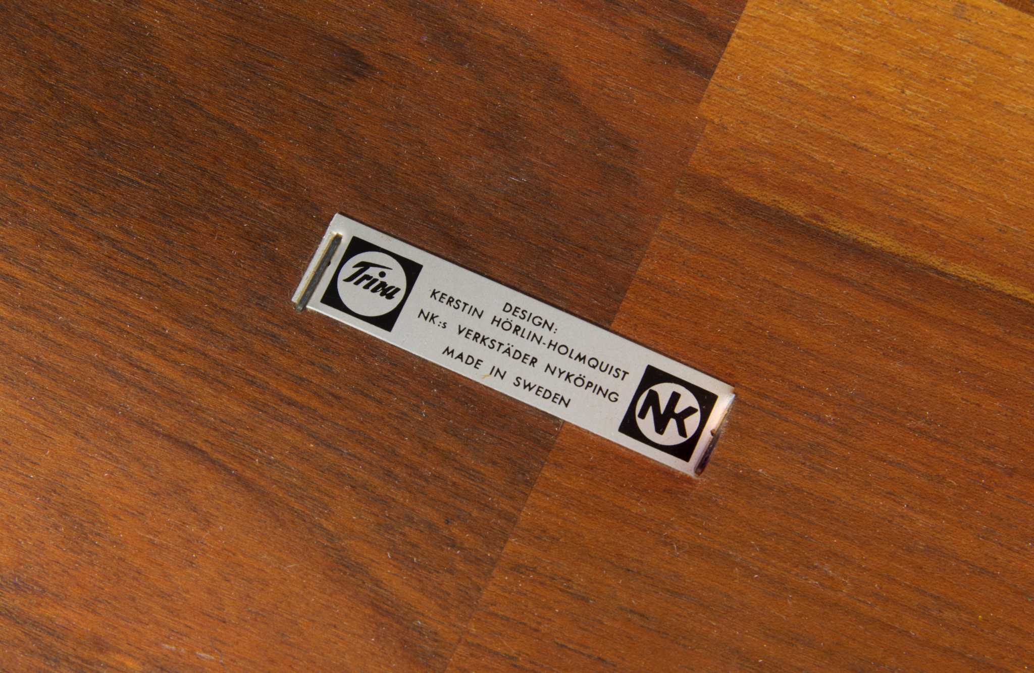 スウェーデンの家具デザイナー、Kerstin Hörlin-Holmquist/カースティン・ホーリン・ホルムクウィストによるコーヒーテーブルです。ウォルナット材で作られたもので、 ”Plommonet/プラム” の名で親しまれ、人気を博したモデルです。細長い楕円を描いた天板と、細く華奢な脚部が特徴のモデルで、小振りで綺麗な佇まいのテーブルです。コンディションにつきまして、本来は僅かに浮いている貫が床に着いておりますが、構造の緩みや反りなどは見られず、不安定感も無く、しっかりとしています。天板に小さな打痕が見られますが、全体的に綺麗な状態です。