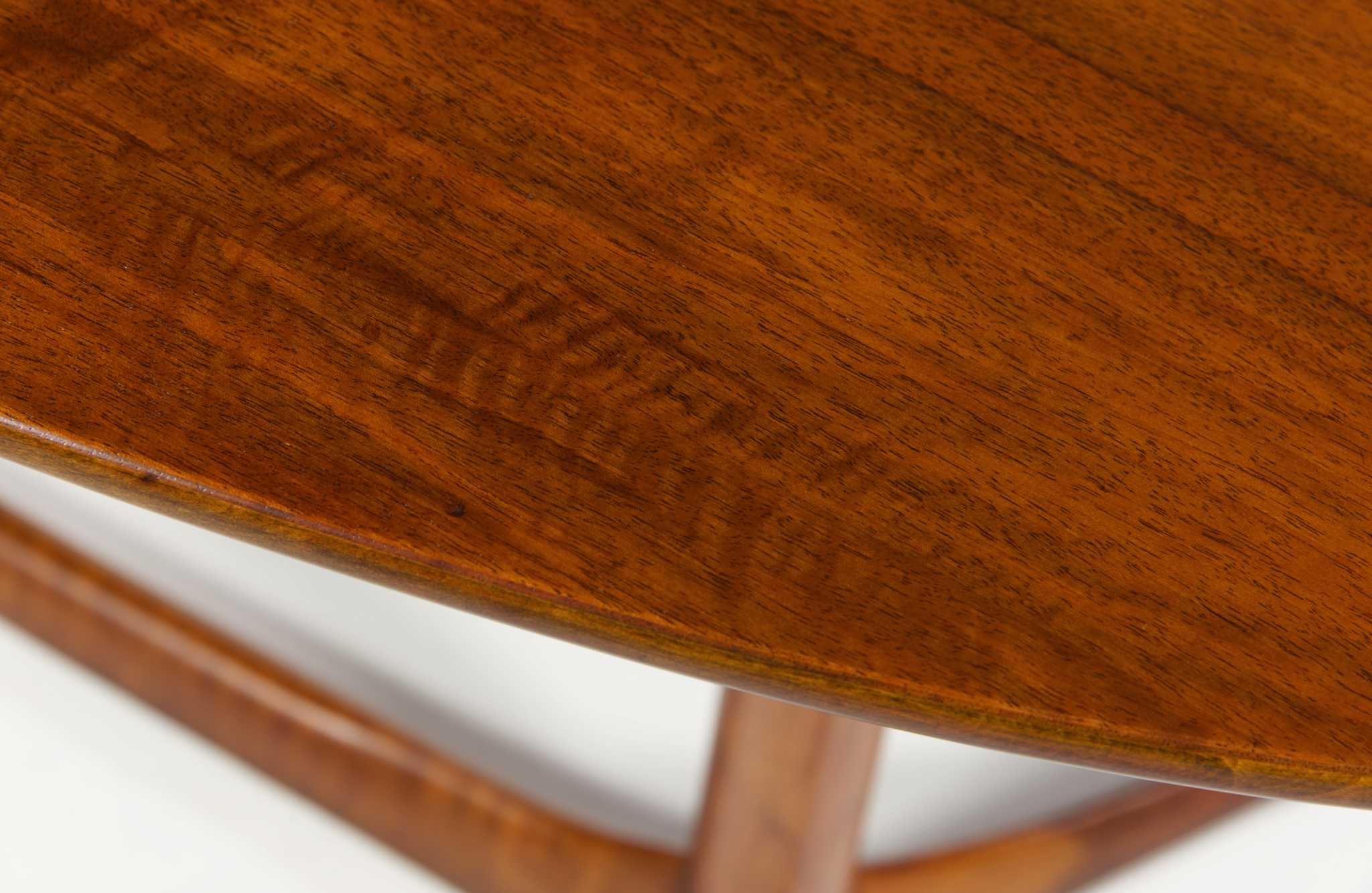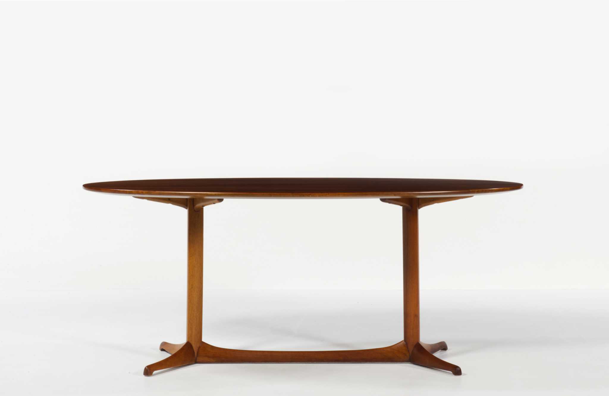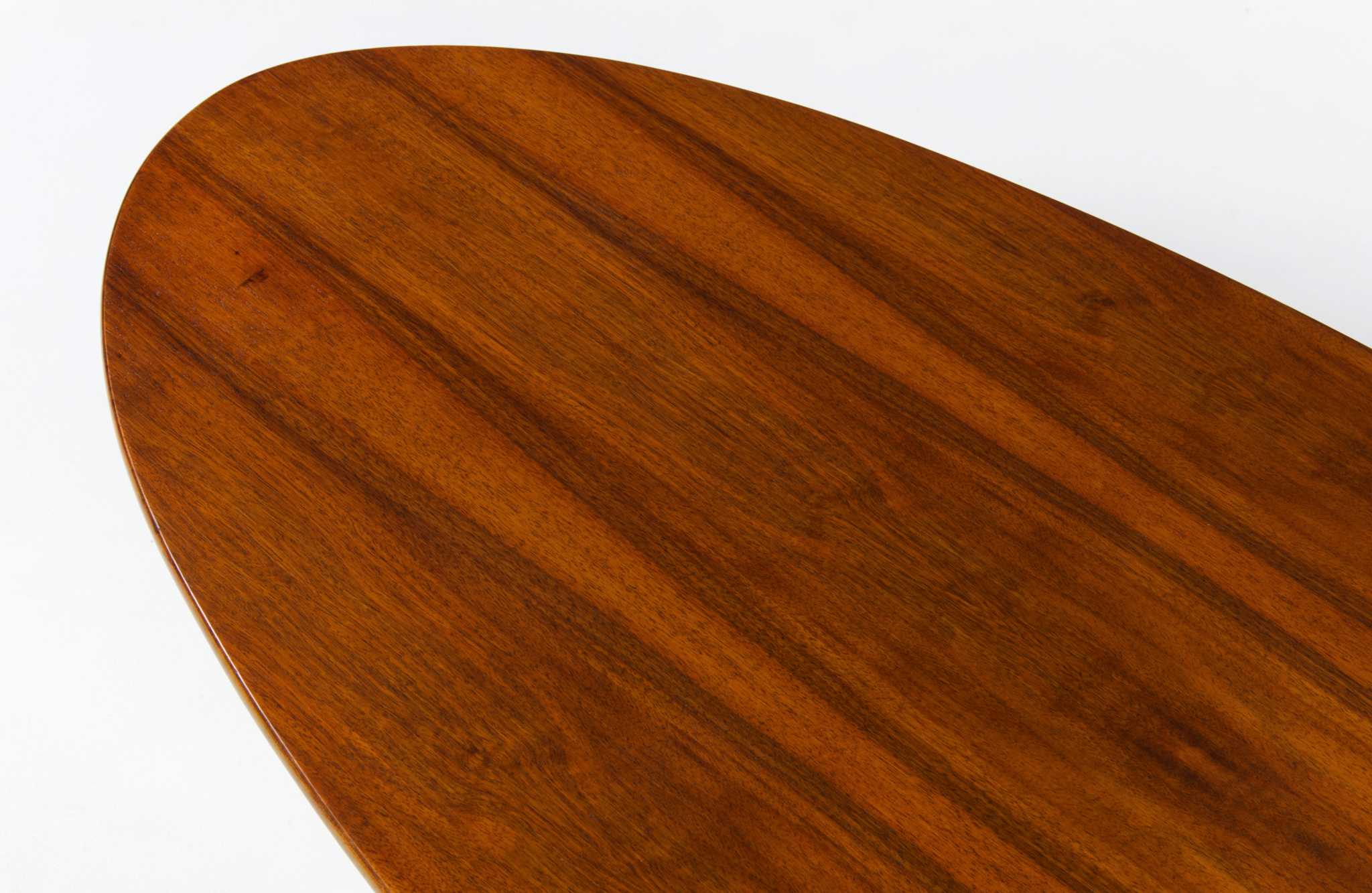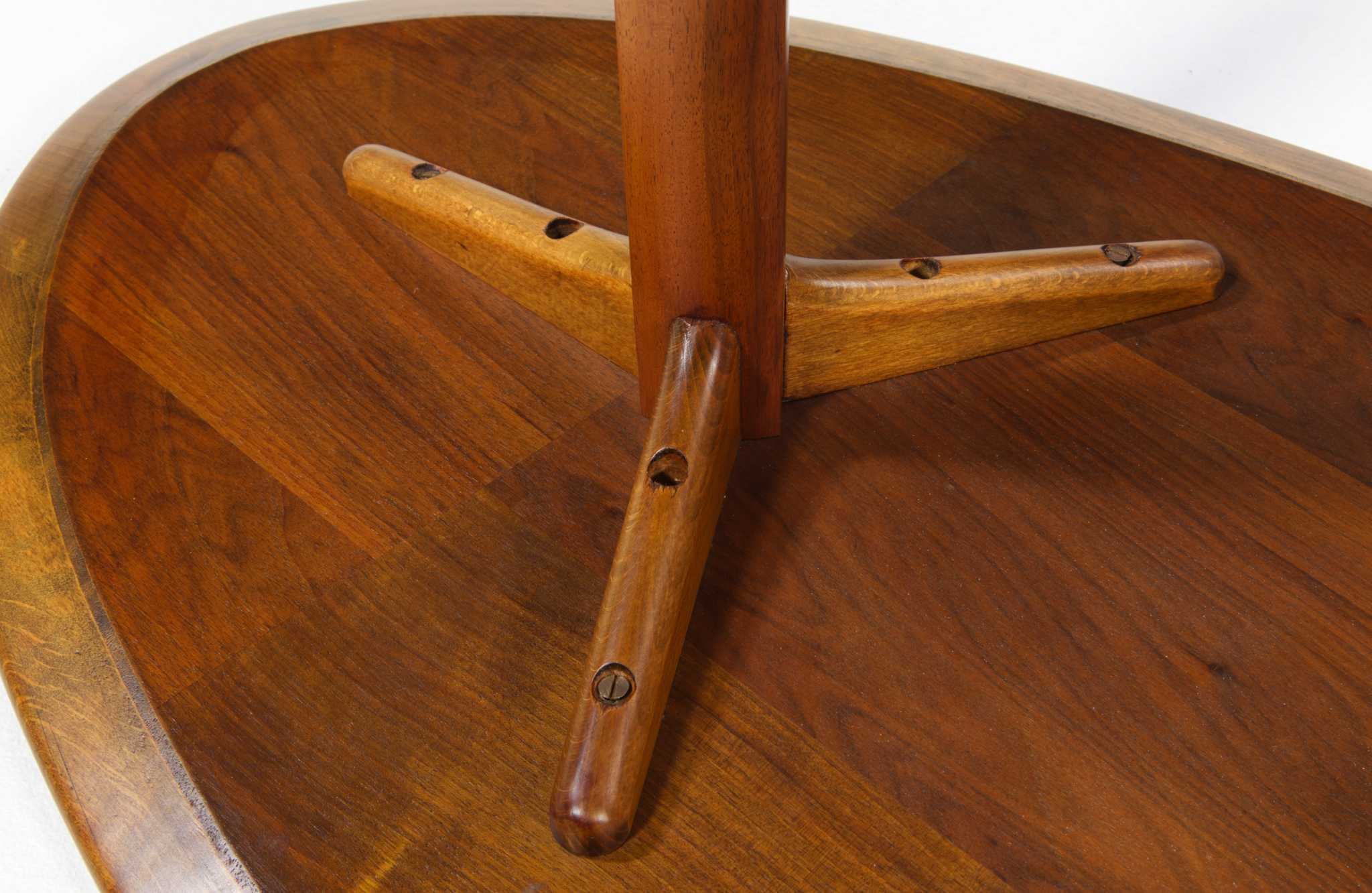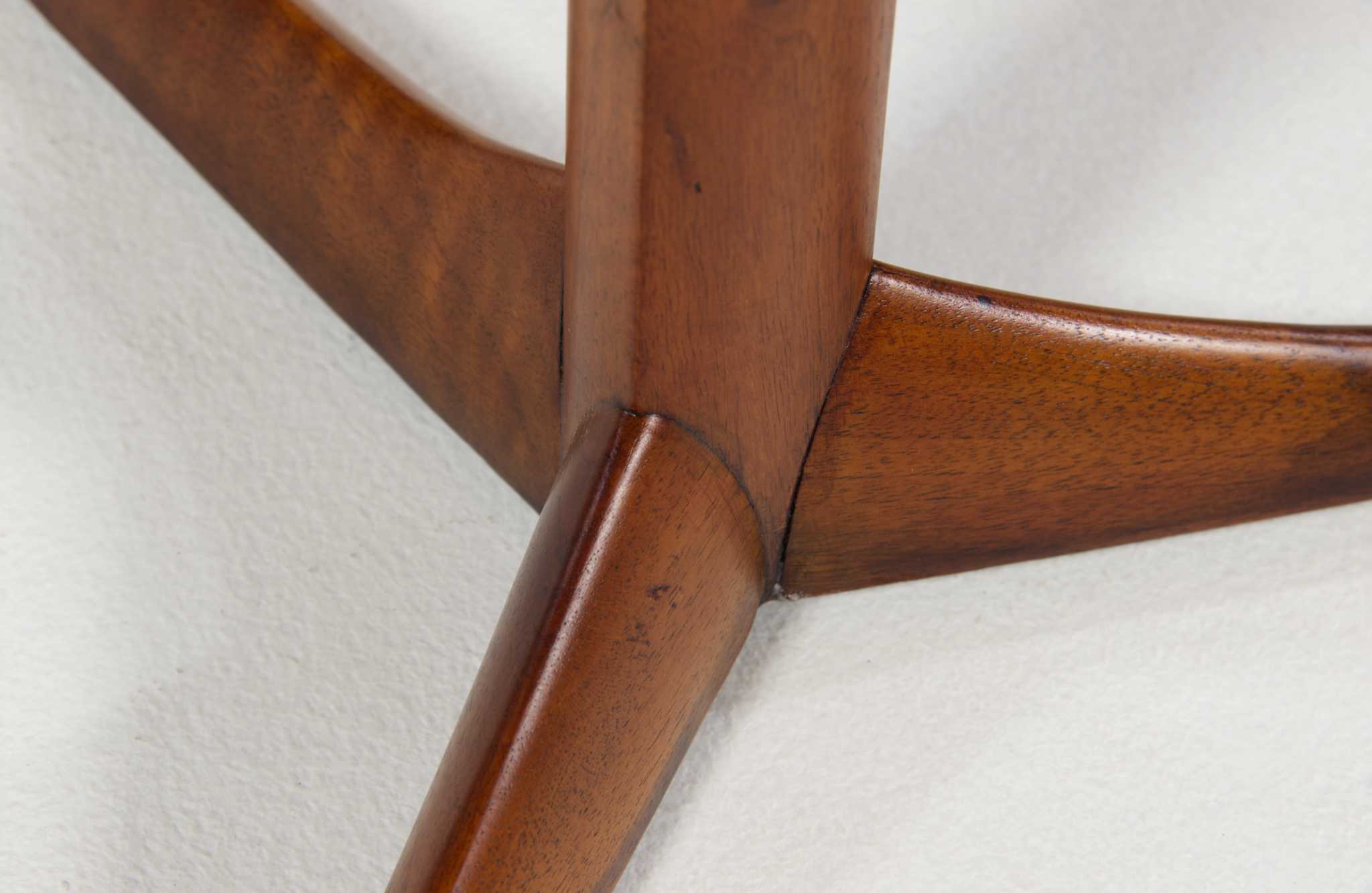 スウェーデンの家具デザイナー、Kerstin Hörlin-Holmquist/カースティン・ホーリン・ホルムクウィストによるコーヒーテーブルです。ウォルナット材で作られたもので、 ”Plommonet/プラム” の名で親しまれ、人気を博したモデルです。細長い楕円を描いた天板と、細く華奢な脚部が特徴のモデルで、小振りで綺麗な佇まいのテーブルです。コンディションにつきまして、本来は僅かに浮いている貫が床に着いておりますが、構造の緩みや反りなどは見られず、不安定感も無く、しっかりとしています。天板に小さな打痕が見られますが、全体的に綺麗な状態です。