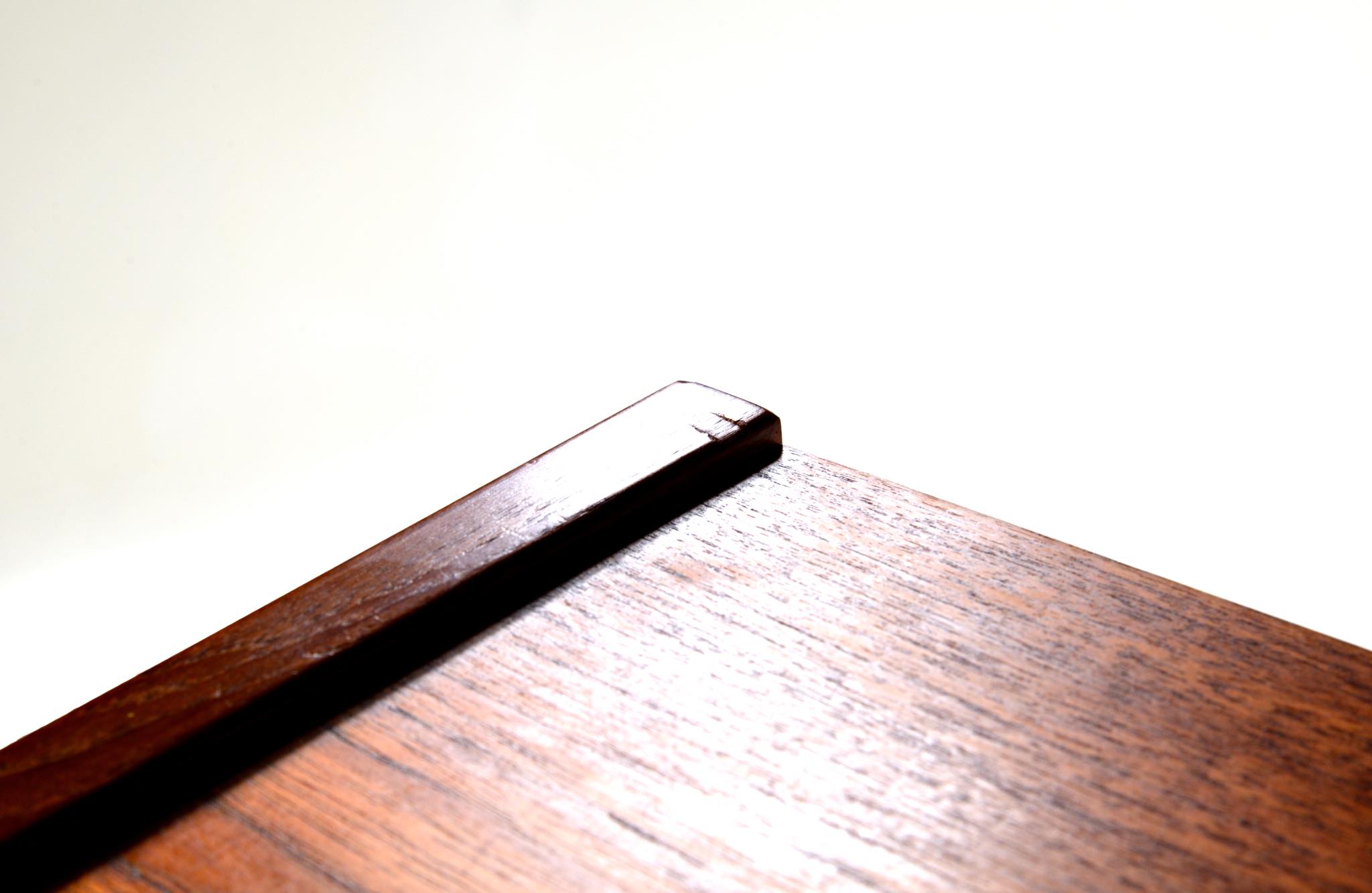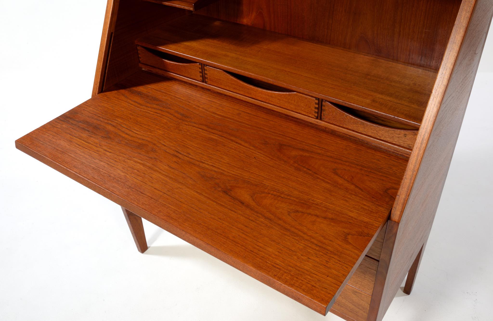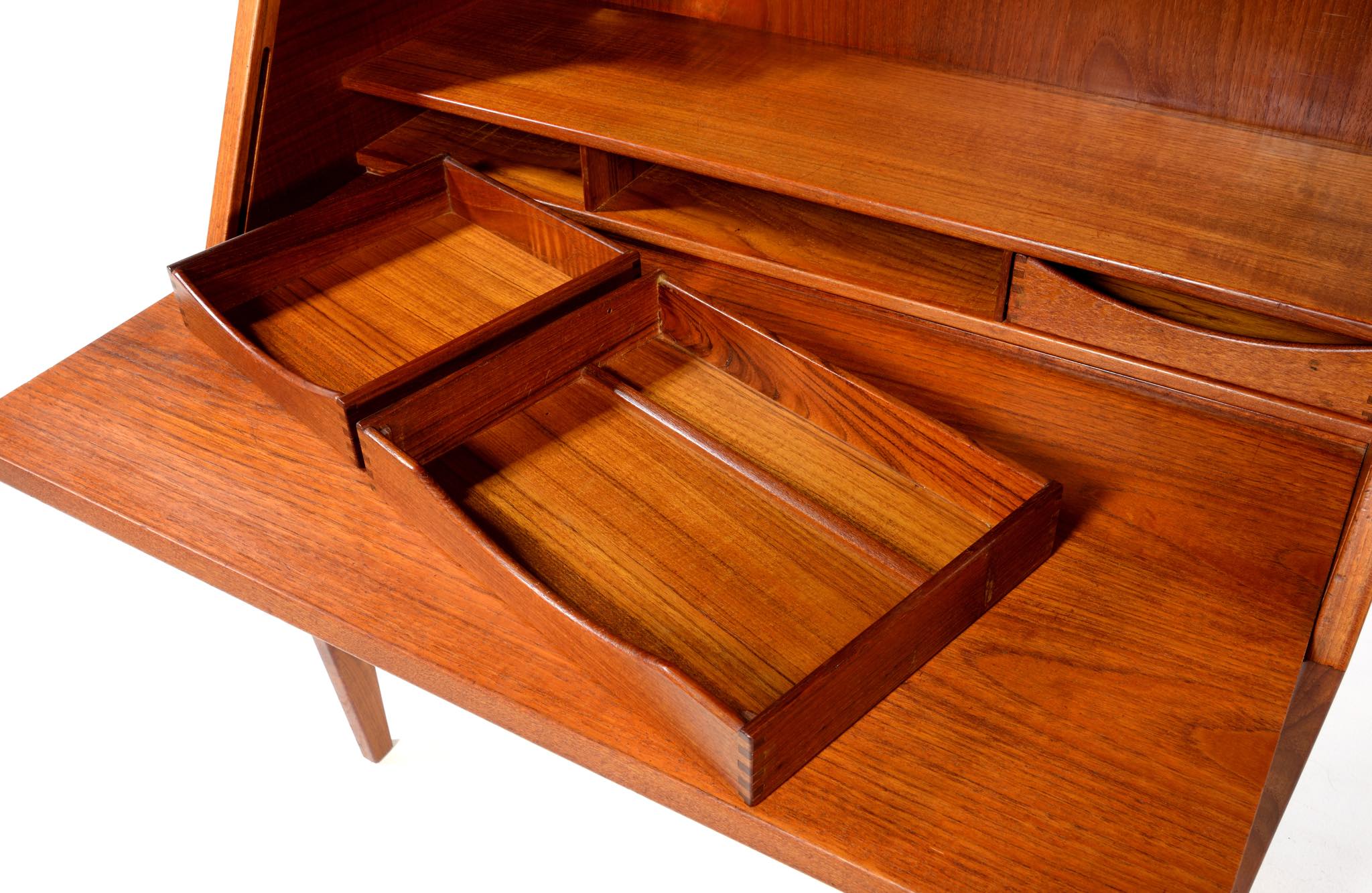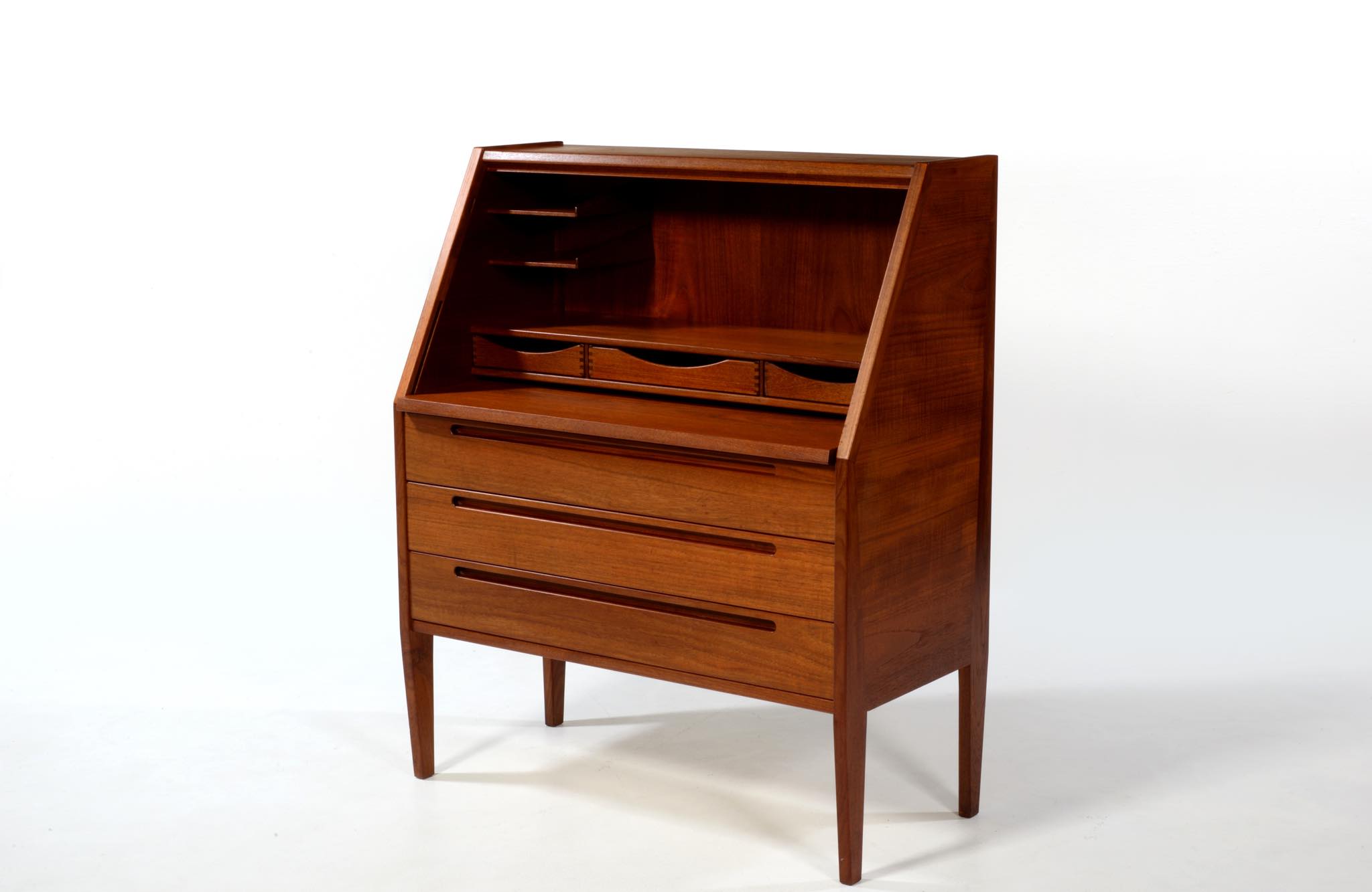 デンマークの家具デザイナー、Kai Kristiansen/カイ・クリスチャンセンによるライティングビューローです。蓋を開くとデスクトップとなり、開いたまま押し込んで仕舞う事ができます。良質なチーク材を用いており、内部のトレイには無垢材を用いるなど、丁寧に作られたものです。扉の鍵は当時のオーダー品と思われます。トップに小傷等見られますが、コンディションは良好です。