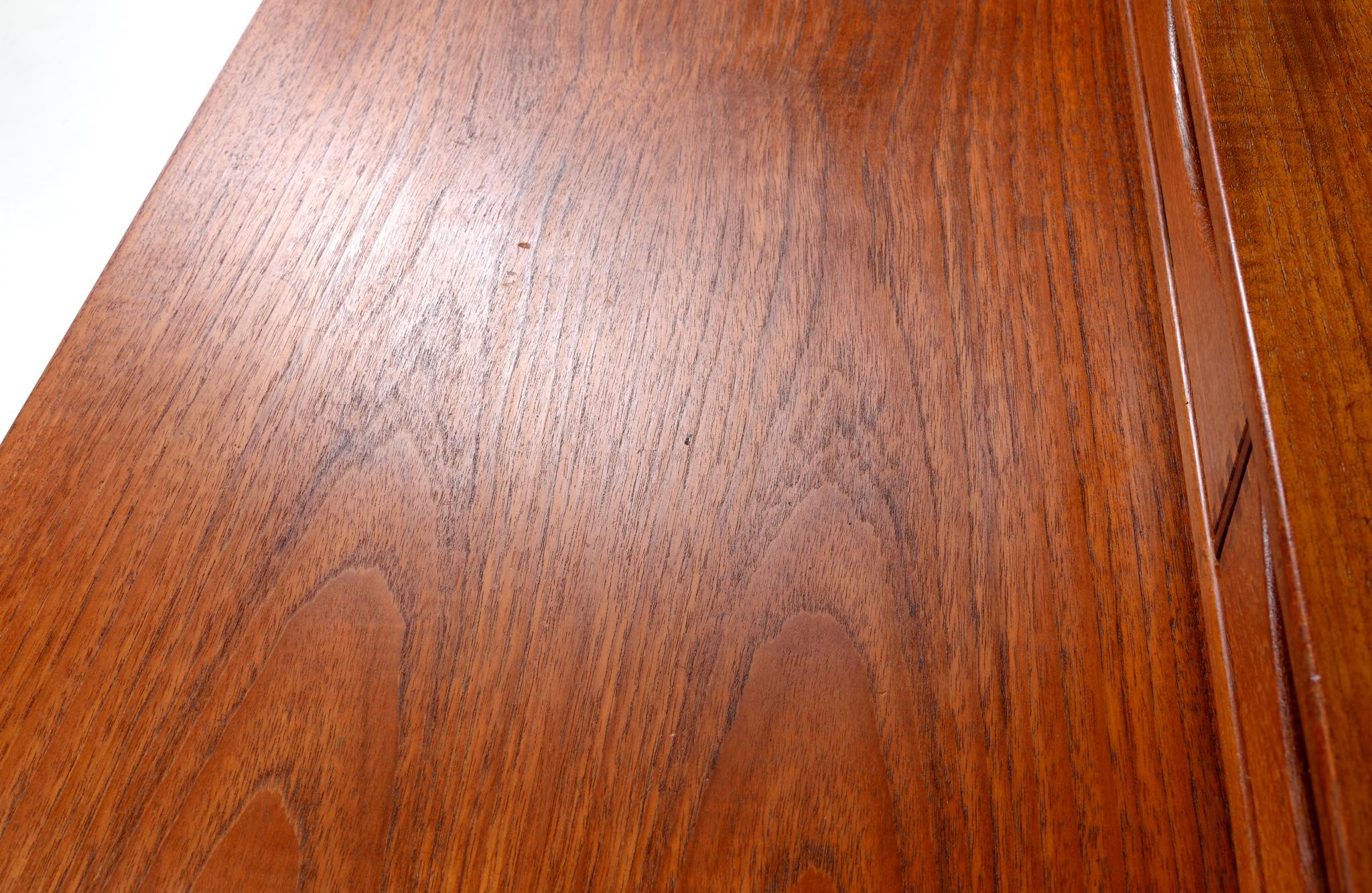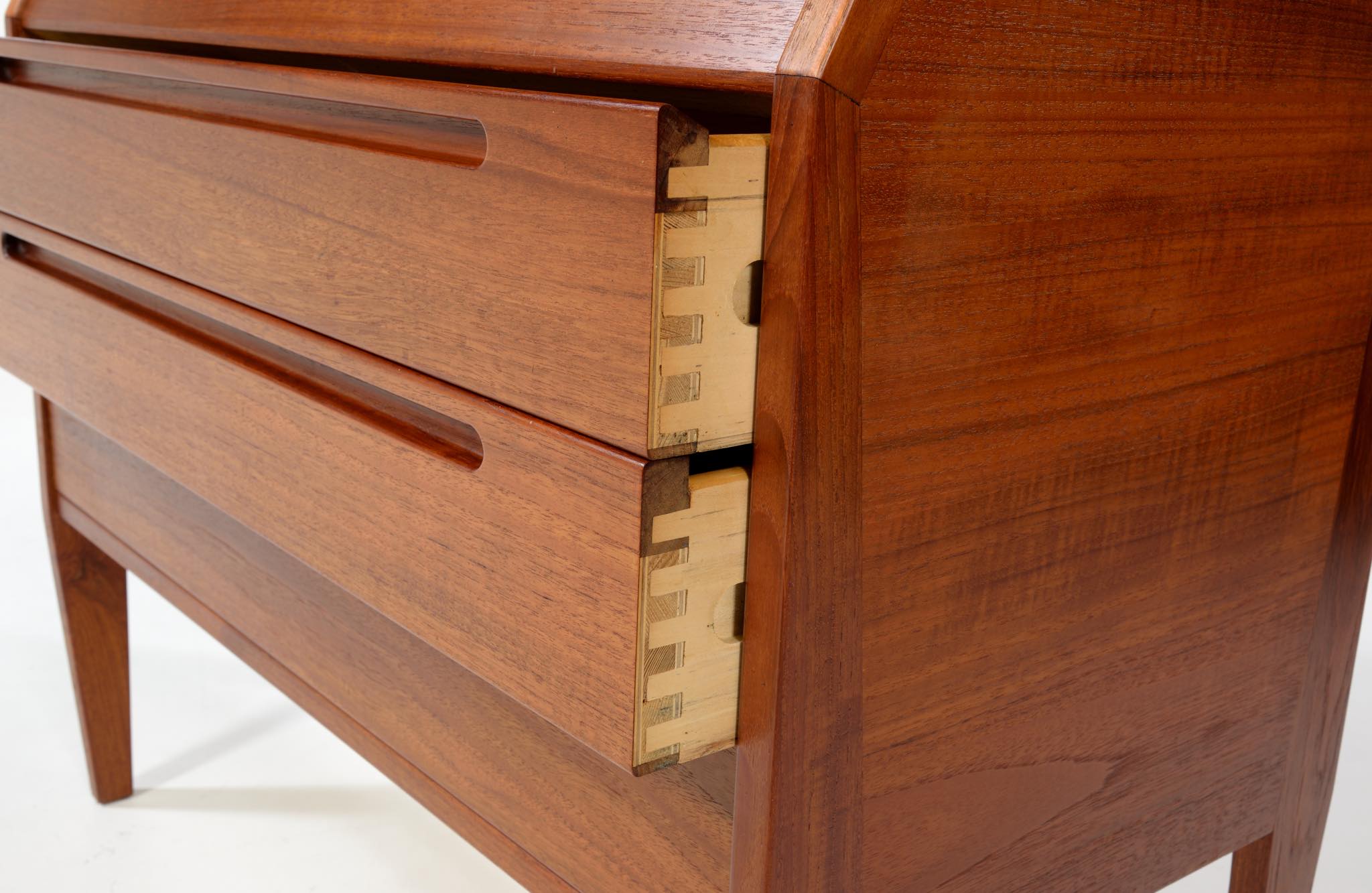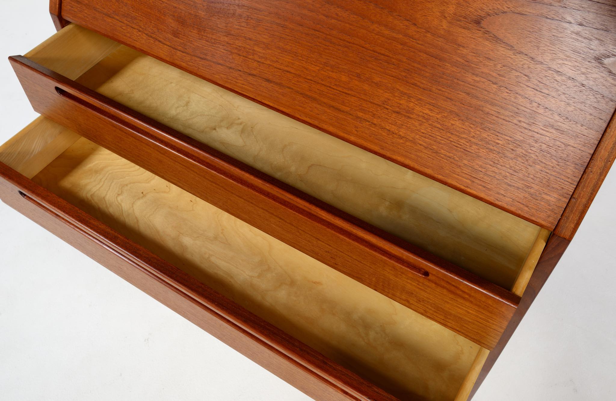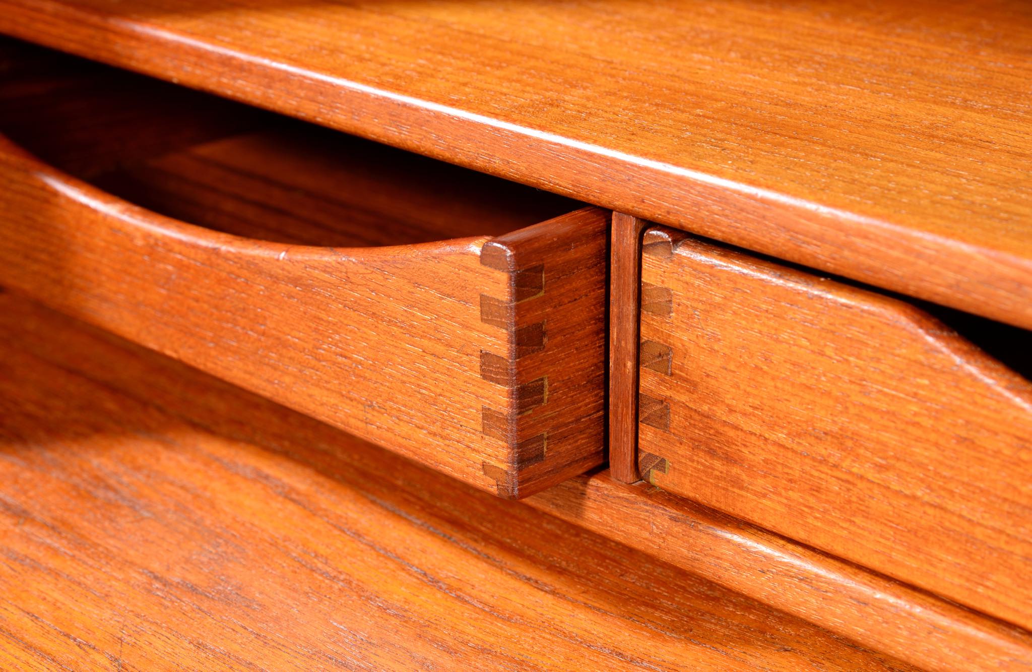 デンマークの家具デザイナー、Kai Kristiansen/カイ・クリスチャンセンによるライティングビューローです。蓋を開くとデスクトップとなり、開いたまま押し込んで仕舞う事ができます。良質なチーク材を用いており、内部のトレイには無垢材を用いるなど、丁寧に作られたものです。扉の鍵は当時のオーダー品と思われます。トップに小傷等見られますが、コンディションは良好です。