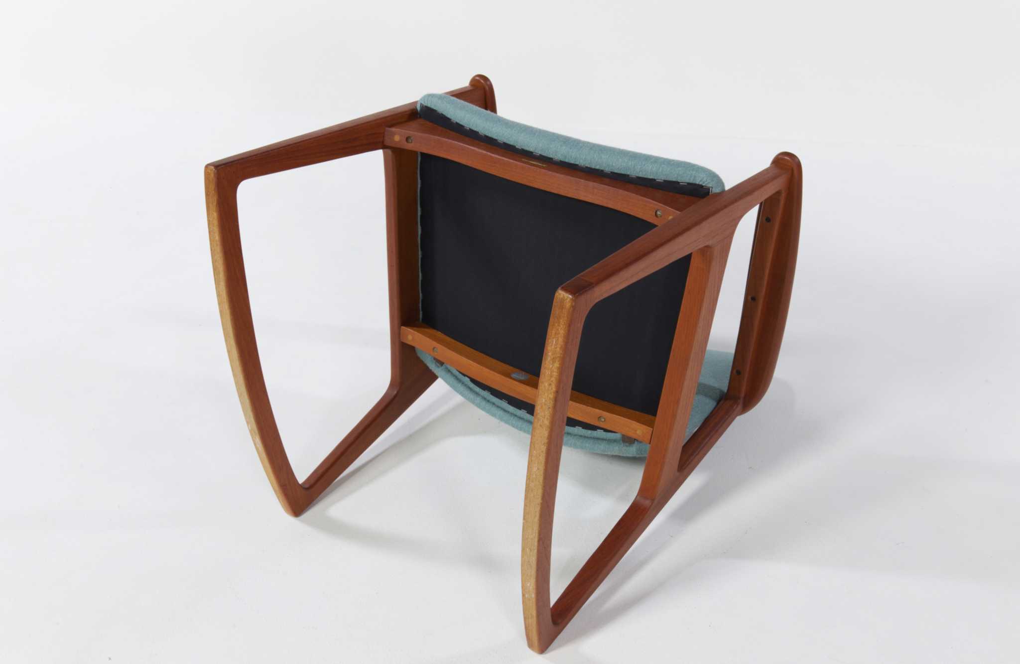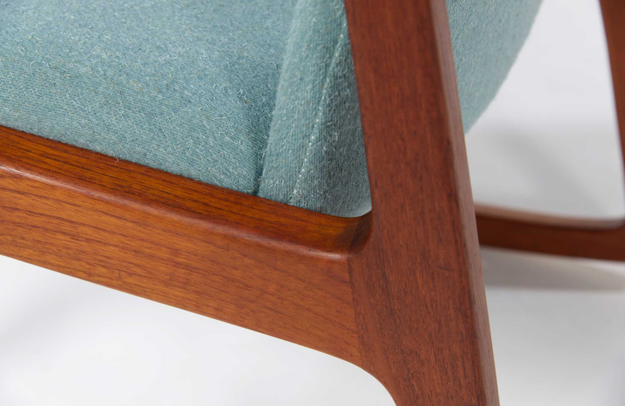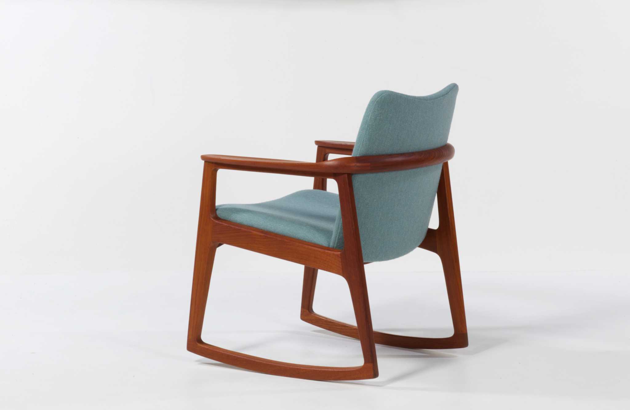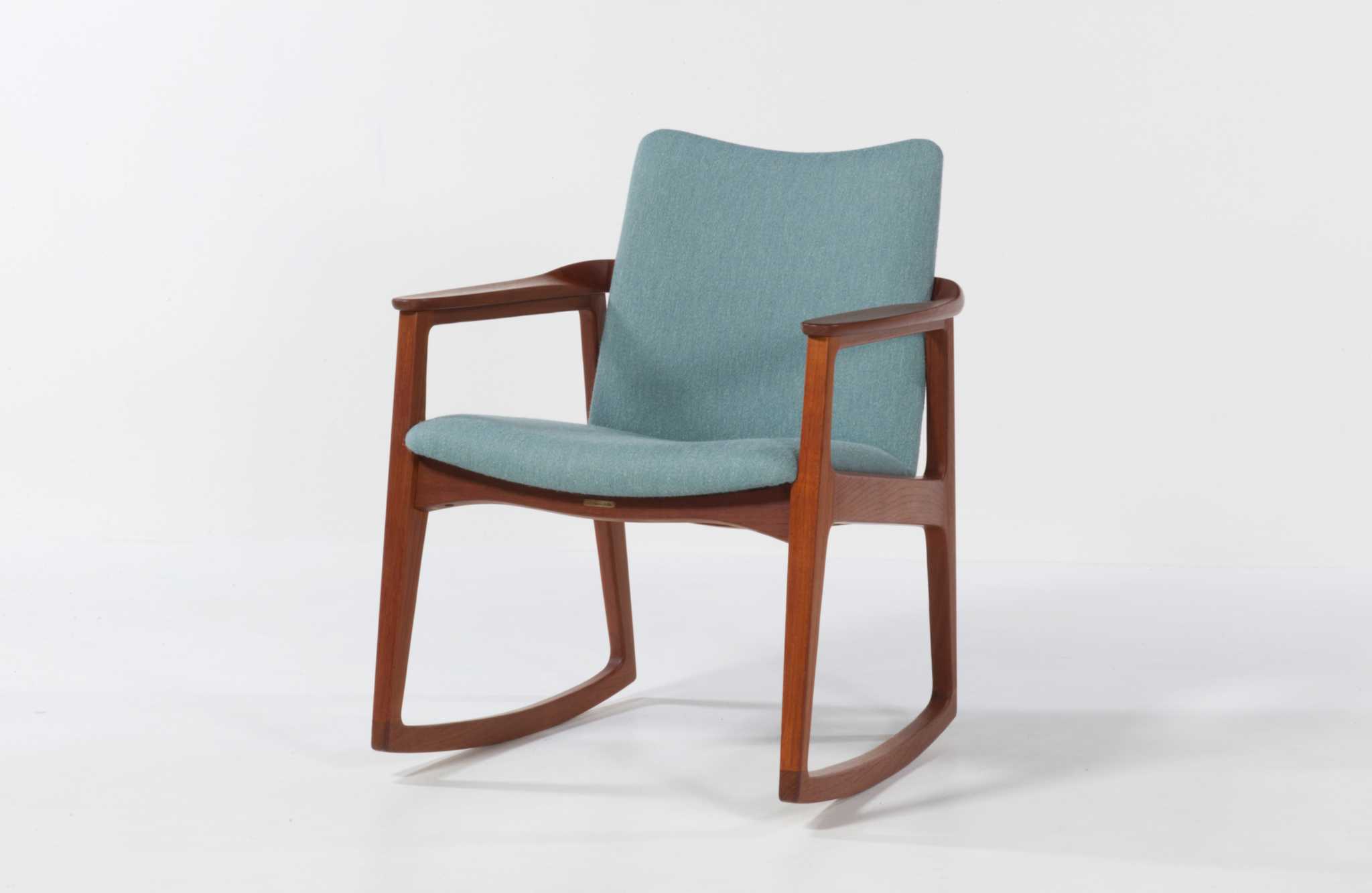 スウェーデンのデザイナー、Sigvard Bernadotte/シグヴァルド・ベルナドッテによるロッキングチェアです。デンマークの家具メーカー、France & Sønにて生産されたもので、他に類を見ないユニークなデザインが特徴です。フレームには良質なチーク材が用いられており、丁寧に作られています。シートはKjellerup社のウール生地を用いて張り替えました。背もたれの一部に補修がありますが、問題なくお使いいただけます。