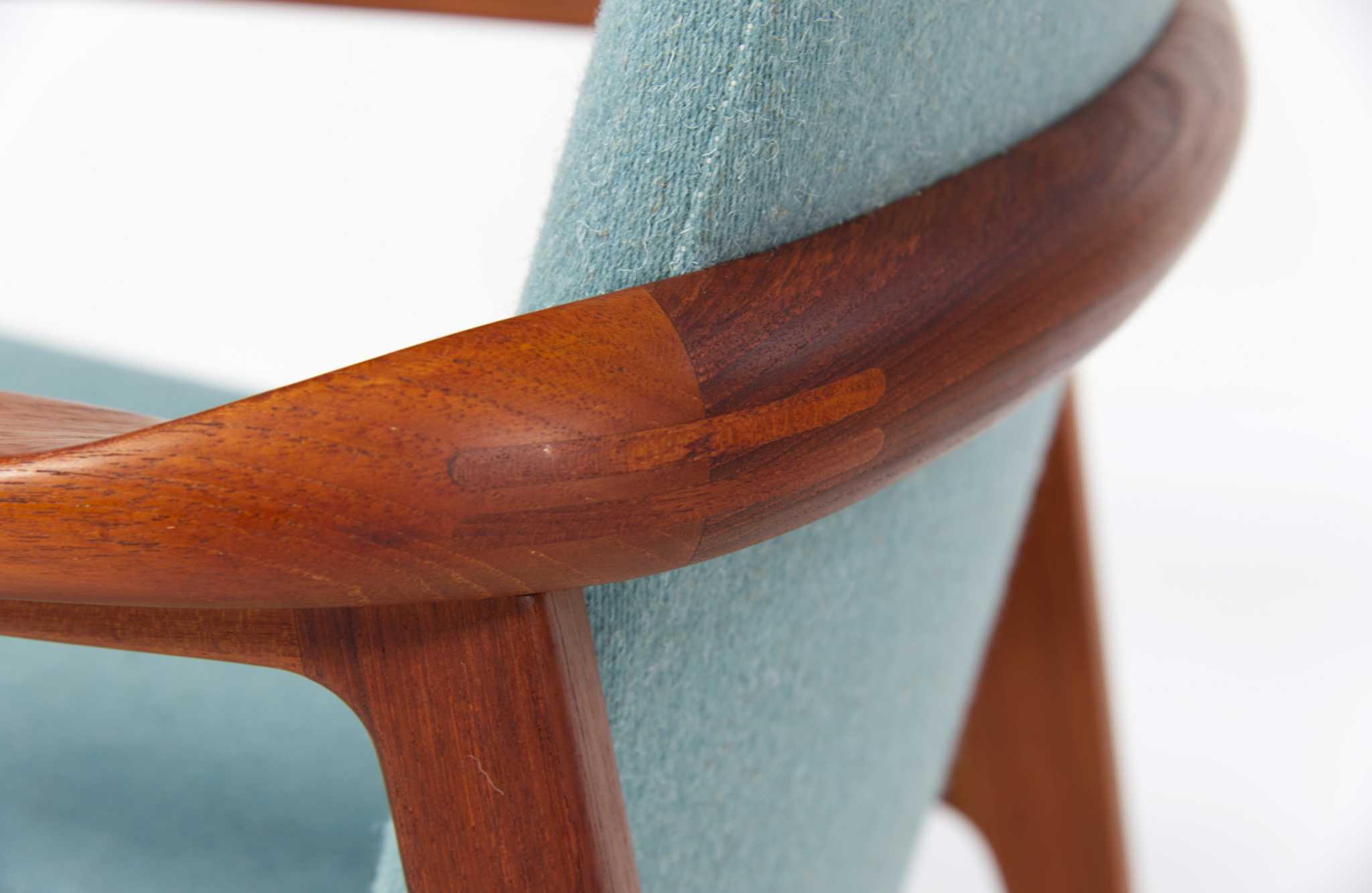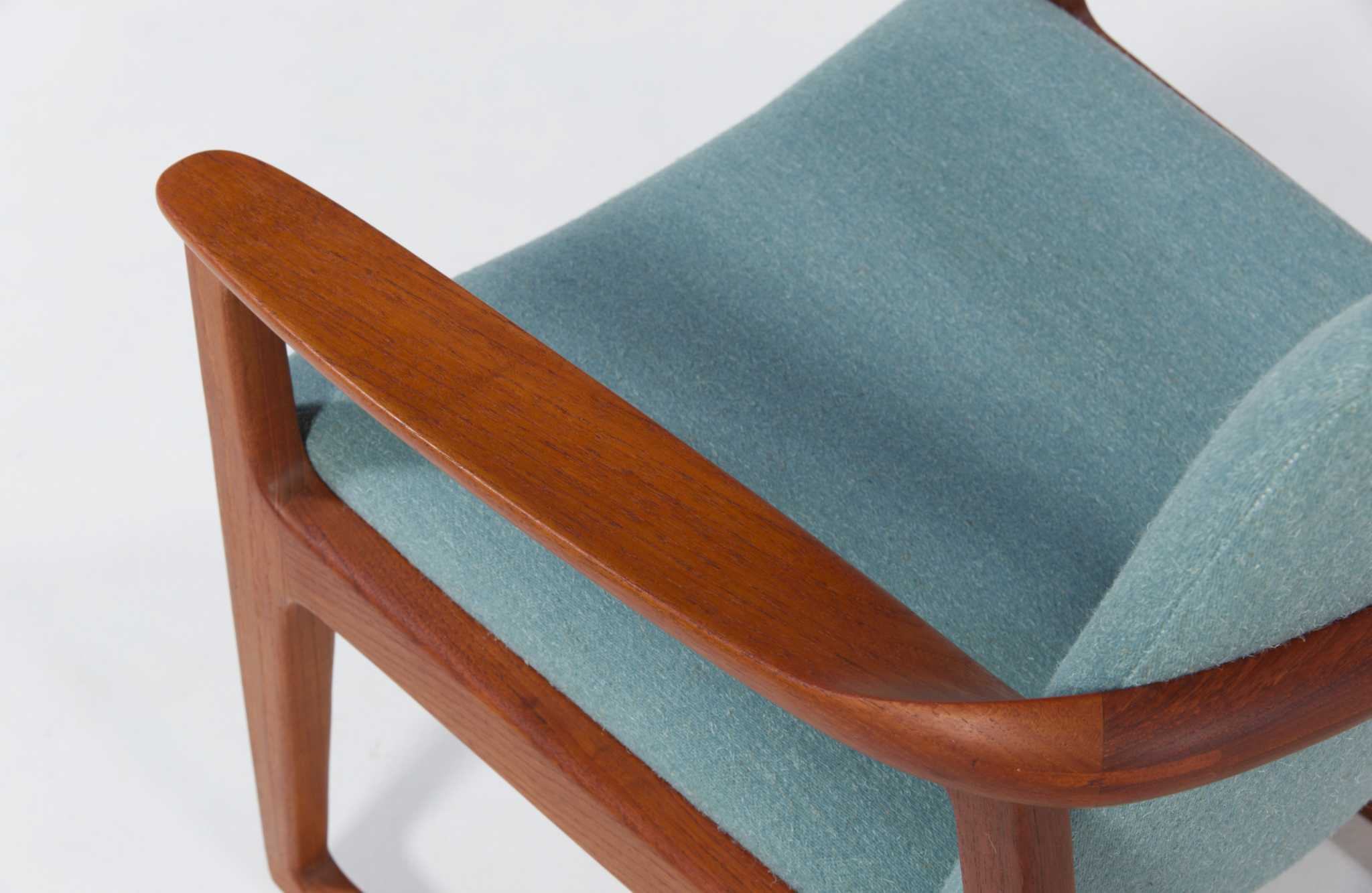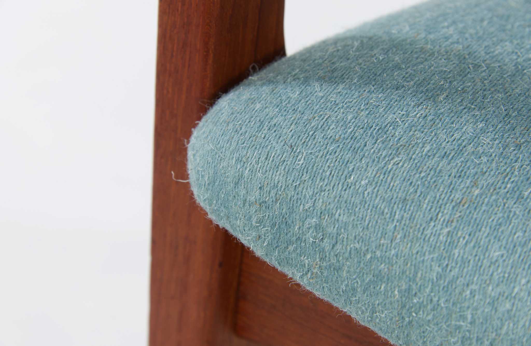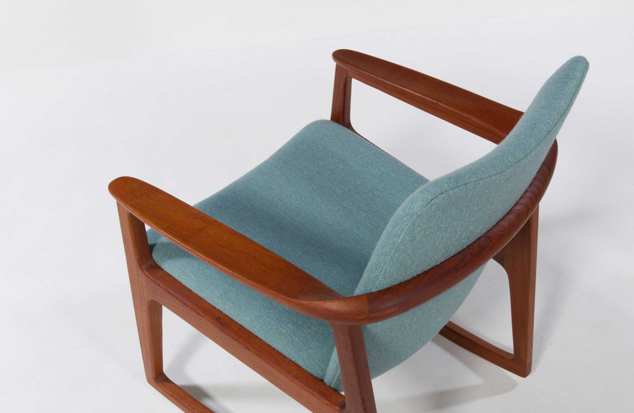 スウェーデンのデザイナー、Sigvard Bernadotte/シグヴァルド・ベルナドッテによるロッキングチェアです。デンマークの家具メーカー、France & Sønにて生産されたもので、他に類を見ないユニークなデザインが特徴です。フレームには良質なチーク材が用いられており、丁寧に作られています。シートはKjellerup社のウール生地を用いて張り替えました。背もたれの一部に補修がありますが、問題なくお使いいただけます。