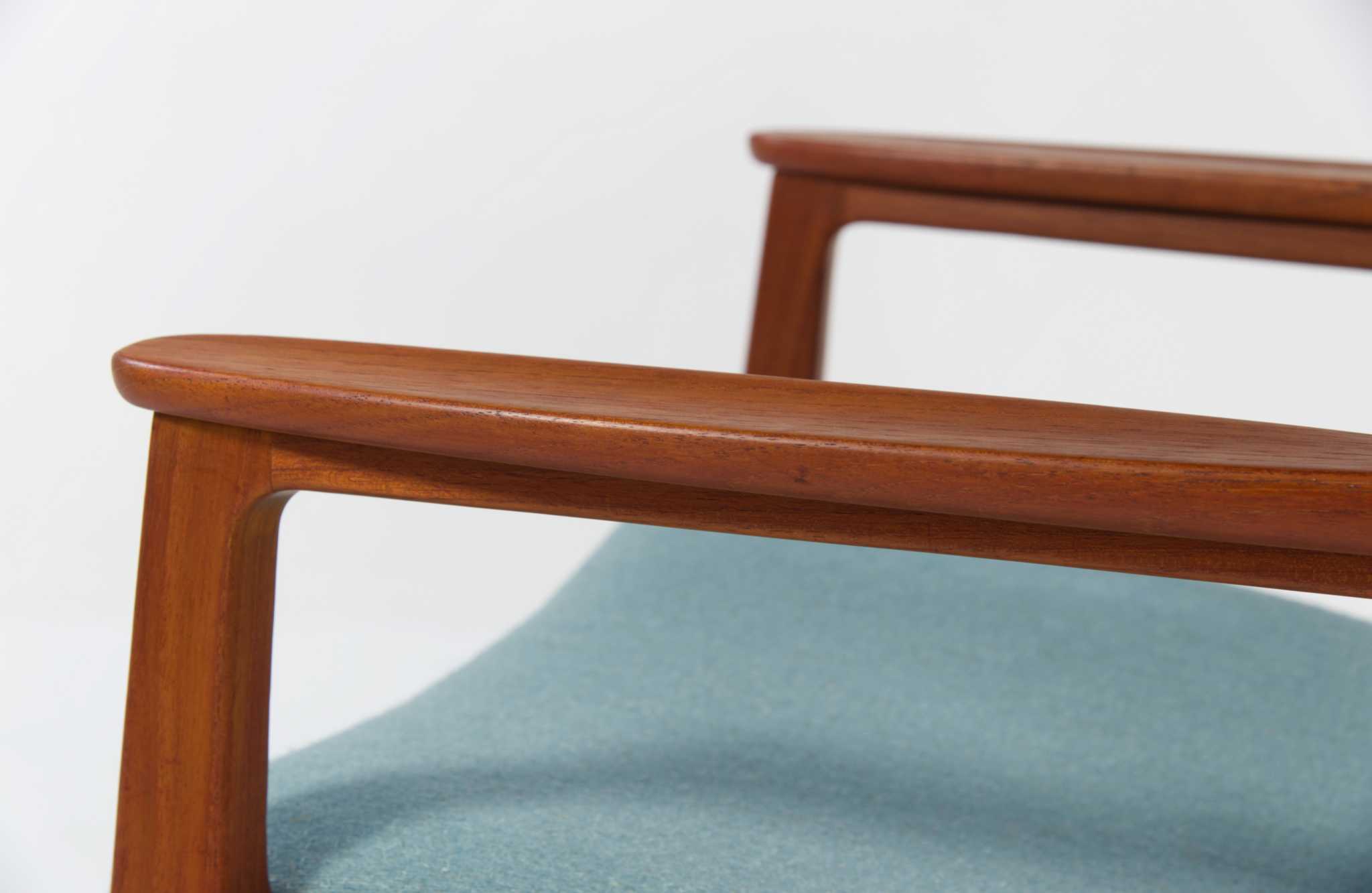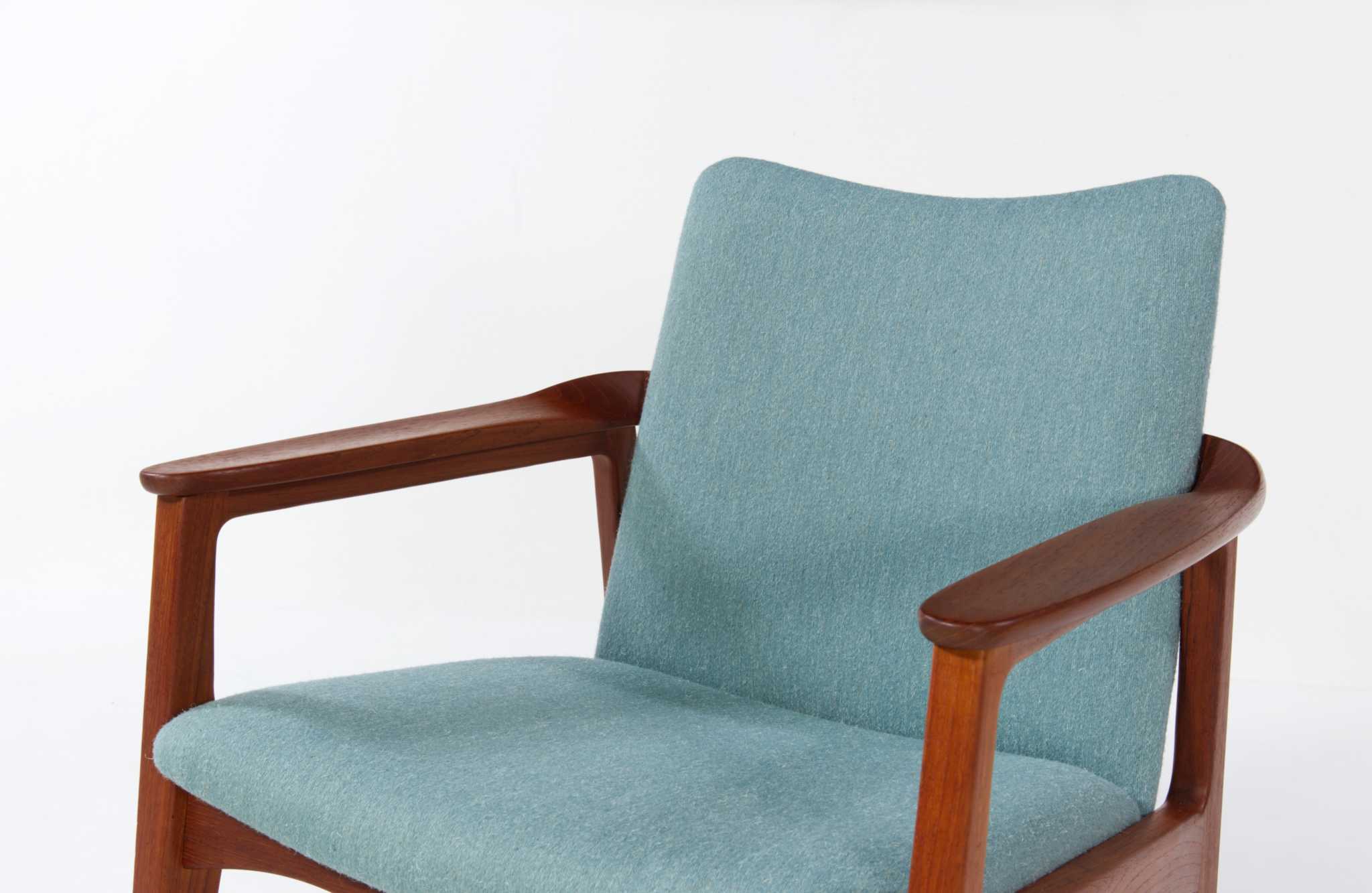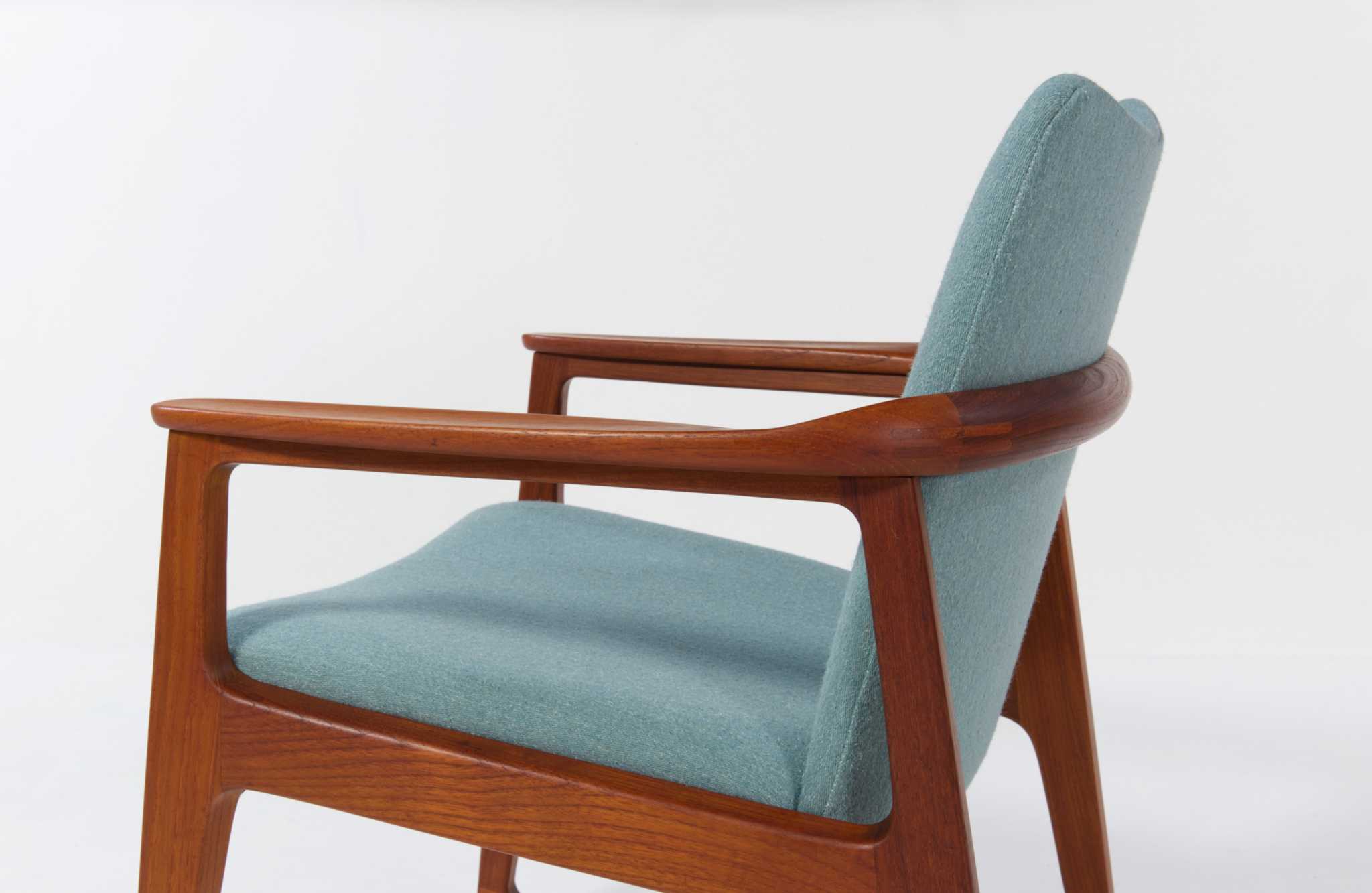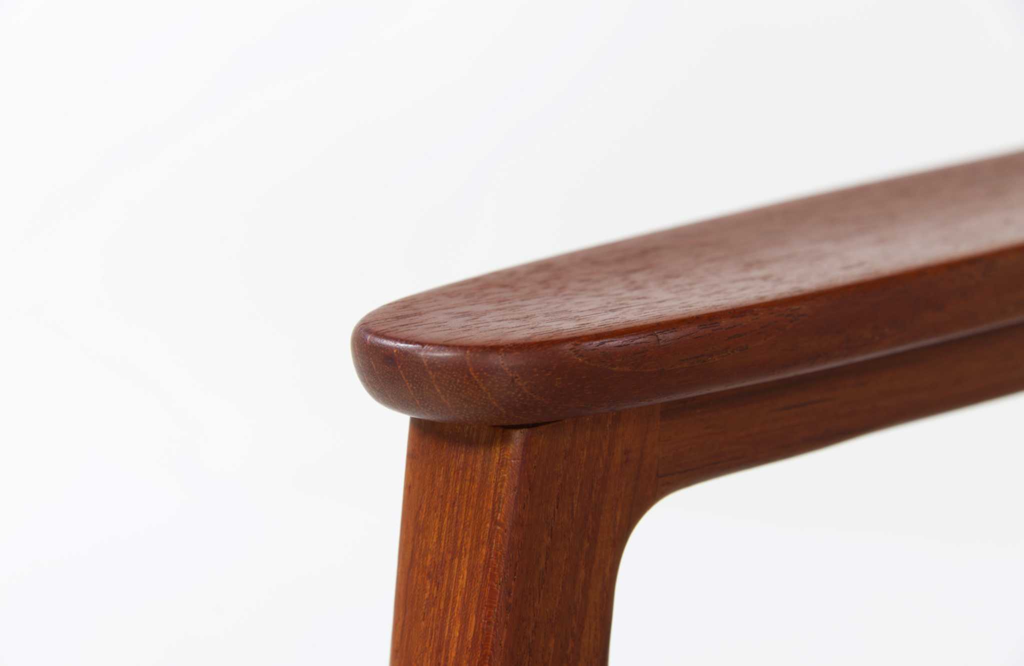 スウェーデンのデザイナー、Sigvard Bernadotte/シグヴァルド・ベルナドッテによるロッキングチェアです。デンマークの家具メーカー、France & Sønにて生産されたもので、他に類を見ないユニークなデザインが特徴です。フレームには良質なチーク材が用いられており、丁寧に作られています。シートはKjellerup社のウール生地を用いて張り替えました。背もたれの一部に補修がありますが、問題なくお使いいただけます。