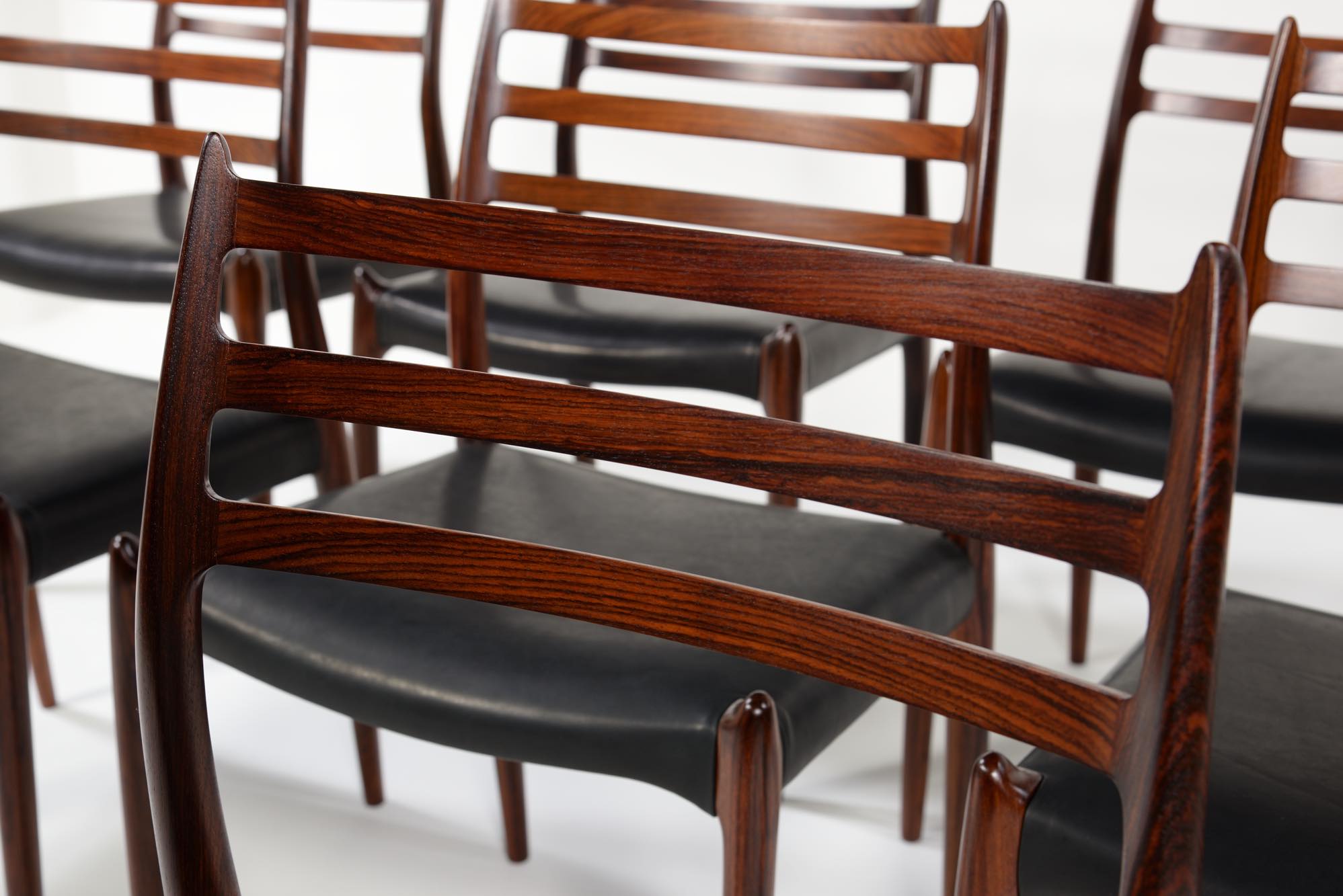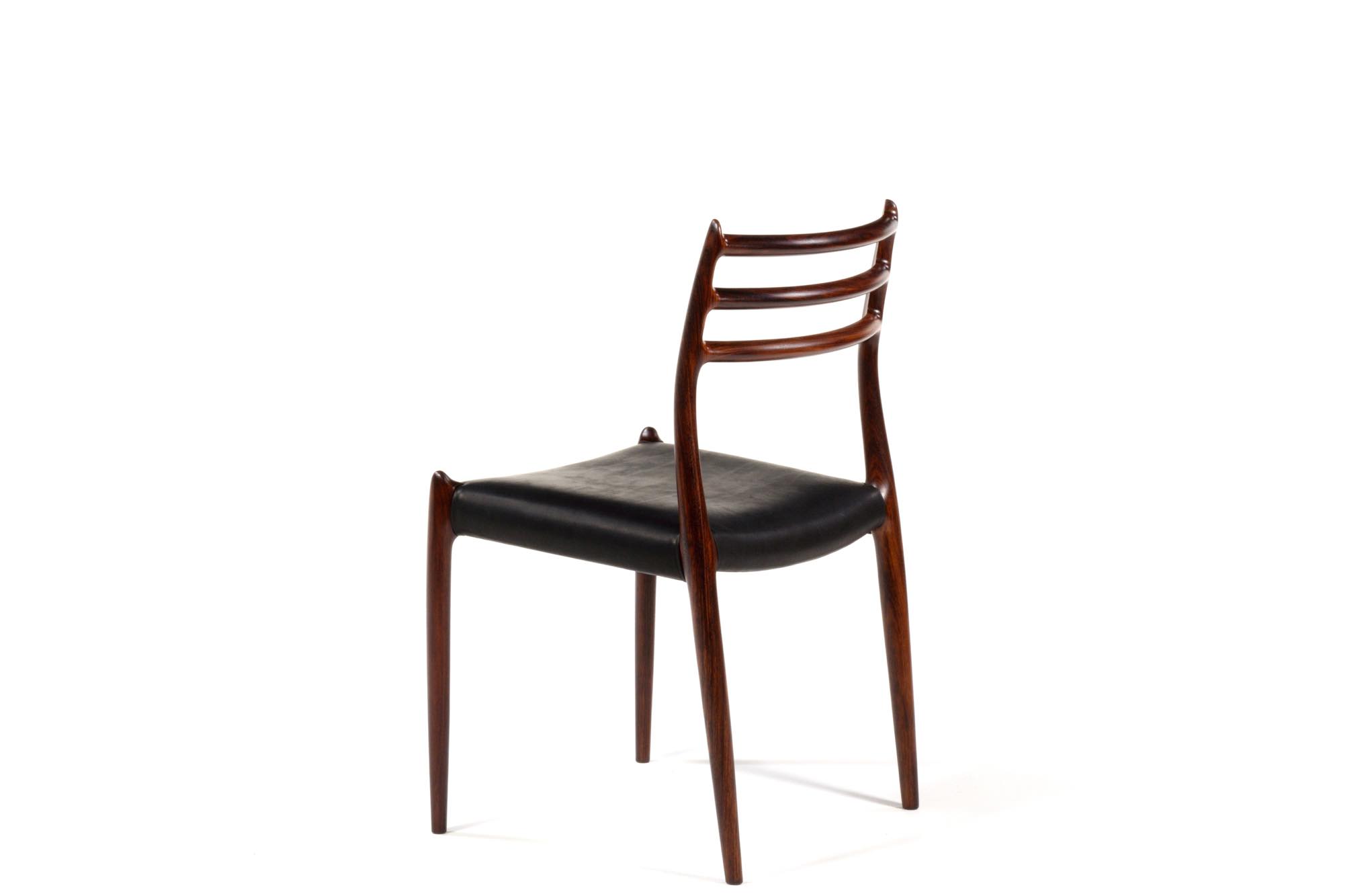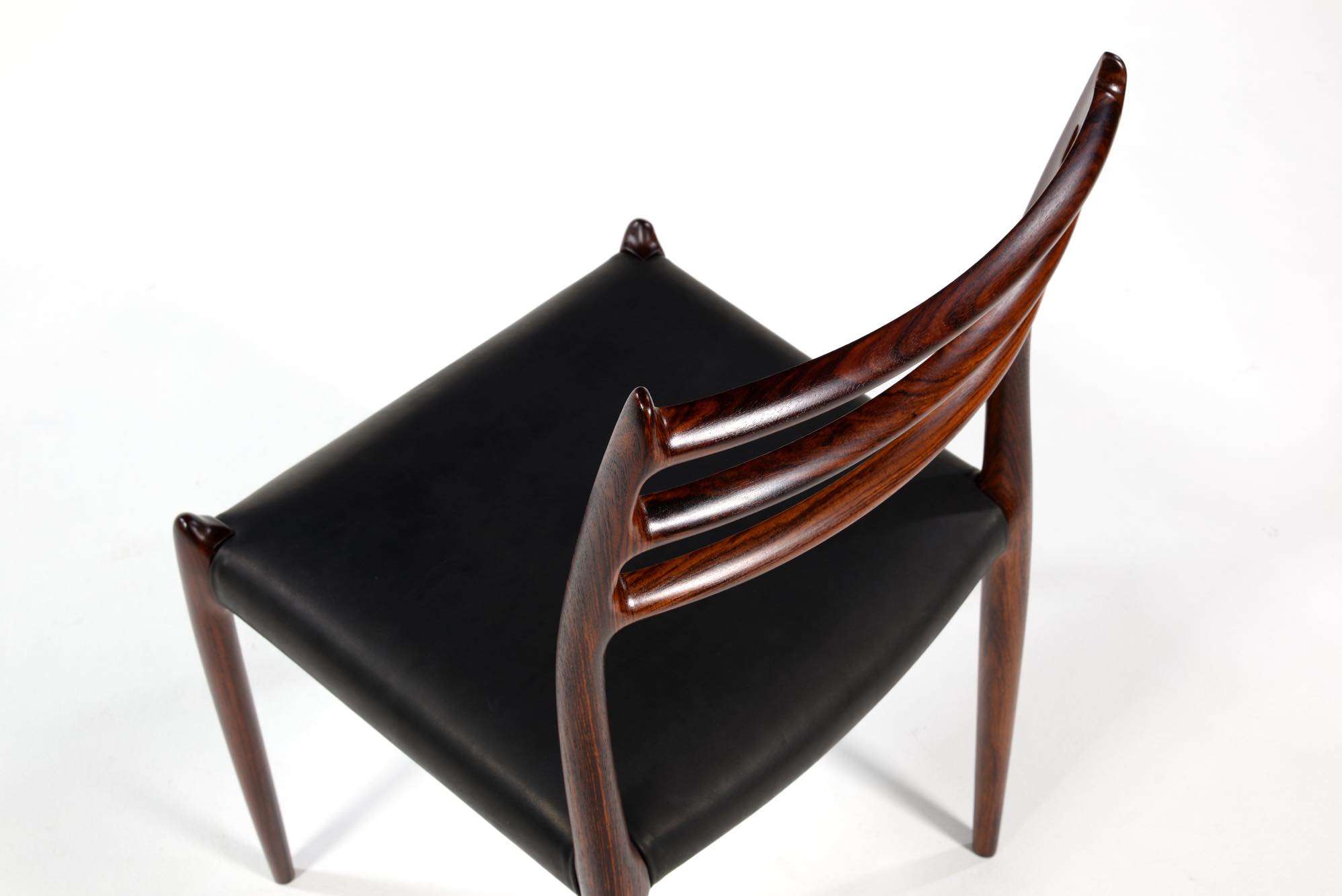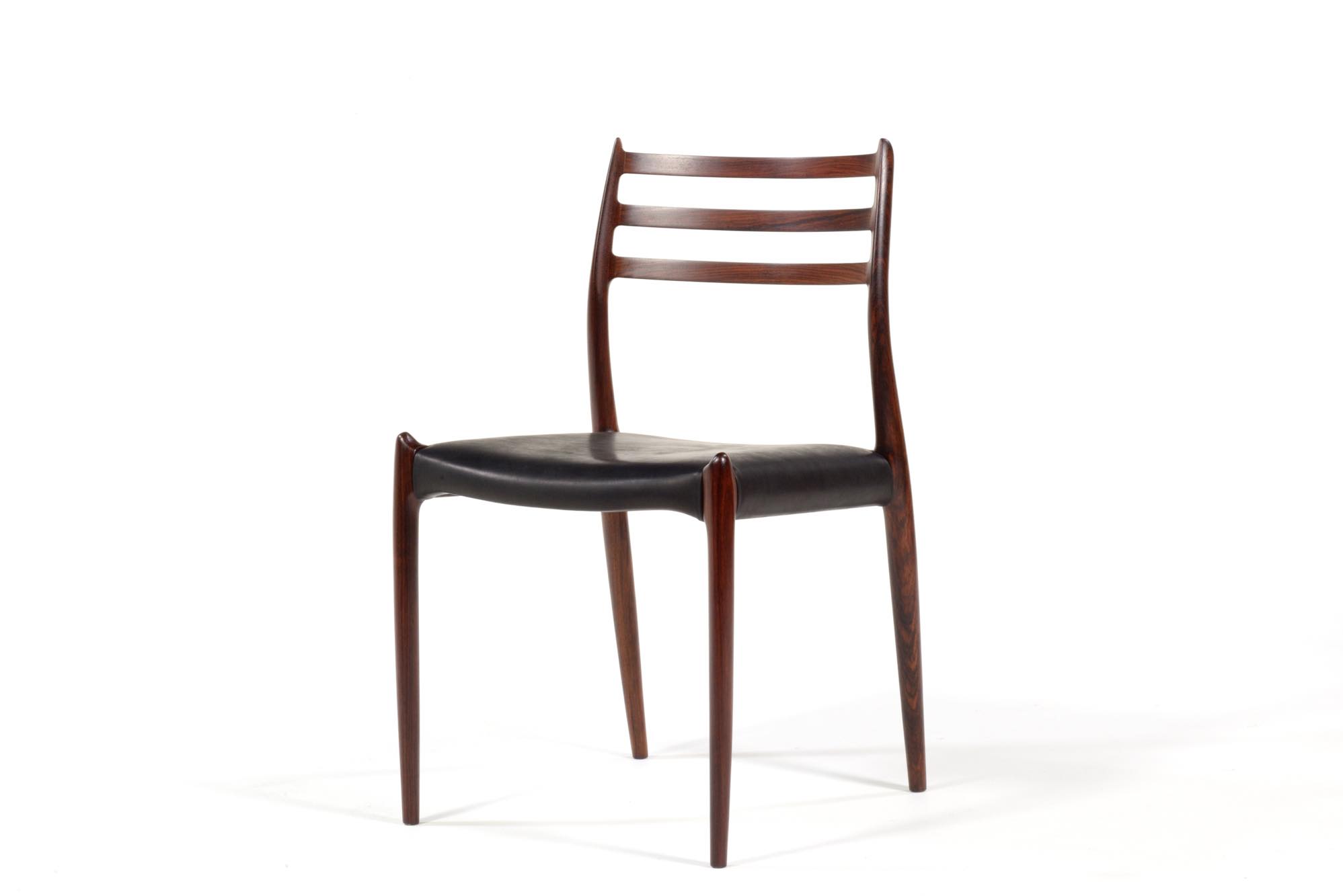 デンマークの家具工房、J.L.Møller/J.L.モラーによるダイニングチェア "Model 78" です。創業者のN.O. Moller/ニルス・オット・モラーによってデザインされたモデルで、こちらは1960年代頃に作られたヴィンテージ品です。笠木と尖ったツノに特徴のあるモデルで、ダイニングはもちろん、レストランや、日本国内では割烹店で使われている事例が多くあります。良質なローズウッドが用いられており、綺麗な木目文様が現れています。座面はデンマークのCAMO leather社による良質な黒皮革にて張り替えを行いました。こちらは単体での販売となり、在庫数は価格の下段に記しております。