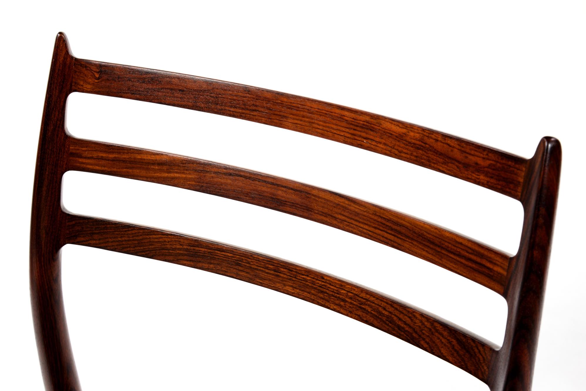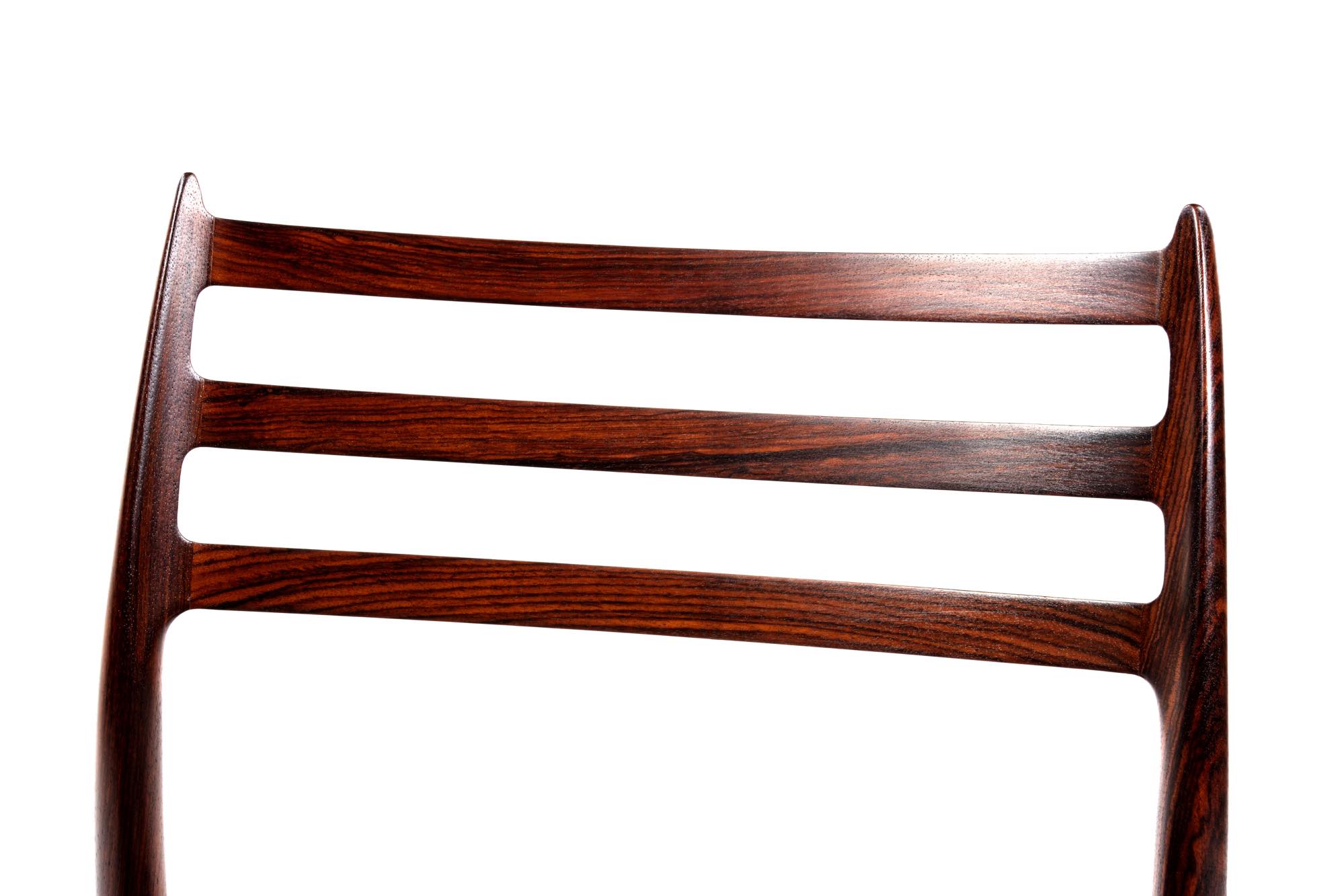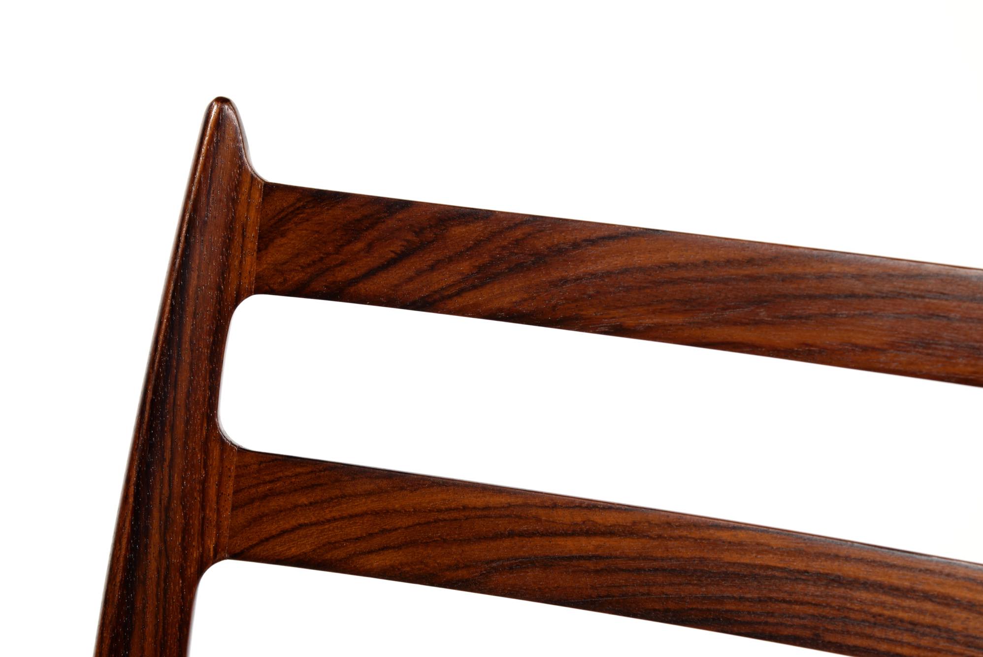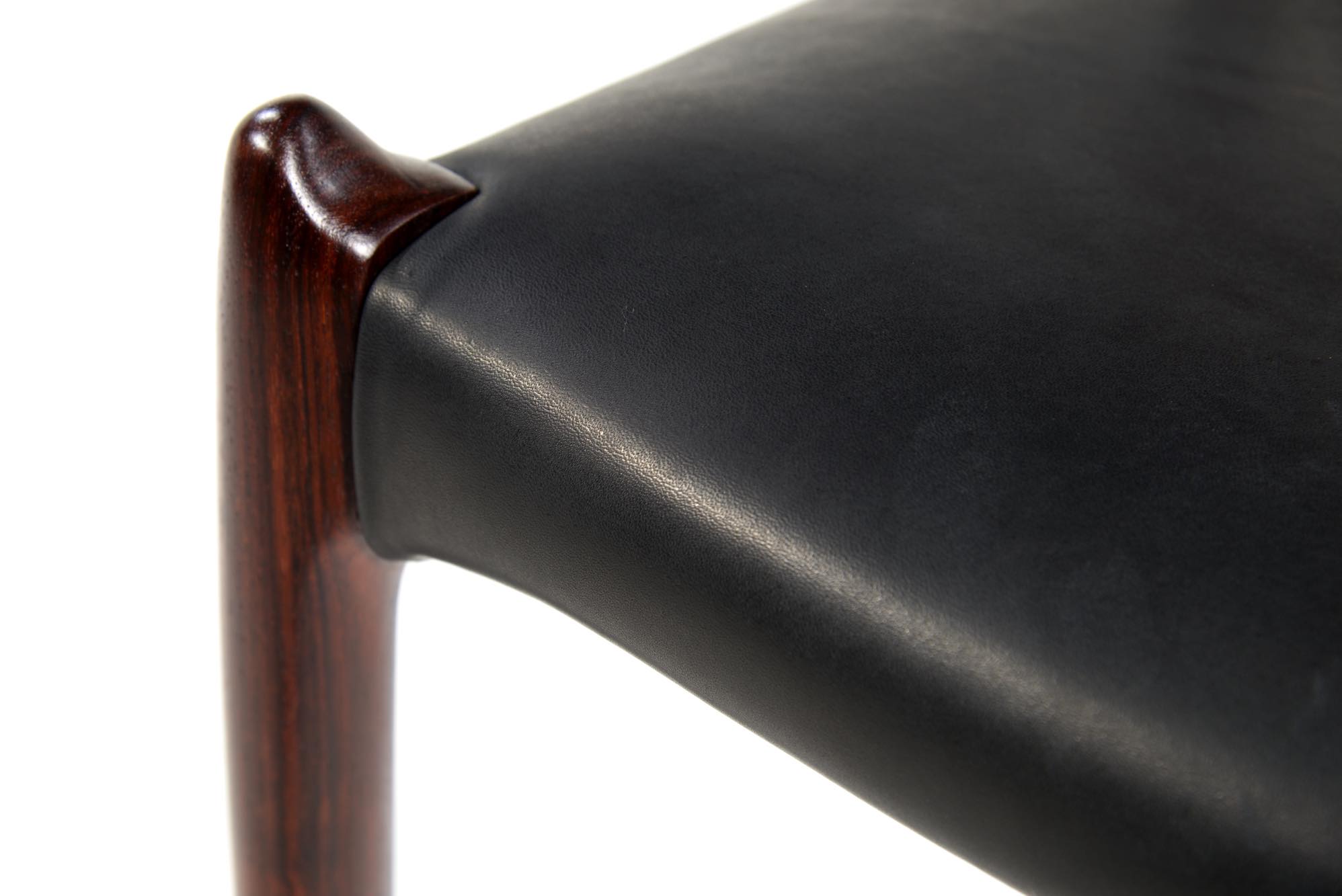 デンマークの家具工房、J.L.Møller/J.L.モラーによるダイニングチェア "Model 78" です。創業者のN.O. Moller/ニルス・オット・モラーによってデザインされたモデルで、こちらは1960年代頃に作られたヴィンテージ品です。笠木と尖ったツノに特徴のあるモデルで、ダイニングはもちろん、レストランや、日本国内では割烹店で使われている事例が多くあります。良質なローズウッドが用いられており、綺麗な木目文様が現れています。座面はデンマークのCAMO leather社による良質な黒皮革にて張り替えを行いました。こちらは単体での販売となり、在庫数は価格の下段に記しております。