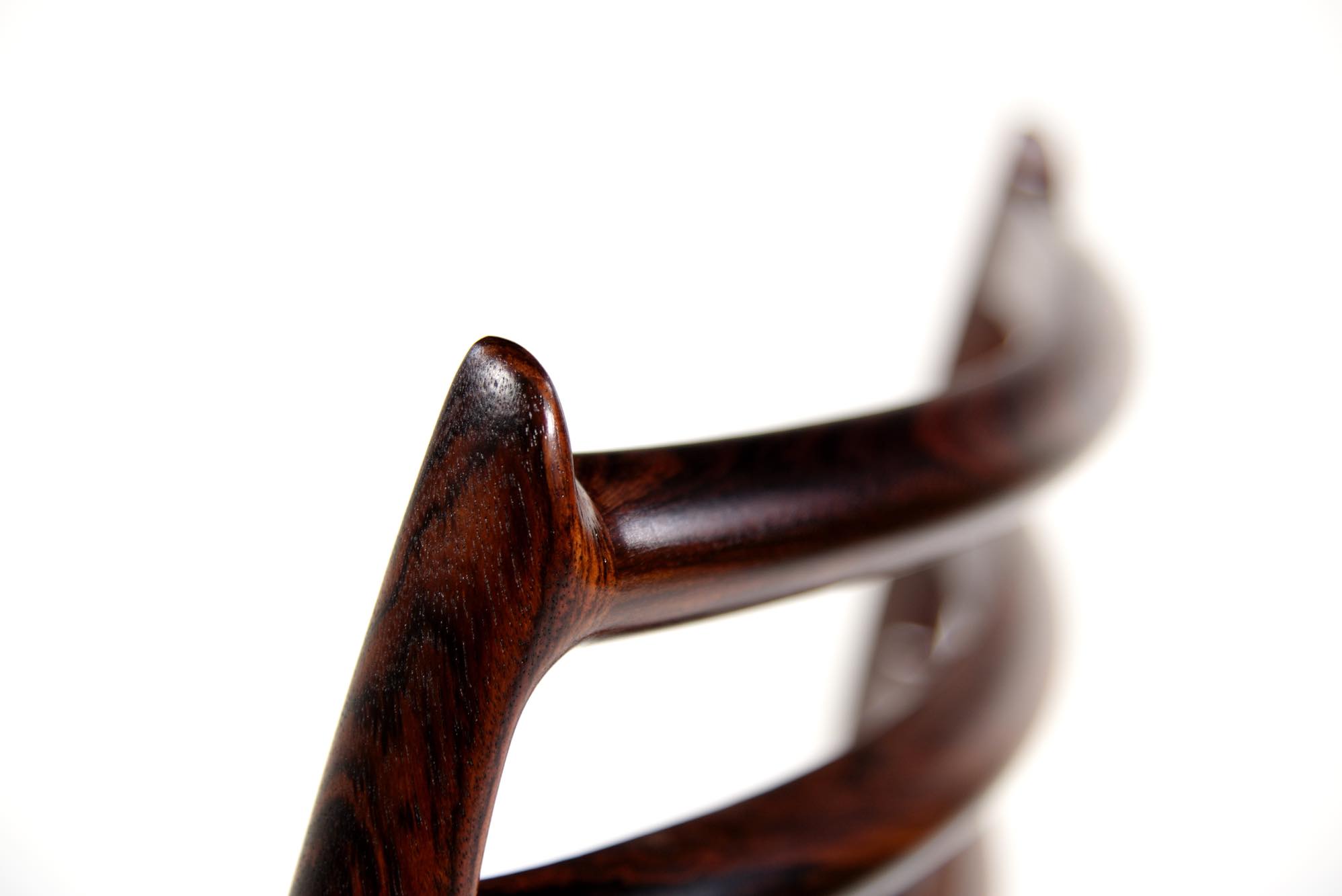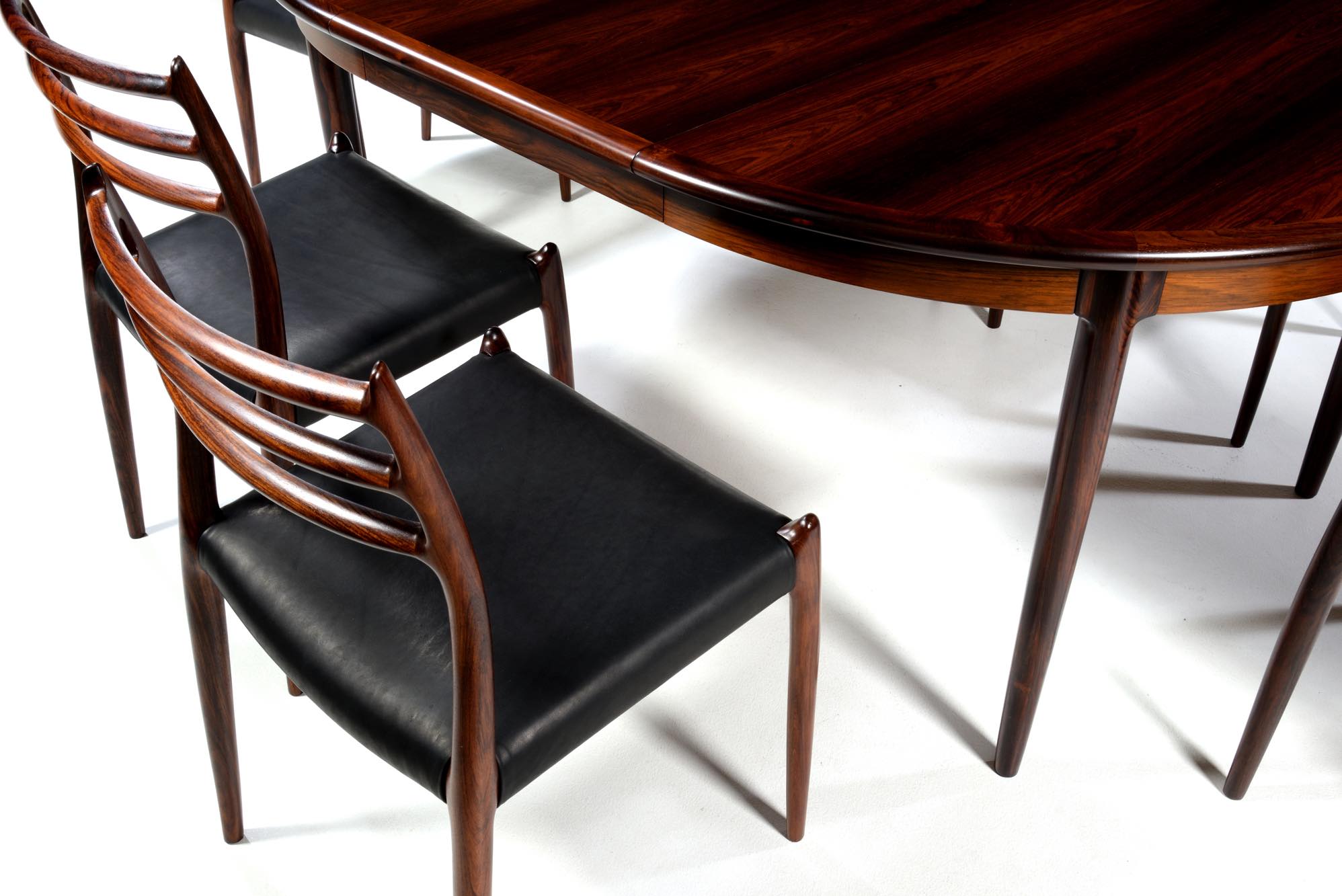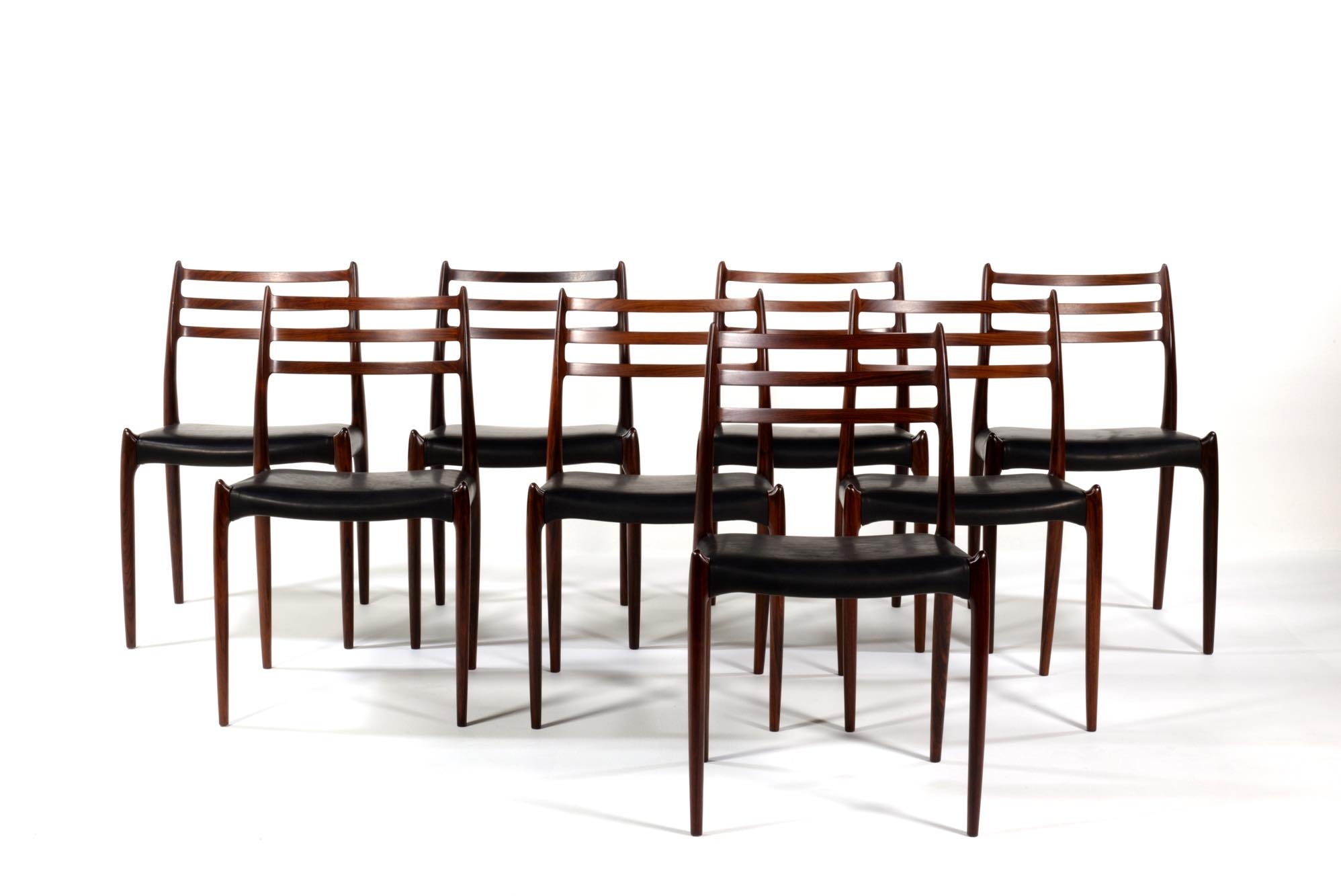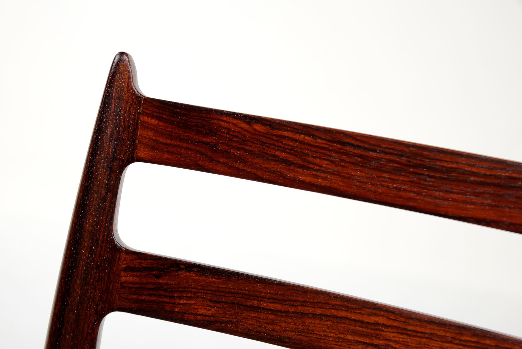 デンマークの家具工房、J.L.Møller/J.L.モラーによるダイニングチェア "Model 78" です。創業者のN.O. Moller/ニルス・オット・モラーによってデザインされたモデルで、こちらは1960年代頃に作られたヴィンテージ品です。笠木と尖ったツノに特徴のあるモデルで、ダイニングはもちろん、レストランや、日本国内では割烹店で使われている事例が多くあります。良質なローズウッドが用いられており、綺麗な木目文様が現れています。座面はデンマークのCAMO leather社による良質な黒皮革にて張り替えを行いました。こちらは単体での販売となり、在庫数は価格の下段に記しております。