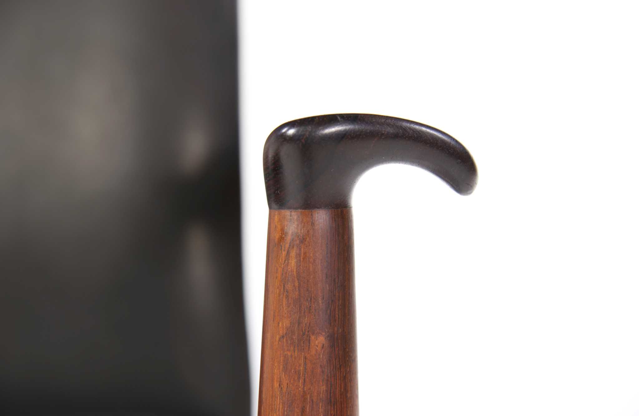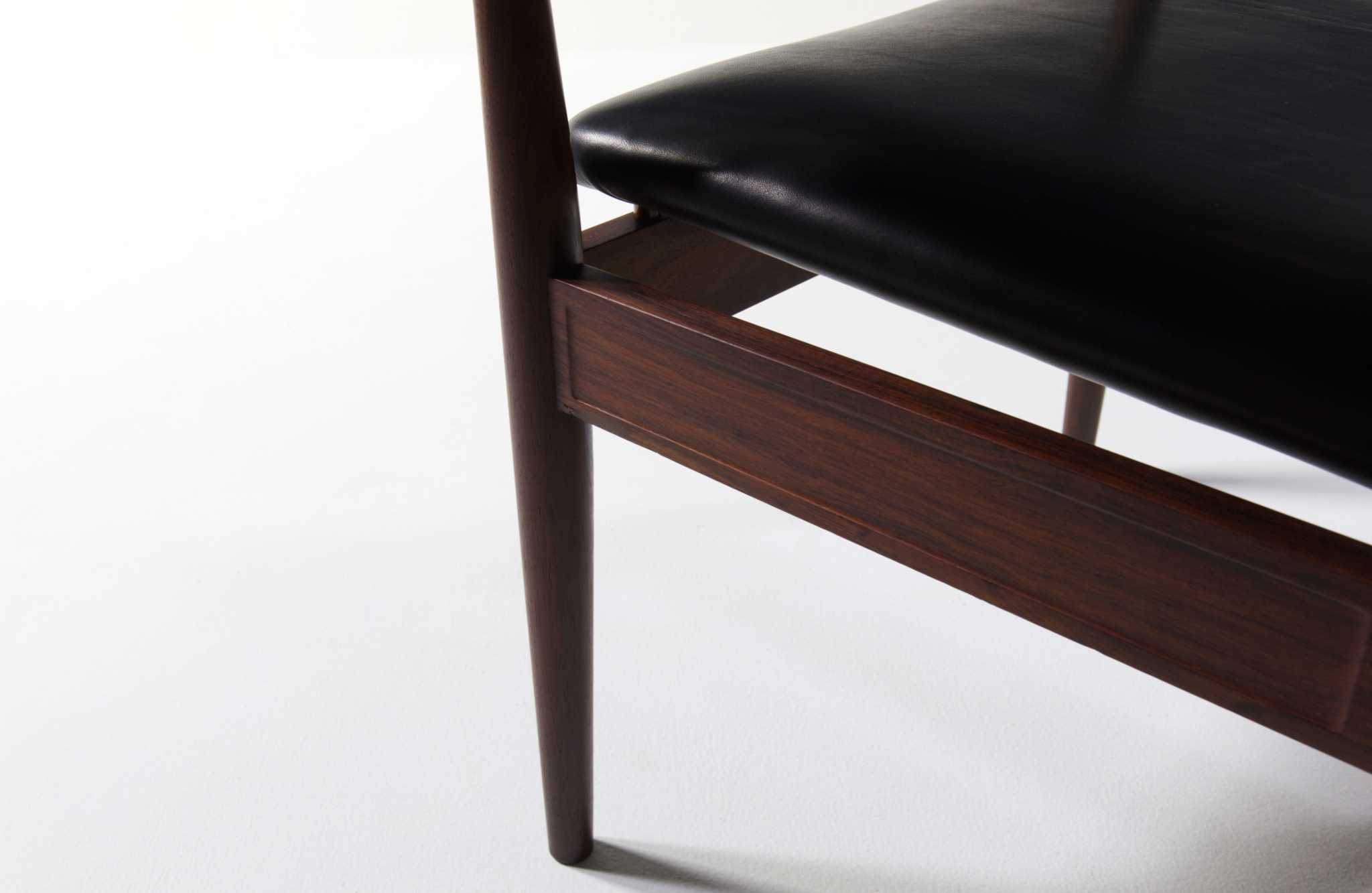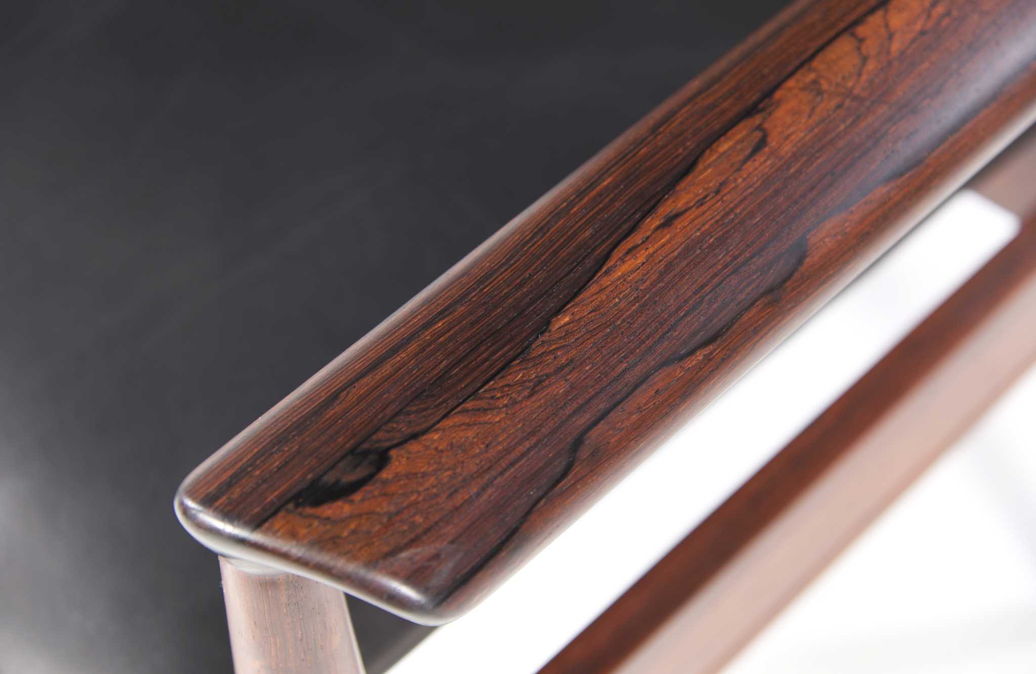 Finn Juhl/フィン・ユールによって1963年にデザインされた外交官の為の椅子「ディプロマット」チェアです。ブラジル原産と思しき良質なローズウッド材を用いており、際立った木目文様に見応えがあります。シートはCAMO leather社による黒皮革にて張り替えを行いました。座面下に備わるコイルスプリングに加え、僅かにスウィングする機能を持つ背もたれにより、安楽性の高い作りとなっています。個体によりアームに小傷があるものや、打痕のある場合がございますが、全体に綺麗な状態です。こちらは単体での販売となります。