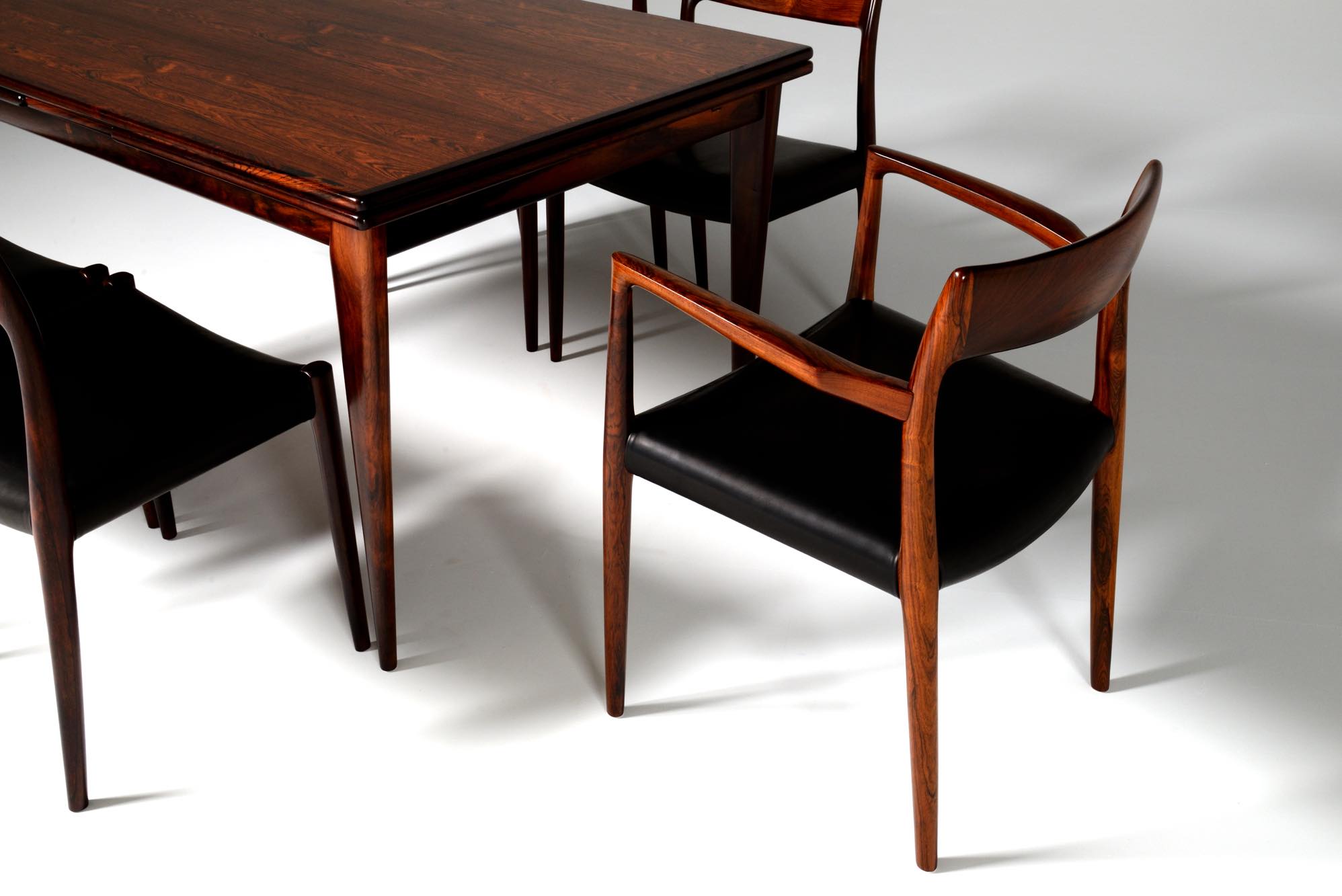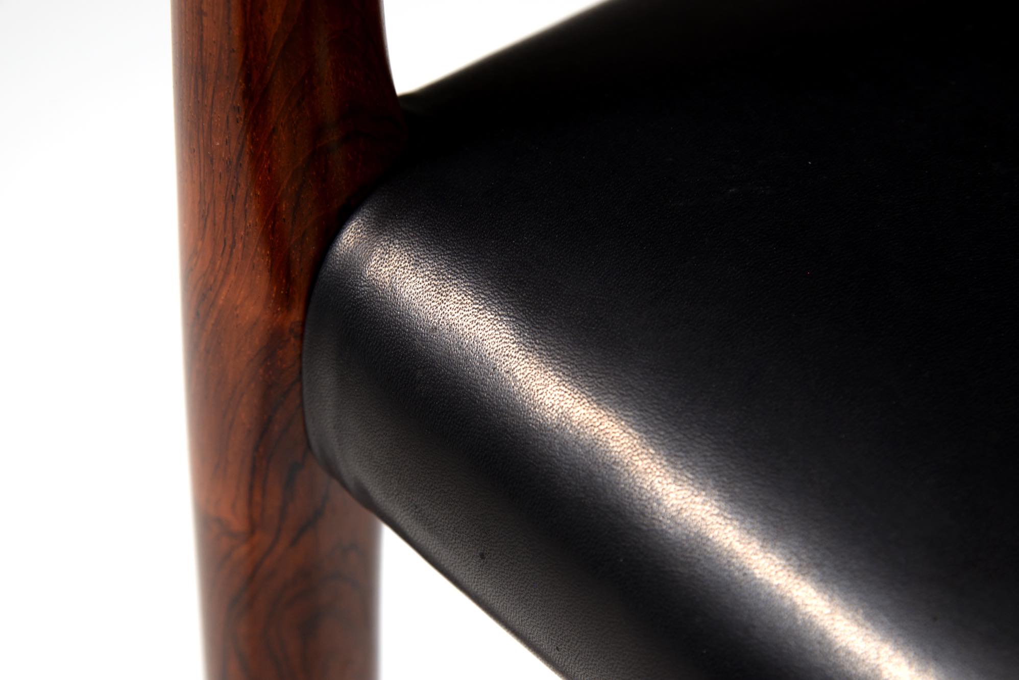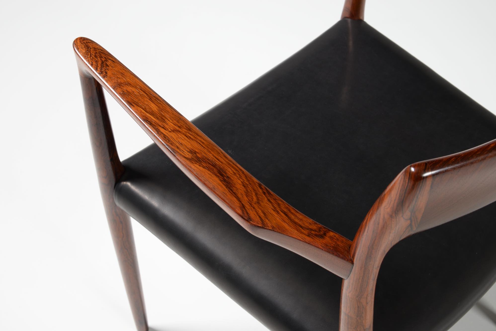 デンマークの家具工房、J.L. Møller/J.L.モラーによるアームチェア “Model 57” です。創業者のN.O. Moller/ニルス・オット・モラーによってデザインされたモデルで、こちらは1960年代頃に作られたヴィンテージ品となります。座面は黒皮革にて新たに張り替えました。コンディションは良好です。