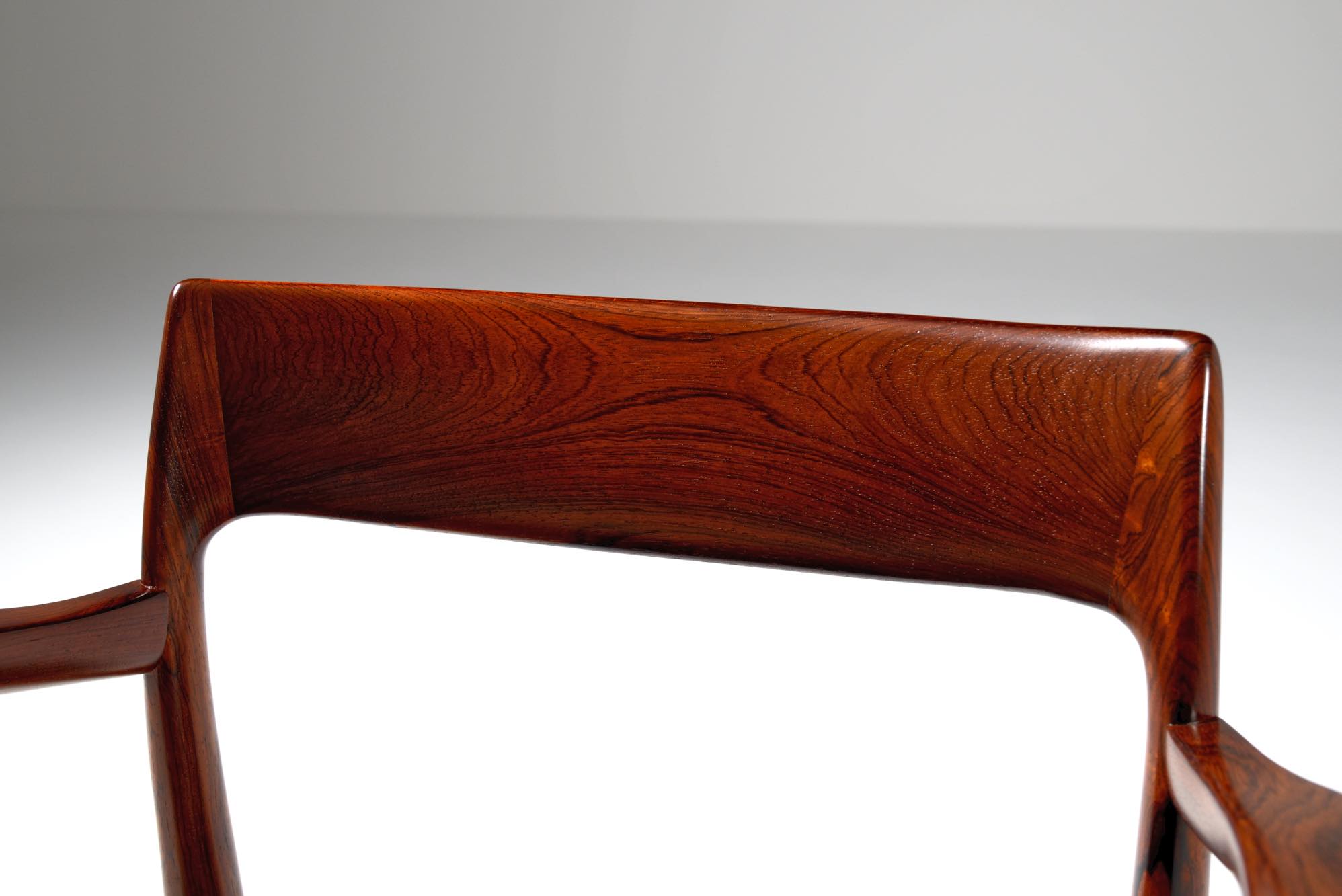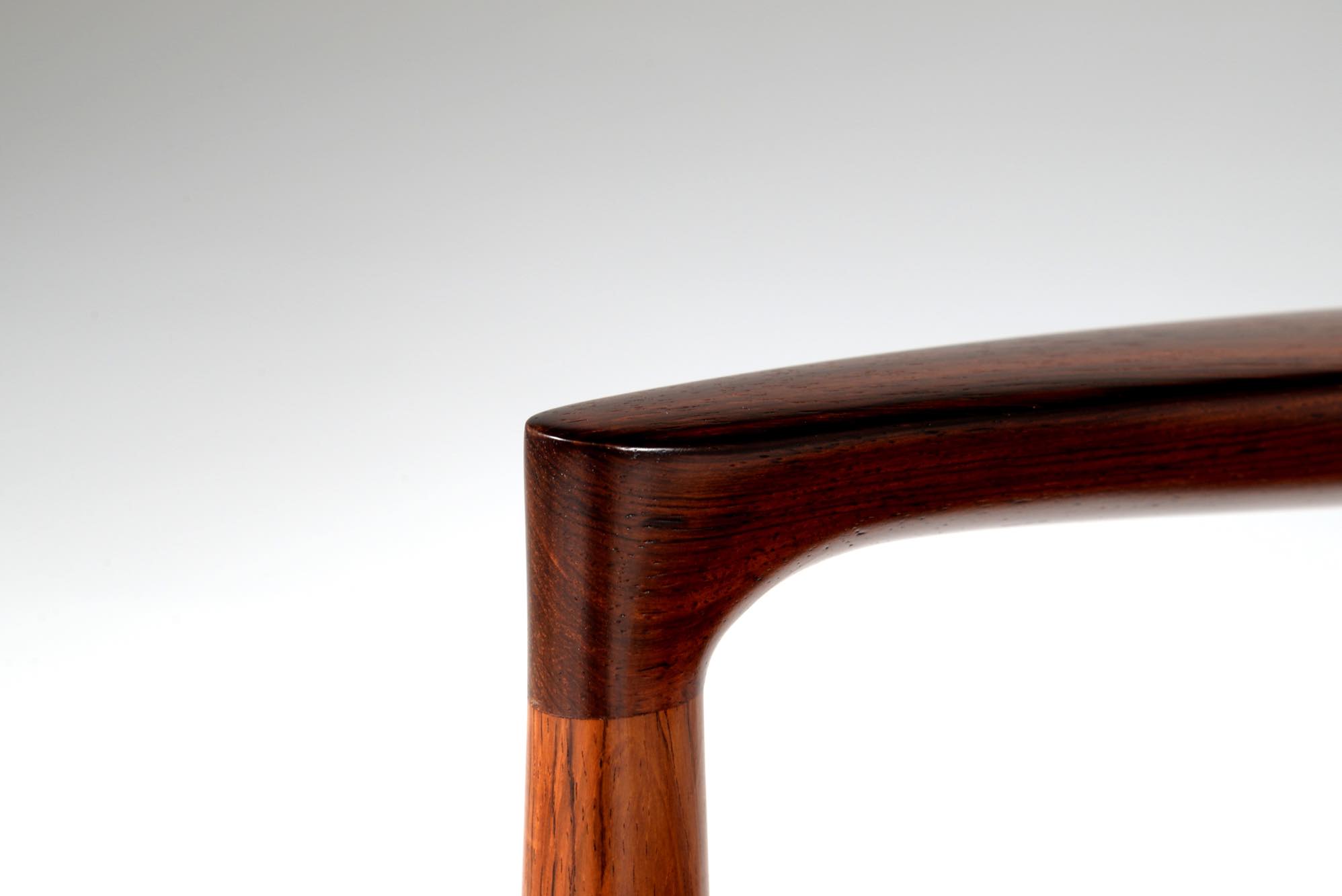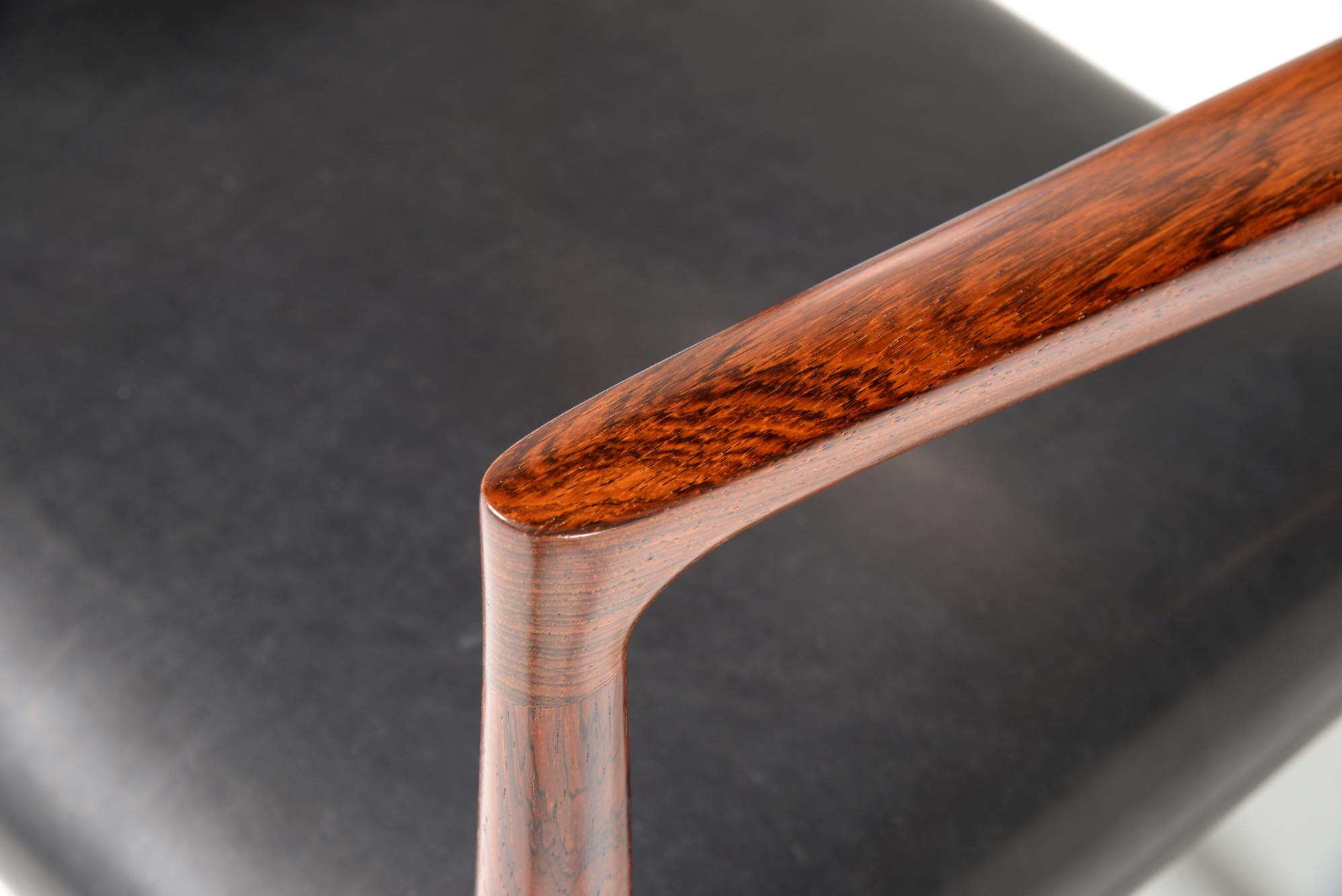デンマークの家具工房、J.L. Møller/J.L.モラーによるアームチェア “Model 57” です。創業者のN.O. Moller/ニルス・オット・モラーによってデザインされたモデルで、こちらは1960年代頃に作られたヴィンテージ品となります。座面は黒皮革にて新たに張り替えました。コンディションは良好です。