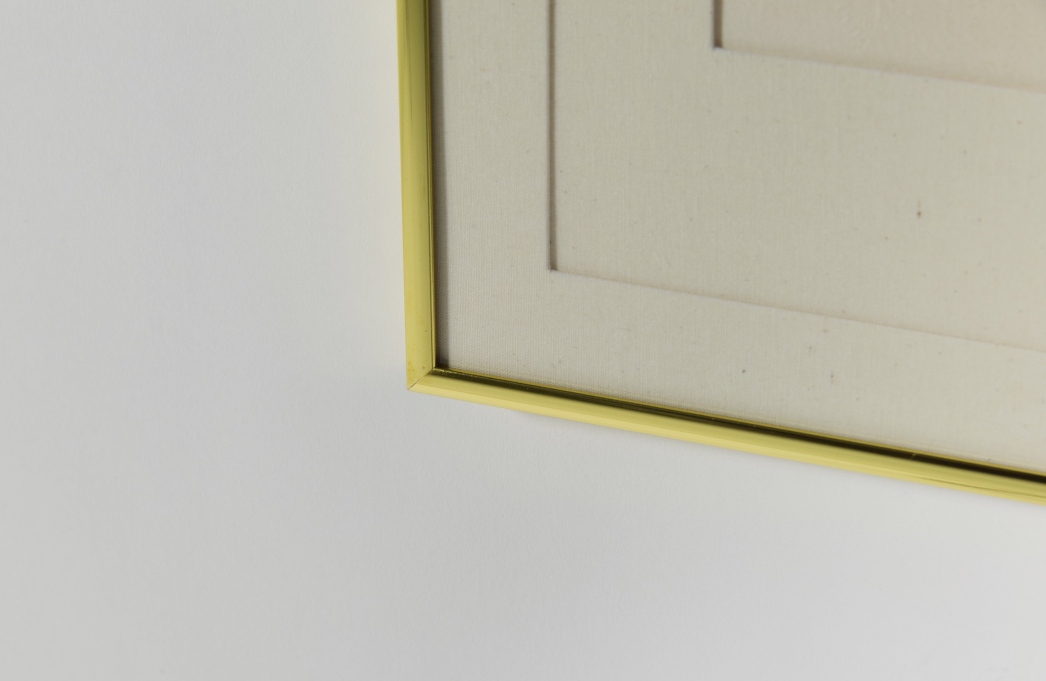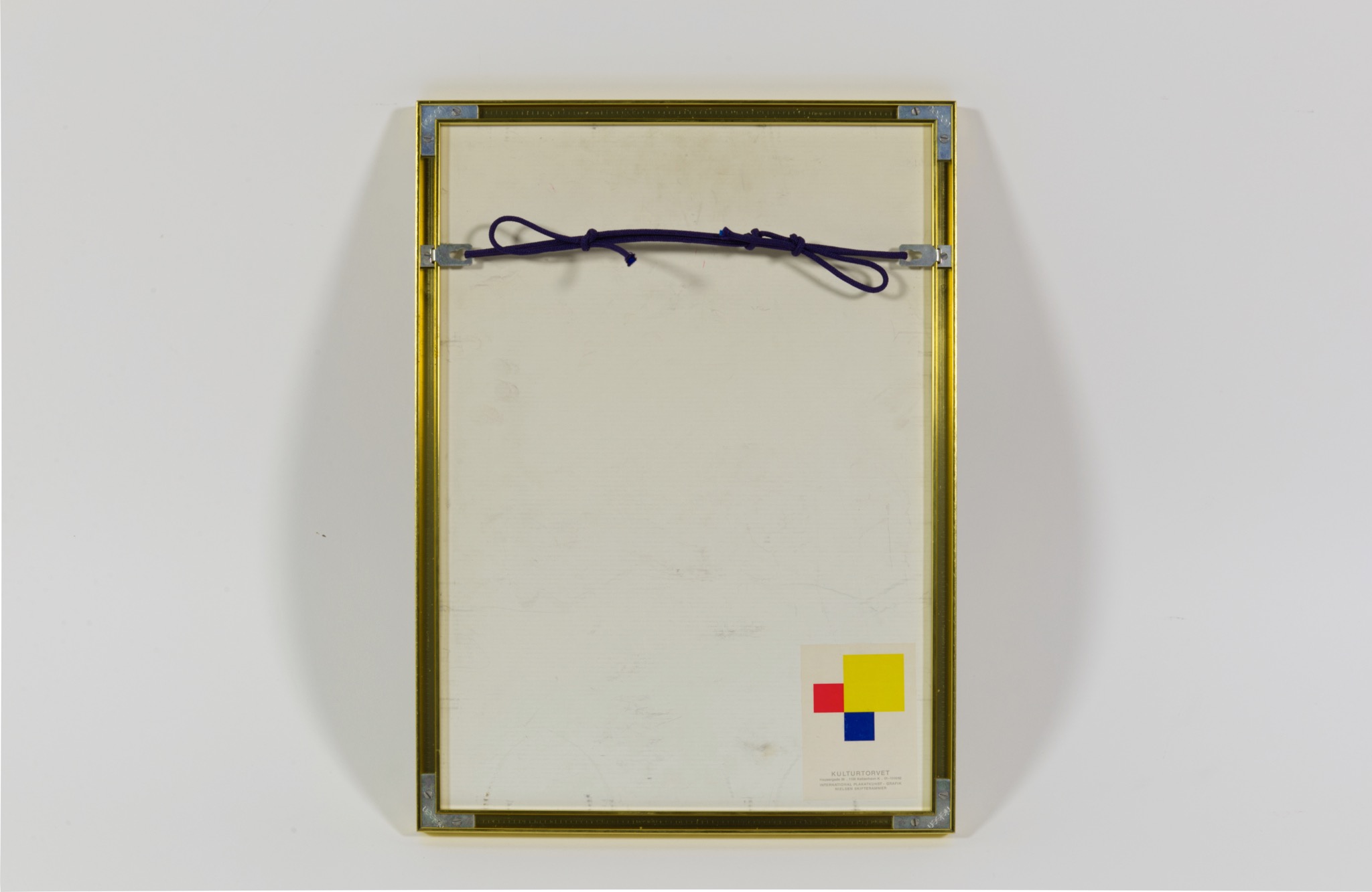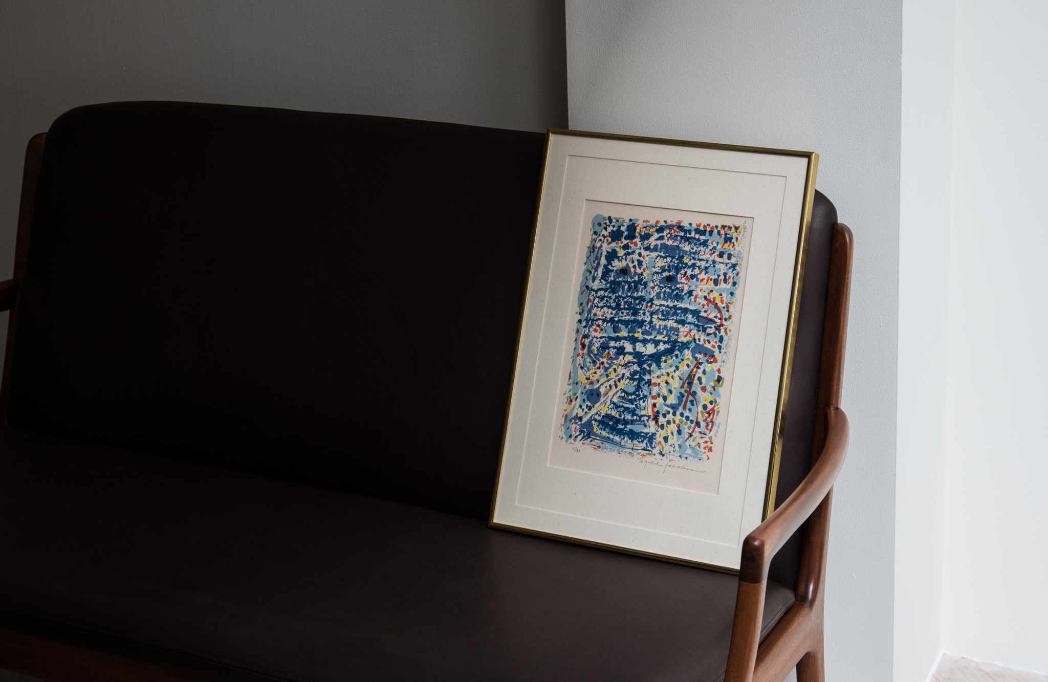 デンマークを代表する前衛芸術家の Egill Jacobsen/エギル・ヤコブセンによるリトグラフ作品です。小ロット刷りで小振りな作品です。オリジナルと思われる金属製ゴールド色のフレームはそのままに、布被せのダブルマットを設えました。背面のシートは薄汚れているものの、履歴が確認できるのでそのままにしております。