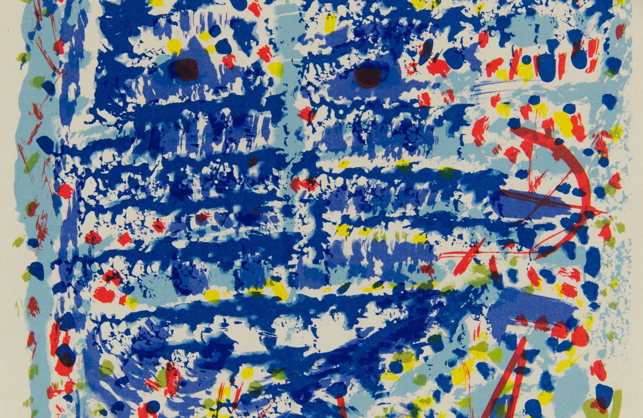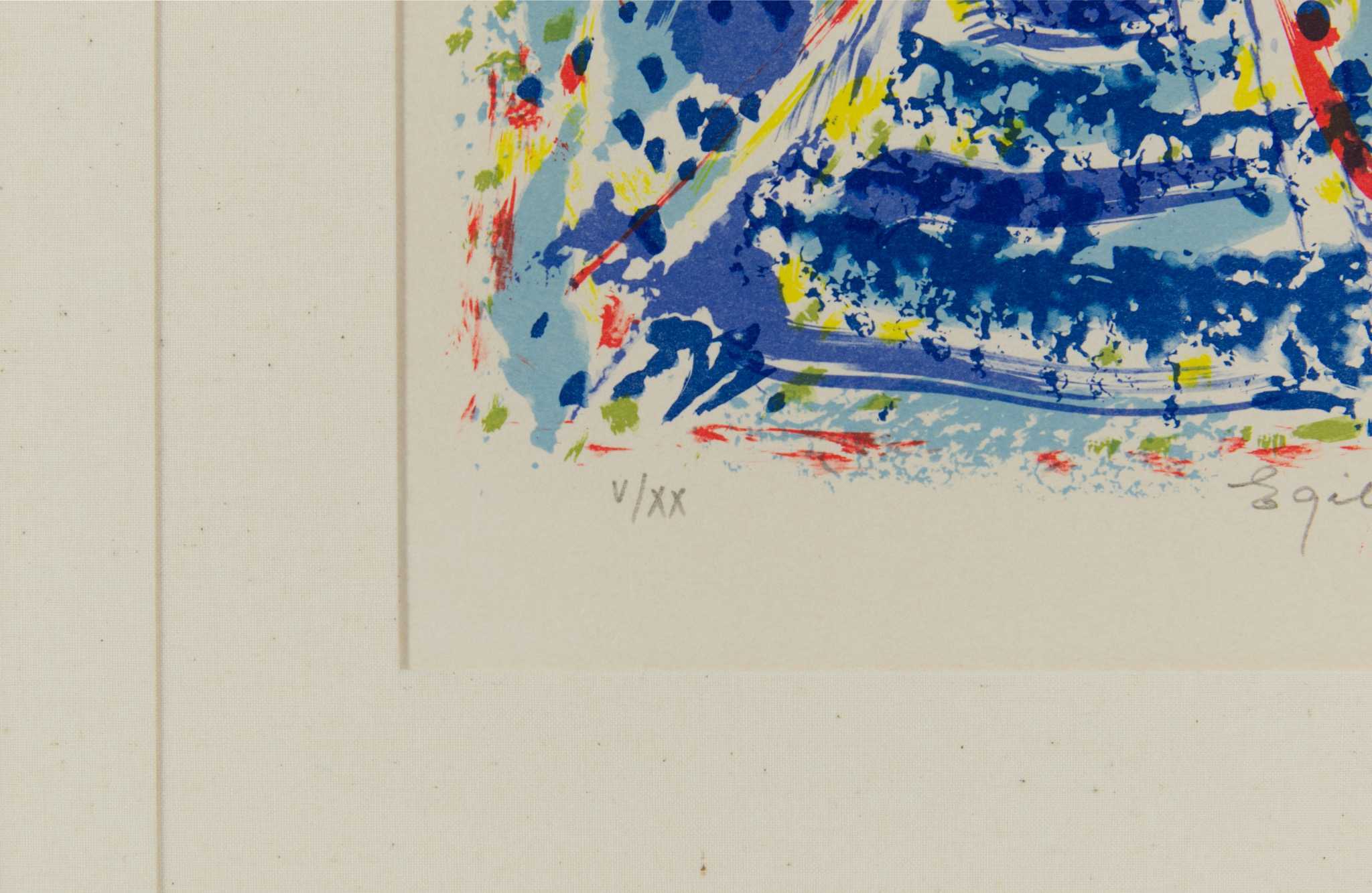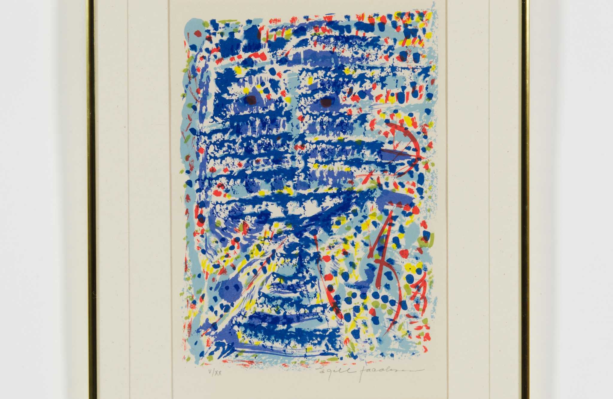 デンマークを代表する前衛芸術家の Egill Jacobsen/エギル・ヤコブセンによるリトグラフ作品です。小ロット刷りで小振りな作品です。オリジナルと思われる金属製ゴールド色のフレームはそのままに、布被せのダブルマットを設えました。背面のシートは薄汚れているものの、履歴が確認できるのでそのままにしております。