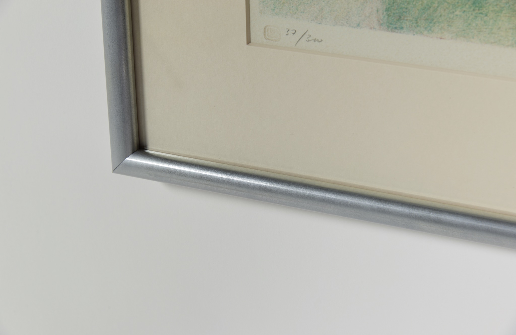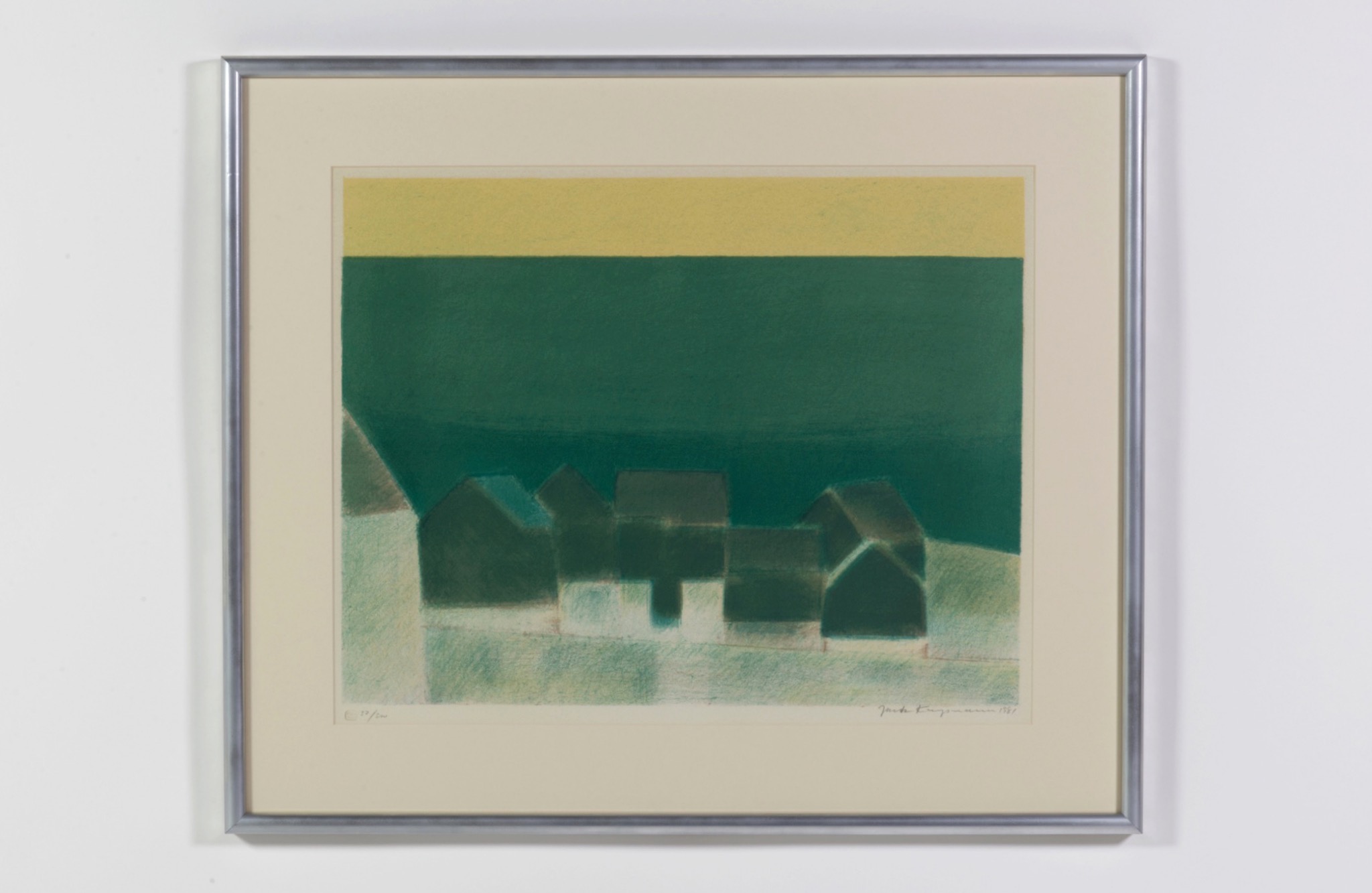 デンマーク人画家、Jack Kampmann/ジャック・カンプマンによるリトグラフ作品です。フェロー諸島の厳しい自然環境と対峙しながら生活する島民たちの家々や情景を独自のタッチで描いています。銀箔のフレームはオリジナルですが、表面に傷が多かったため銀色塗装にて整えました。マットも新たに整え、コンディションは良好です。