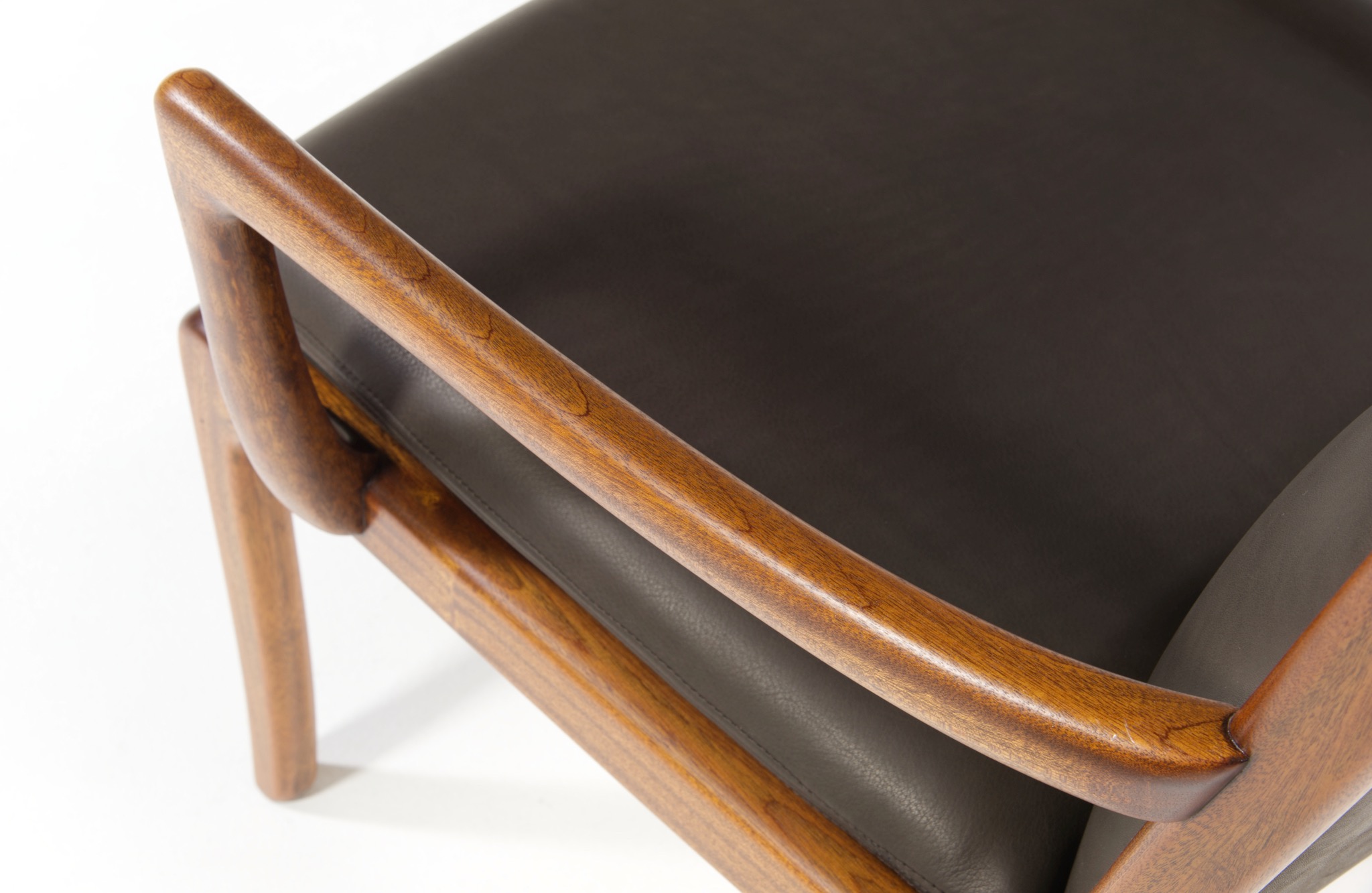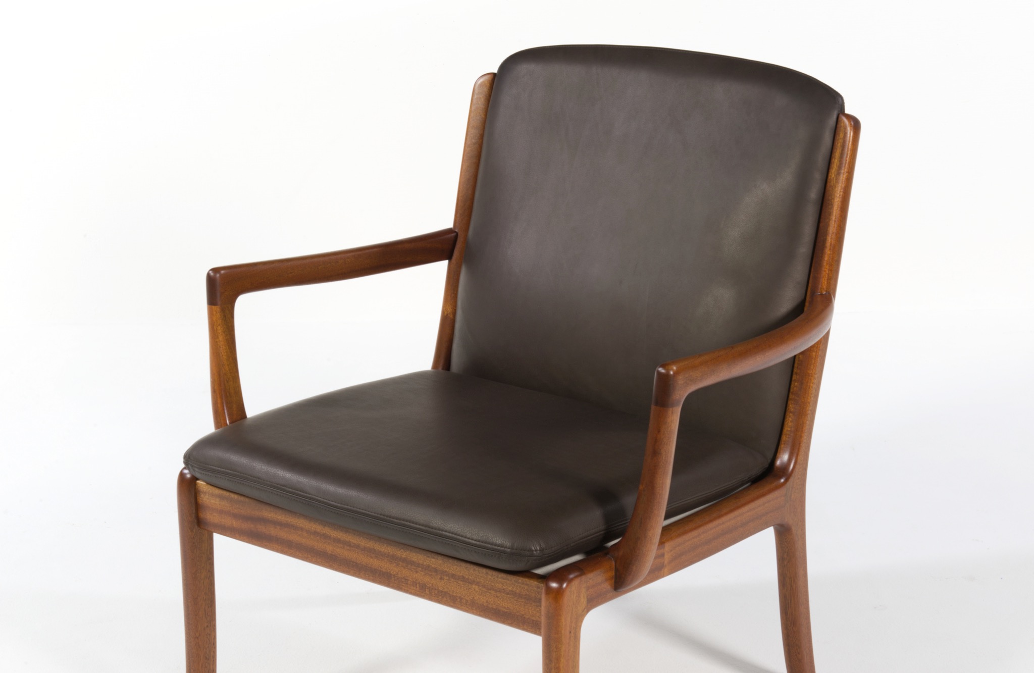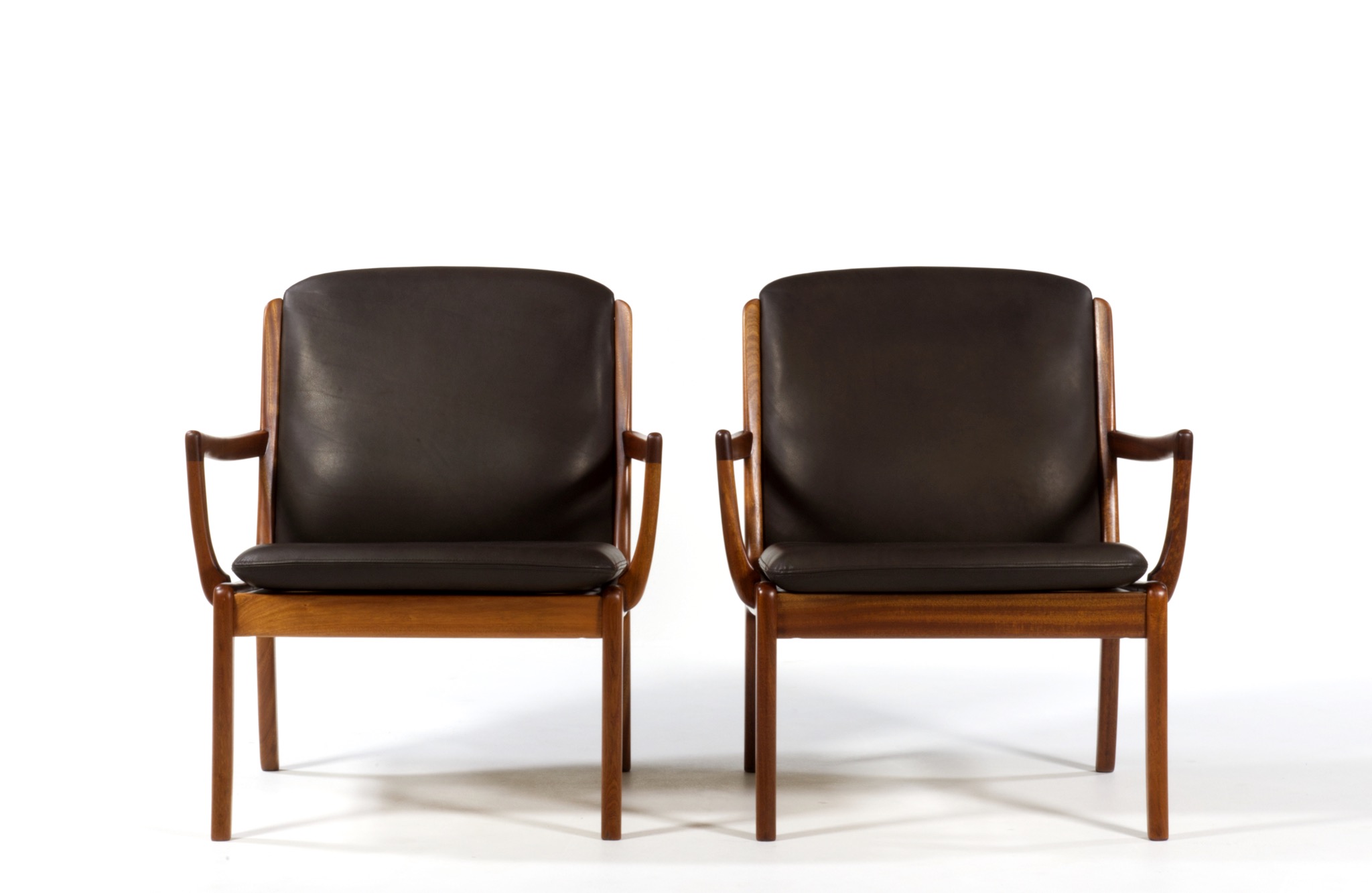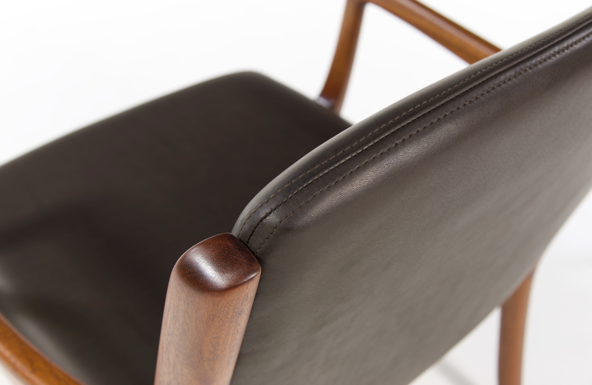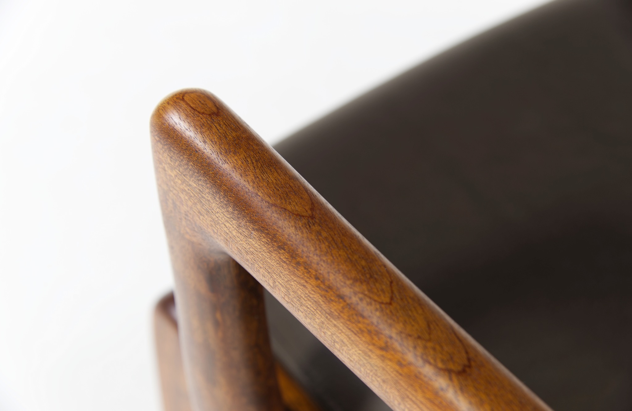 デンマークを代表する家具デザイナー、Ole Wanscher/オーレ・ヴァンシャーによるイージーチェア一対です。1960~70年代頃に作られたものでしょう。マホガニーのフレームはしっかりとした構造で、ヴァンシャー ならではの優美な曲線を有した座りやすい椅子です。シートは新たにデンマークのCAMO leather社のダークブラウンの皮革で張り替えました。コンディションは良好です。