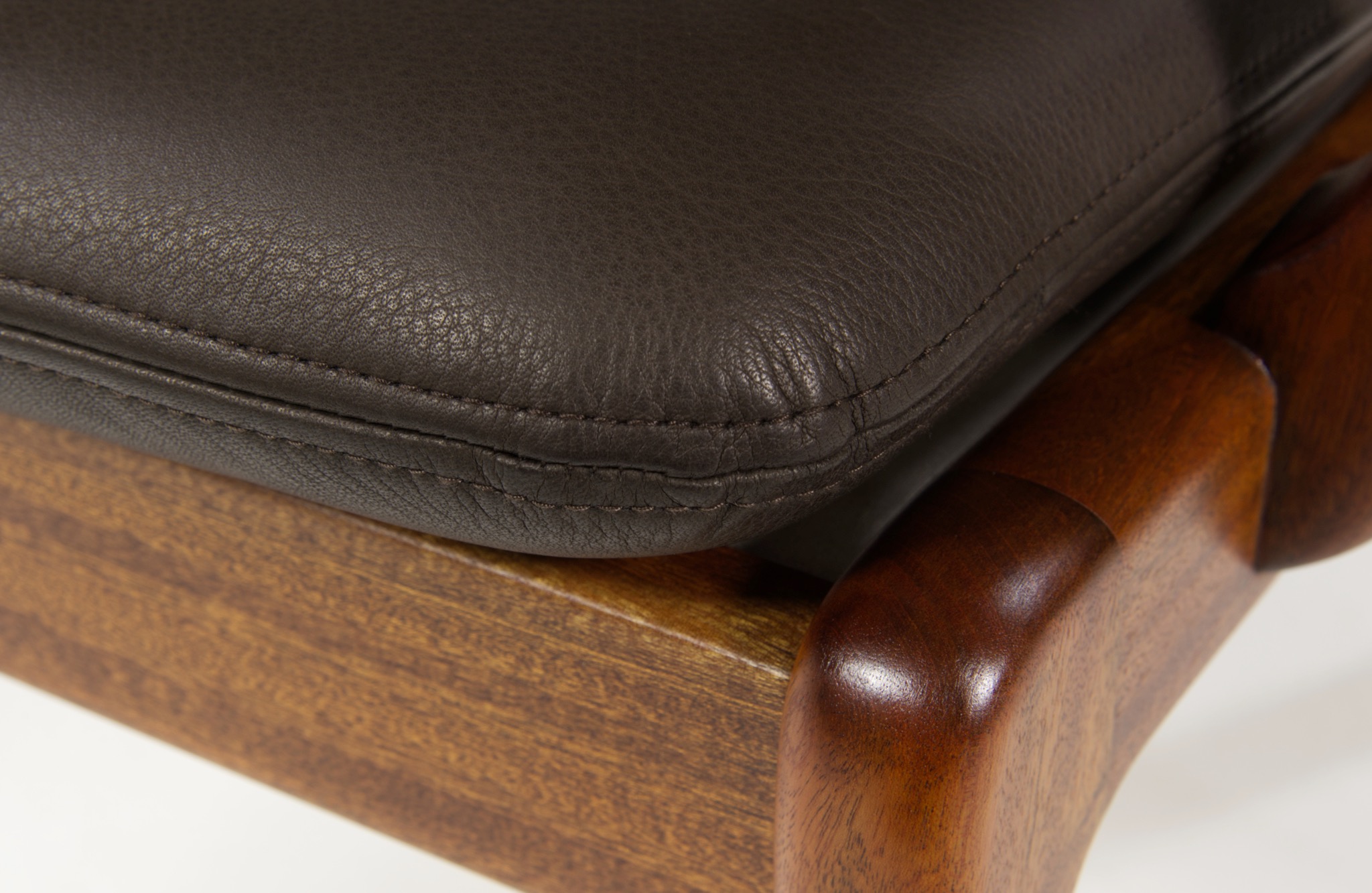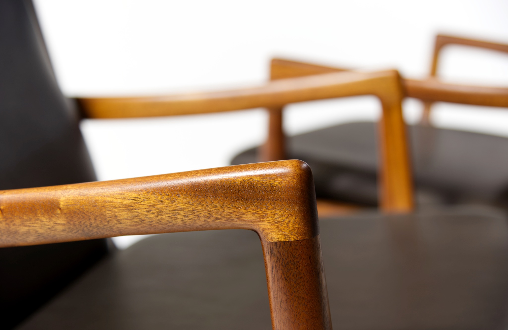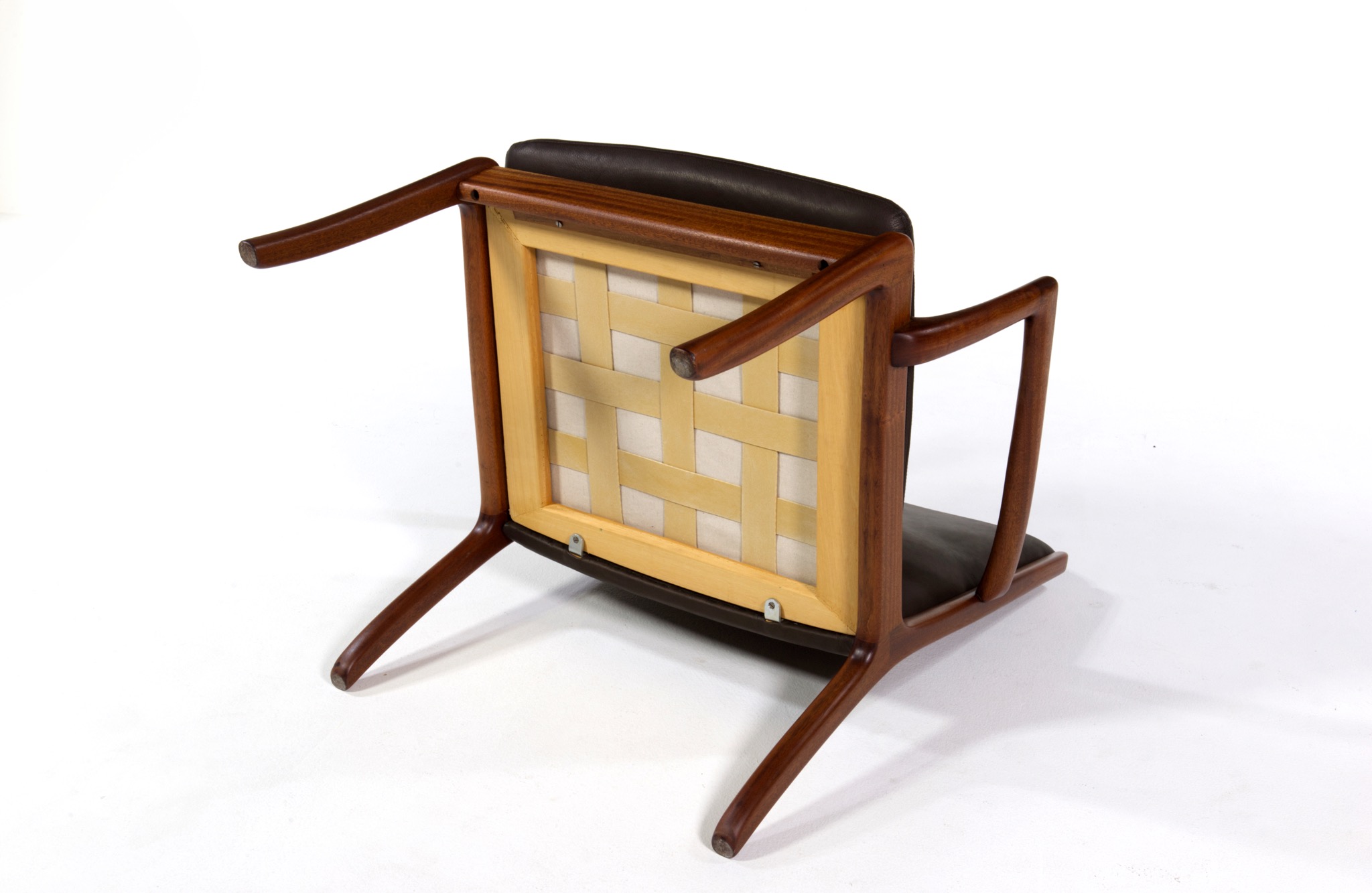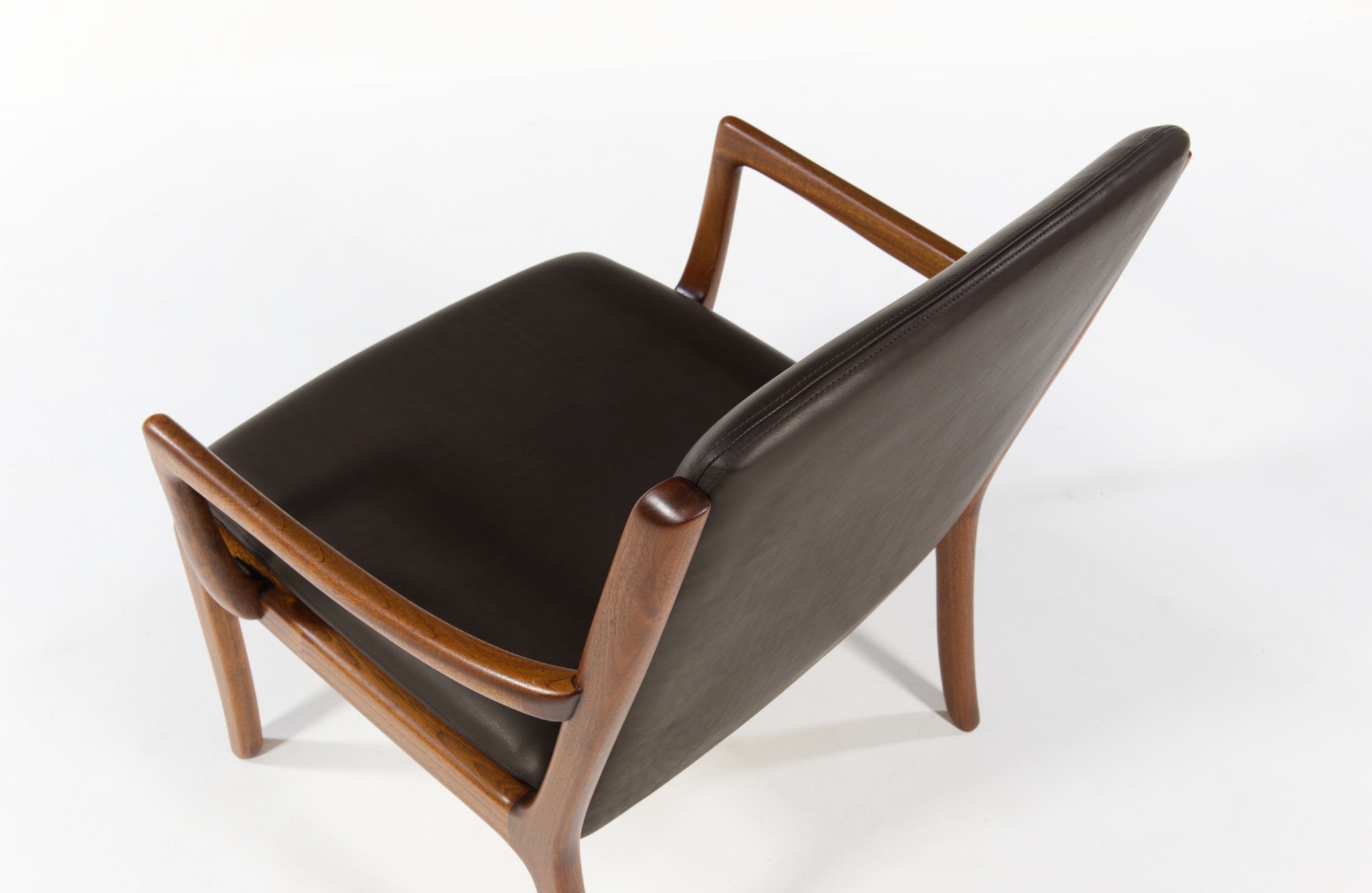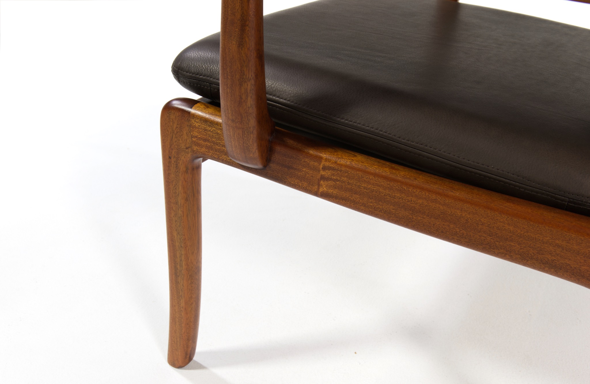 デンマークを代表する家具デザイナー、Ole Wanscher/オーレ・ヴァンシャーによるイージーチェア一対です。1960~70年代頃に作られたものでしょう。マホガニーのフレームはしっかりとした構造で、ヴァンシャー ならではの優美な曲線を有した座りやすい椅子です。シートは新たにデンマークのCAMO leather社のダークブラウンの皮革で張り替えました。コンディションは良好です。