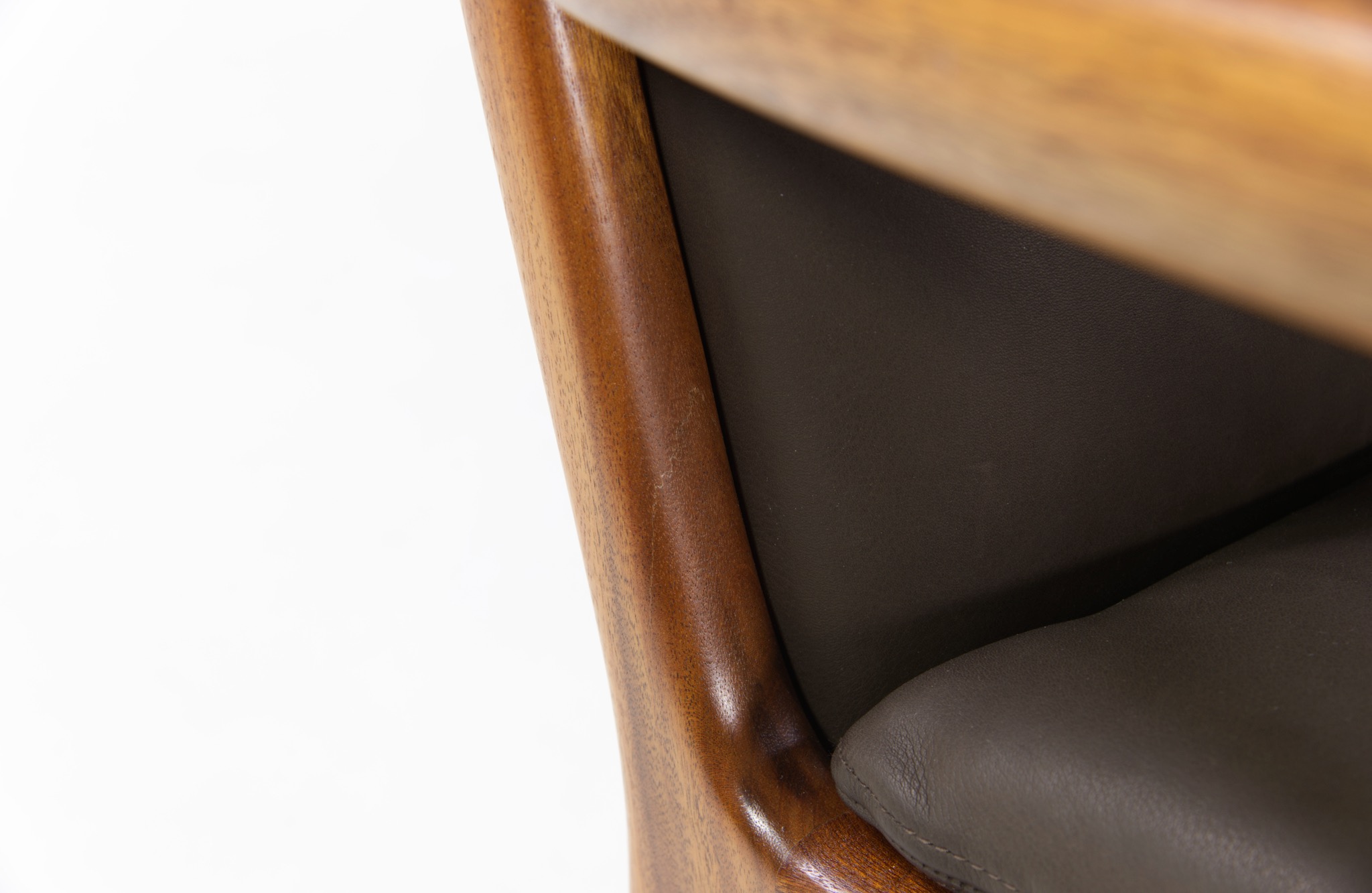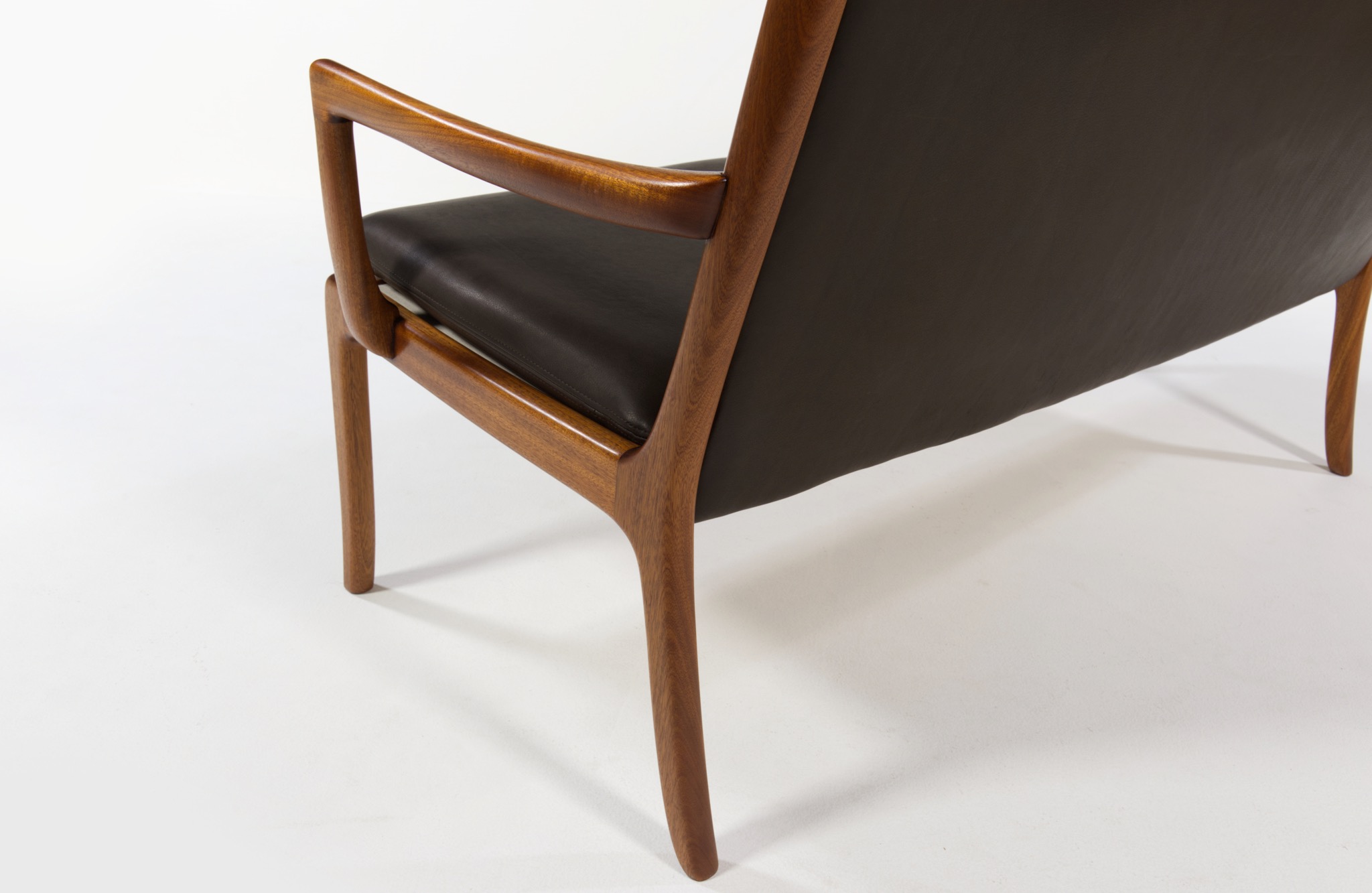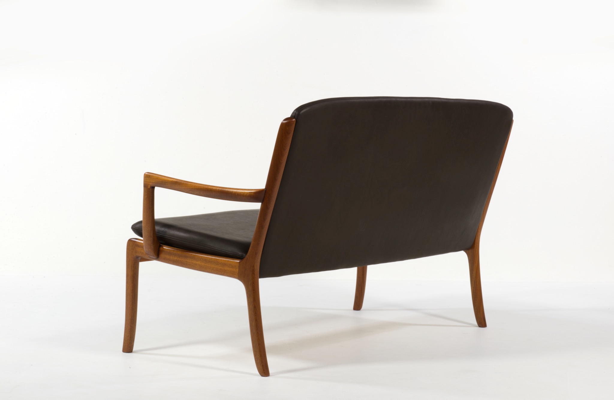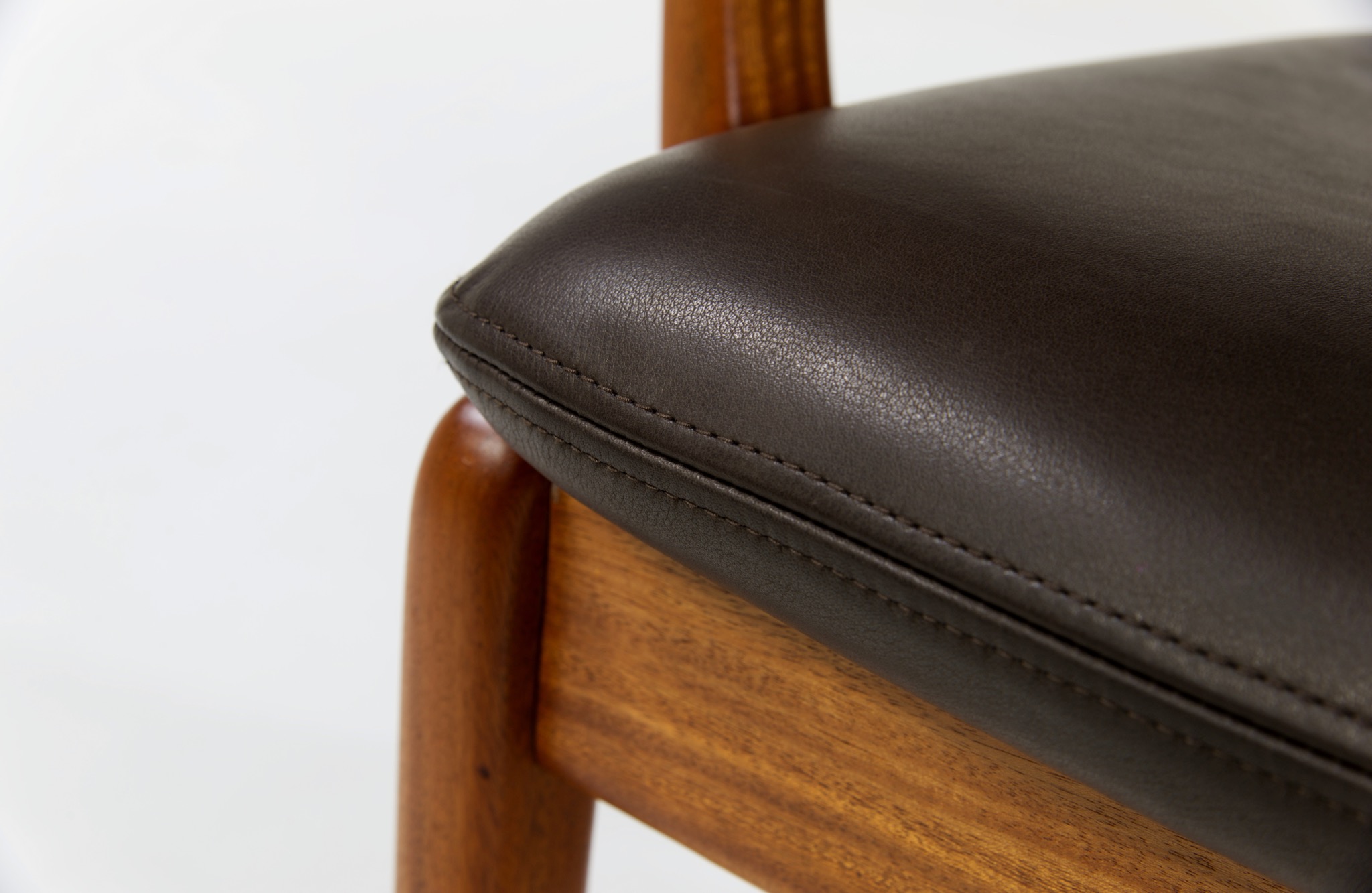 デンマークを代表する家具デザイナー、Ole Wanscher/オーレ・ヴァンシャーによるセッティです。1960~70年代頃に作られたものでしょう。マホガニーのフレームはしっかりとした構造で、ヴァンシャー ならではの優美な曲線を有した座りやすい椅子です。シートは新たにデンマークのCAMO leather社のダークブラウンの皮革で張り替えました。向かって左後脚に古い補修が見られますが、緩みなどはなく使用上の問題は無いでしょう。その他、コンディションは良好です。